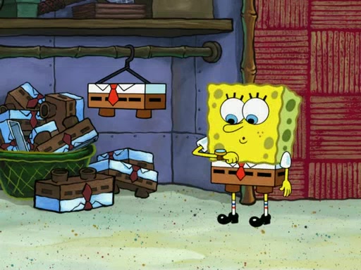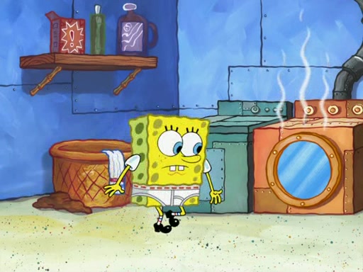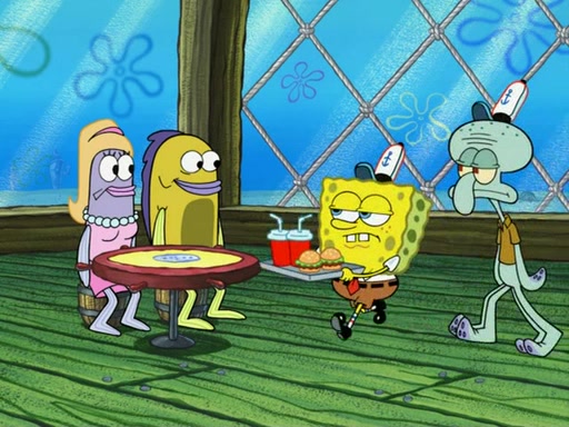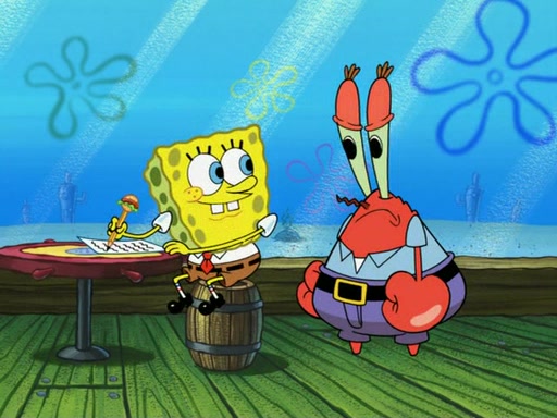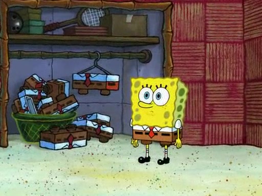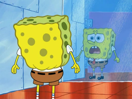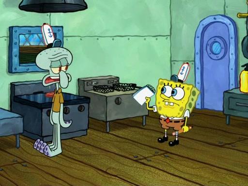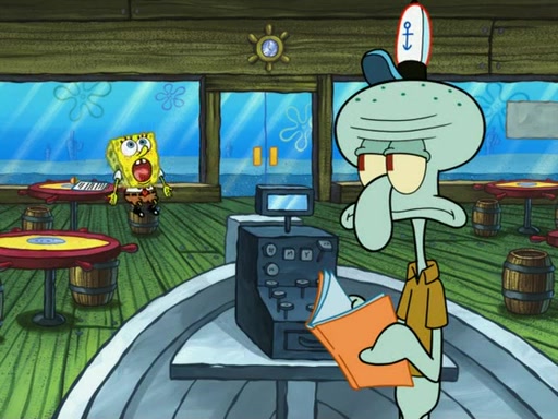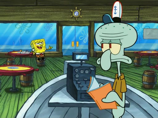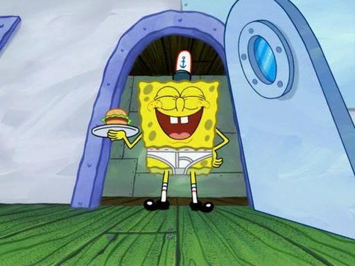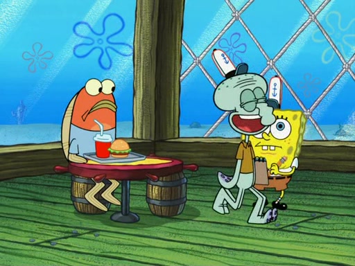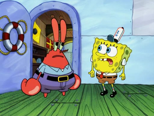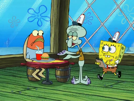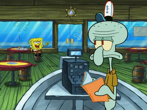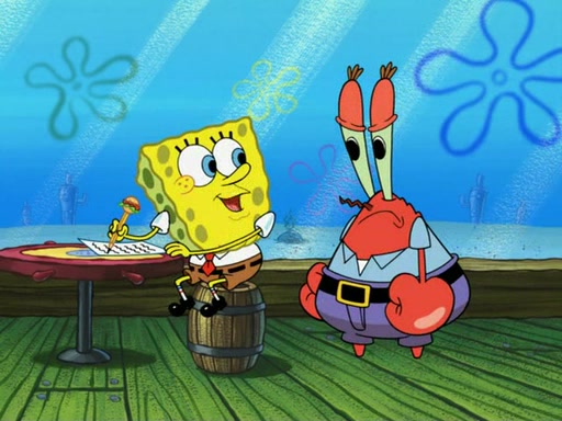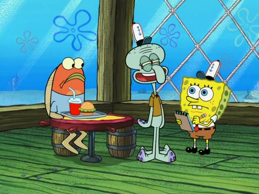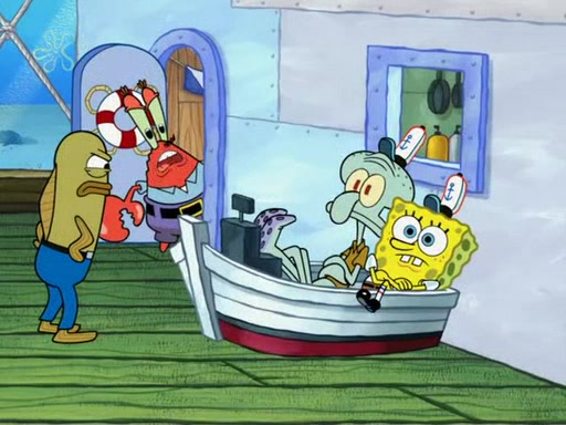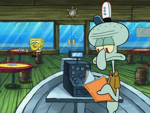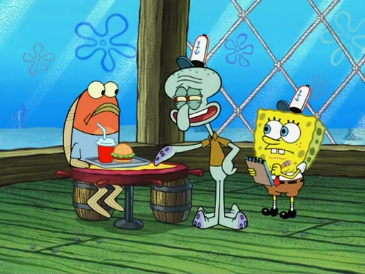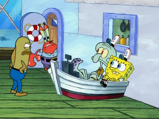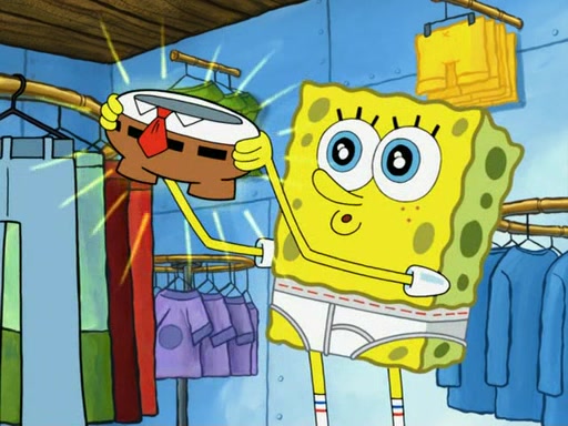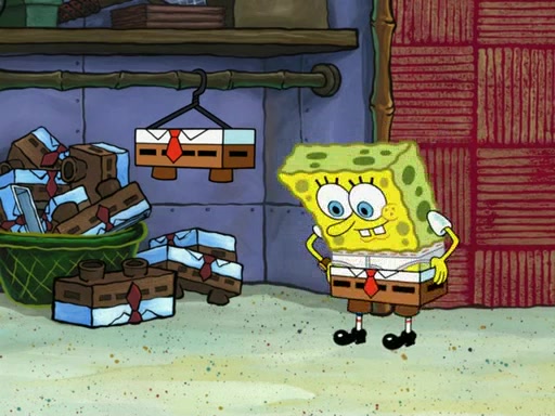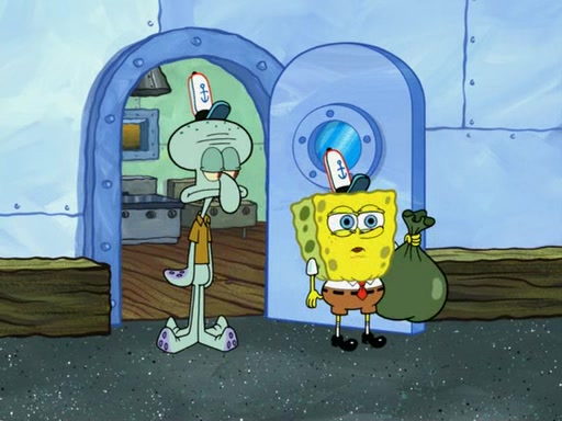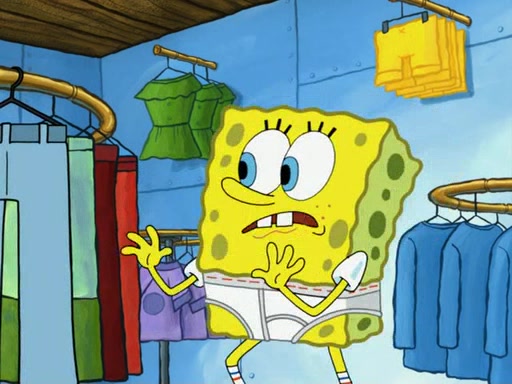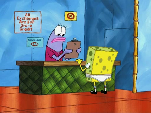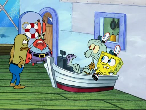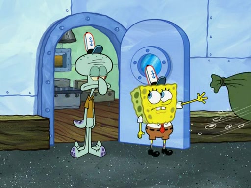SpongeBob gets his job at the Krusty Krab again, and looks to Squidward for pointers. Squidward gives SpongeBob his bad routine of being a Krusty Krab employee (including not throwing the trash in the dumpster, being rude to the customers, nasally laughing like Squidward, burning Krabby Patties, taking too long in the bathroom, and even sleeping on the job). Mr. Krabs realizes what is going on, and he does not joke around when he sees SpongeBob. SpongeBob then tells Mr. Krabs that he cannot be SpongeBob SquarePants again, as he has round pants. Mr. Krabs then suggests that he just remove them if that was the case. Then, SpongeBob takes off his pants, but Sandy calls him "SpongeBob UnderPants," and the episode ends with SpongeBob looking at his underwear and screaming with embarrassment.