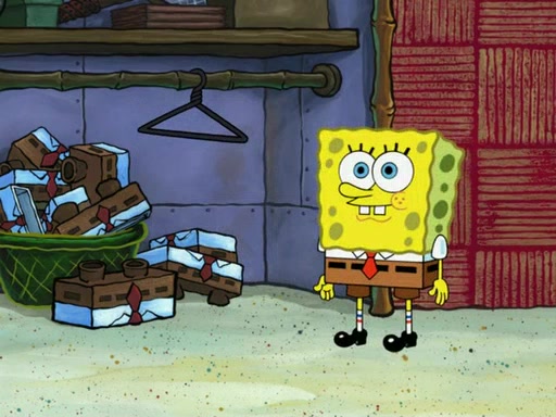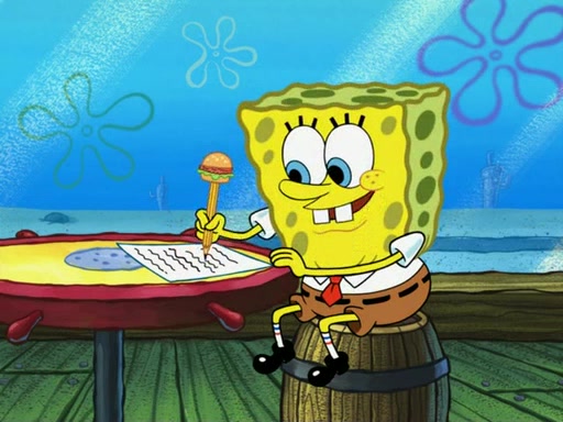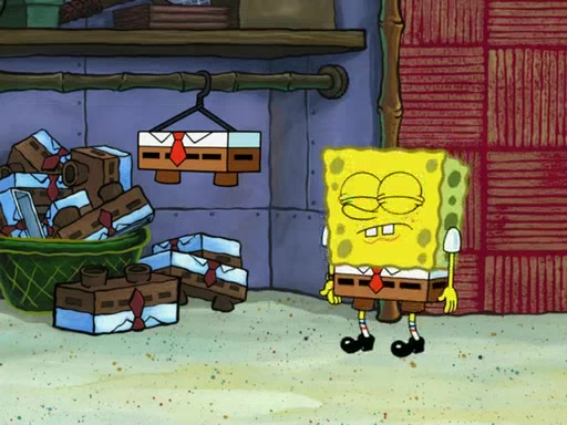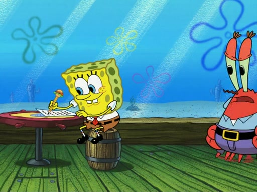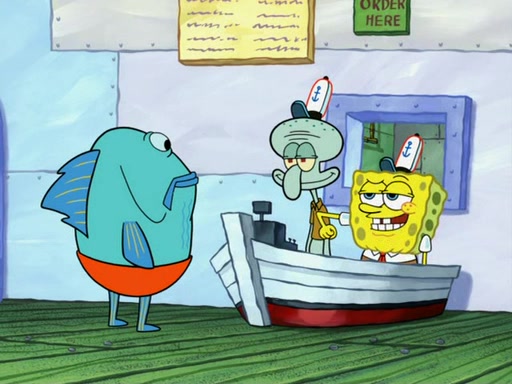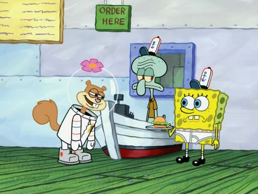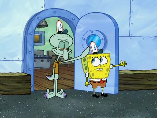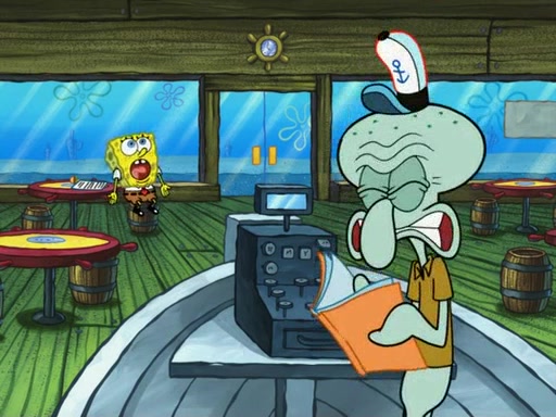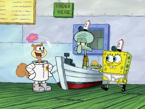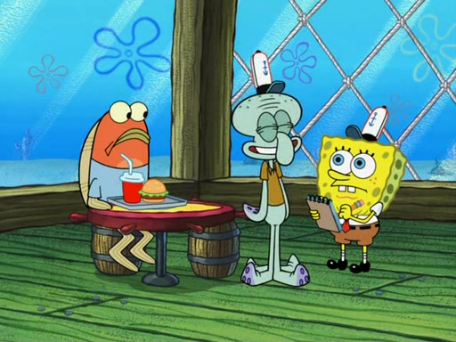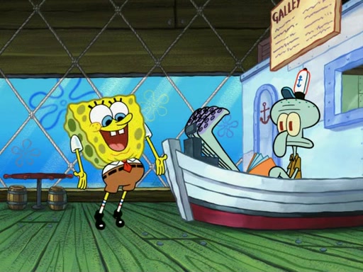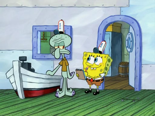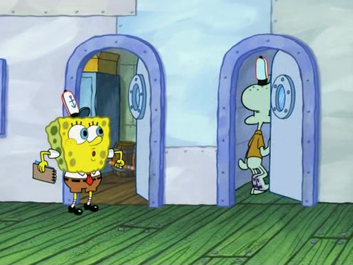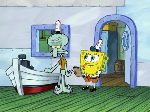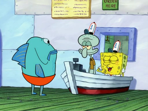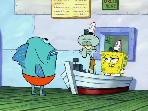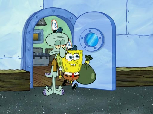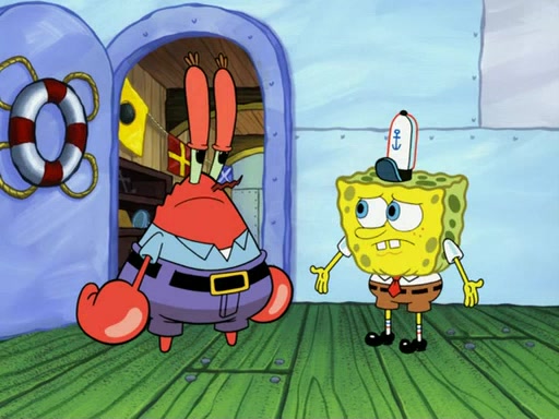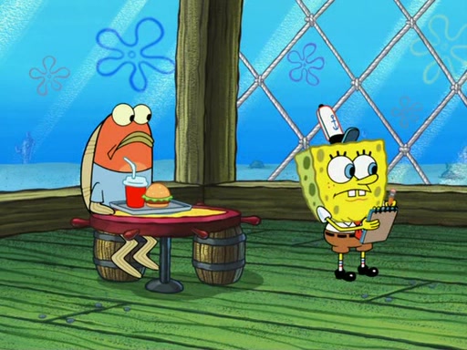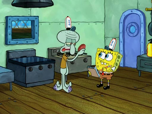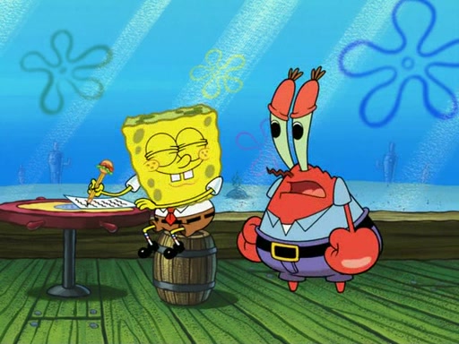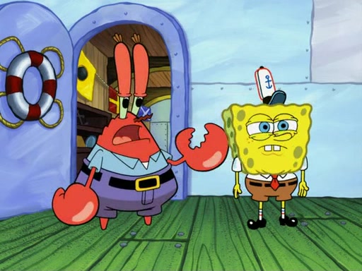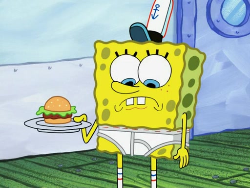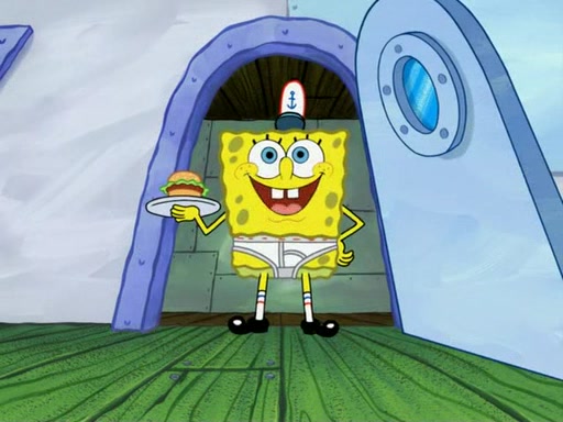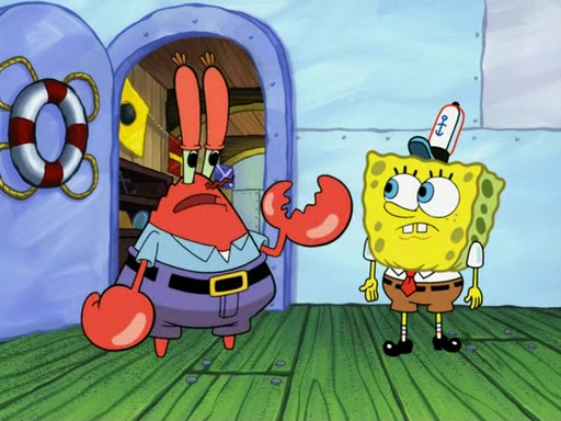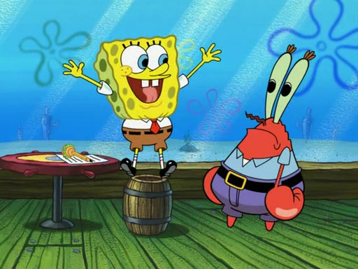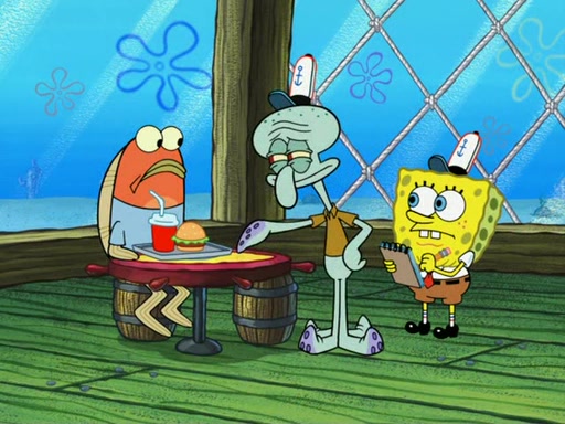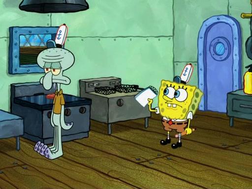 SpongeBob gets his job at the Krusty Krab again, and looks to Squidward for pointers. Squidward gives SpongeBob his bad routine of being a Krusty Krab employee (including not throwing the trash in the dumpster, being rude to the customers, nasally laughing like Squidward, burning Krabby Patties, taking too long in the bathroom, and even sleeping on the job). Mr. Krabs realizes what is going on, and he does not joke around when he sees SpongeBob. SpongeBob then tells Mr. Krabs that he cannot be SpongeBob SquarePants again, as he has round pants. Mr. Krabs then suggests that he just remove them if that was the case. Then, SpongeBob takes off his pants, but Sandy calls him "SpongeBob UnderPants," and the episode ends with SpongeBob looking at his underwear and screaming with embarrassment.
