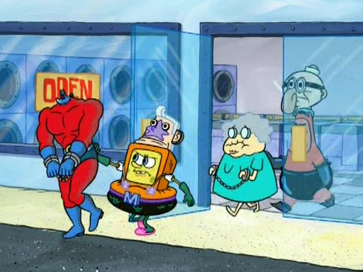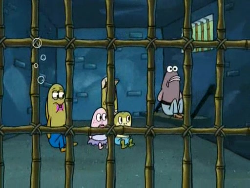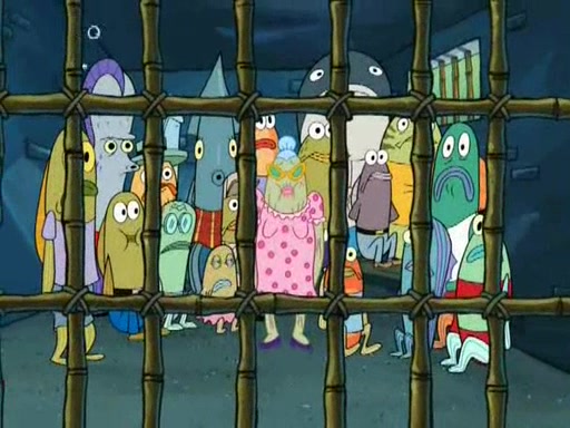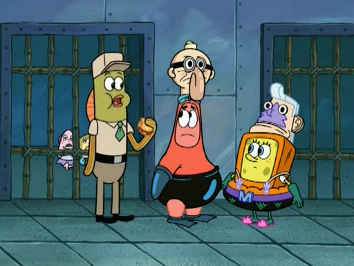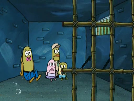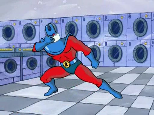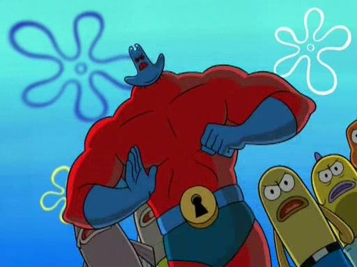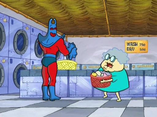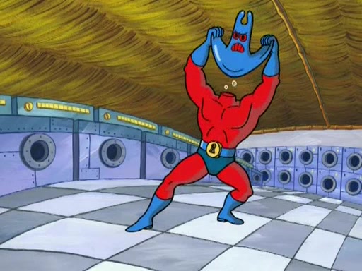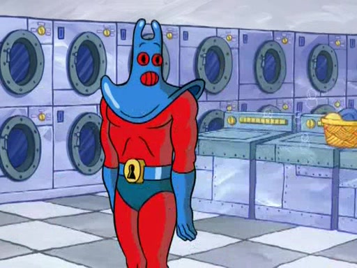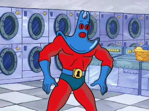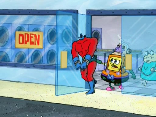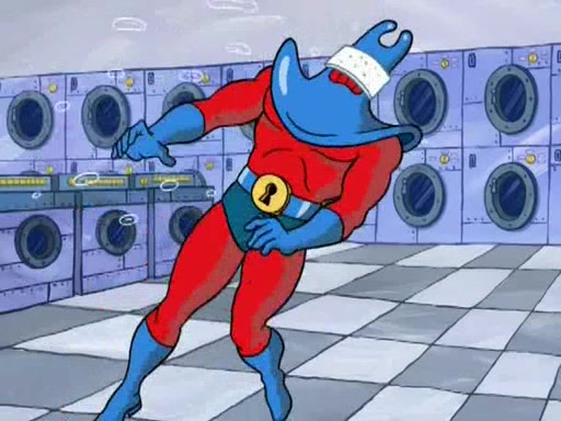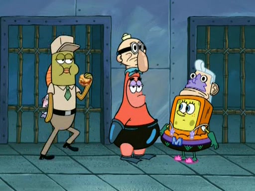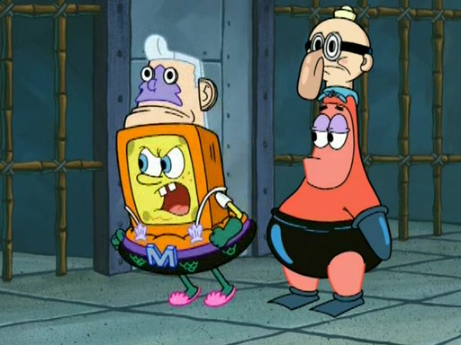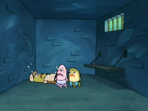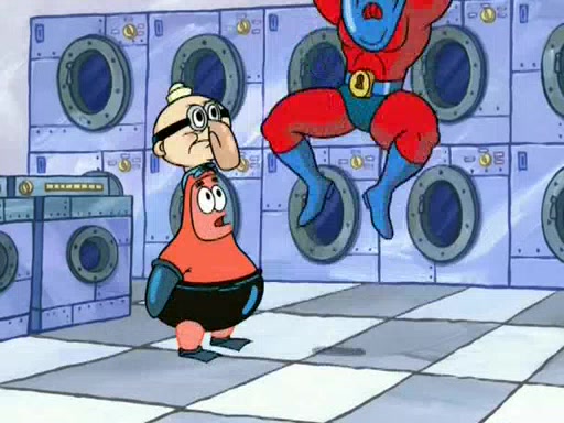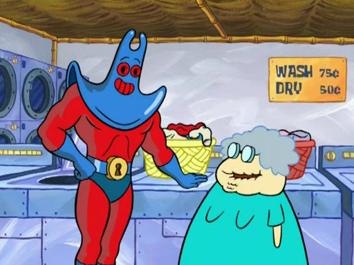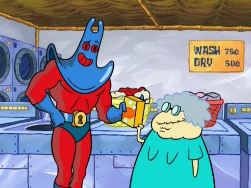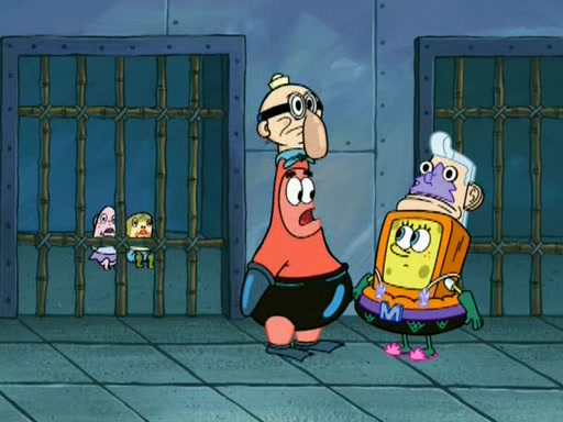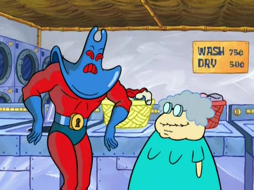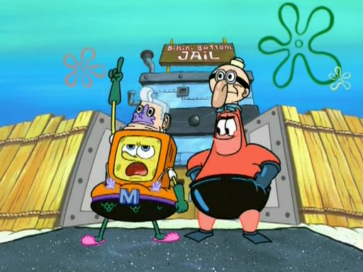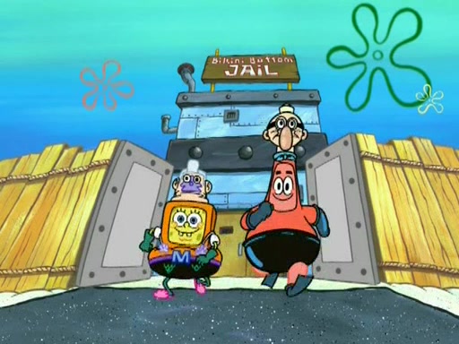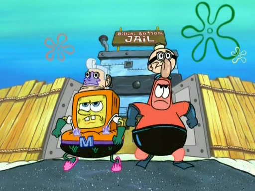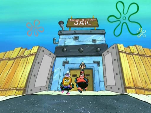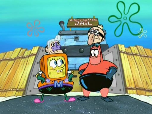After they win the shuffleboarding contest, they go to return the costumes, but Patrick convinces SpongeBob that if they don't save the town from evil, no one will. They begin throwing everyone they see in jail for completely unjustified reasons (including throwing away a Krabby Patty, chewing gum too loudly, and being "too old"). Eventually, they have arrested nearly everyone in Bikini Bottom, and decide to return the costumes. However, they see Man Ray entering a laundromat, and despite the fact that he is doing absolutely nothing wrong, follow him in and arrest him after a fight scene, involving throwing Man Ray's head in the dryer, causing it to shrink. The jail is now so full of people that it literally explodes, causing people to fall down from the sky.