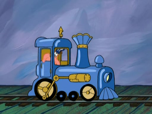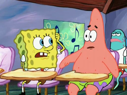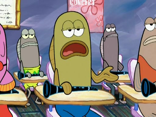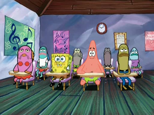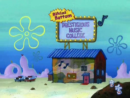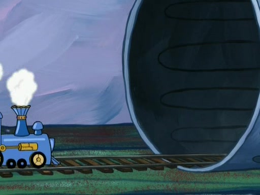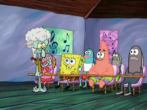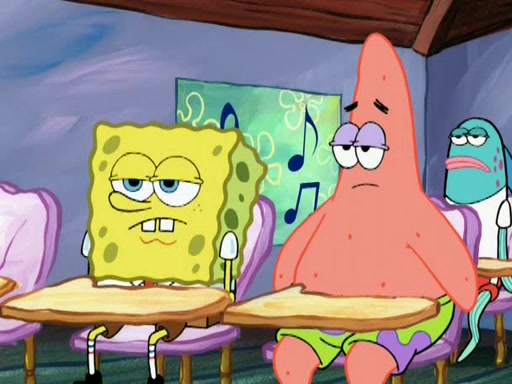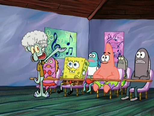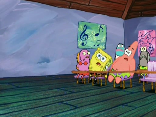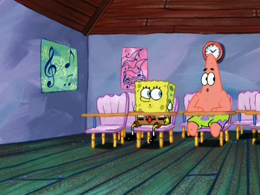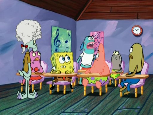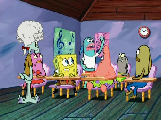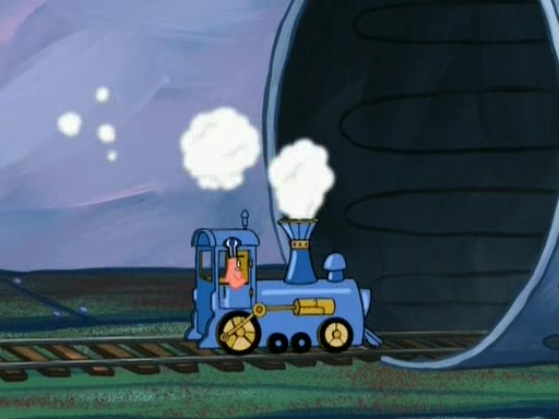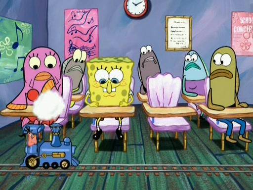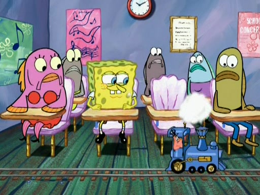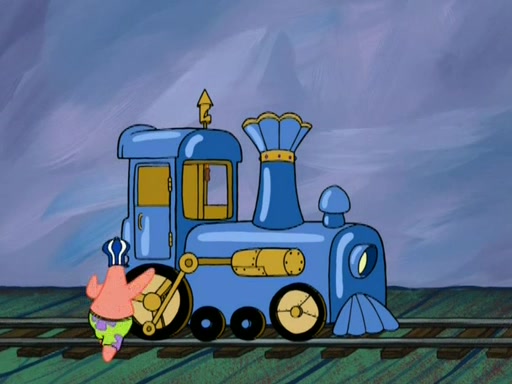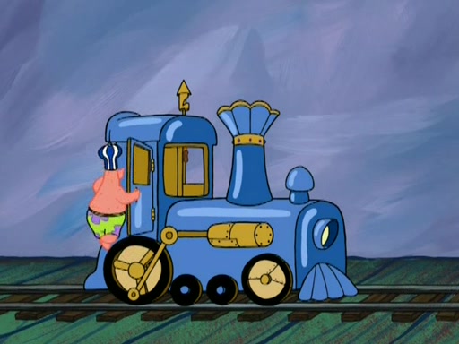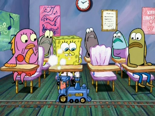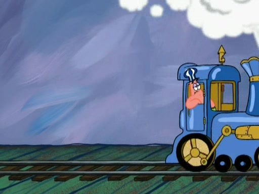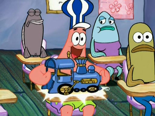 Squidward starts teaching about musical scales by drawing lines on the chalkboard. Patrick then explains how they remind him of a railroad track he saw at a railroad convention last week, where he bought himself a conductor's hat. Then, he starts riding a mini train, only to get trapped in the trash can, though comes back inside a minute later.