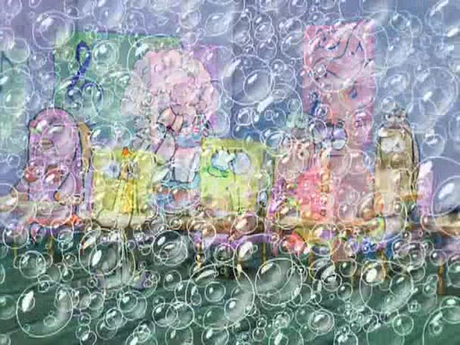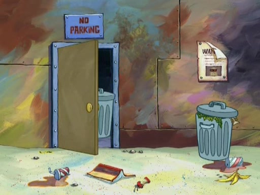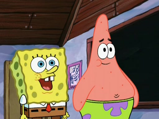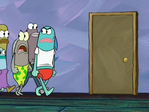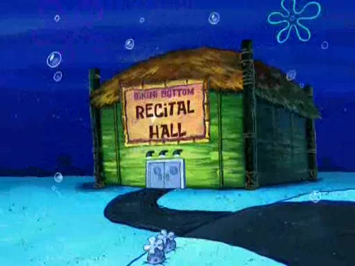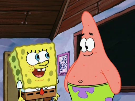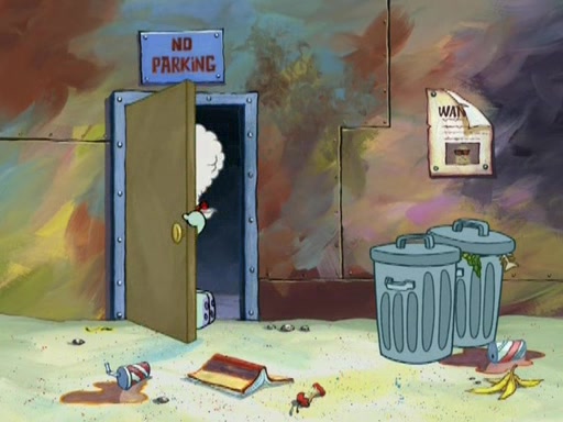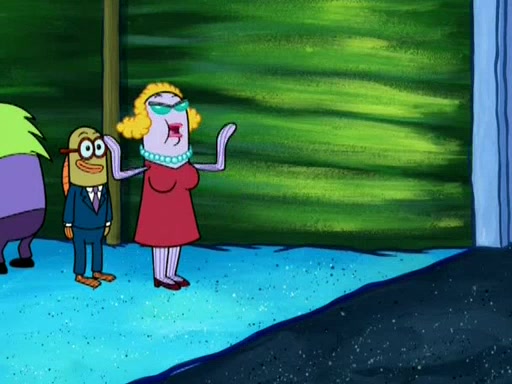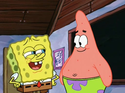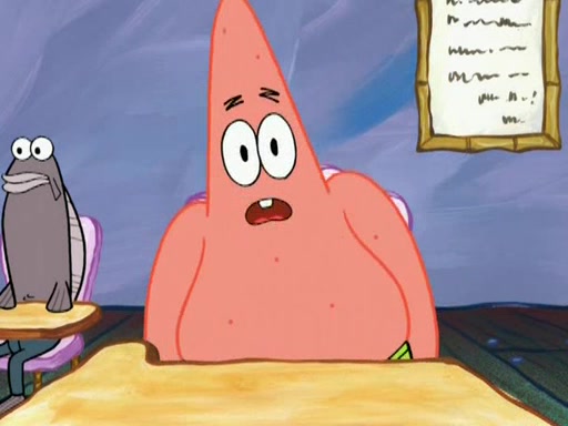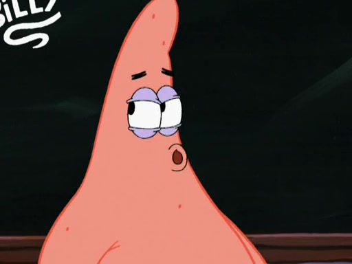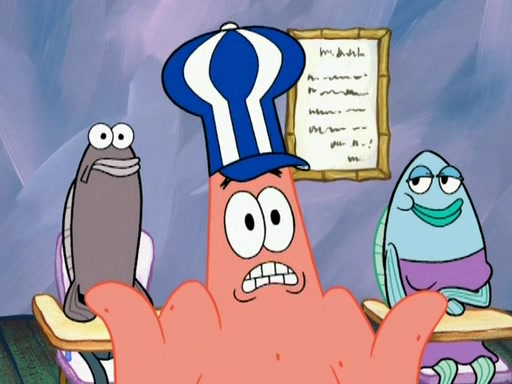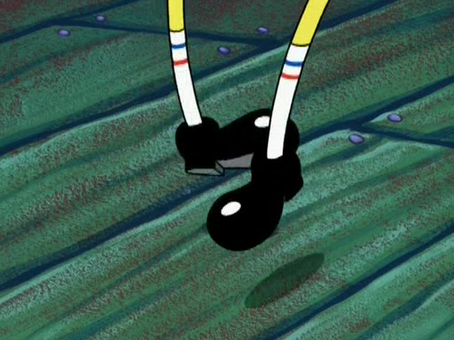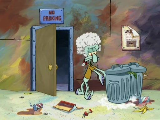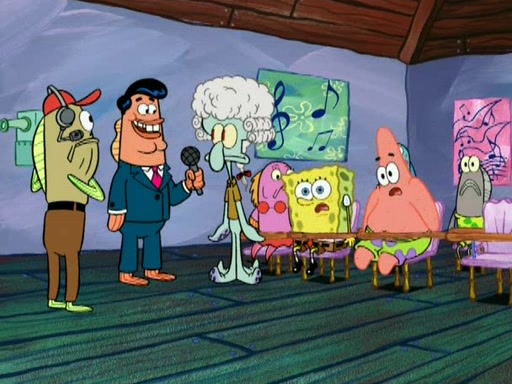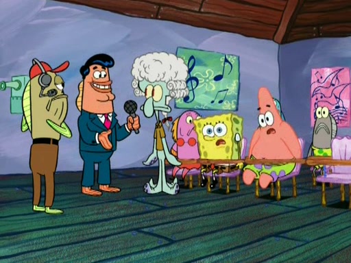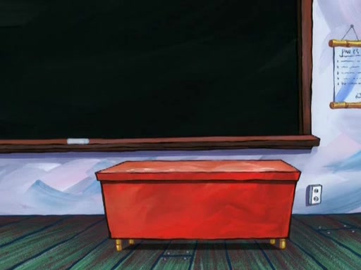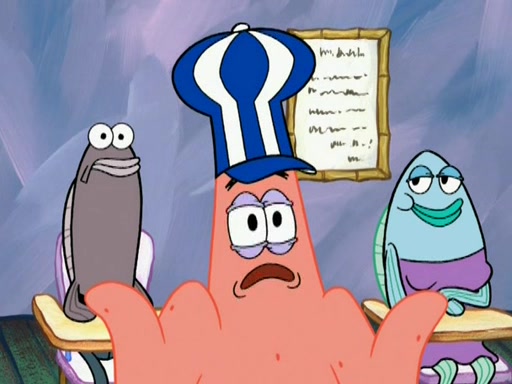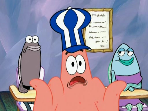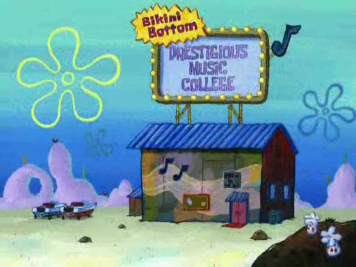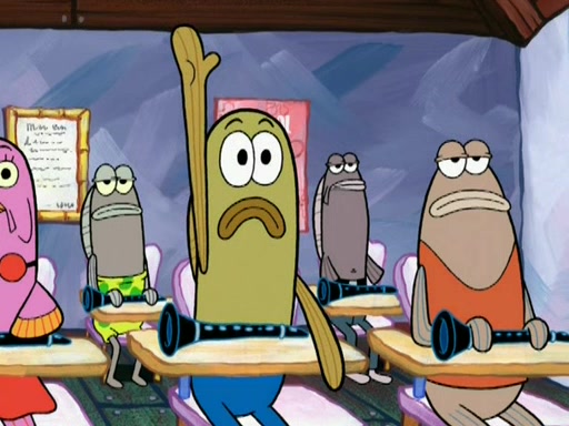 Squidward starts teaching about musical scales by drawing lines on the chalkboard. Patrick then explains how they remind him of a railroad track he saw at a railroad convention last week, where he bought himself a conductor's hat. Then, he starts riding a mini train, only to get trapped in the trash can, though comes back inside a minute later.
