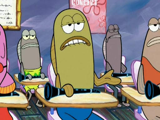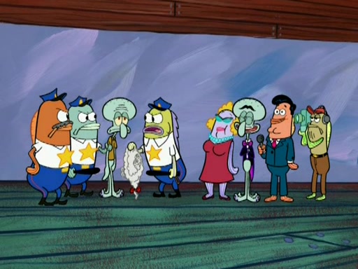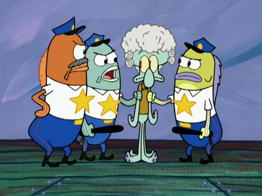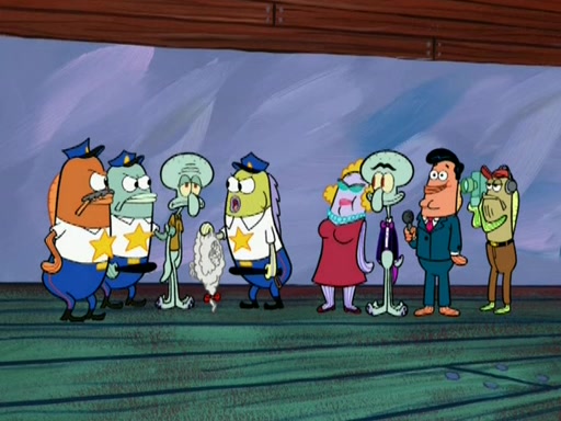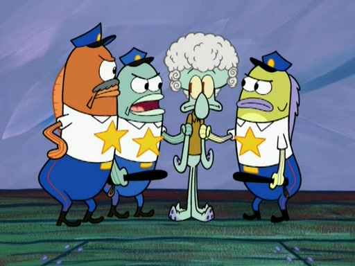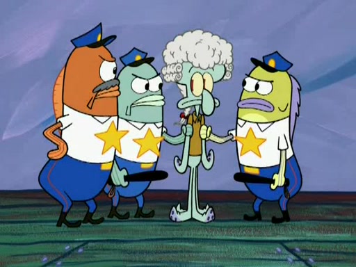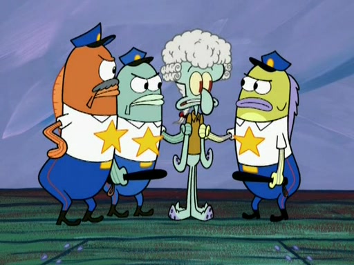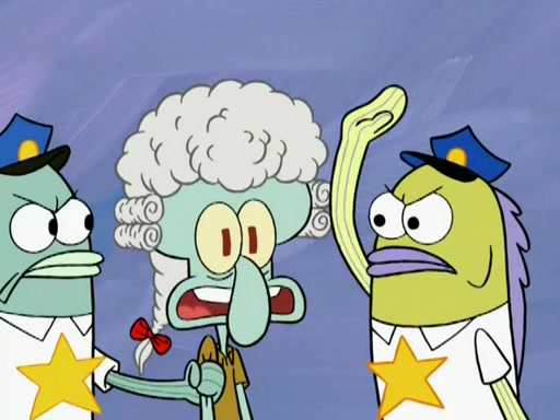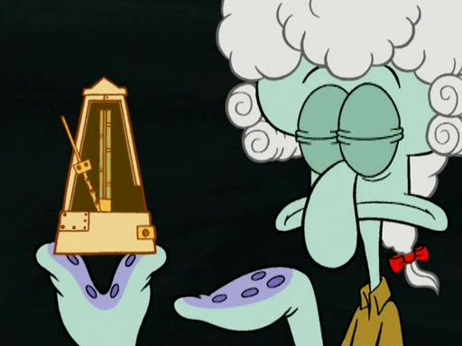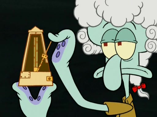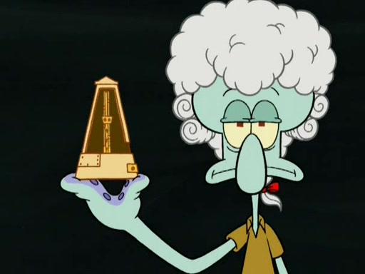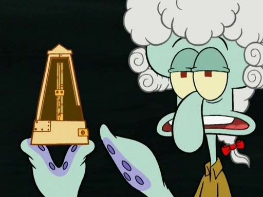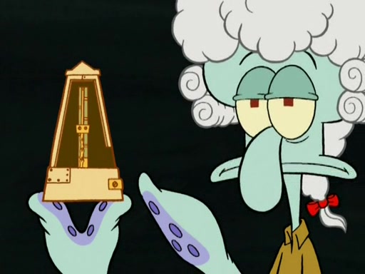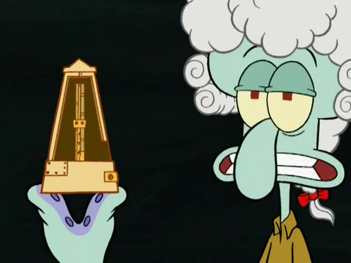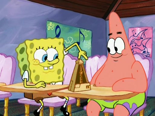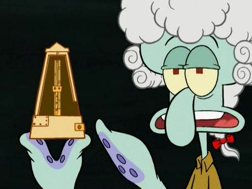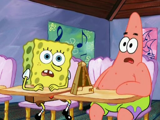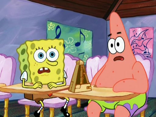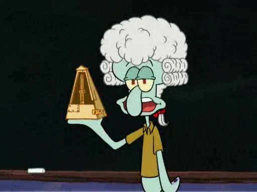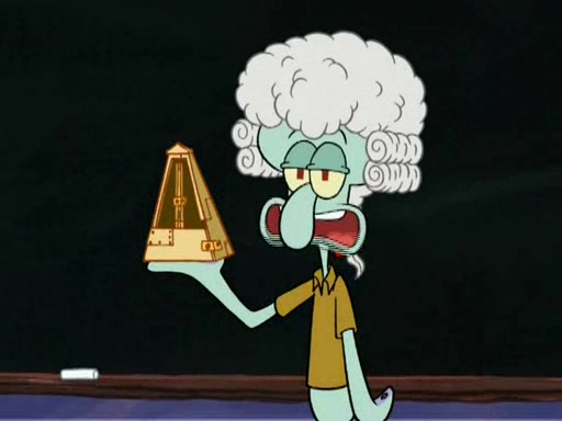 Then, Squidward starts teaching the class about metronomes, much to the interest of SpongeBob and Patrick (though SpongeBob mistook it for a garden gnome). They start making a ticking noise and a news reporter suddenly comes in, wanting to do an interview with "Squilliam Fancyson," although he is soon more interested in SpongeBob and Patrick at how they are in a trance. Squidward then angrily kicks him out after mentioning about possible paranormal activity and SpongeBob and Patrick stop ticking when the bell rings. They forget where they are and they start calling Squidward by his real name, which upsets the rest of the class and they start to leave. Squidward blocks the door with his body and crazily claims that no one is going anywhere. However, the police come in along with the news reporter, the music teacher, and Squilliam Fancyson himself. After noticing that Squidward does not have a unibrow, he is quickly arrested for "impersonating a genius," leaving SpongeBob and Patrick alone with the metronome ticking and them, while in a trance, going "tick tick tick..." along with it.