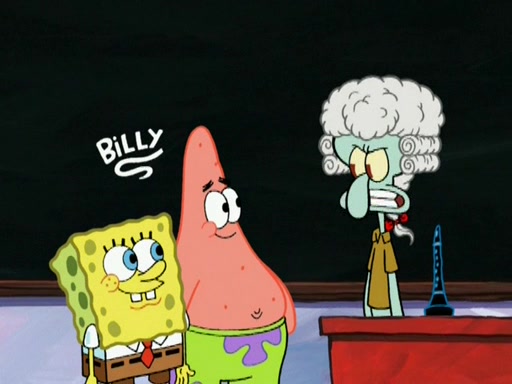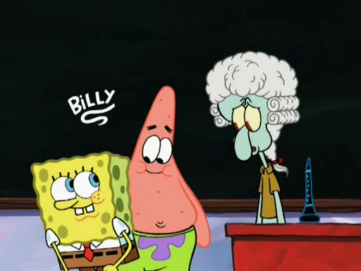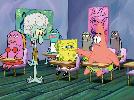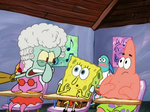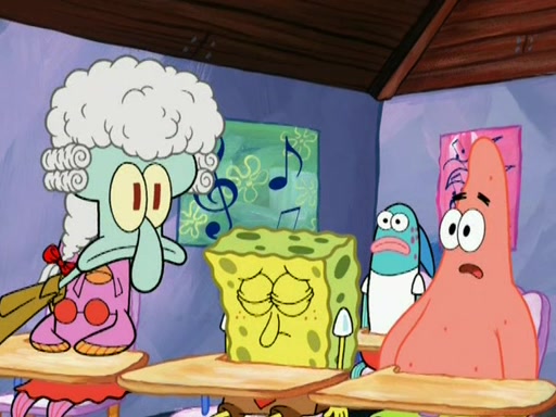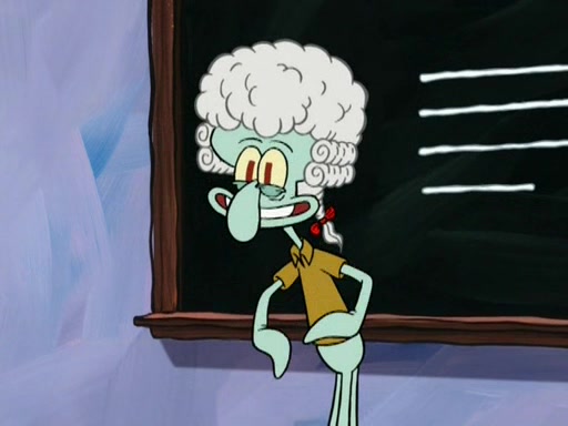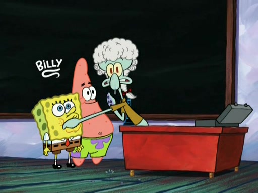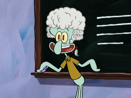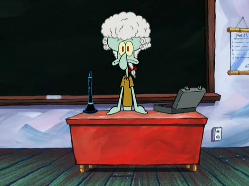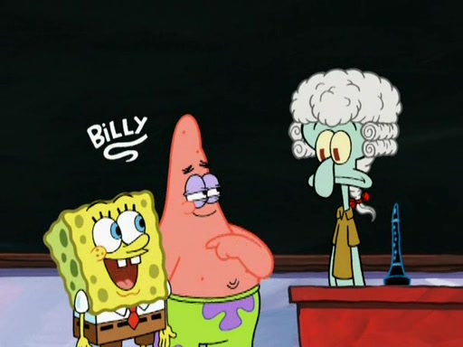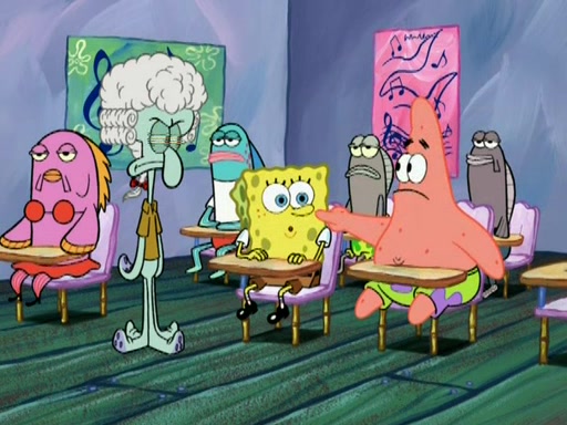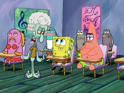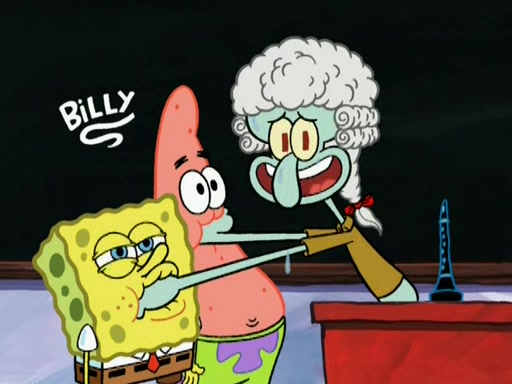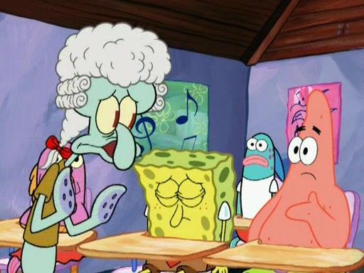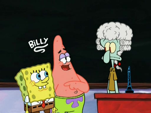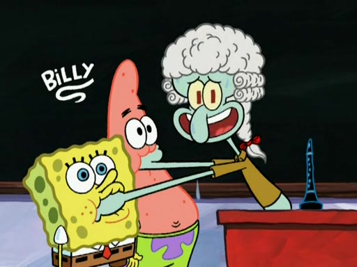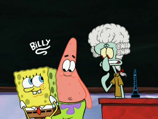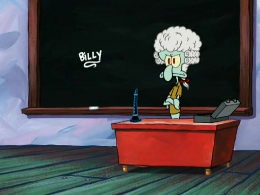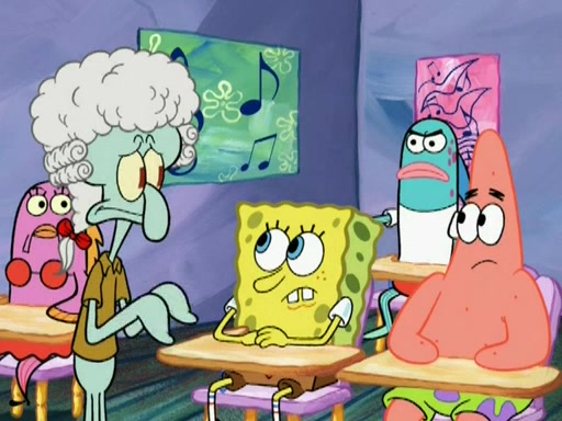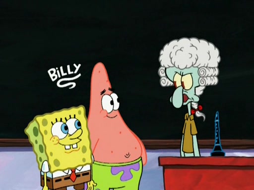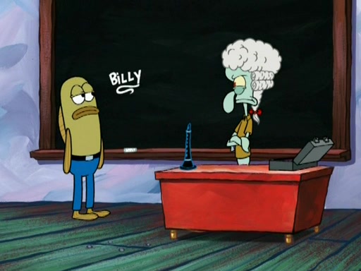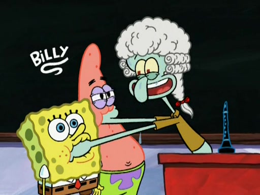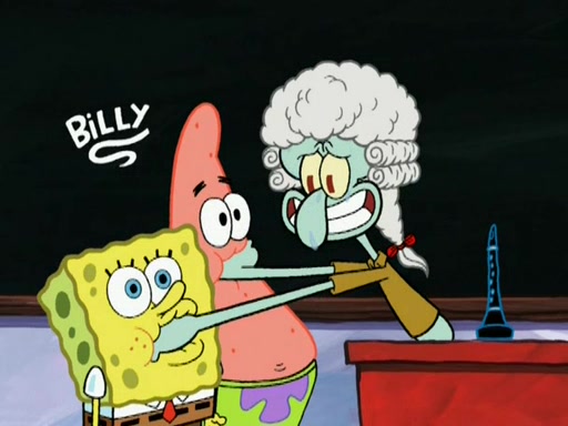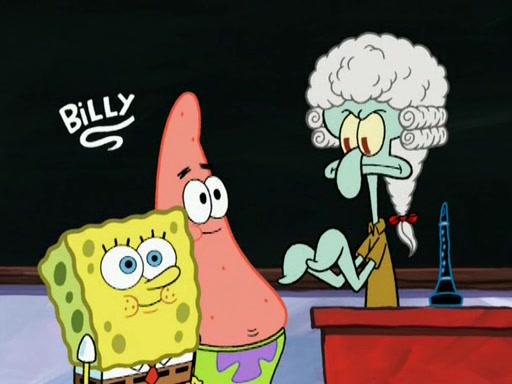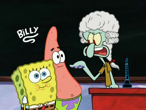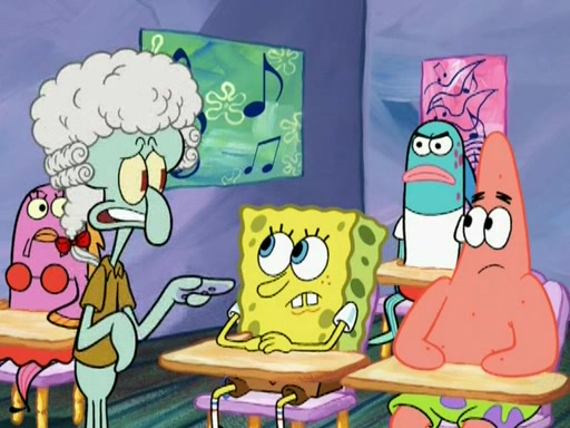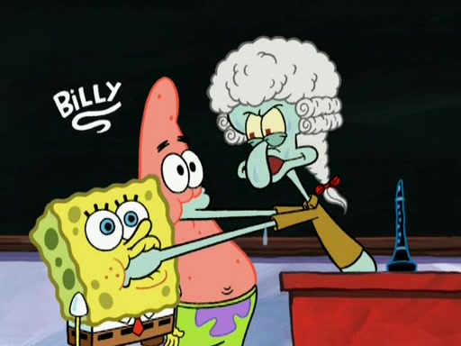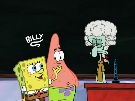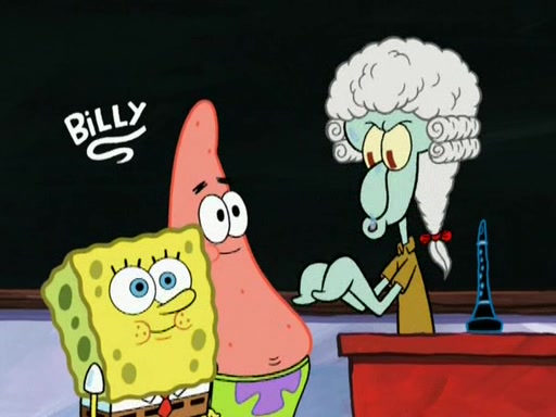 Later, he comes to the music class wearing a wig, posing as Squilliam. He prepares his desk and a kid asks him if he's going to write his name on the board "like most professors do". Annoyed, Squidward tells the kid to write his name on the board. Shortly after that, Squidward discovers that SpongeBob and Patrick are in the music class he is teaching, which annoys him even more. SpongeBob and Patrick are then told that they are allowed to stay just as long as they behave themselves and keep quiet about Squidward's real name. Squidward starts teaching, but is interrupted by SpongeBob's laughter. When asked about it, SpongeBob tries to claim that Patrick was tickling his foot, though reveals that he was tickling his own foot. In order to avoid any more distractions, Squidward moves SpongeBob away from Patrick, but he keeps on laughing. When SpongeBob is told to stop tickling his foot, Patrick reveals that it really was him that time, much to Squidward's surprise.