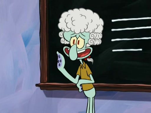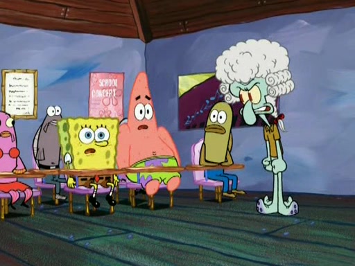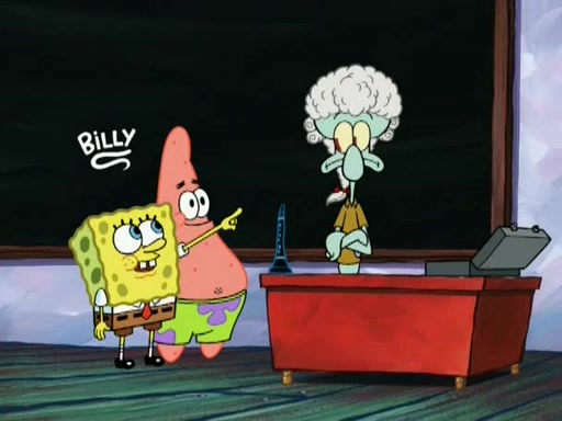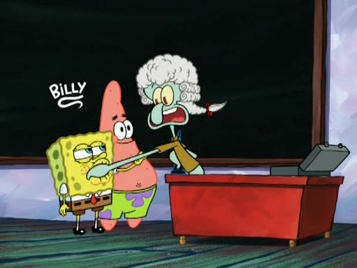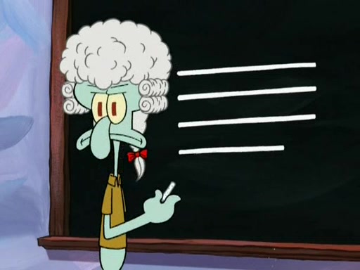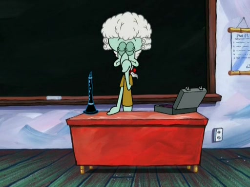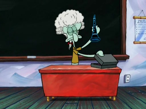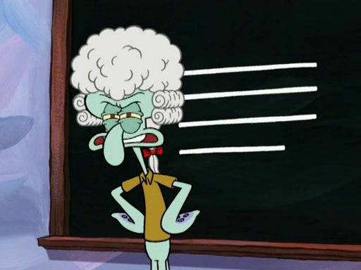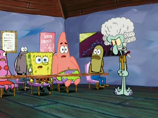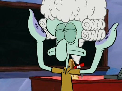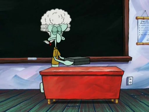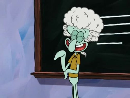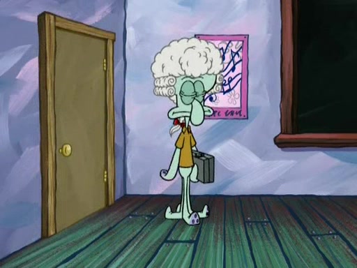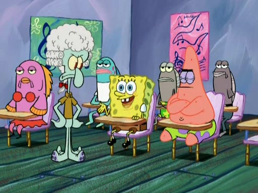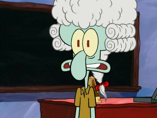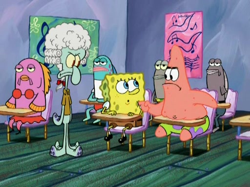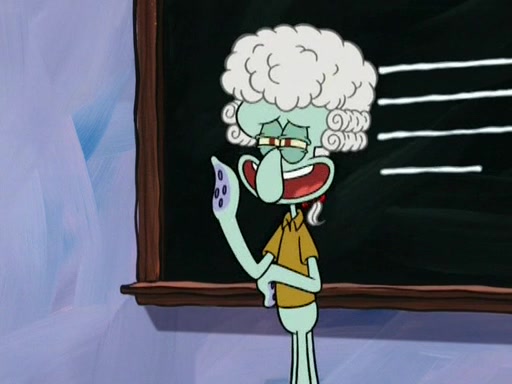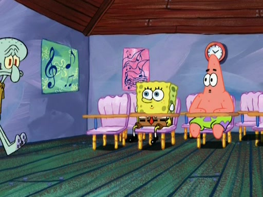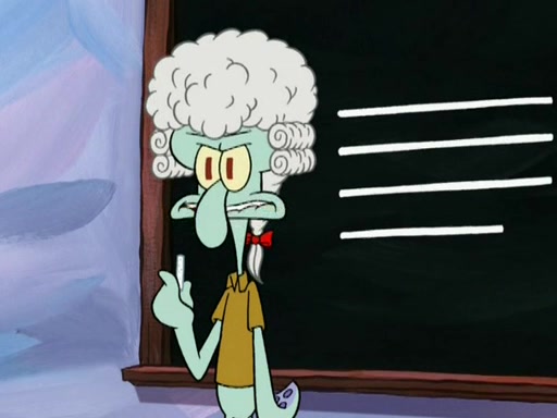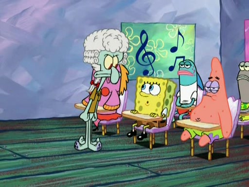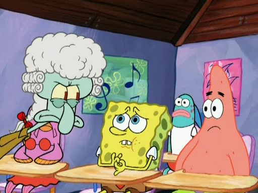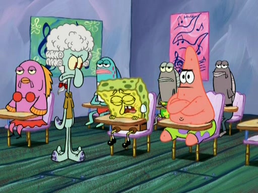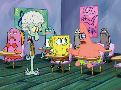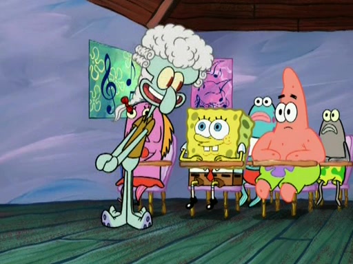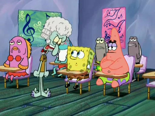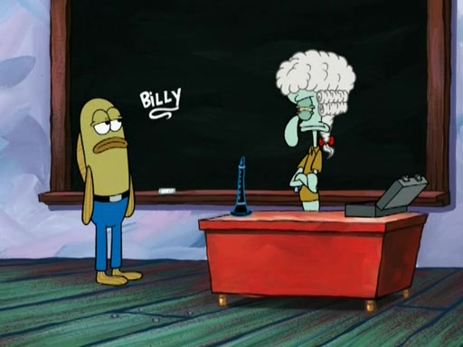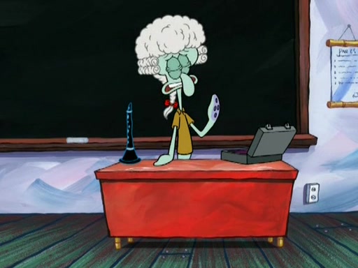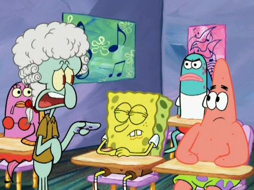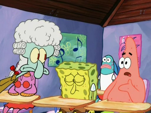 Later, he comes to the music class wearing a wig, posing as Squilliam. He prepares his desk and a kid asks him if he's going to write his name on the board "like most professors do". Annoyed, Squidward tells the kid to write his name on the board. Shortly after that, Squidward discovers that SpongeBob and Patrick are in the music class he is teaching, which annoys him even more. SpongeBob and Patrick are then told that they are allowed to stay just as long as they behave themselves and keep quiet about Squidward's real name. Squidward starts teaching, but is interrupted by SpongeBob's laughter. When asked about it, SpongeBob tries to claim that Patrick was tickling his foot, though reveals that he was tickling his own foot. In order to avoid any more distractions, Squidward moves SpongeBob away from Patrick, but he keeps on laughing. When SpongeBob is told to stop tickling his foot, Patrick reveals that it really was him that time, much to Squidward's surprise.