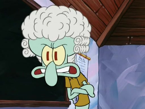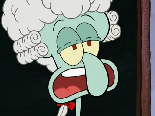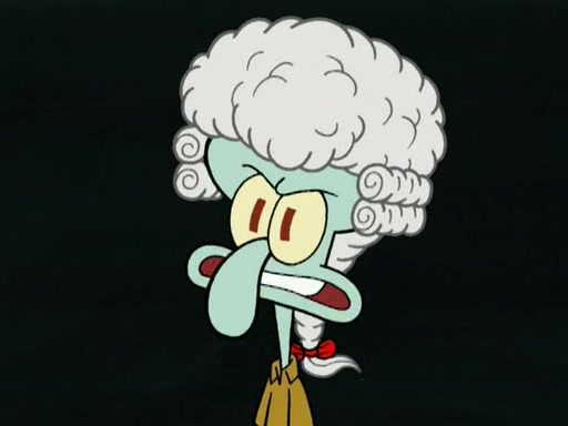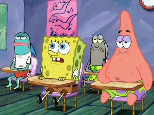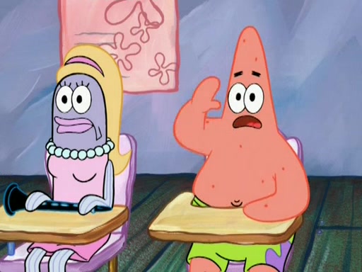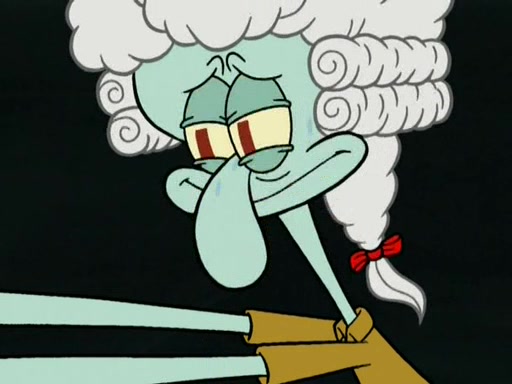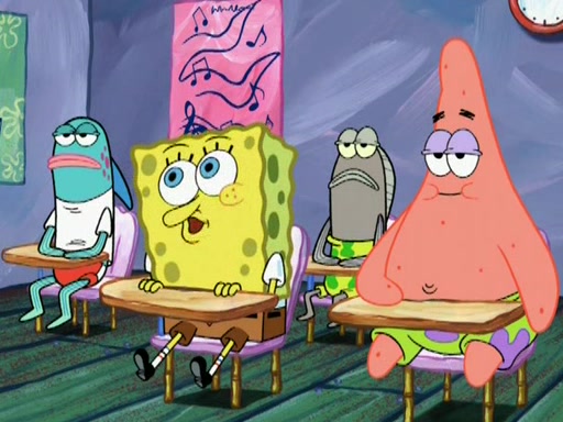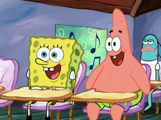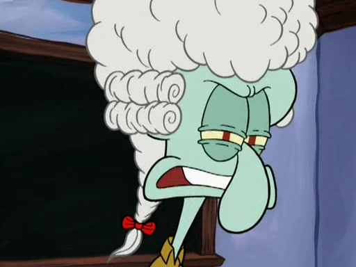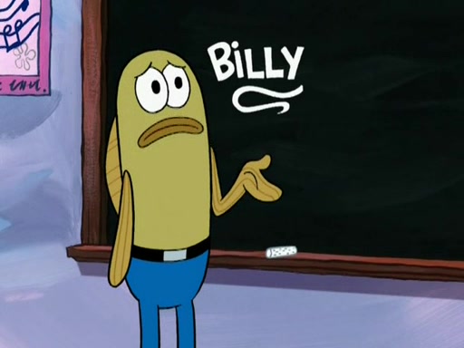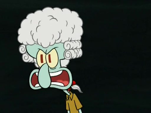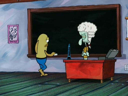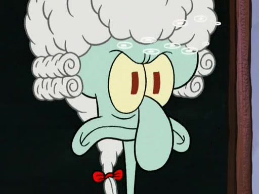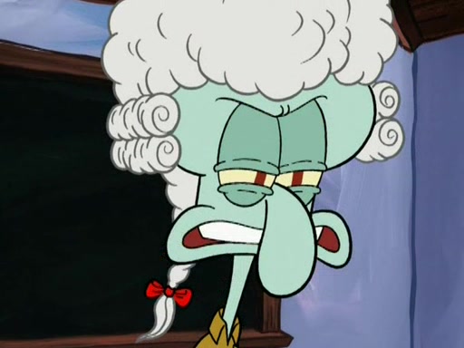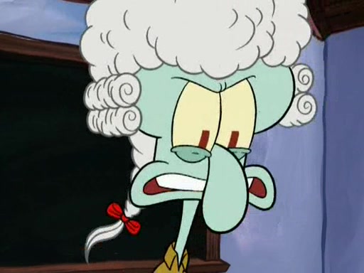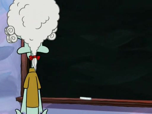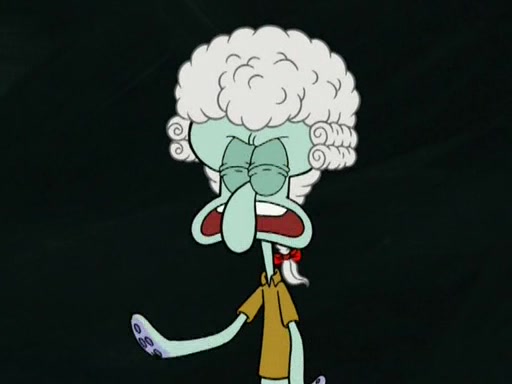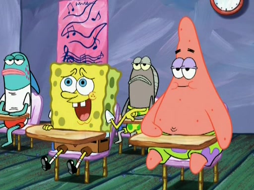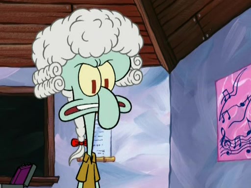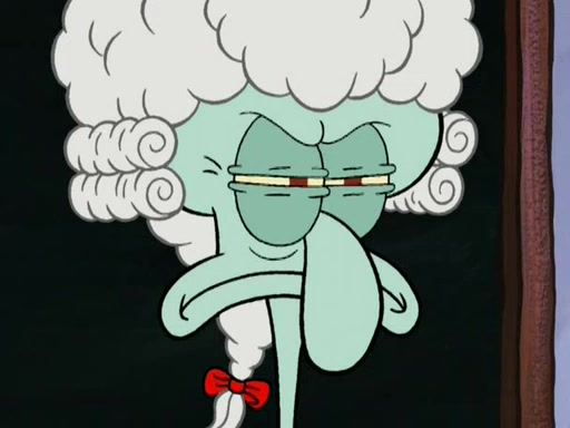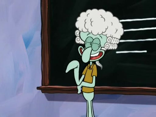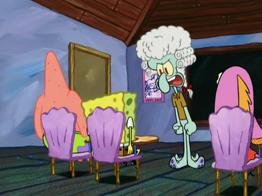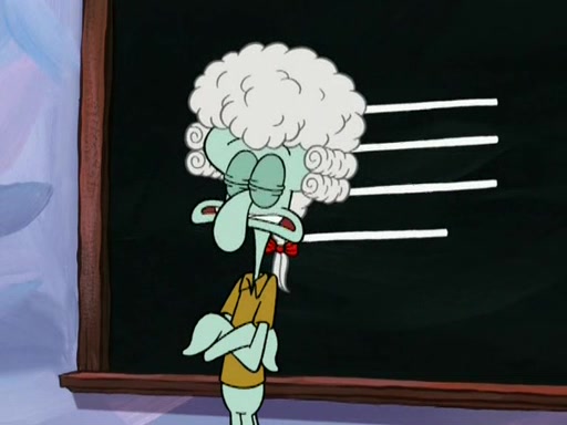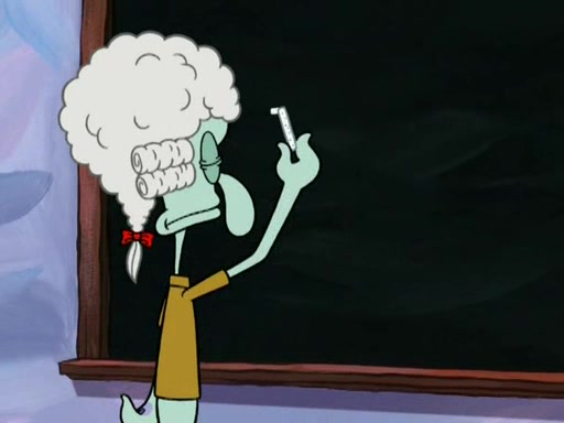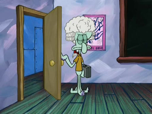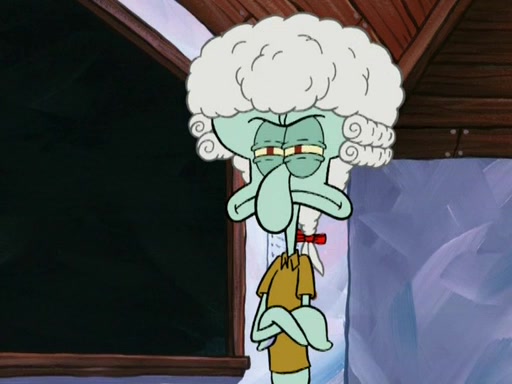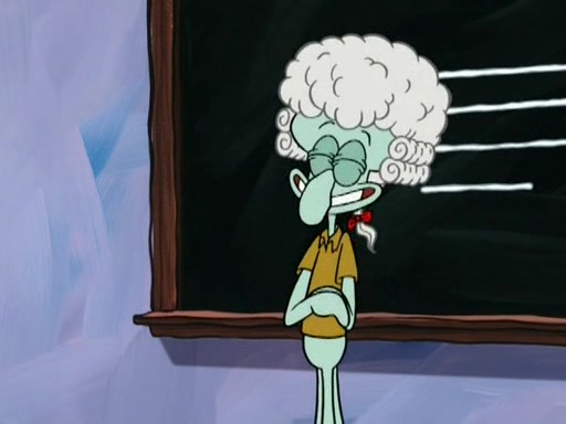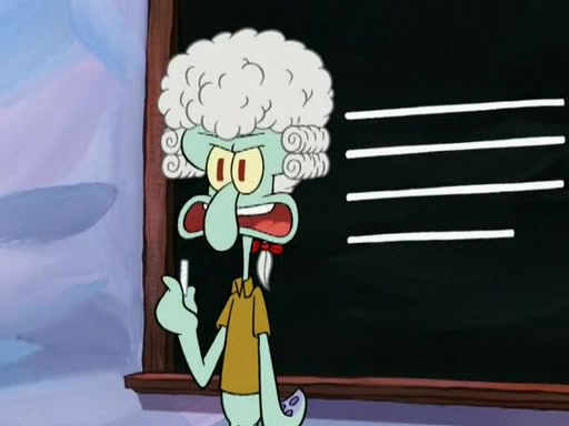 Later, he comes to the music class wearing a wig, posing as Squilliam. He prepares his desk and a kid asks him if he's going to write his name on the board "like most professors do". Annoyed, Squidward tells the kid to write his name on the board. Shortly after that, Squidward discovers that SpongeBob and Patrick are in the music class he is teaching, which annoys him even more. SpongeBob and Patrick are then told that they are allowed to stay just as long as they behave themselves and keep quiet about Squidward's real name. Squidward starts teaching, but is interrupted by SpongeBob's laughter. When asked about it, SpongeBob tries to claim that Patrick was tickling his foot, though reveals that he was tickling his own foot. In order to avoid any more distractions, Squidward moves SpongeBob away from Patrick, but he keeps on laughing. When SpongeBob is told to stop tickling his foot, Patrick reveals that it really was him that time, much to Squidward's surprise.