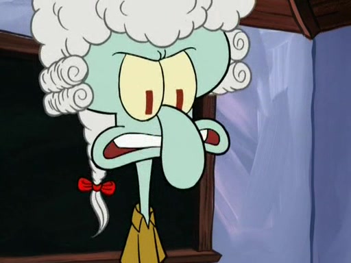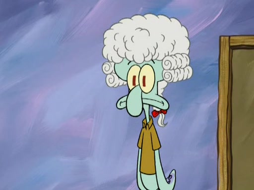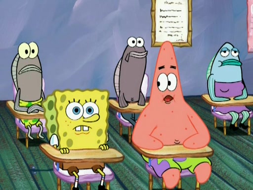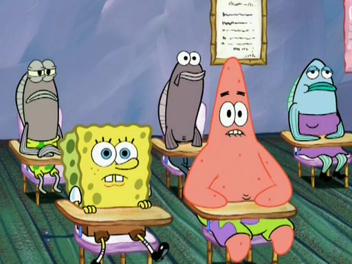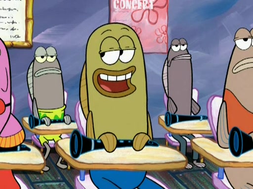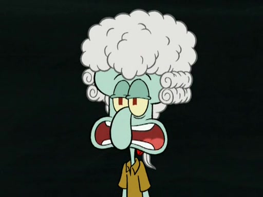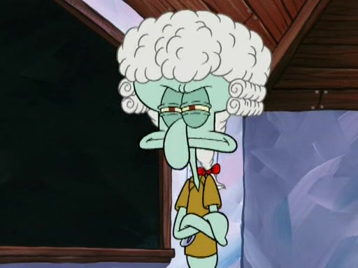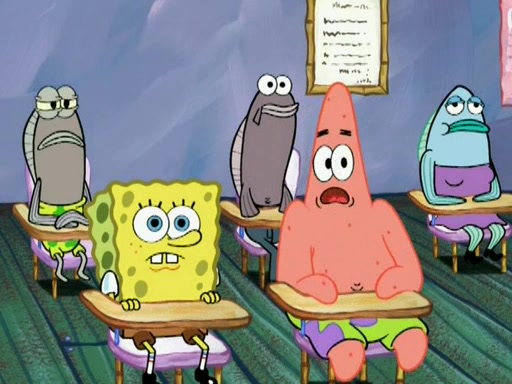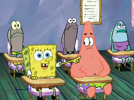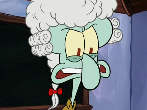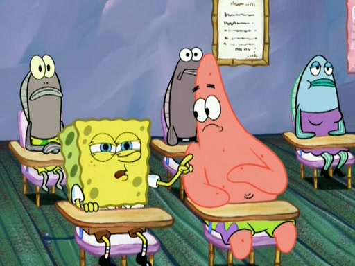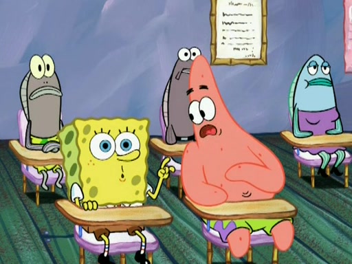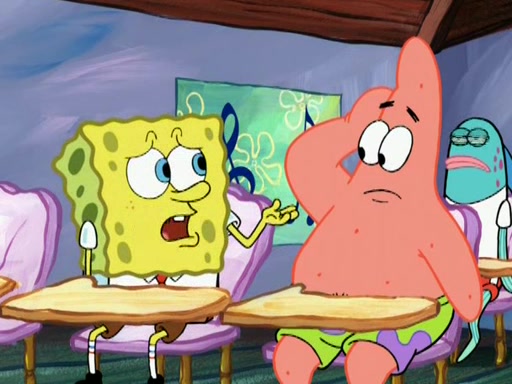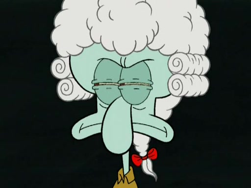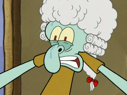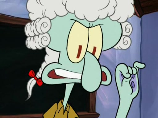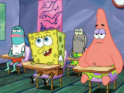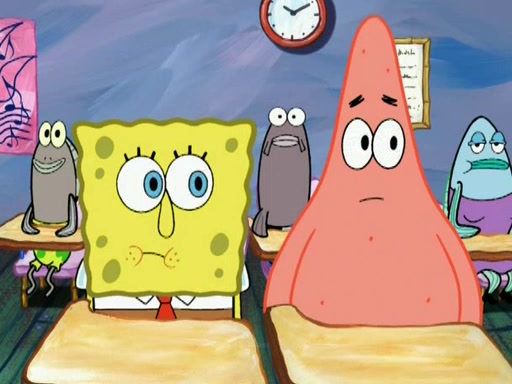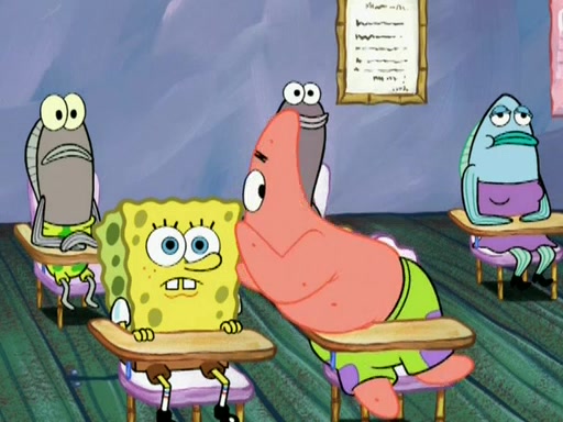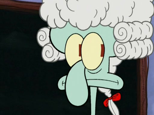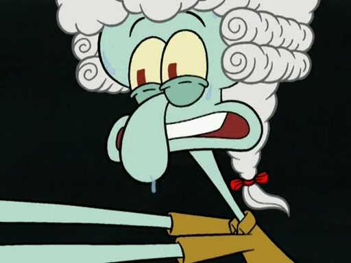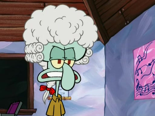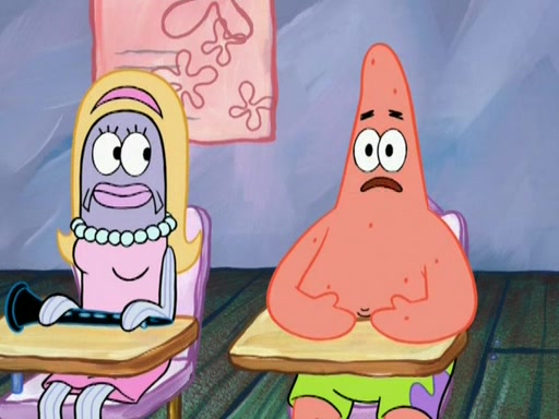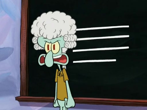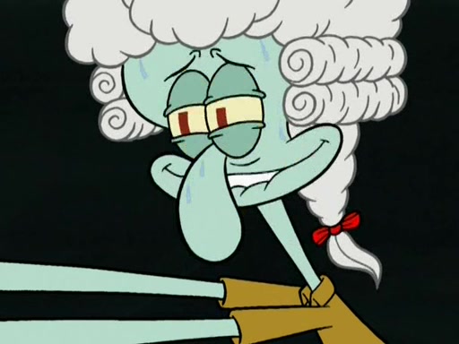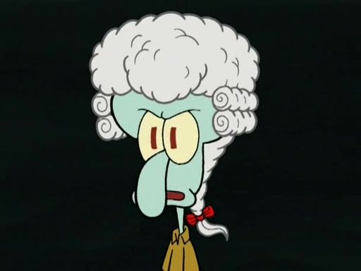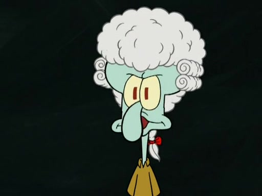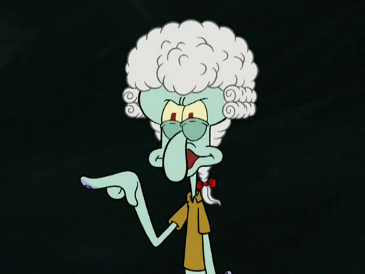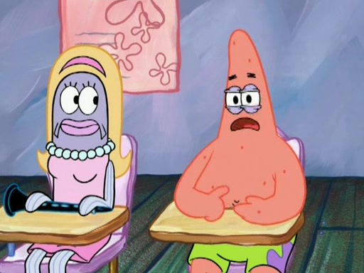 Later, he comes to the music class wearing a wig, posing as Squilliam. He prepares his desk and a kid asks him if he's going to write his name on the board "like most professors do". Annoyed, Squidward tells the kid to write his name on the board. Shortly after that, Squidward discovers that SpongeBob and Patrick are in the music class he is teaching, which annoys him even more. SpongeBob and Patrick are then told that they are allowed to stay just as long as they behave themselves and keep quiet about Squidward's real name. Squidward starts teaching, but is interrupted by SpongeBob's laughter. When asked about it, SpongeBob tries to claim that Patrick was tickling his foot, though reveals that he was tickling his own foot. In order to avoid any more distractions, Squidward moves SpongeBob away from Patrick, but he keeps on laughing. When SpongeBob is told to stop tickling his foot, Patrick reveals that it really was him that time, much to Squidward's surprise.