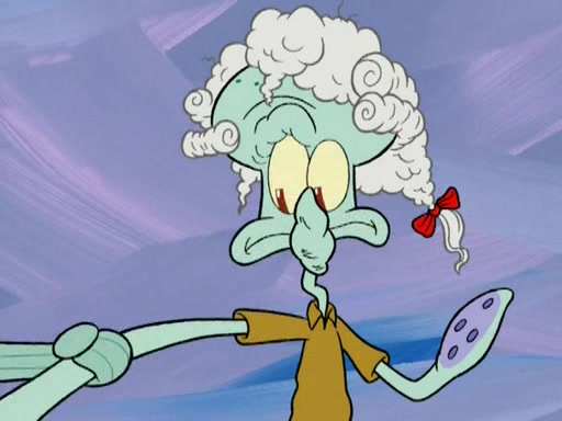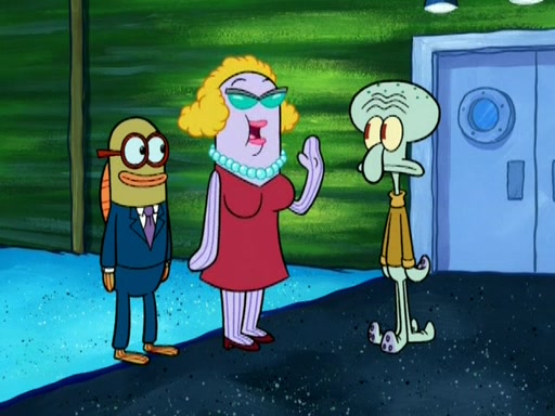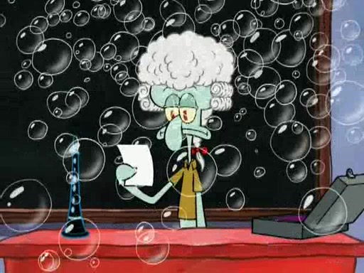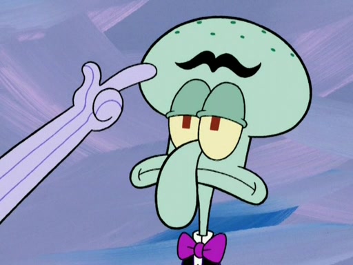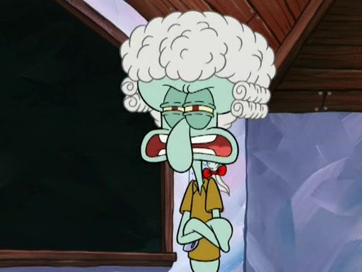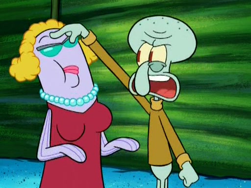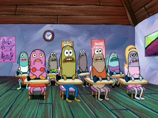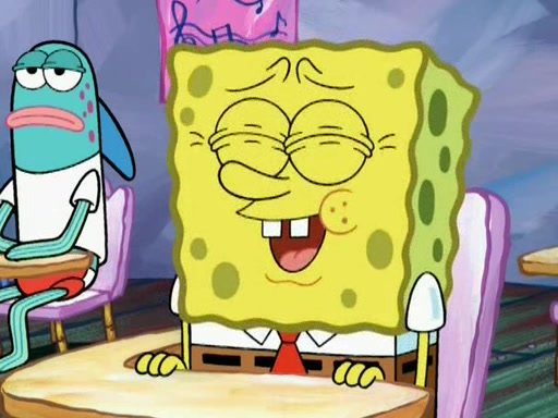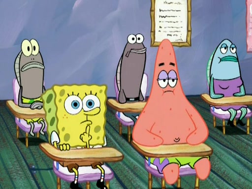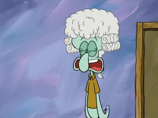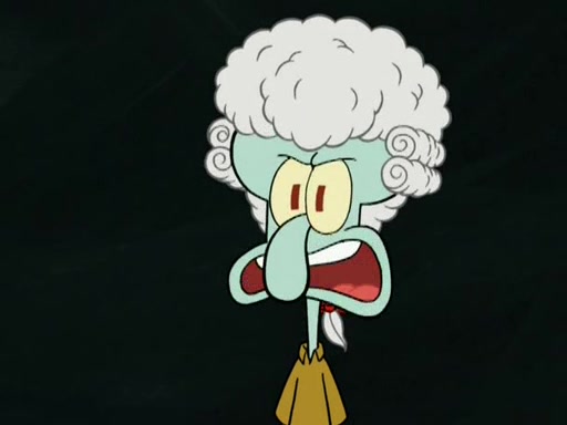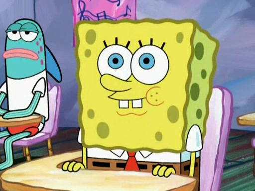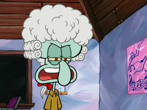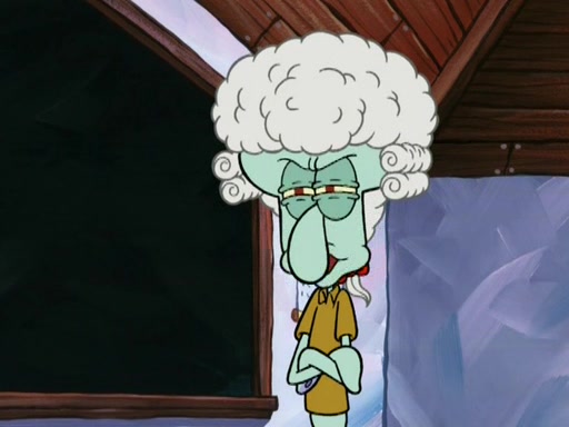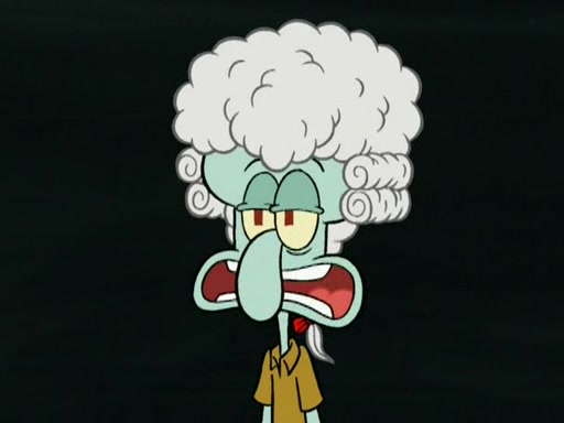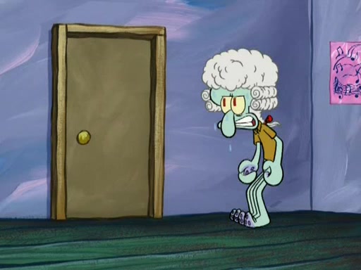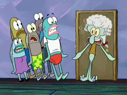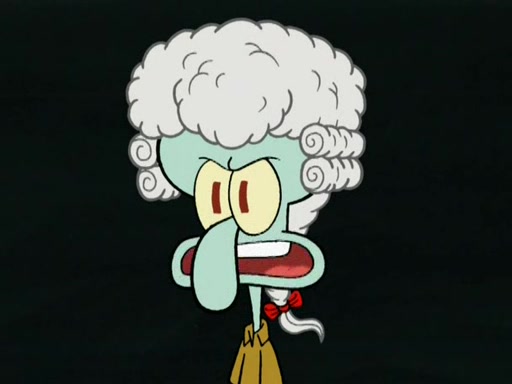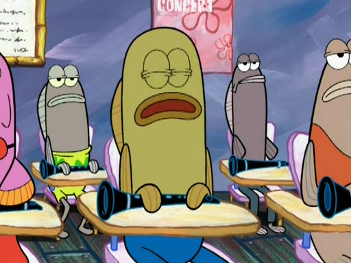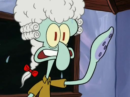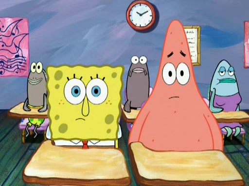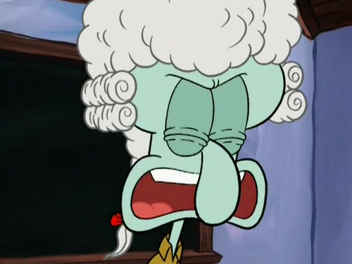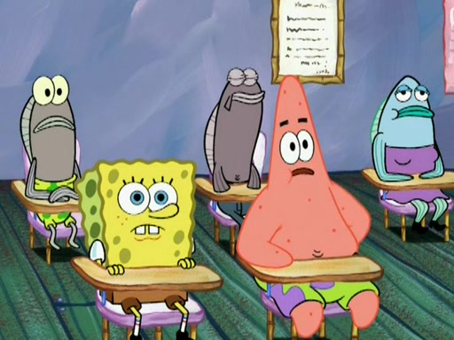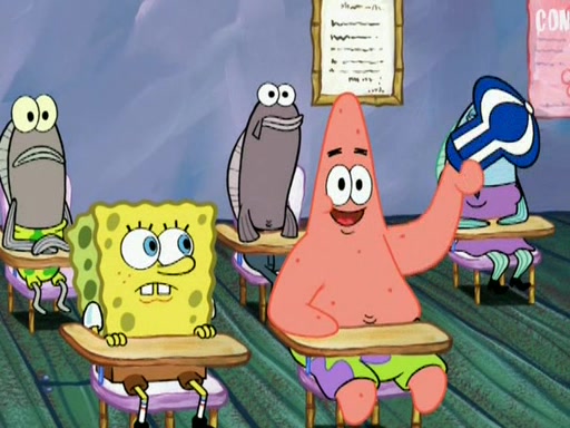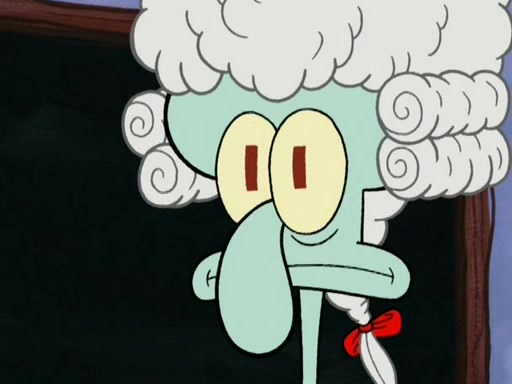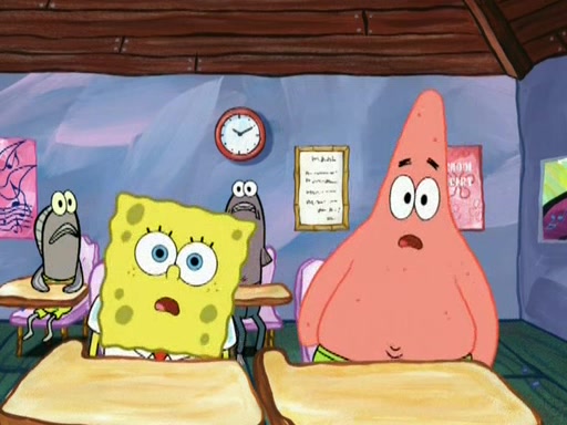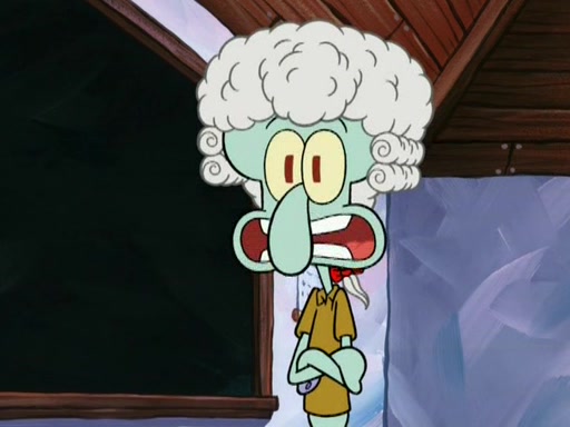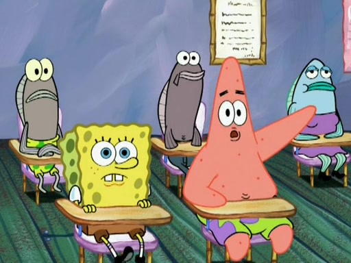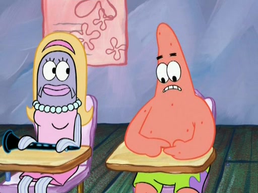 Later, he comes to the music class wearing a wig, posing as Squilliam. He prepares his desk and a kid asks him if he's going to write his name on the board "like most professors do". Annoyed, Squidward tells the kid to write his name on the board. Shortly after that, Squidward discovers that SpongeBob and Patrick are in the music class he is teaching, which annoys him even more. SpongeBob and Patrick are then told that they are allowed to stay just as long as they behave themselves and keep quiet about Squidward's real name. Squidward starts teaching, but is interrupted by SpongeBob's laughter. When asked about it, SpongeBob tries to claim that Patrick was tickling his foot, though reveals that he was tickling his own foot. In order to avoid any more distractions, Squidward moves SpongeBob away from Patrick, but he keeps on laughing. When SpongeBob is told to stop tickling his foot, Patrick reveals that it really was him that time, much to Squidward's surprise.