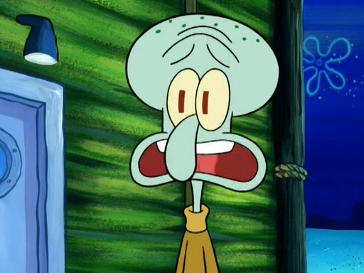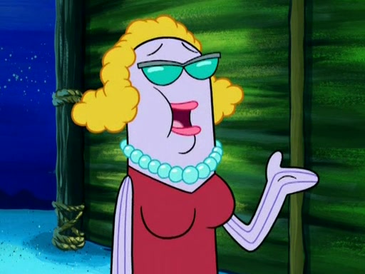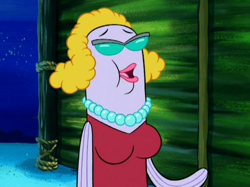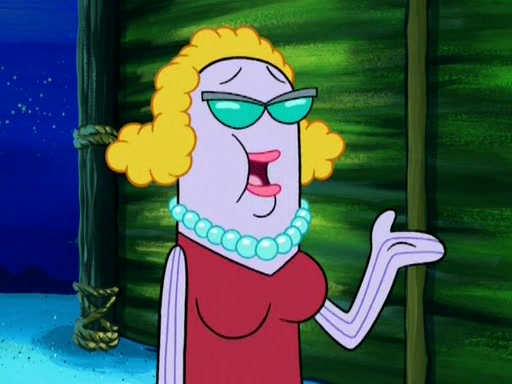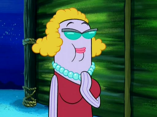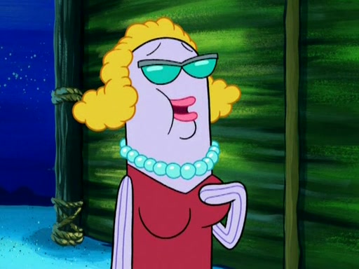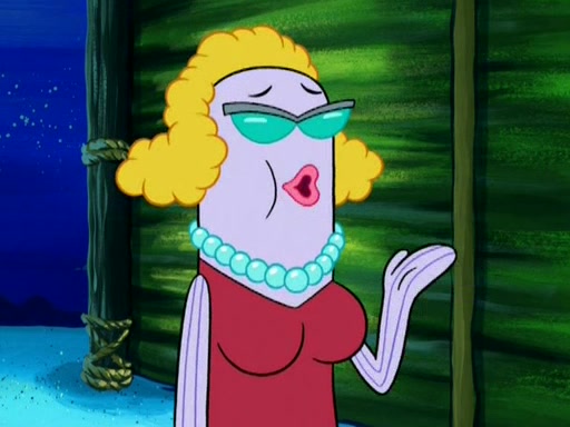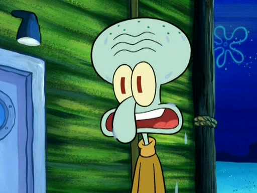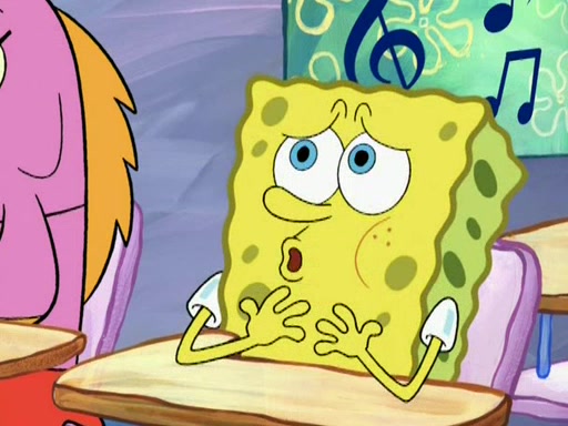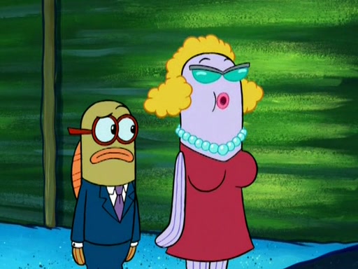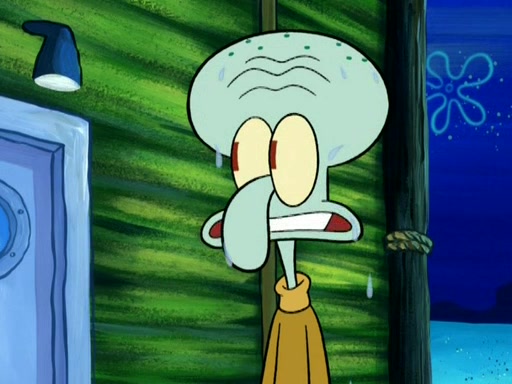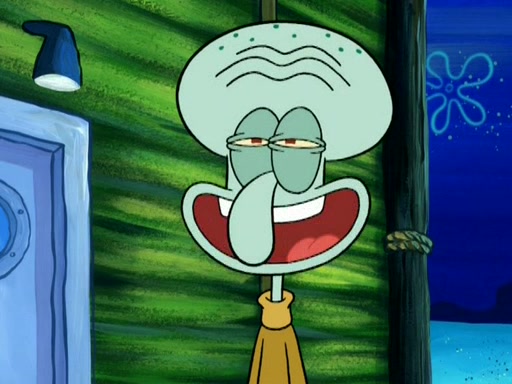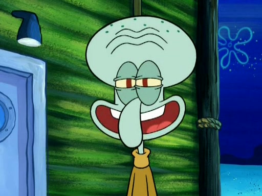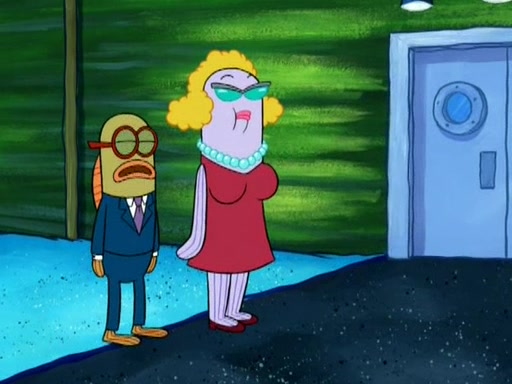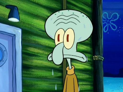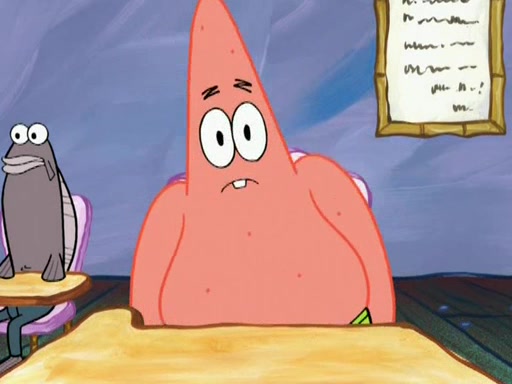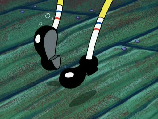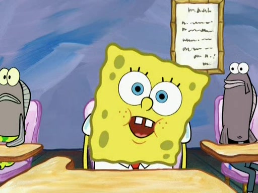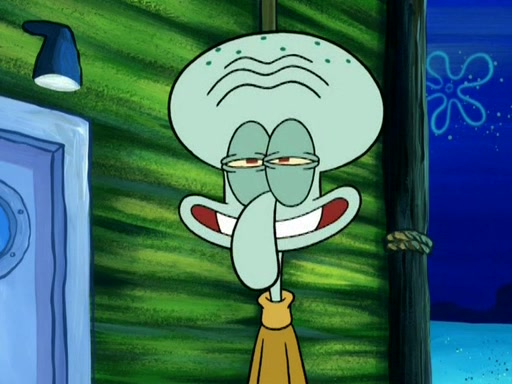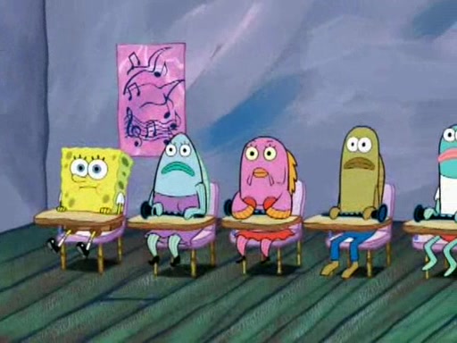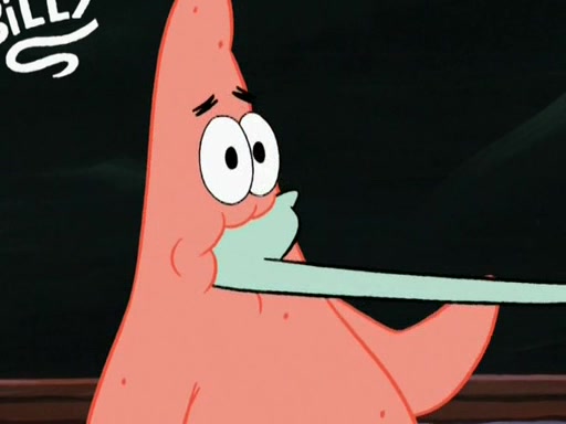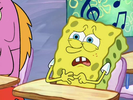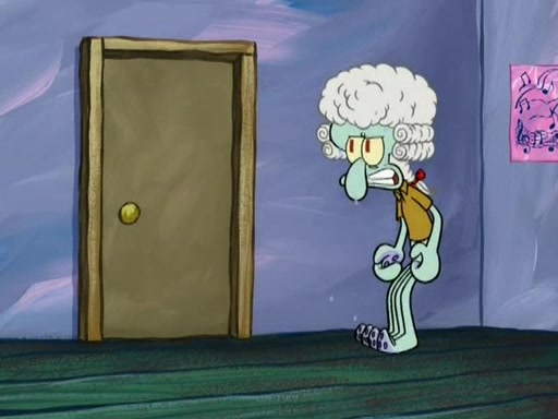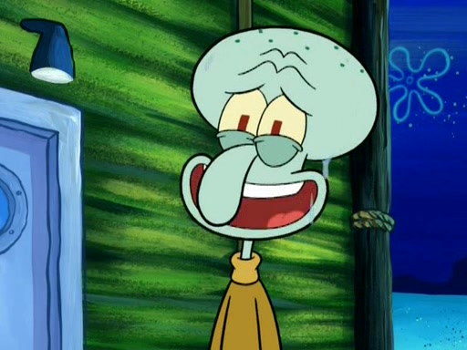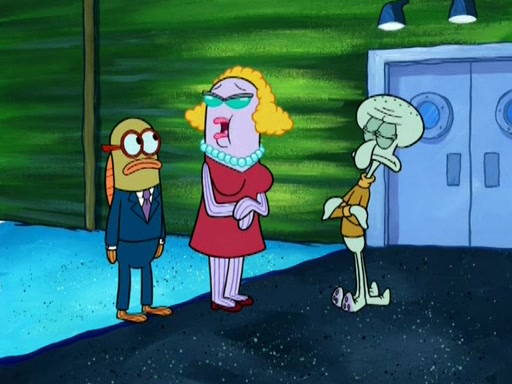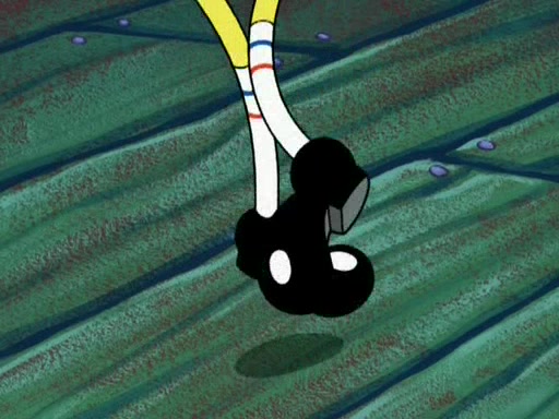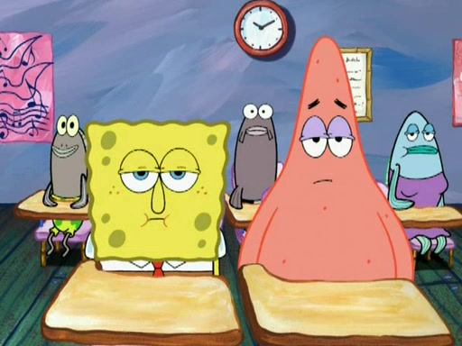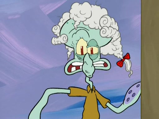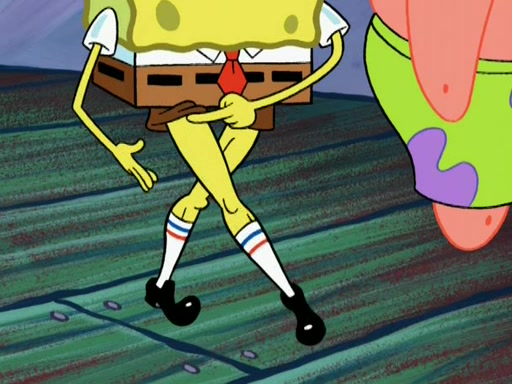 Later, he comes to the music class wearing a wig, posing as Squilliam. He prepares his desk and a kid asks him if he's going to write his name on the board "like most professors do". Annoyed, Squidward tells the kid to write his name on the board. Shortly after that, Squidward discovers that SpongeBob and Patrick are in the music class he is teaching, which annoys him even more. SpongeBob and Patrick are then told that they are allowed to stay just as long as they behave themselves and keep quiet about Squidward's real name. Squidward starts teaching, but is interrupted by SpongeBob's laughter. When asked about it, SpongeBob tries to claim that Patrick was tickling his foot, though reveals that he was tickling his own foot. In order to avoid any more distractions, Squidward moves SpongeBob away from Patrick, but he keeps on laughing. When SpongeBob is told to stop tickling his foot, Patrick reveals that it really was him that time, much to Squidward's surprise.