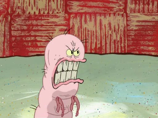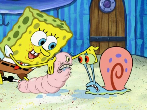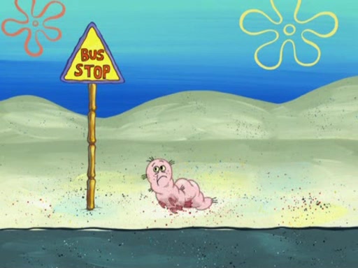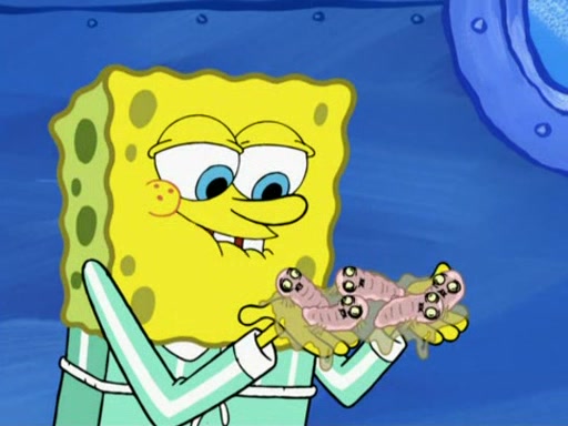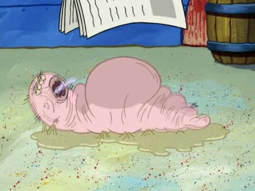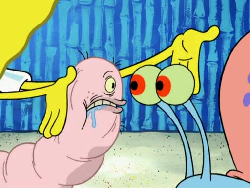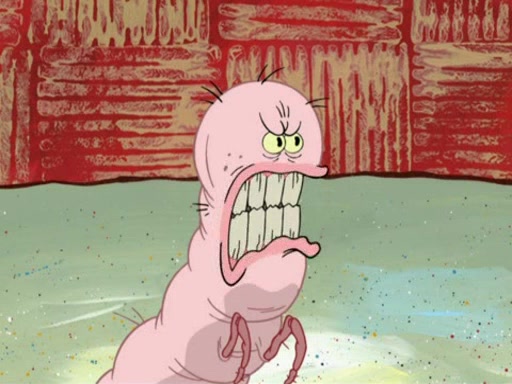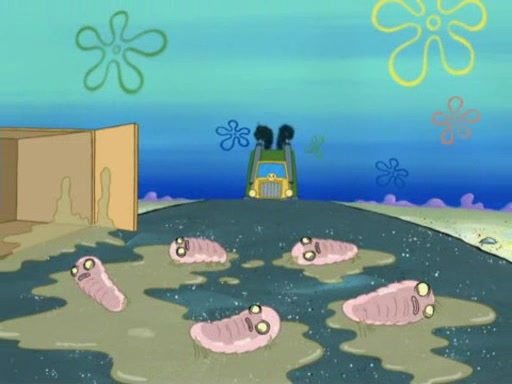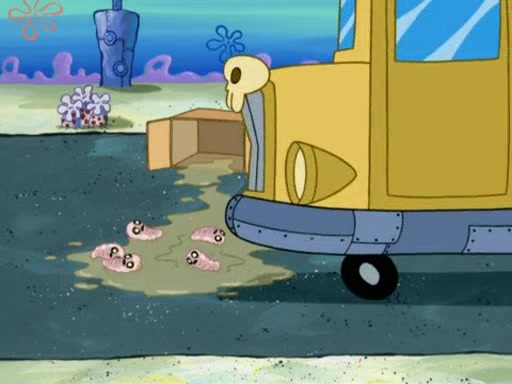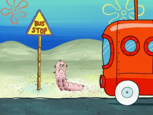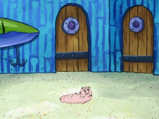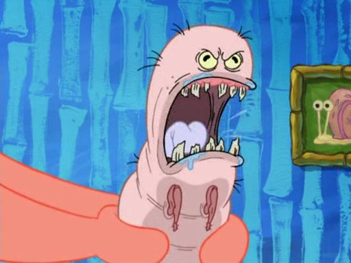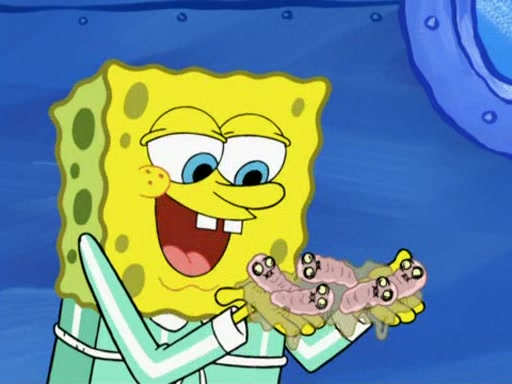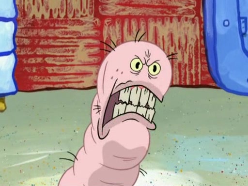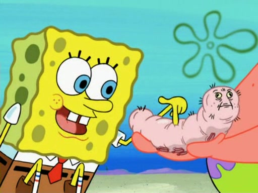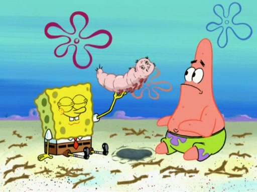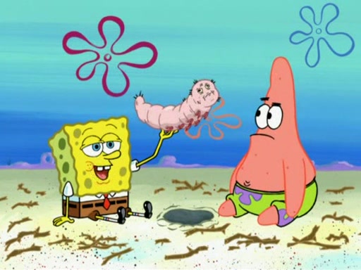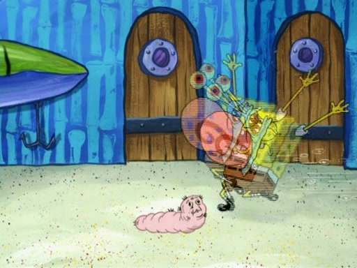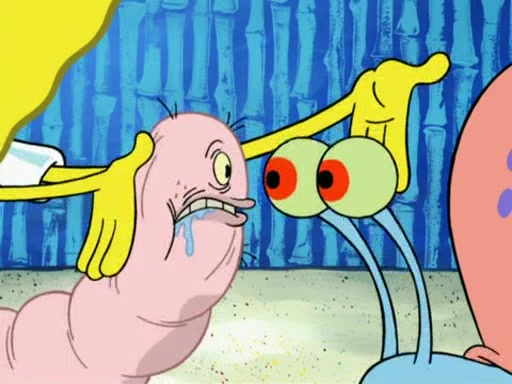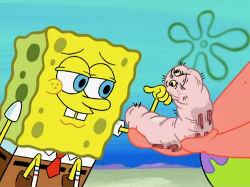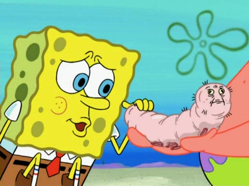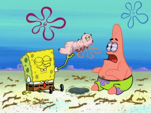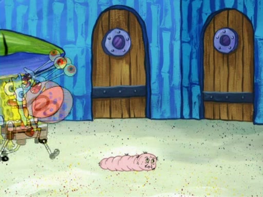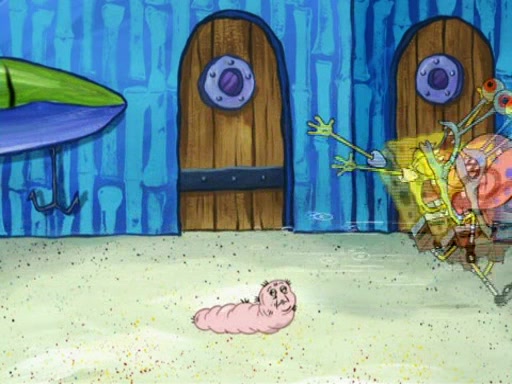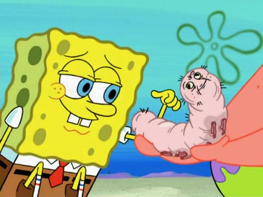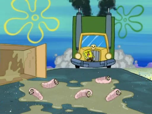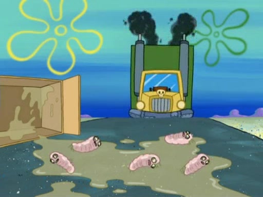 He first takes the worms to Squidward's house, in which Squidward is disgusted by them for vomiting a type of acid at his face. He then takes it to Mrs. Puff, in which she is shocked by them and puffs, damaging her house. SpongeBob then proceeds to go to a grocery store, stumbling upon Larry the Lobster. He decides to take them, but only to eat them alive due to raw protein, in which SpongeBob knocks them out of Larry's hand. The worms land in the middle of the road right in front of a moving truck, in which SpongeBob reacts. He goes inside the truck to pull out the connections to the engine, and unscrews and gets rid of the engine, forcing the truck to halt.