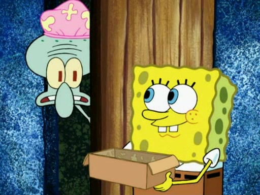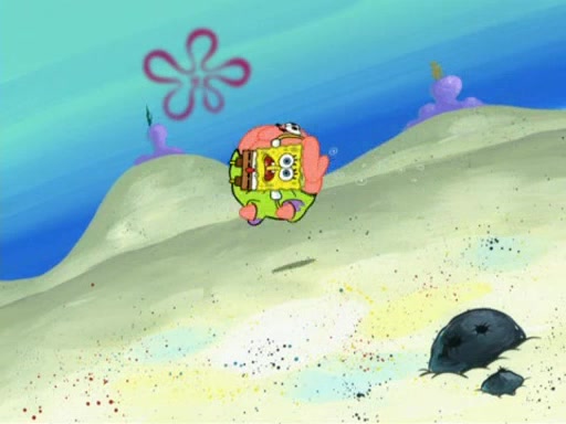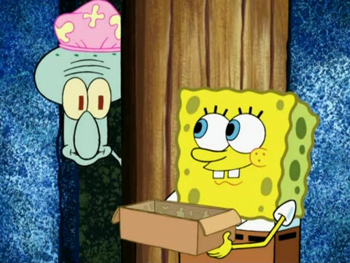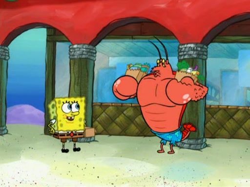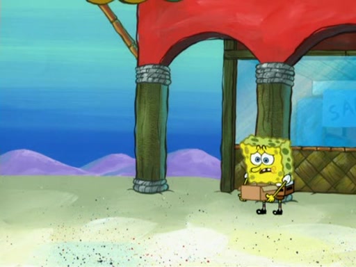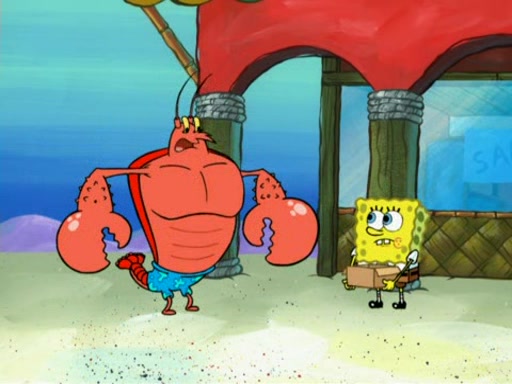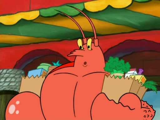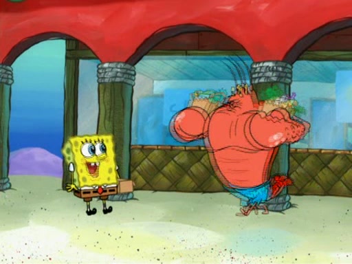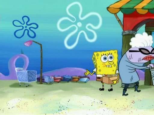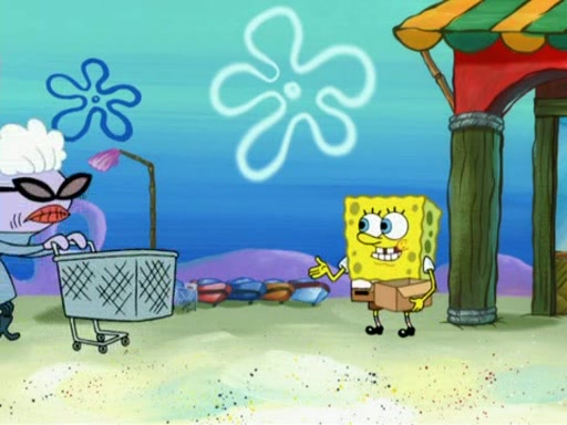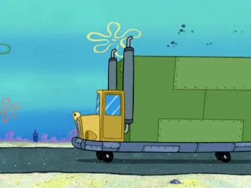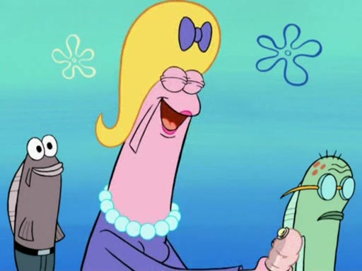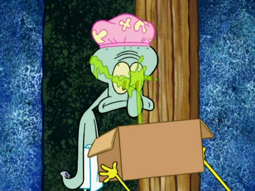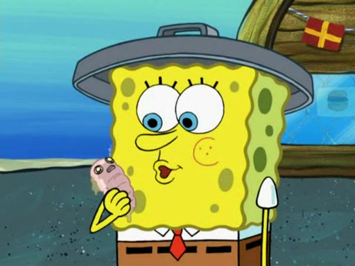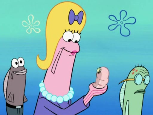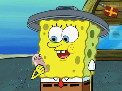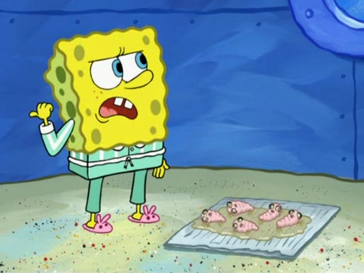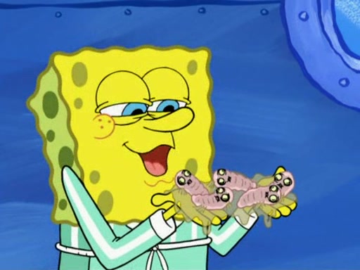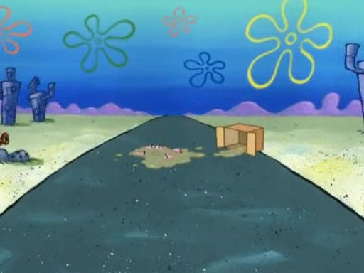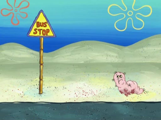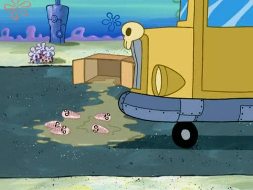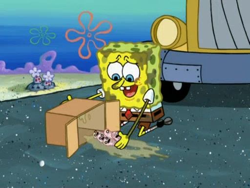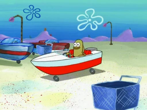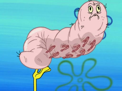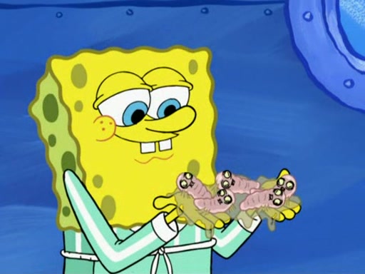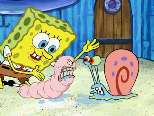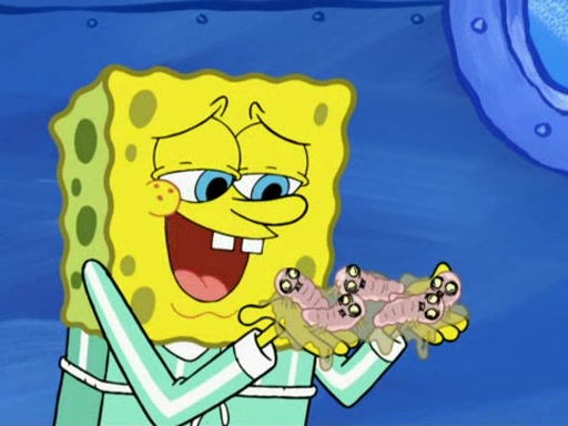 He first takes the worms to Squidward's house, in which Squidward is disgusted by them for vomiting a type of acid at his face. He then takes it to Mrs. Puff, in which she is shocked by them and puffs, damaging her house. SpongeBob then proceeds to go to a grocery store, stumbling upon Larry the Lobster. He decides to take them, but only to eat them alive due to raw protein, in which SpongeBob knocks them out of Larry's hand. The worms land in the middle of the road right in front of a moving truck, in which SpongeBob reacts. He goes inside the truck to pull out the connections to the engine, and unscrews and gets rid of the engine, forcing the truck to halt.