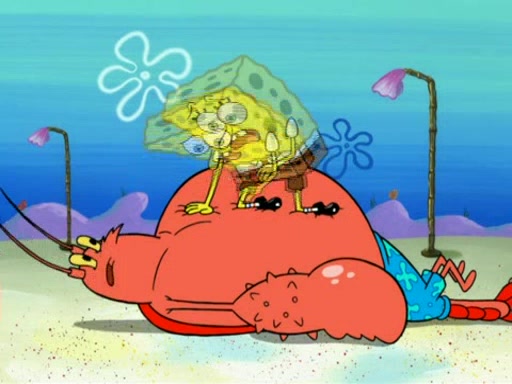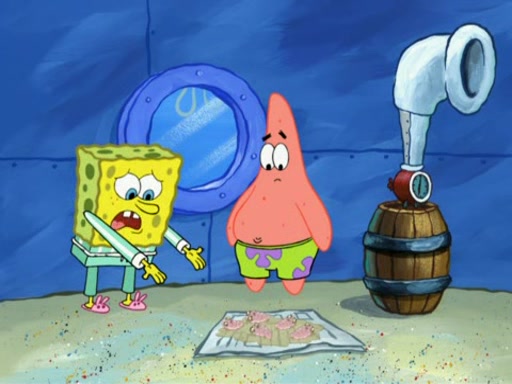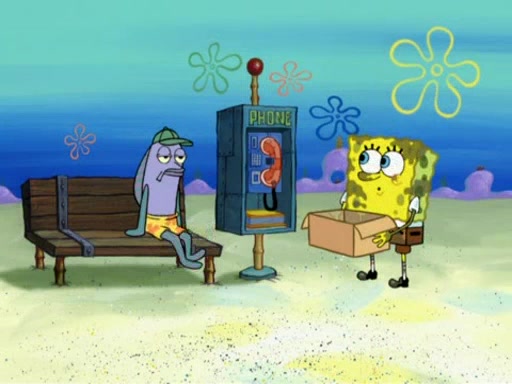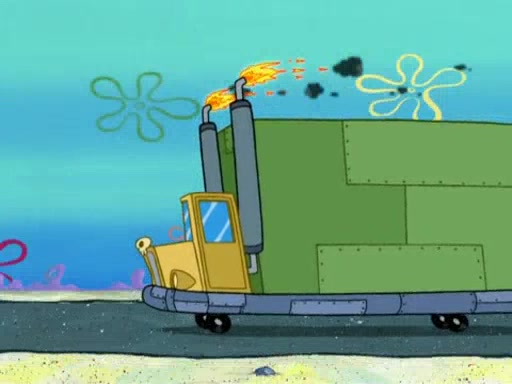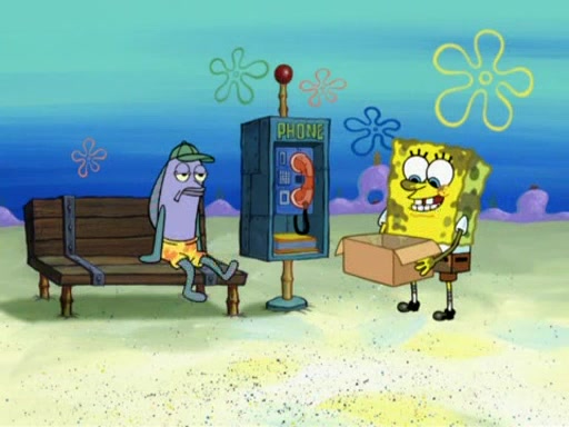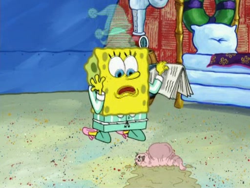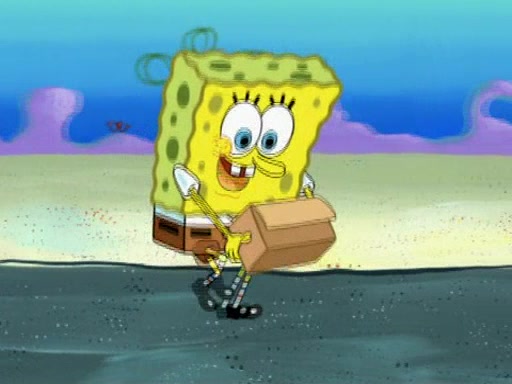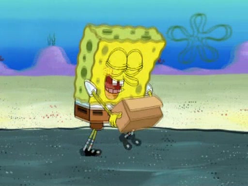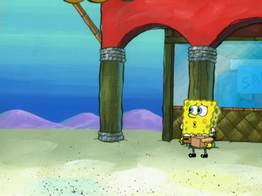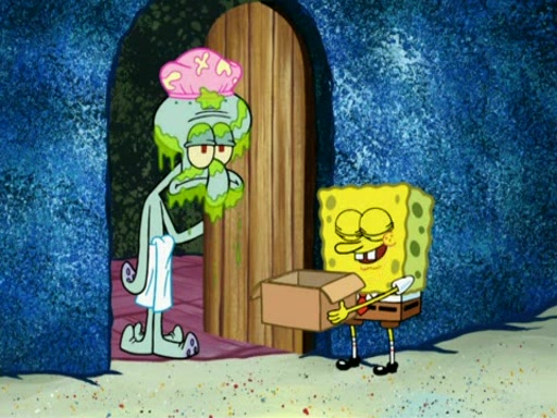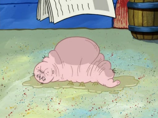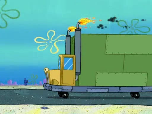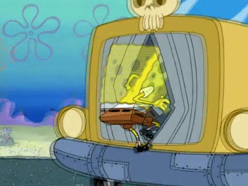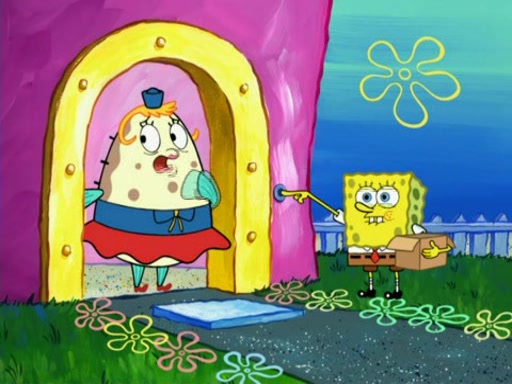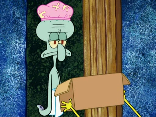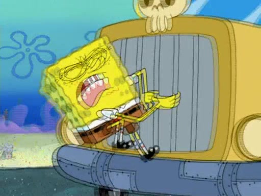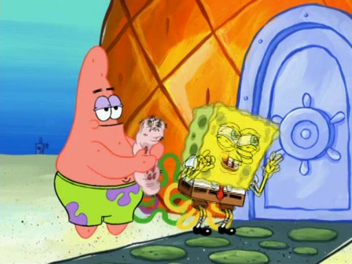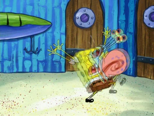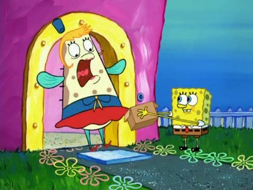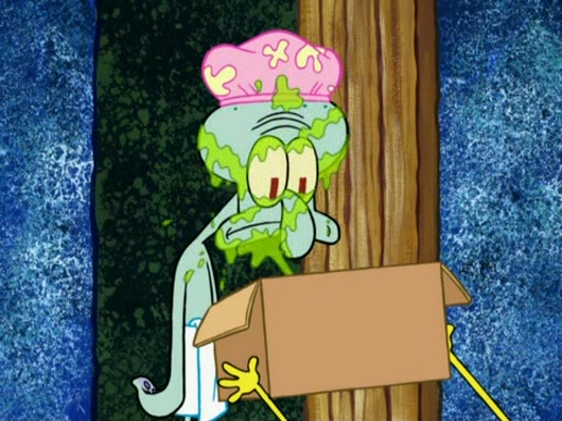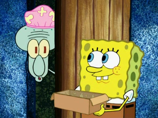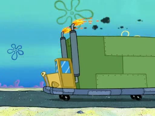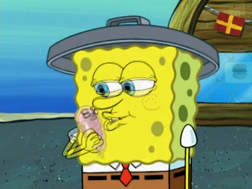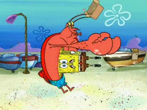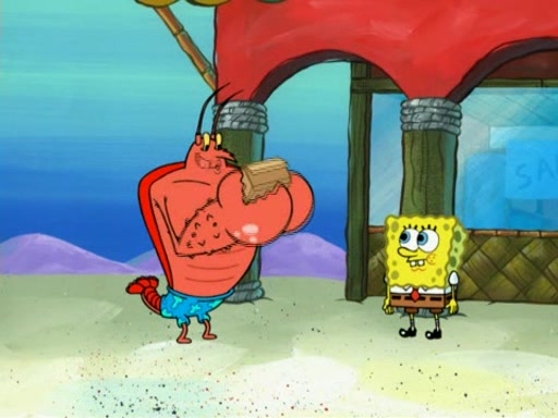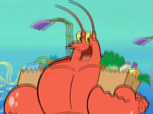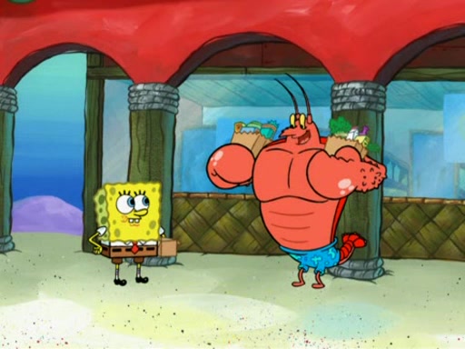 He first takes the worms to Squidward's house, in which Squidward is disgusted by them for vomiting a type of acid at his face. He then takes it to Mrs. Puff, in which she is shocked by them and puffs, damaging her house. SpongeBob then proceeds to go to a grocery store, stumbling upon Larry the Lobster. He decides to take them, but only to eat them alive due to raw protein, in which SpongeBob knocks them out of Larry's hand. The worms land in the middle of the road right in front of a moving truck, in which SpongeBob reacts. He goes inside the truck to pull out the connections to the engine, and unscrews and gets rid of the engine, forcing the truck to halt.