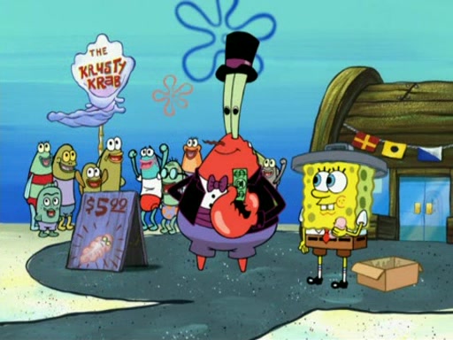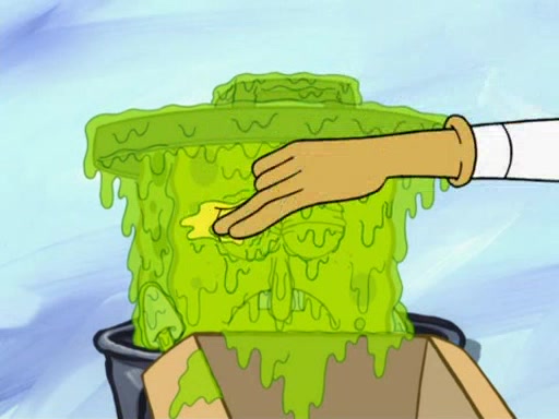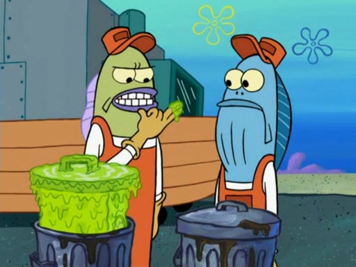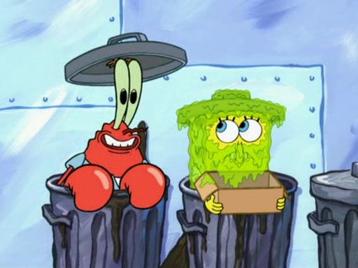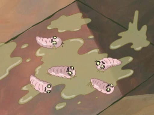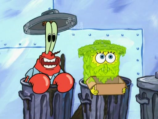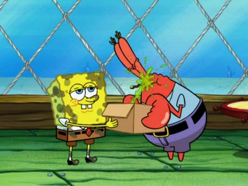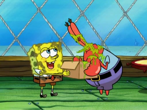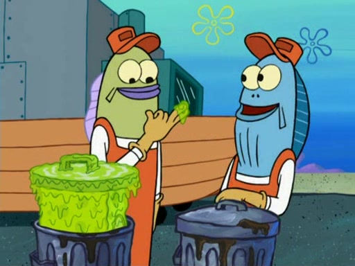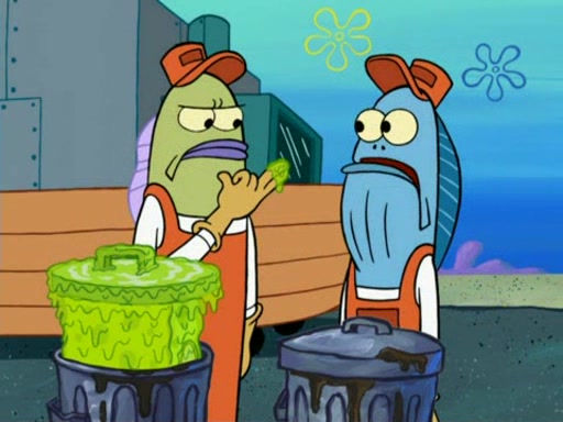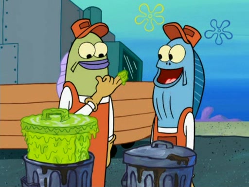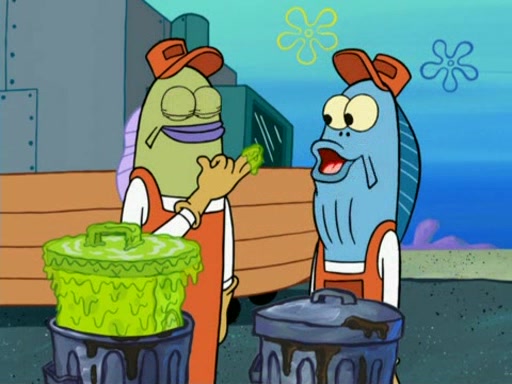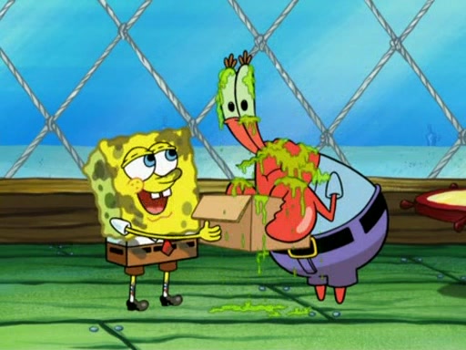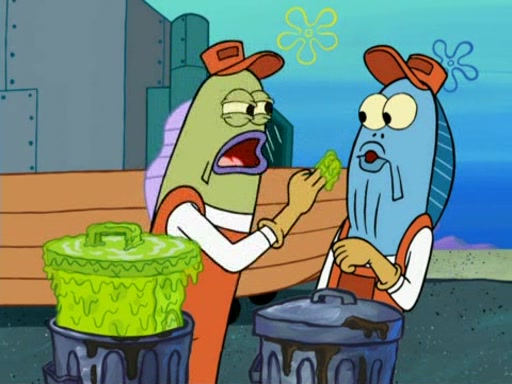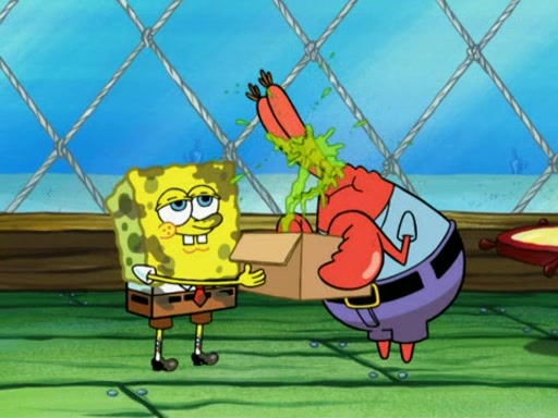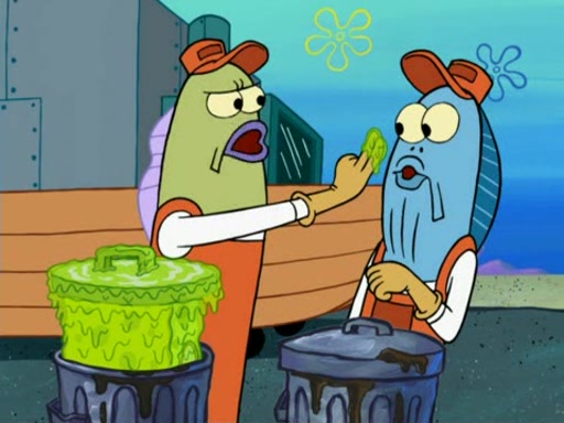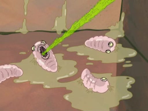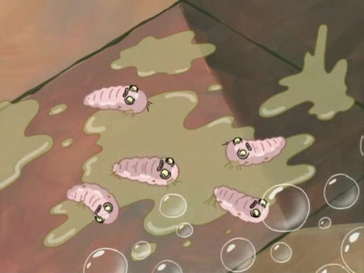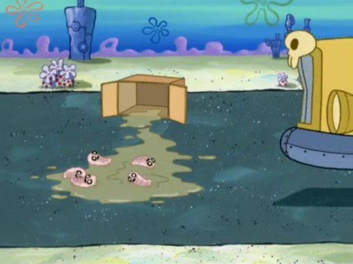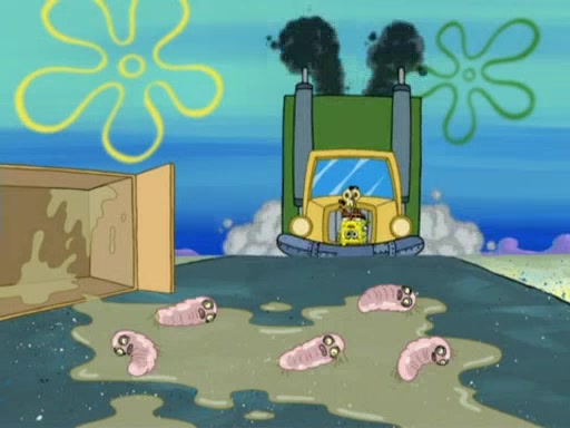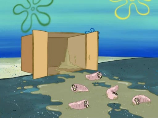 SpongeBob then scoops up the meadow worms and puts them in the box that they were in. After this, SpongeBob tries to sell them to Mr. Krabs, in which he declines because the worms spit up on his face as well, and forces him to take the worms out of his restaurant. SpongeBob puts them by the garbage, but the babies spit on him too. Garbage men come up and they are about to take the garbage away when they see the acid on SpongeBob's face. They see that it is a very rare type of worm, and Mr. Krabs comes out, hearing how it is rare and they would bring a lot of money. So, SpongeBob and Mr. Krabs sell the worms to the people of Bikini Bottom.