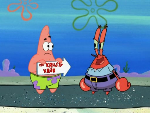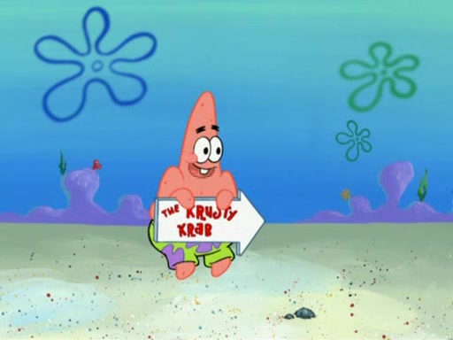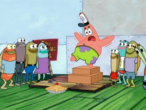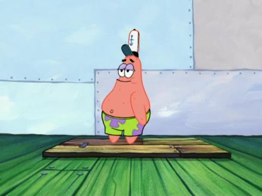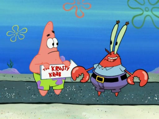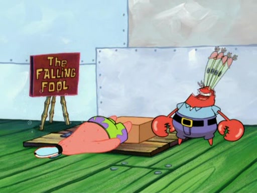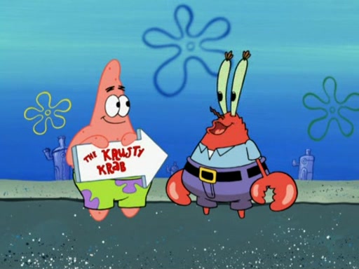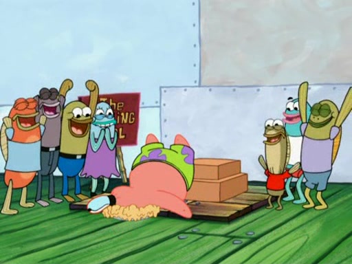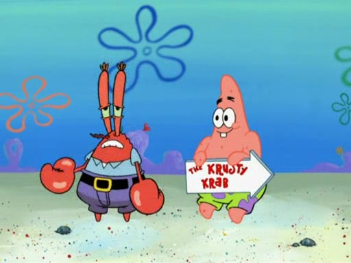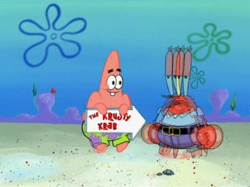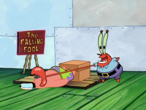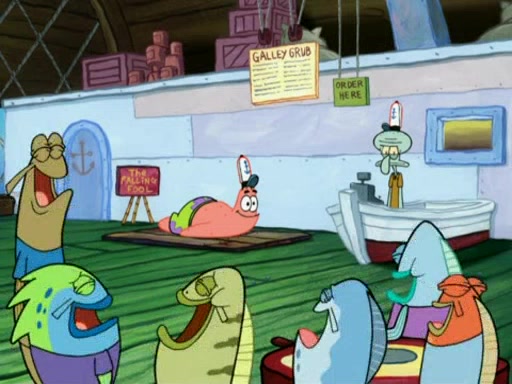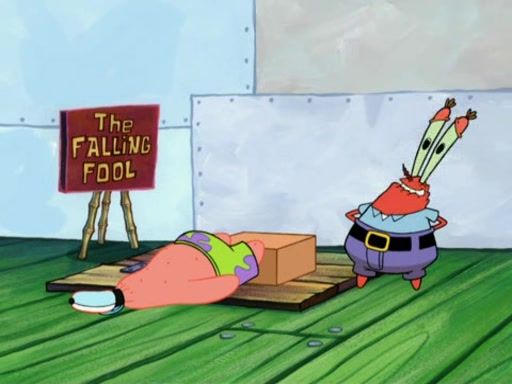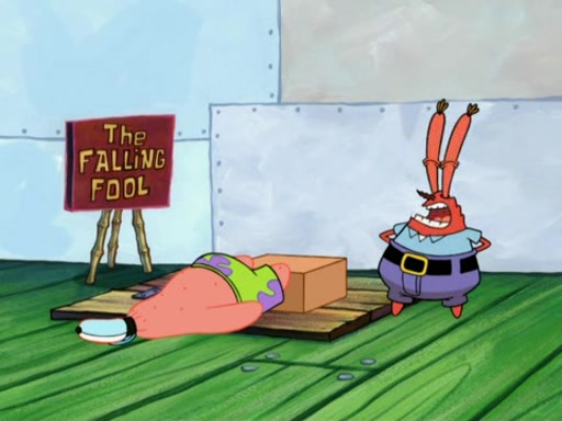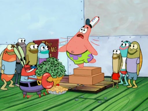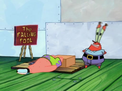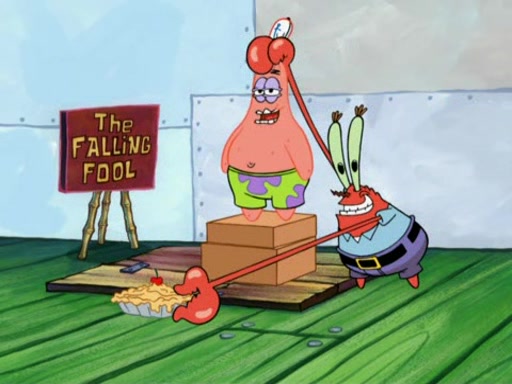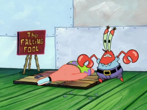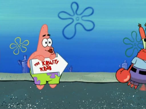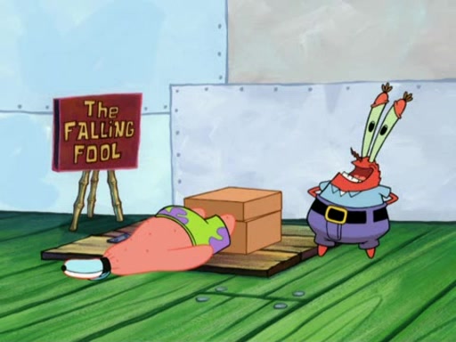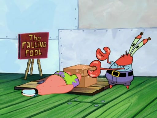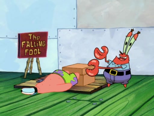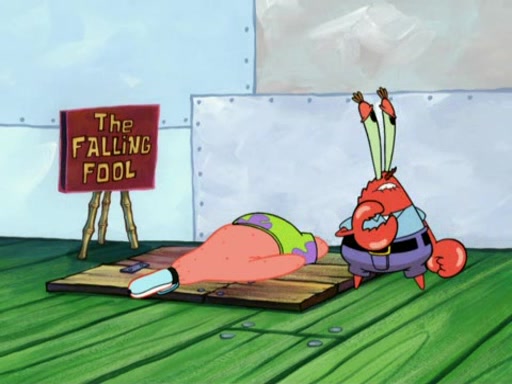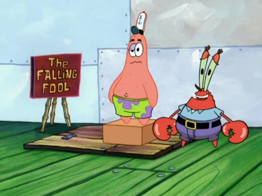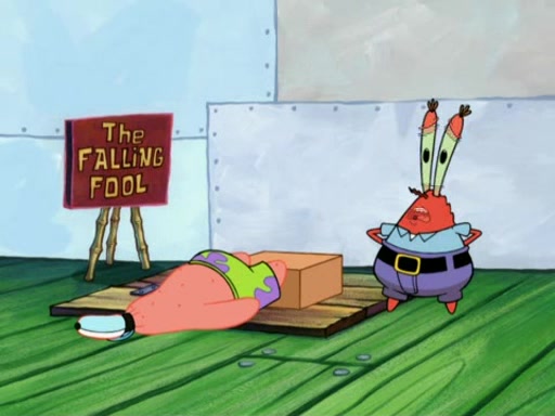 One day, Patrick is sleeping outside of SpongeBob's house. He wakes up to go jellyfishing, only to discover that SpongeBob is wearing his Krusty Krab hat. He knows that means he has to work. He next discovers that Squidward had a hat too. In displeasure, he promises that he was going to get a job, and a hat, so he goes off. SpongeBob arrives at work, while Mr. Krabs is watching for customers, he then spots a group of tourists which he wants to serve some Krabby Patties, but he could not catch them, so he thinks of ideas to catch them next time they come around, he then bumps into Patrick, who he hires to stand outside and lure in tourists. He is also promised to have a hat afterwards. SpongeBob watches as Patrick directs customers the wrong way, and sometimes pays no attention, Mr. Krabs goes out to show him the proper way to lure in customers, but he fails too, but in the end he receives his hat, only to fall down for anonymous reasons. SpongeBob asks him what is wrong, and he supposed that he is nervous, he falls and falls, he lures in customers, and the tourists by doing this, and they say, THAT'S THE KIND OF MINDLESSNESS THEY PAY MONEY TO SEE, so Mr. Krabs decides to make Patrick the main attraction at the Krusty Krab, and hosts a show with Patrick as the star, but the customers soon are ran off by Squidward, trying to entertain them, of course thinking that they are uncultured, as he plays the clarinet and roams around the Krusty Krab, so the customers got out of there. The customers continue to watch Patrick, but it gets old, but then Mr. Krabs starts to think of more painful ways to make Patrick fall, and it brings them back. SpongeBob tries to convince Patrick to stop falling for enjoyment but Patrick says the hat promotes him and he wants to keep doing his job, so SpongeBob agrees.