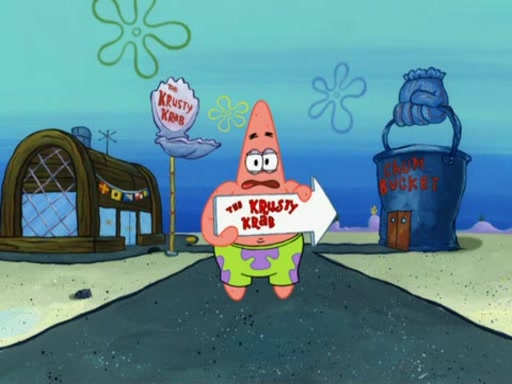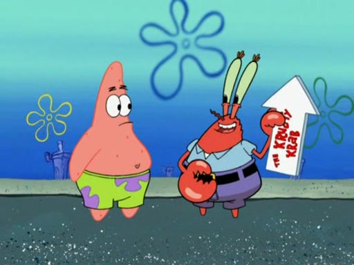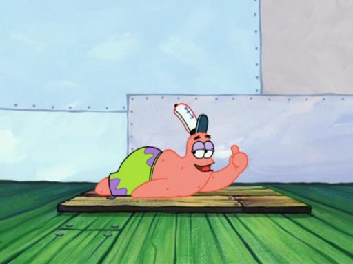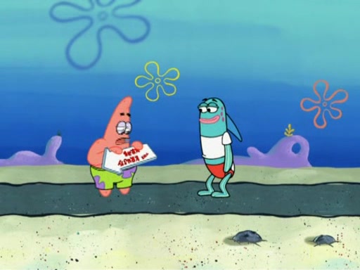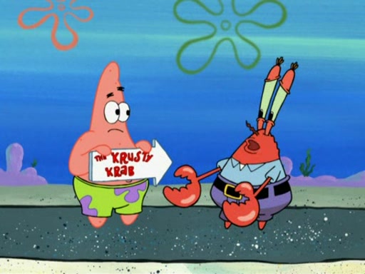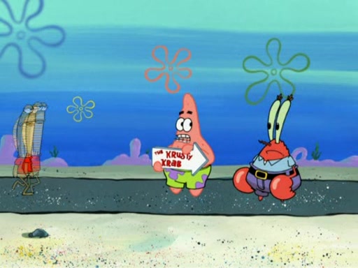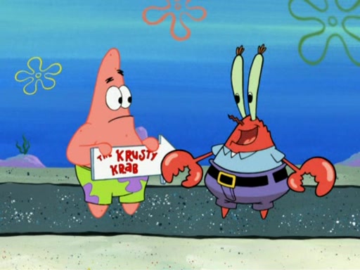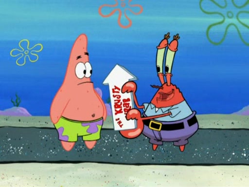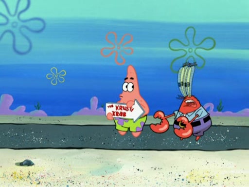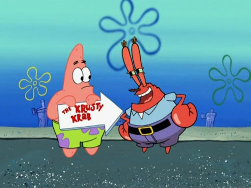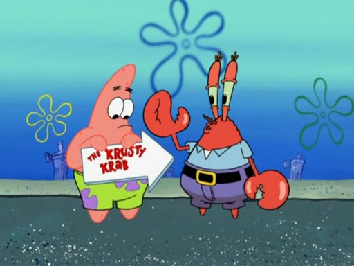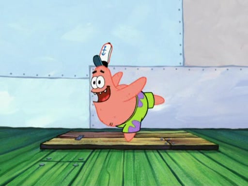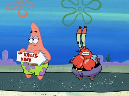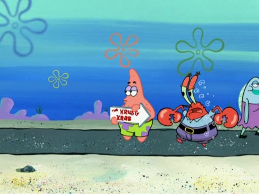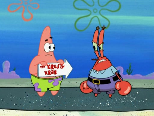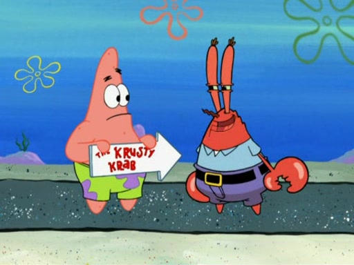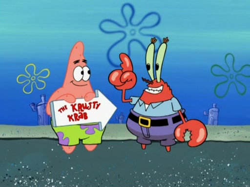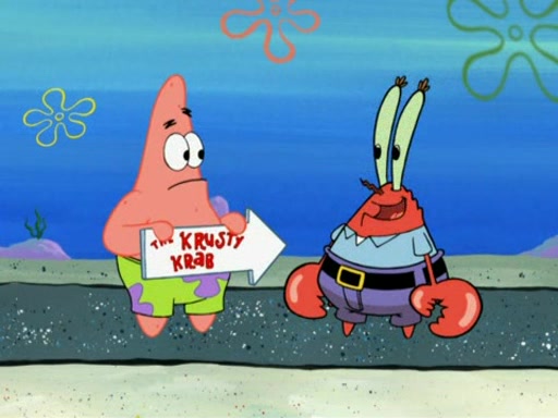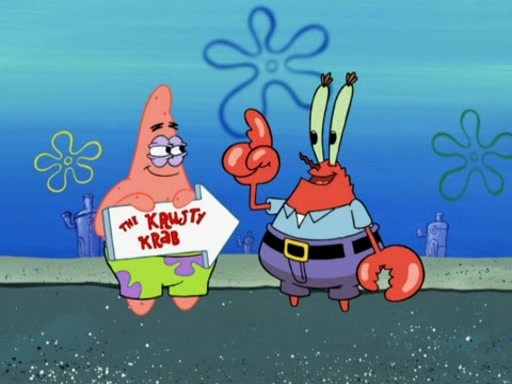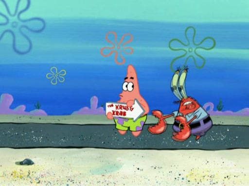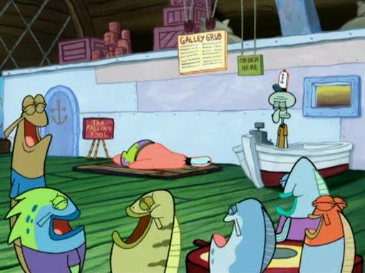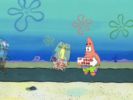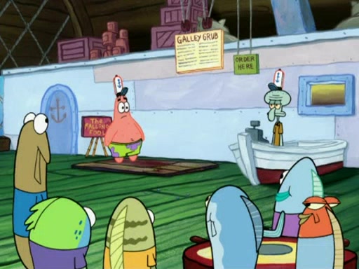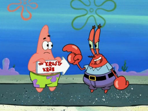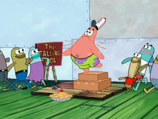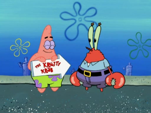 One day, Patrick is sleeping outside of SpongeBob's house. He wakes up to go jellyfishing, only to discover that SpongeBob is wearing his Krusty Krab hat. He knows that means he has to work. He next discovers that Squidward had a hat too. In displeasure, he promises that he was going to get a job, and a hat, so he goes off. SpongeBob arrives at work, while Mr. Krabs is watching for customers, he then spots a group of tourists which he wants to serve some Krabby Patties, but he could not catch them, so he thinks of ideas to catch them next time they come around, he then bumps into Patrick, who he hires to stand outside and lure in tourists. He is also promised to have a hat afterwards. SpongeBob watches as Patrick directs customers the wrong way, and sometimes pays no attention, Mr. Krabs goes out to show him the proper way to lure in customers, but he fails too, but in the end he receives his hat, only to fall down for anonymous reasons. SpongeBob asks him what is wrong, and he supposed that he is nervous, he falls and falls, he lures in customers, and the tourists by doing this, and they say, THAT'S THE KIND OF MINDLESSNESS THEY PAY MONEY TO SEE, so Mr. Krabs decides to make Patrick the main attraction at the Krusty Krab, and hosts a show with Patrick as the star, but the customers soon are ran off by Squidward, trying to entertain them, of course thinking that they are uncultured, as he plays the clarinet and roams around the Krusty Krab, so the customers got out of there. The customers continue to watch Patrick, but it gets old, but then Mr. Krabs starts to think of more painful ways to make Patrick fall, and it brings them back. SpongeBob tries to convince Patrick to stop falling for enjoyment but Patrick says the hat promotes him and he wants to keep doing his job, so SpongeBob agrees.