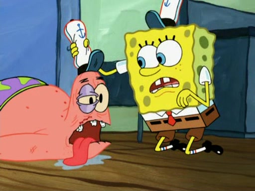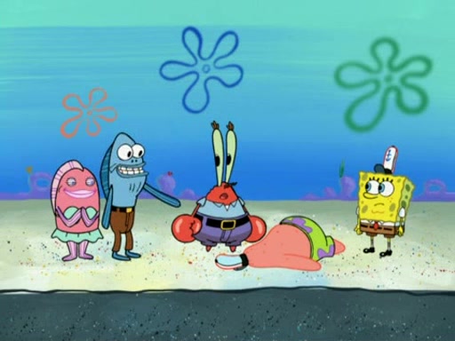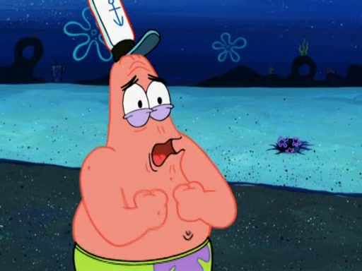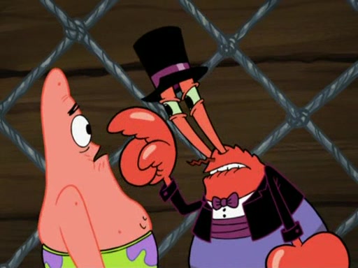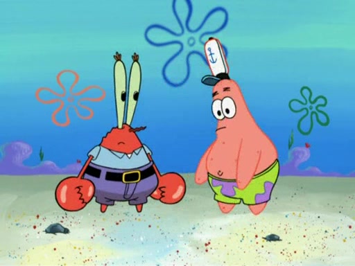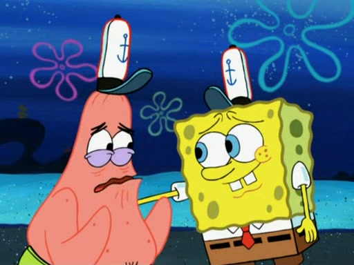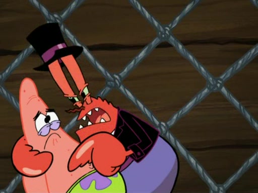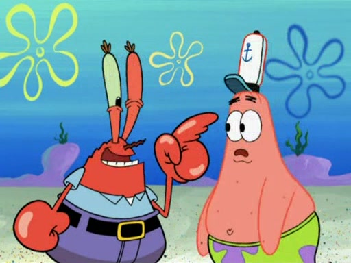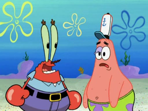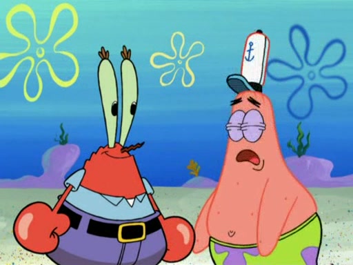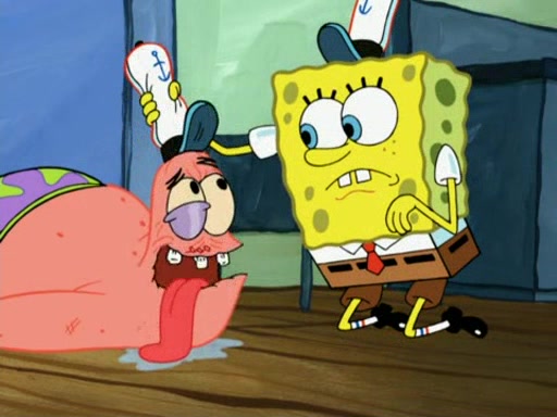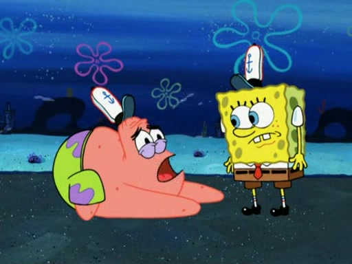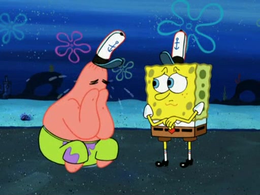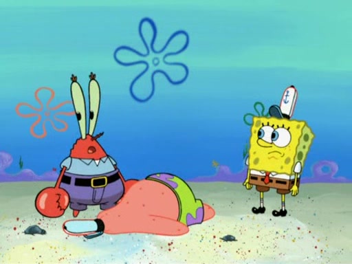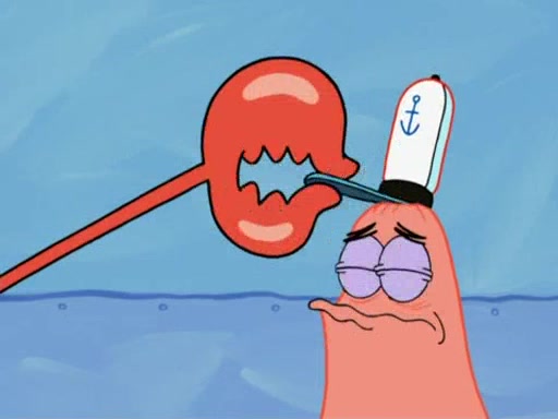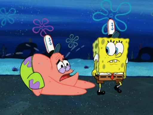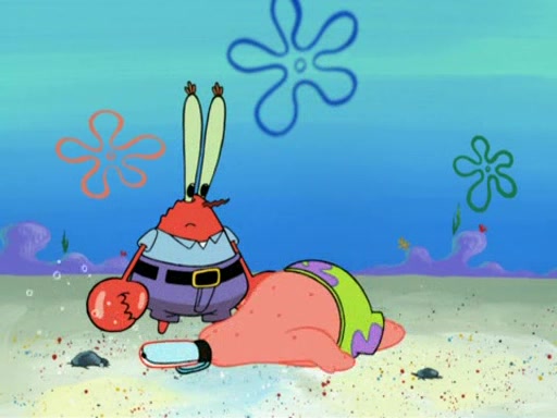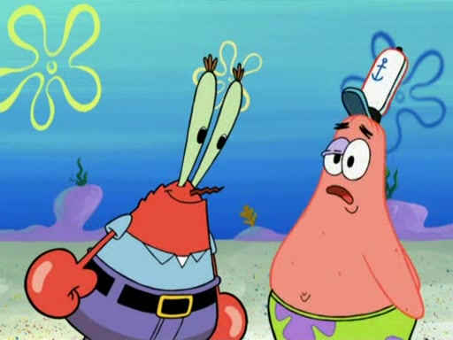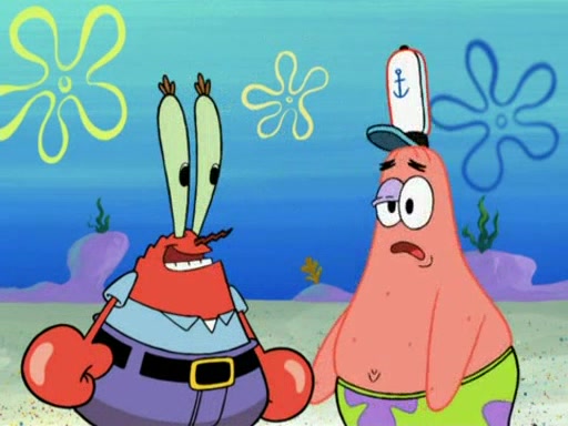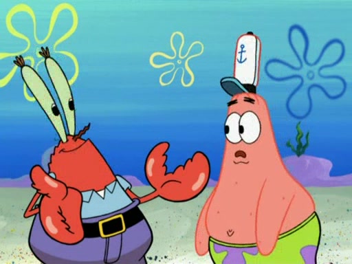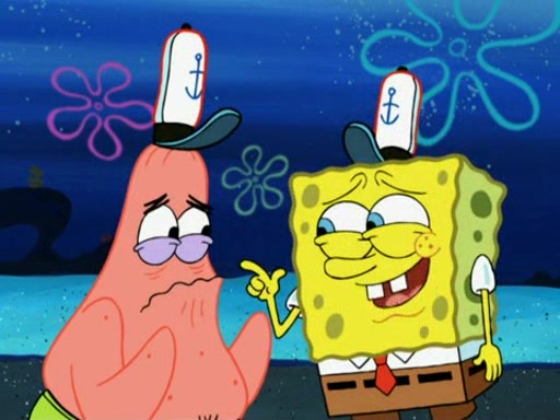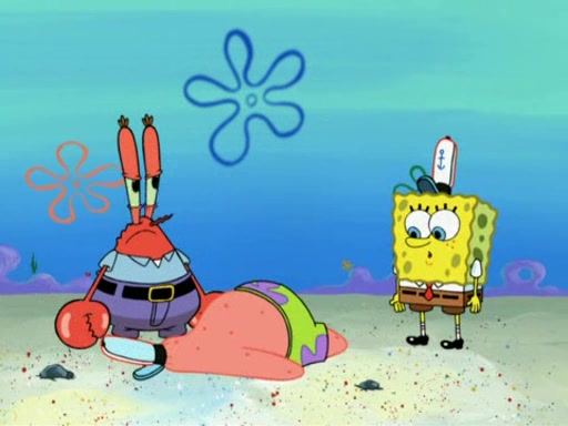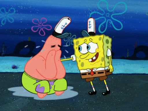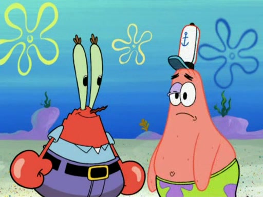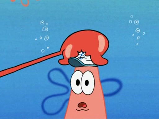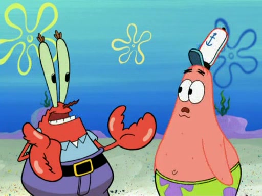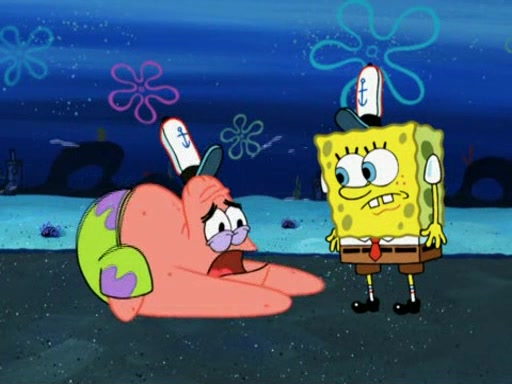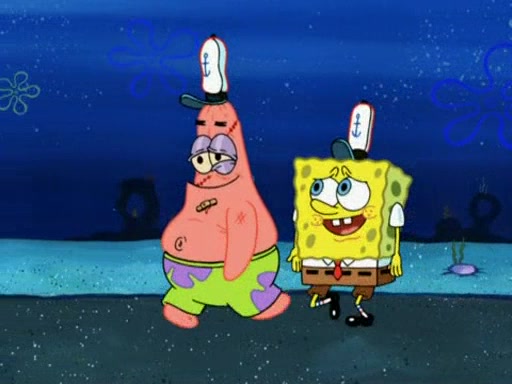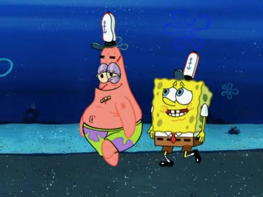 The next day, he is going to fall into a bucket of spiky sea urchins, and he takes his hat off so it will not get damaged, but he then finds himself stuck on the edge. SpongeBob tries to stop him but he falls, right on top of Squidward, who tries to push him, the customers attack Mr. Krabs and steal all of their money back because no-one was hurt. Mr. Krabs then takes the hat back from Patrick, blaming him for it, saying that as long as he stands, he will never wear the hat again. Patrick then leaves the Krusty Krab and goes home sad. In the epilogue, SpongeBob cheers Patrick up, and tells him he can wear his hat anytime he pleases, and so they go back to their normal lives.