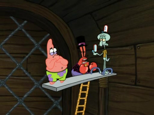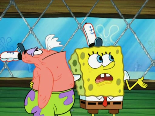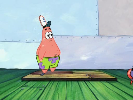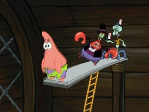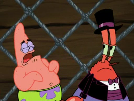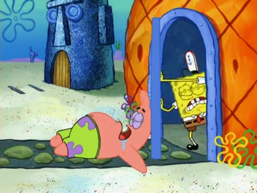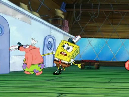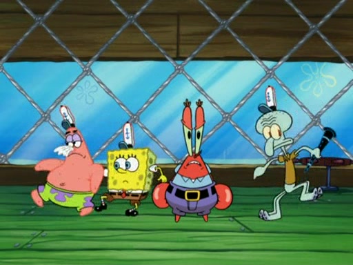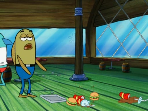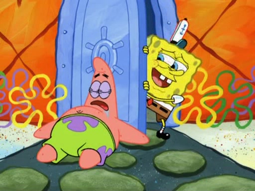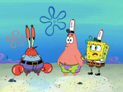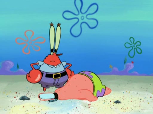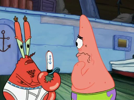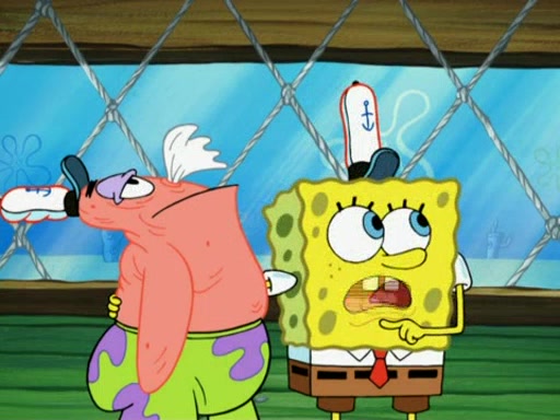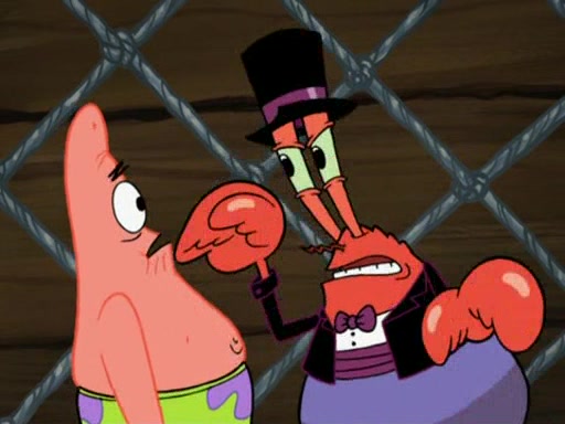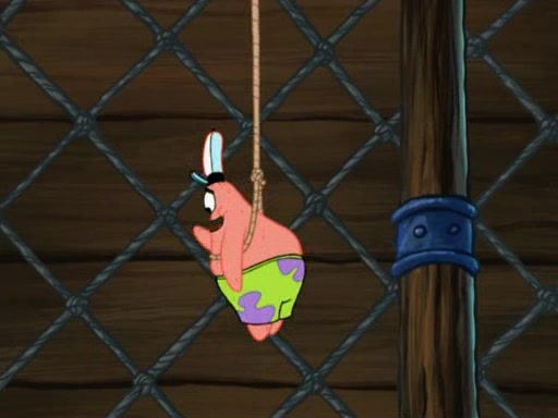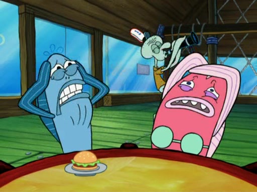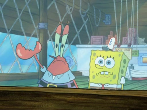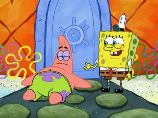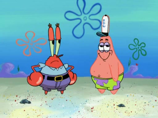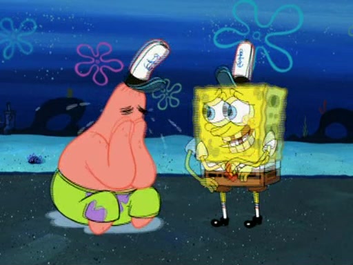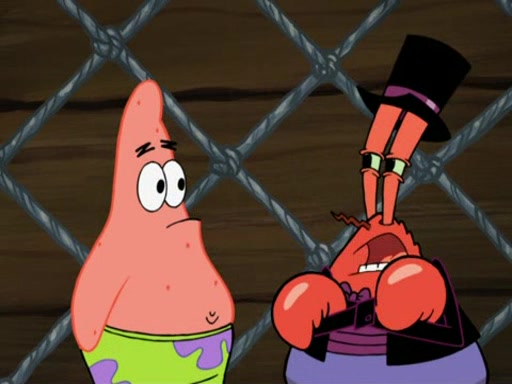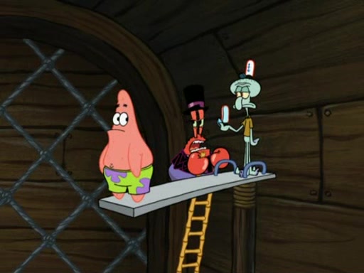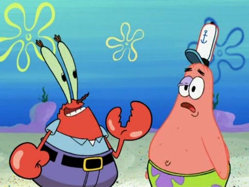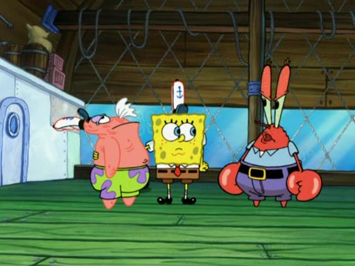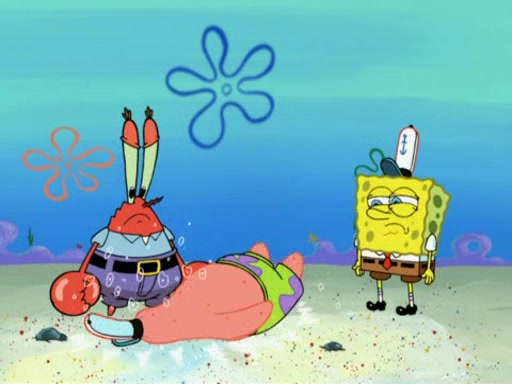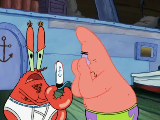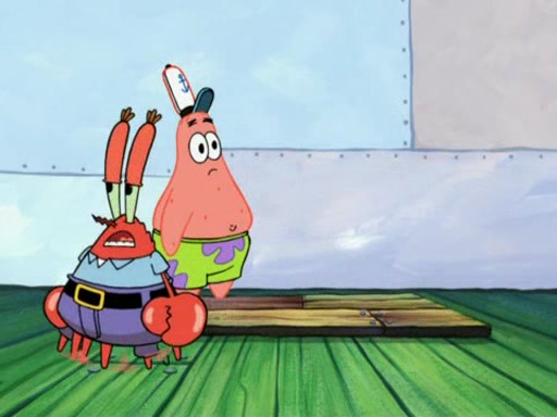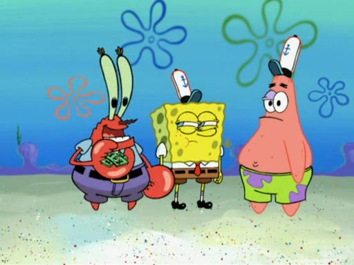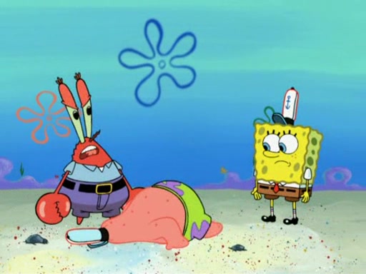 The next day, he is going to fall into a bucket of spiky sea urchins, and he takes his hat off so it will not get damaged, but he then finds himself stuck on the edge. SpongeBob tries to stop him but he falls, right on top of Squidward, who tries to push him, the customers attack Mr. Krabs and steal all of their money back because no-one was hurt. Mr. Krabs then takes the hat back from Patrick, blaming him for it, saying that as long as he stands, he will never wear the hat again. Patrick then leaves the Krusty Krab and goes home sad. In the epilogue, SpongeBob cheers Patrick up, and tells him he can wear his hat anytime he pleases, and so they go back to their normal lives.