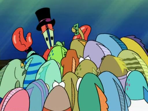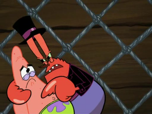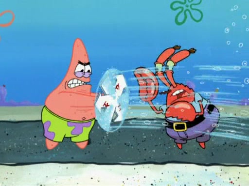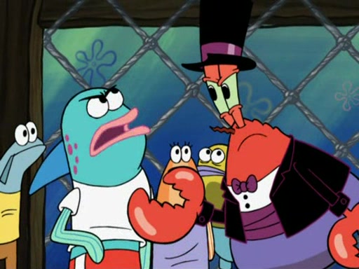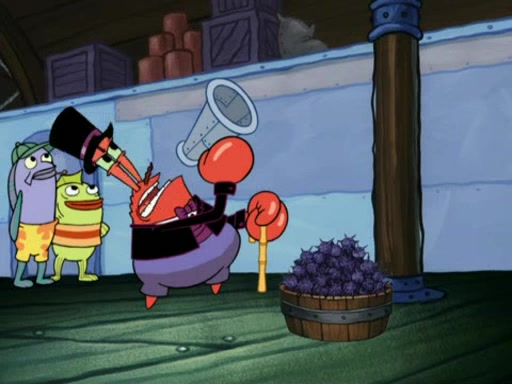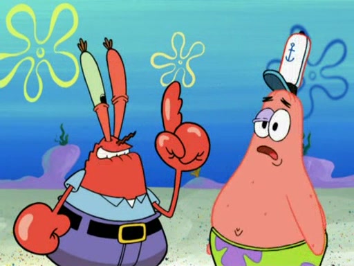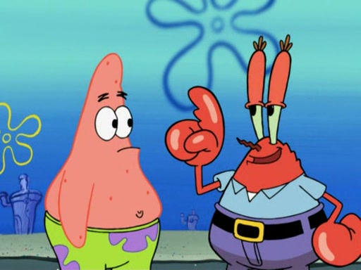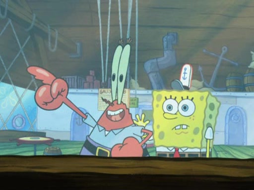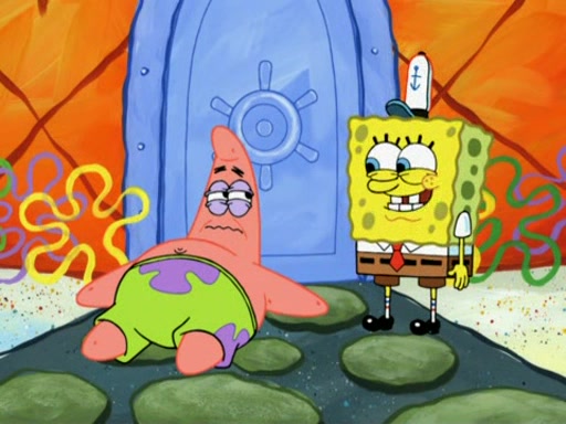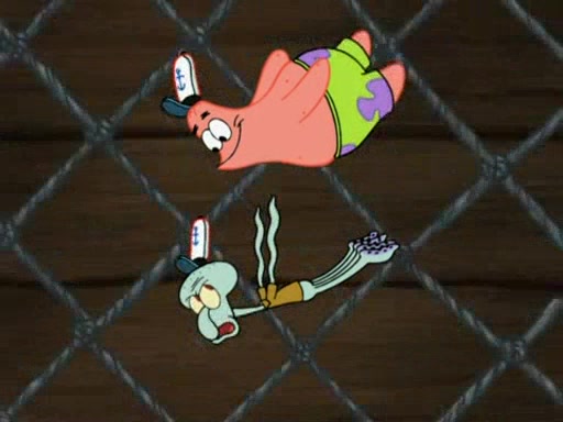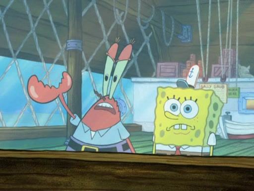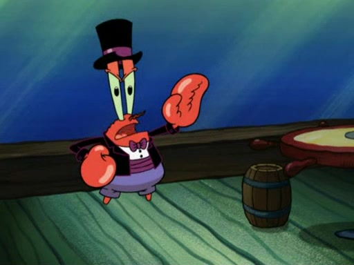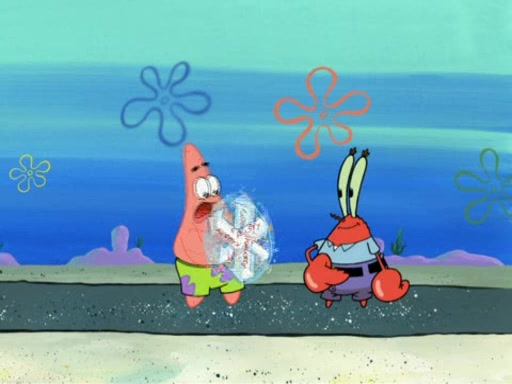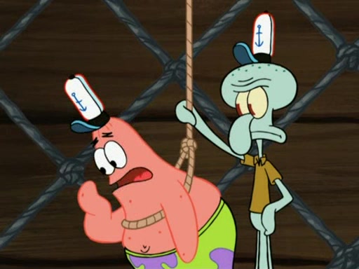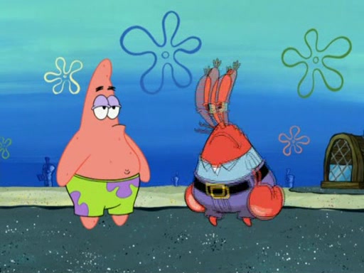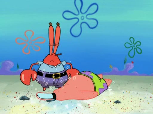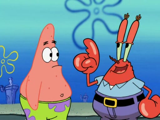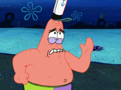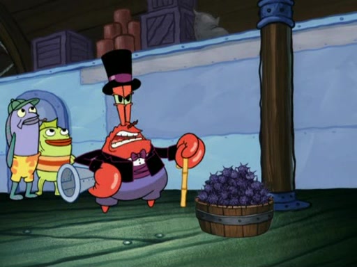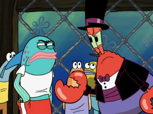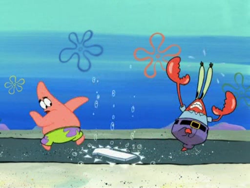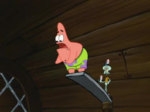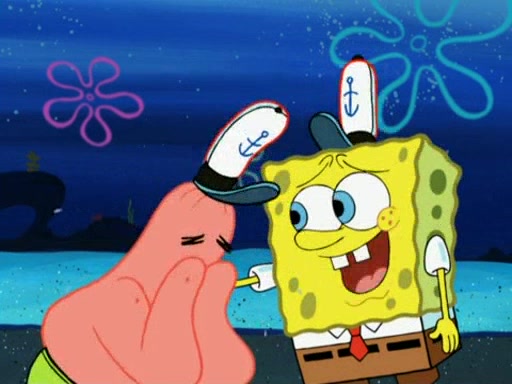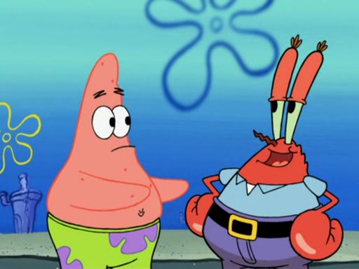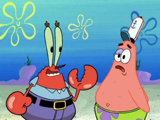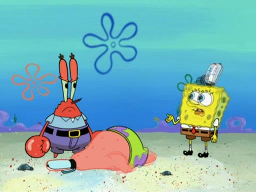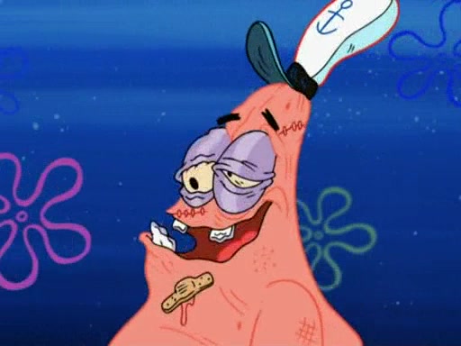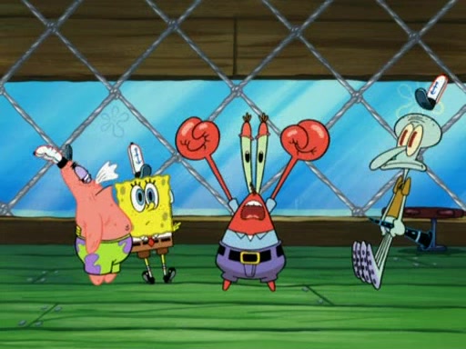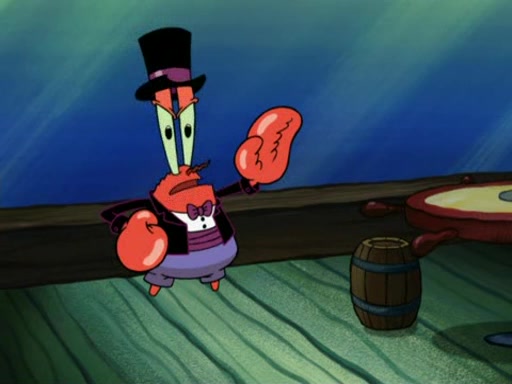 The next day, he is going to fall into a bucket of spiky sea urchins, and he takes his hat off so it will not get damaged, but he then finds himself stuck on the edge. SpongeBob tries to stop him but he falls, right on top of Squidward, who tries to push him, the customers attack Mr. Krabs and steal all of their money back because no-one was hurt. Mr. Krabs then takes the hat back from Patrick, blaming him for it, saying that as long as he stands, he will never wear the hat again. Patrick then leaves the Krusty Krab and goes home sad. In the epilogue, SpongeBob cheers Patrick up, and tells him he can wear his hat anytime he pleases, and so they go back to their normal lives.