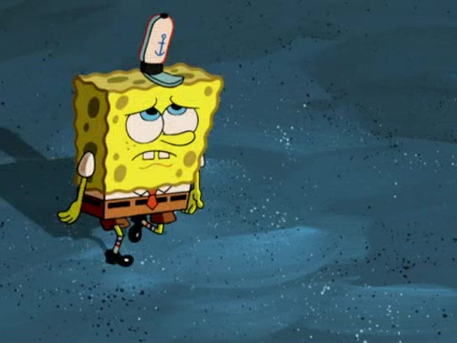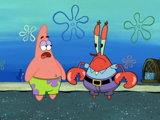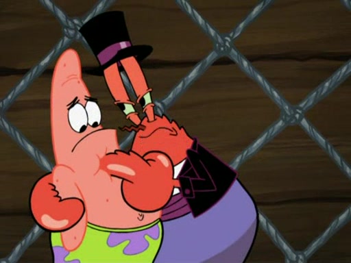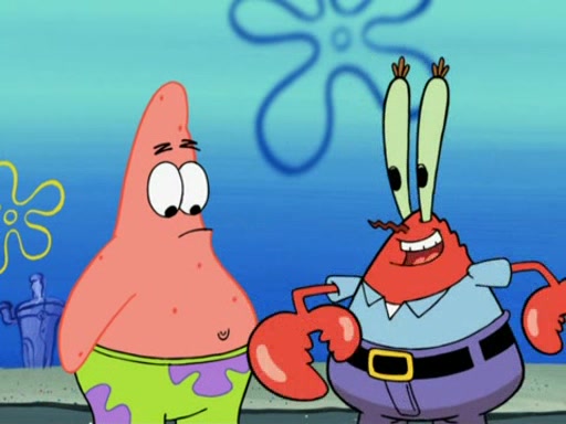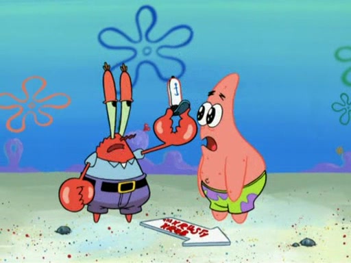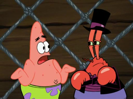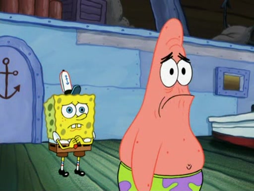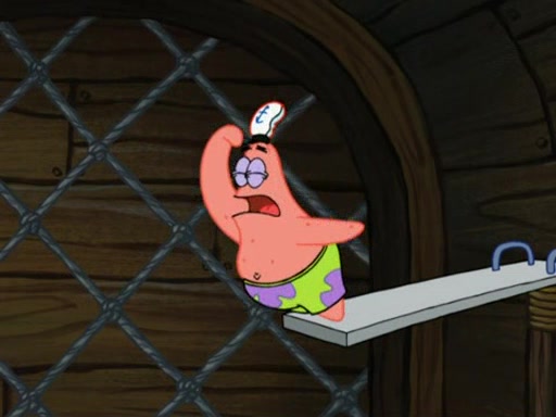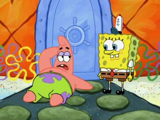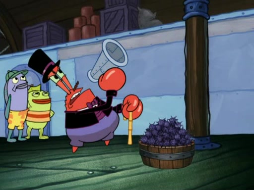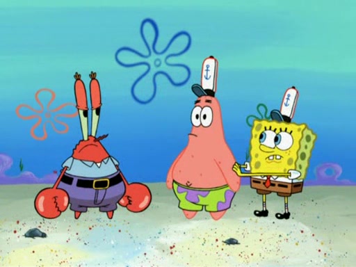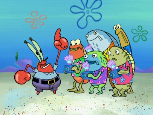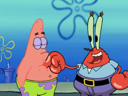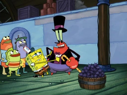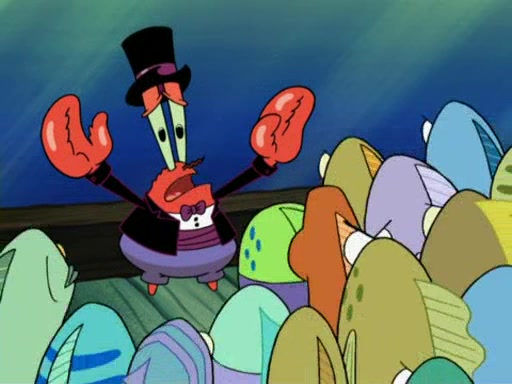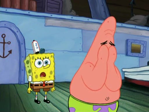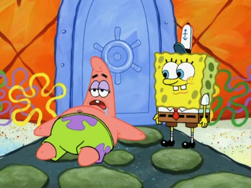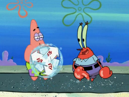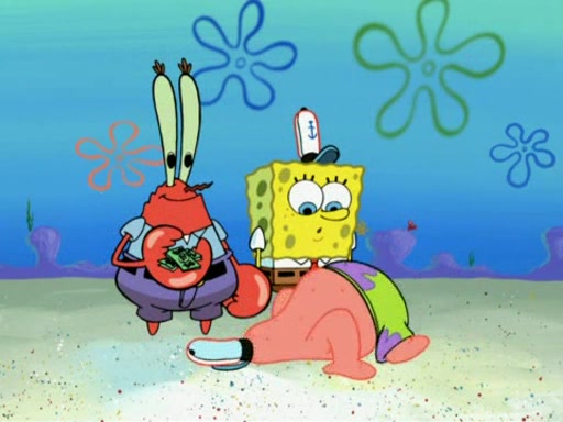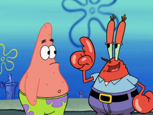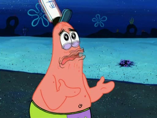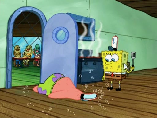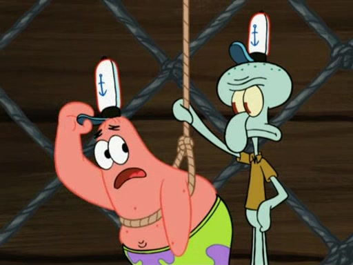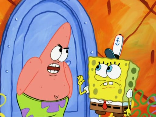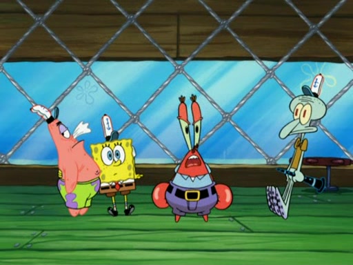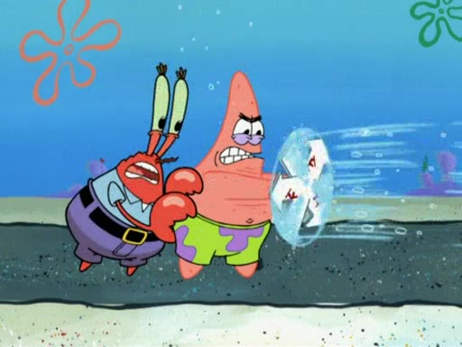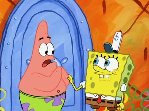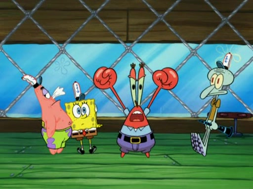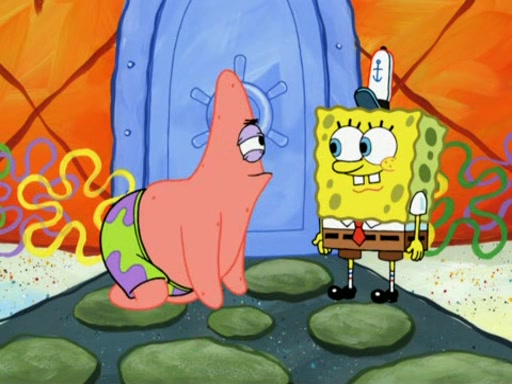 The next day, he is going to fall into a bucket of spiky sea urchins, and he takes his hat off so it will not get damaged, but he then finds himself stuck on the edge. SpongeBob tries to stop him but he falls, right on top of Squidward, who tries to push him, the customers attack Mr. Krabs and steal all of their money back because no-one was hurt. Mr. Krabs then takes the hat back from Patrick, blaming him for it, saying that as long as he stands, he will never wear the hat again. Patrick then leaves the Krusty Krab and goes home sad. In the epilogue, SpongeBob cheers Patrick up, and tells him he can wear his hat anytime he pleases, and so they go back to their normal lives.
