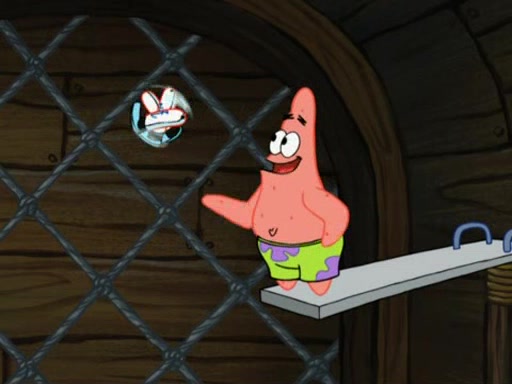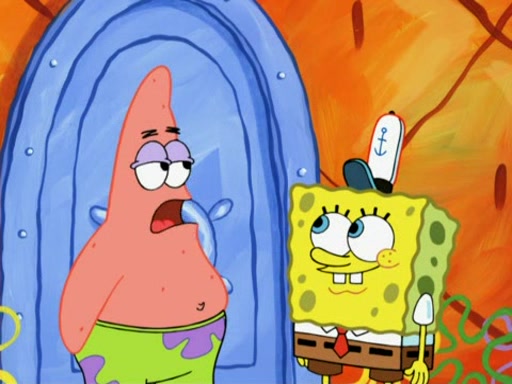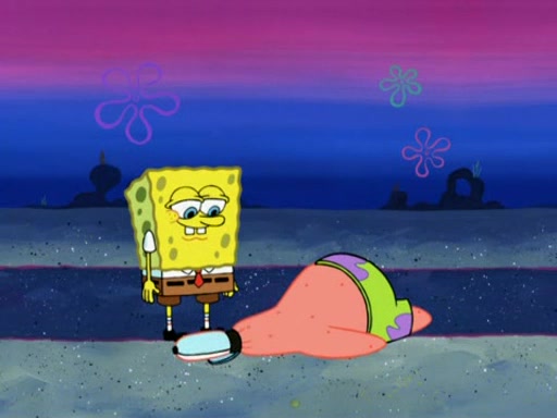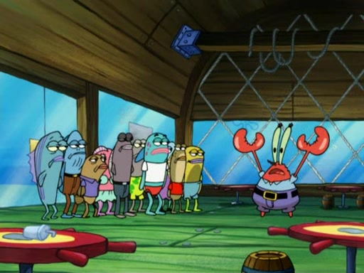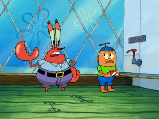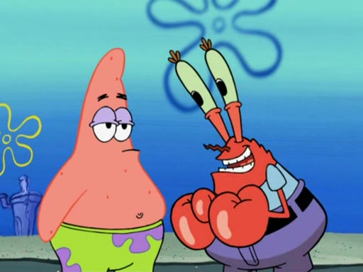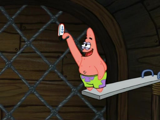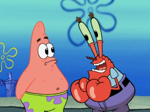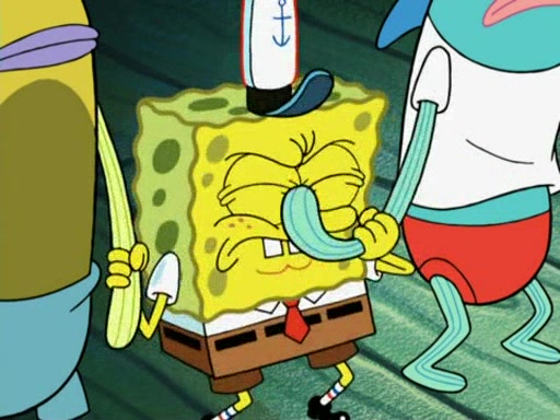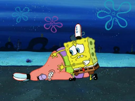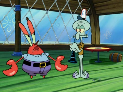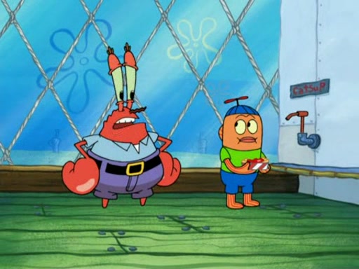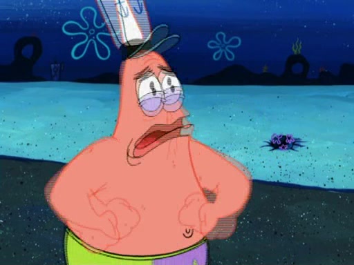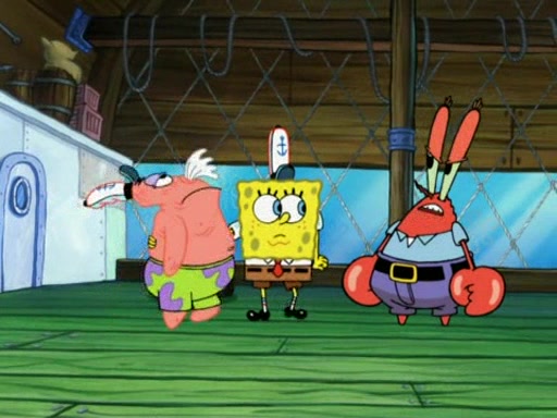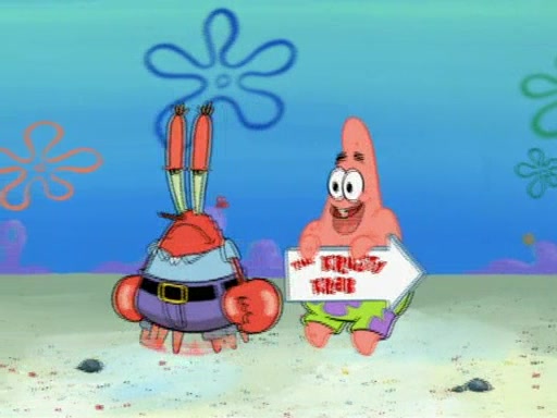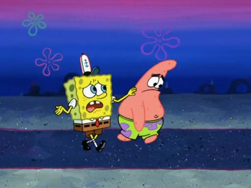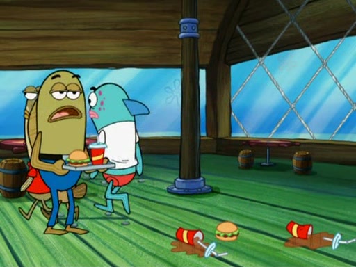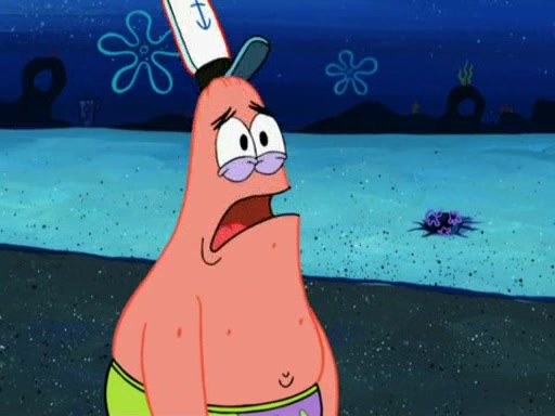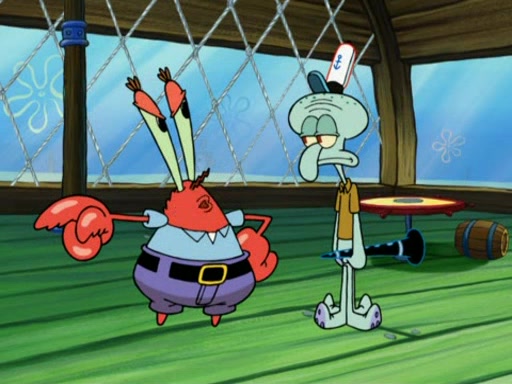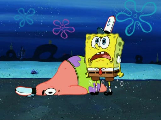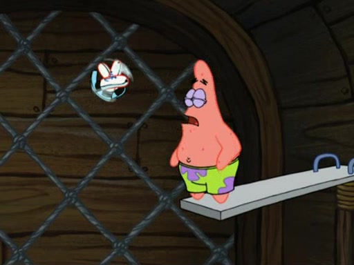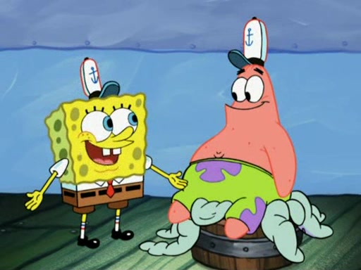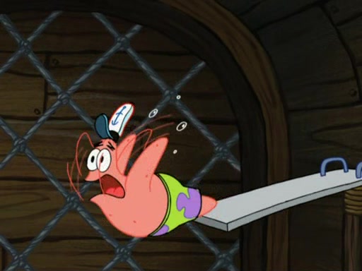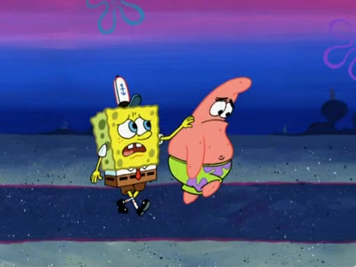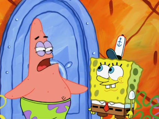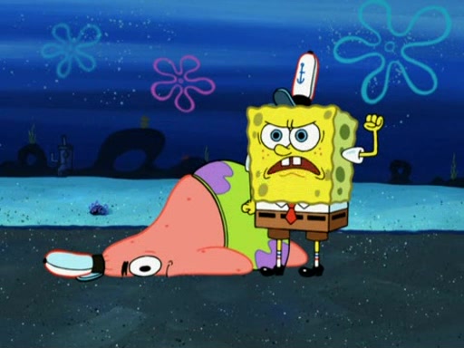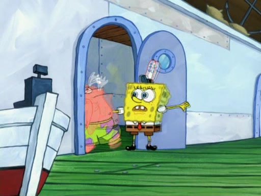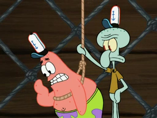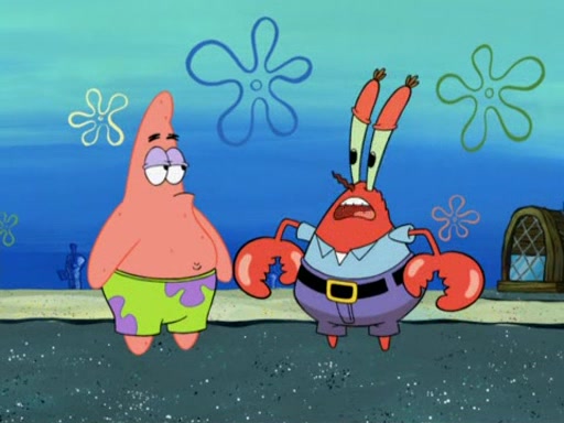 The next day, he is going to fall into a bucket of spiky sea urchins, and he takes his hat off so it will not get damaged, but he then finds himself stuck on the edge. SpongeBob tries to stop him but he falls, right on top of Squidward, who tries to push him, the customers attack Mr. Krabs and steal all of their money back because no-one was hurt. Mr. Krabs then takes the hat back from Patrick, blaming him for it, saying that as long as he stands, he will never wear the hat again. Patrick then leaves the Krusty Krab and goes home sad. In the epilogue, SpongeBob cheers Patrick up, and tells him he can wear his hat anytime he pleases, and so they go back to their normal lives.