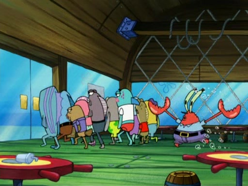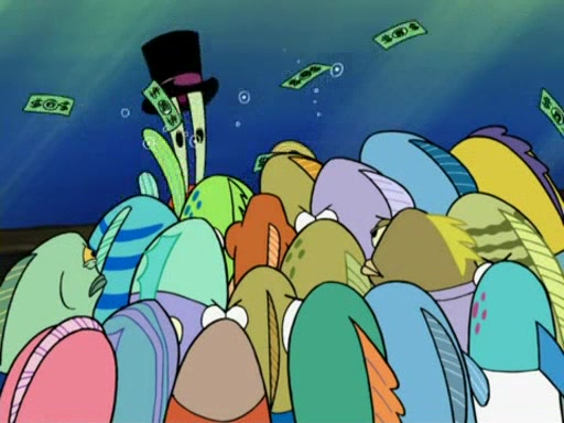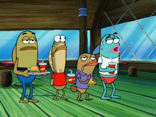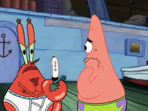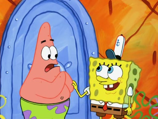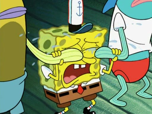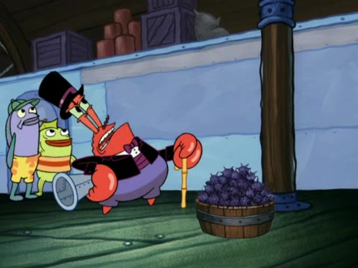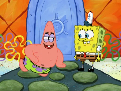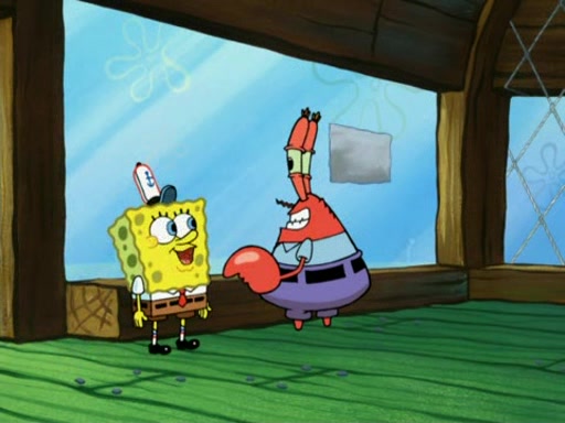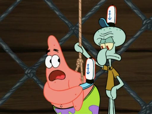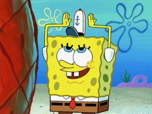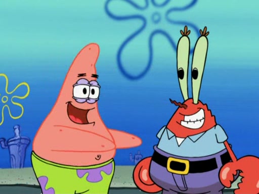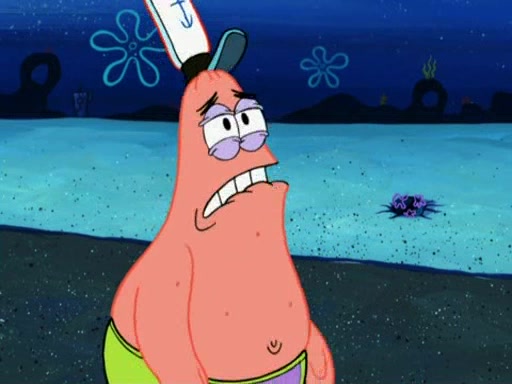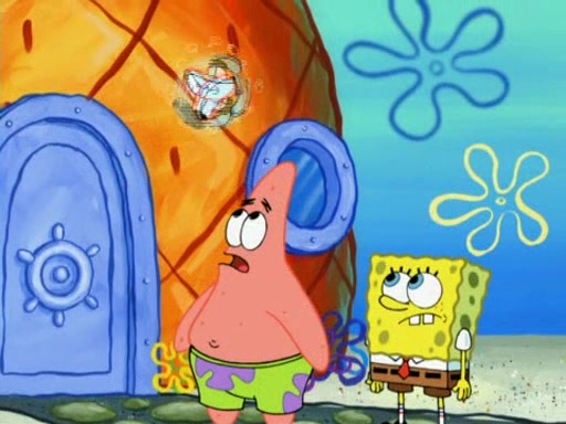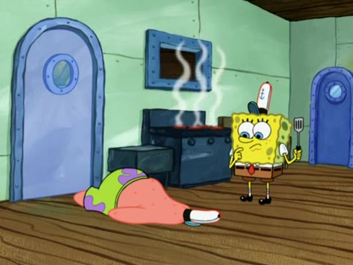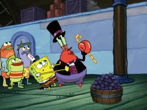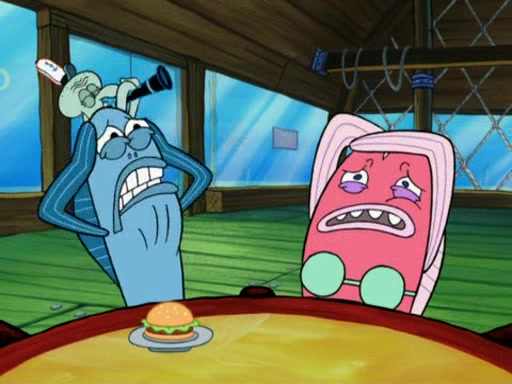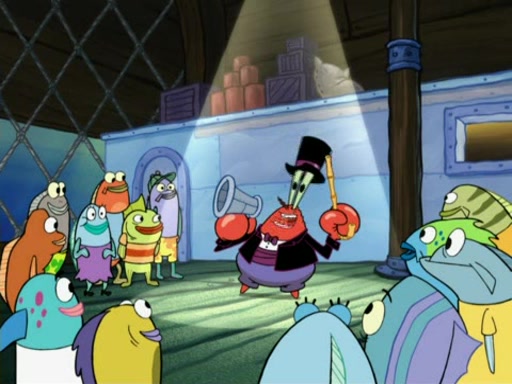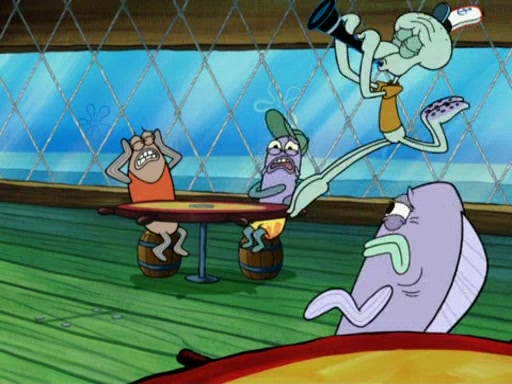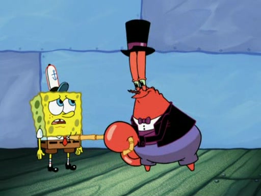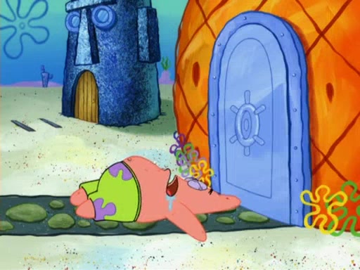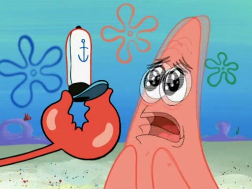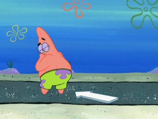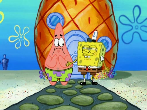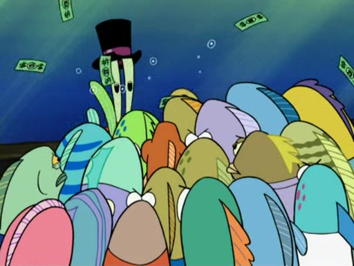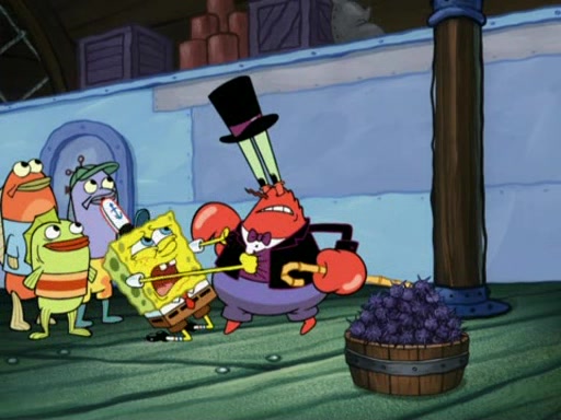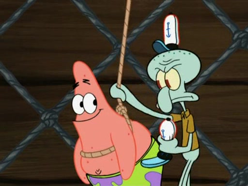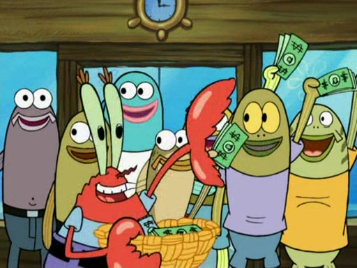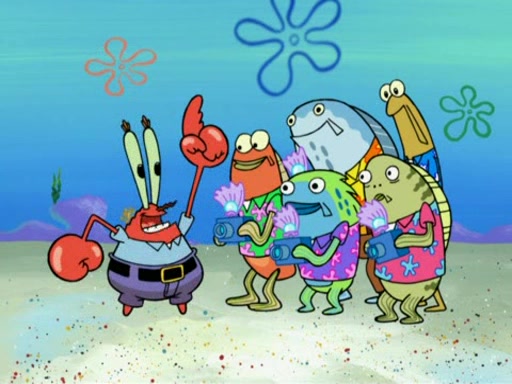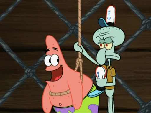 The next day, he is going to fall into a bucket of spiky sea urchins, and he takes his hat off so it will not get damaged, but he then finds himself stuck on the edge. SpongeBob tries to stop him but he falls, right on top of Squidward, who tries to push him, the customers attack Mr. Krabs and steal all of their money back because no-one was hurt. Mr. Krabs then takes the hat back from Patrick, blaming him for it, saying that as long as he stands, he will never wear the hat again. Patrick then leaves the Krusty Krab and goes home sad. In the epilogue, SpongeBob cheers Patrick up, and tells him he can wear his hat anytime he pleases, and so they go back to their normal lives.