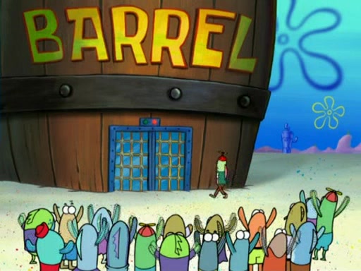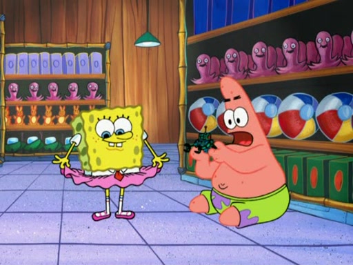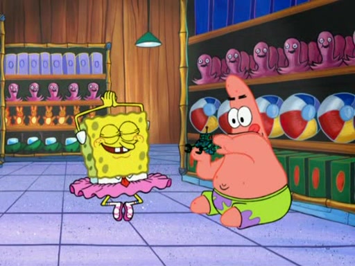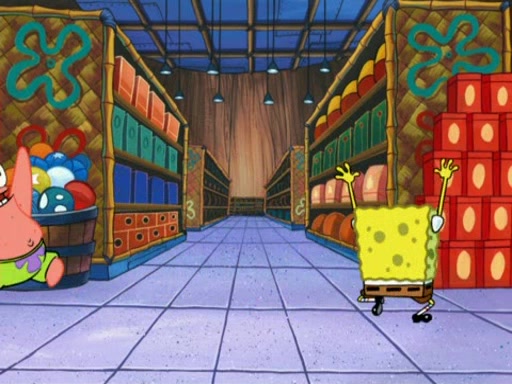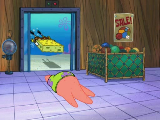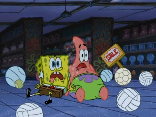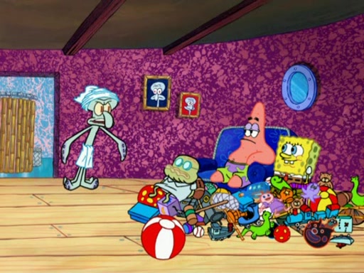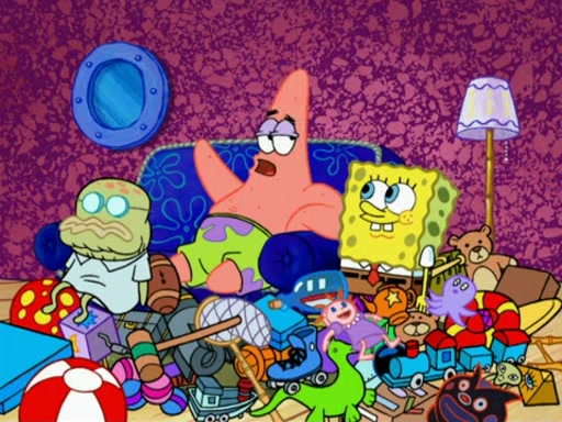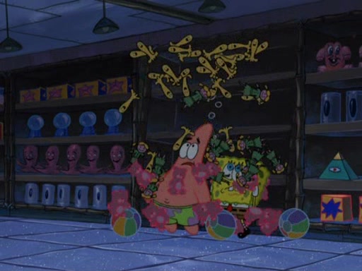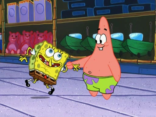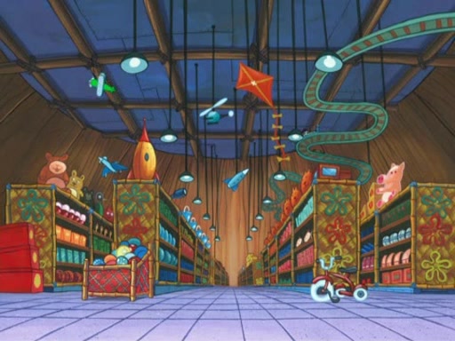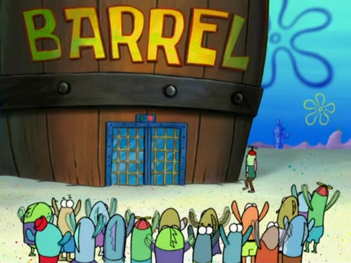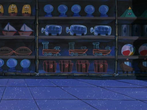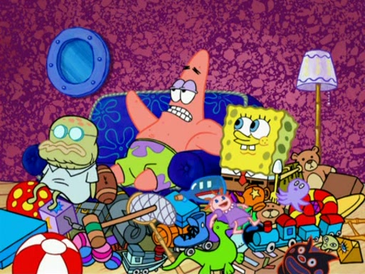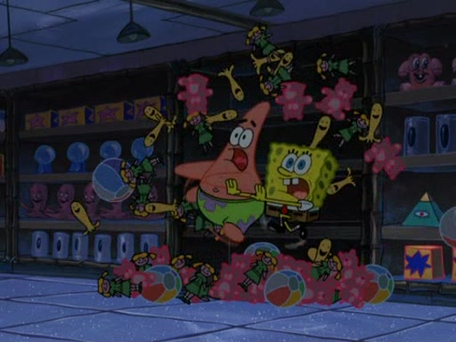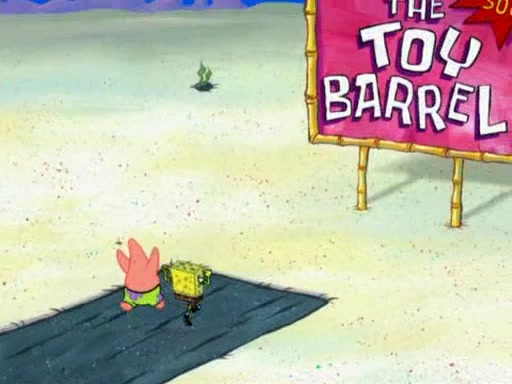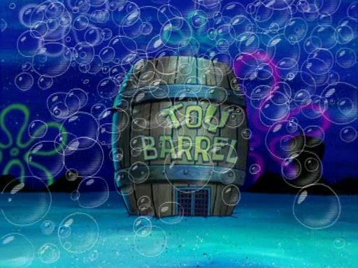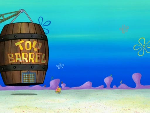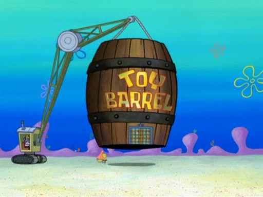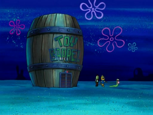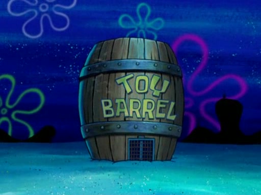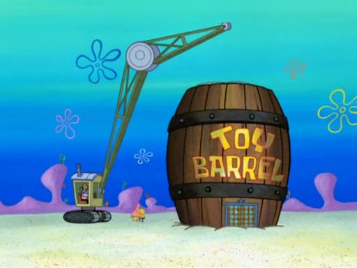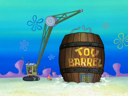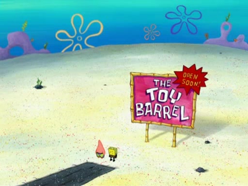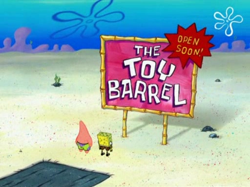 SpongeBob and Patrick are very bored and have nothing to do. SpongeBob walks over to a toy chest and starts rummaging through it, but doesn't find anything that interests him or Patrick. SpongeBob finds a Mermaid-Man toy, but it is unfortunately chewed up. It then reveals that they were in Squidward's house, and he kicks them out. Then they start walking, trying to find something to do. While they are walking, they find some signs introducing something. They follow the signs to a newly opened Toy Barrel. At first, it isn't there, which makes the two cry. It appears soon afterward, courtesy of a crane. The construction worker throws Patrick inside, and SpongeBob throws himself. They spend the entire day singing songs. To their disappointment, the Toy Barrel closes just after they finish singing. Patrick formulates a plan to hide in the dollhouses when the police check the toy store so they can have the Toy Barrel all to themselves. They become jolly until the lights turn off, which scares the duo. Soon, they see a shadow coming, so SpongeBob decides to fight back. They dress up like soldiers, preparing to fight the shadow. This does them no good. It was just Patrick's old wind-up robot. Just as the store is about to open, the two rush outside. The episode ends with Patrick saying “Hey! It’s open! I love toys!"