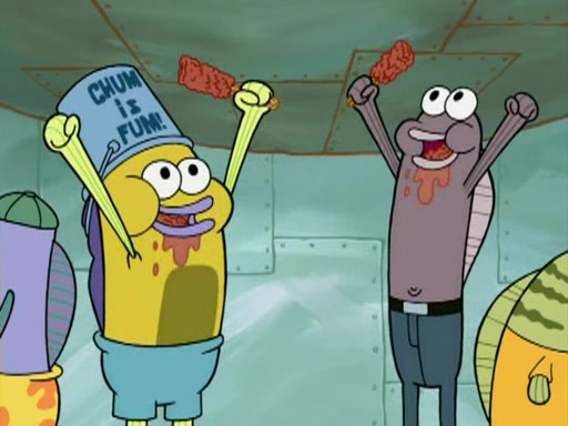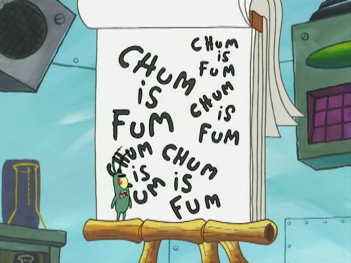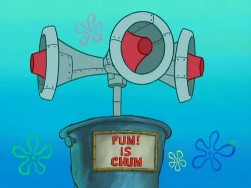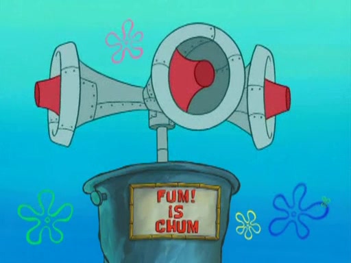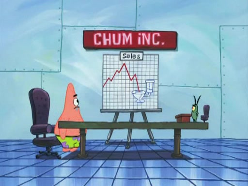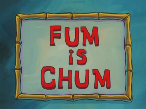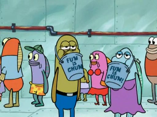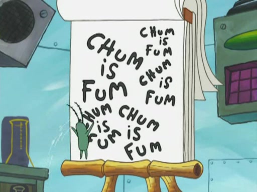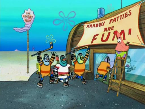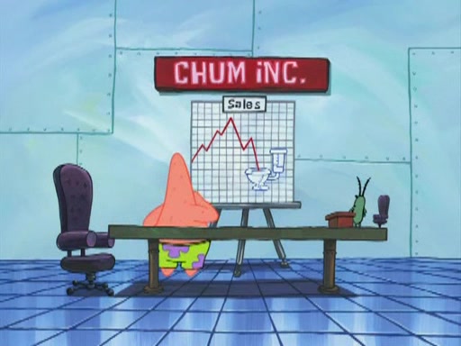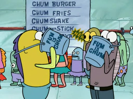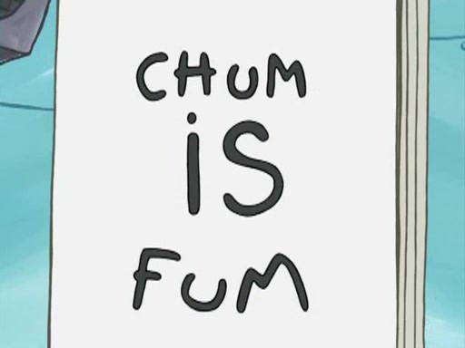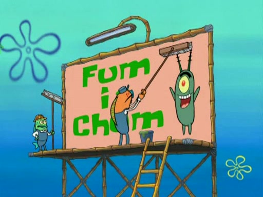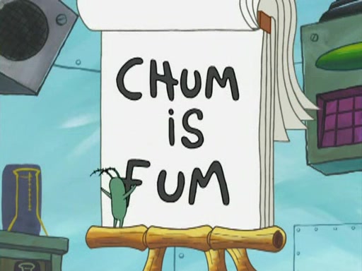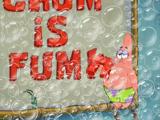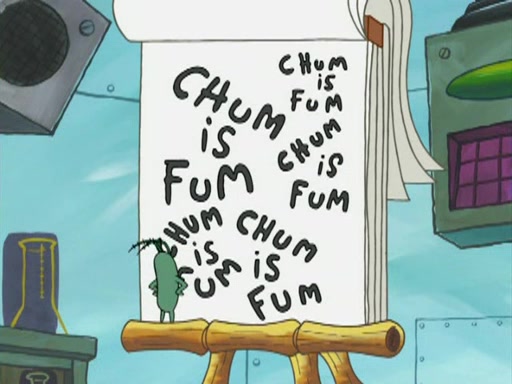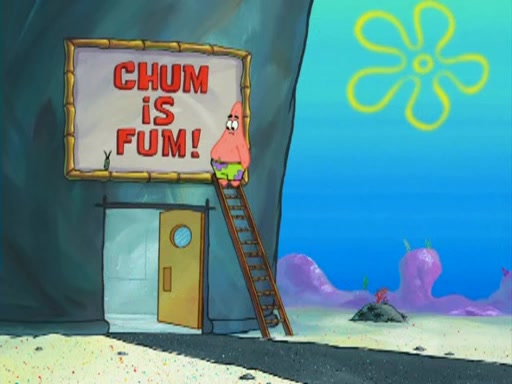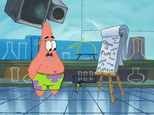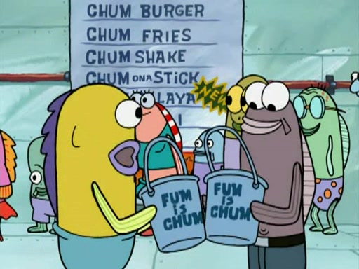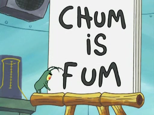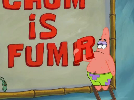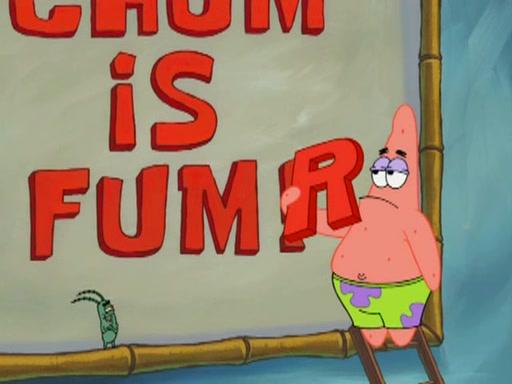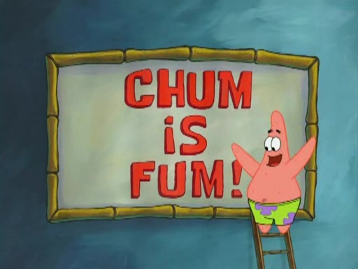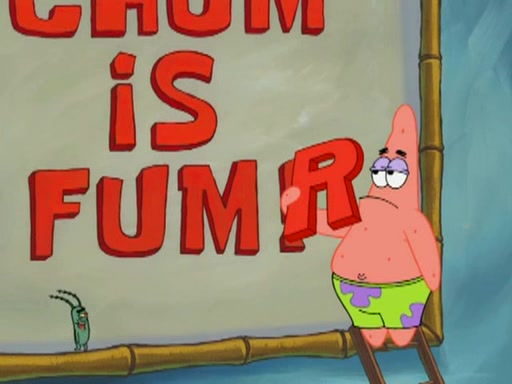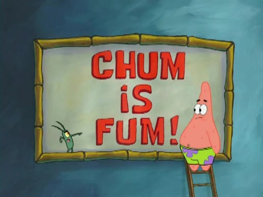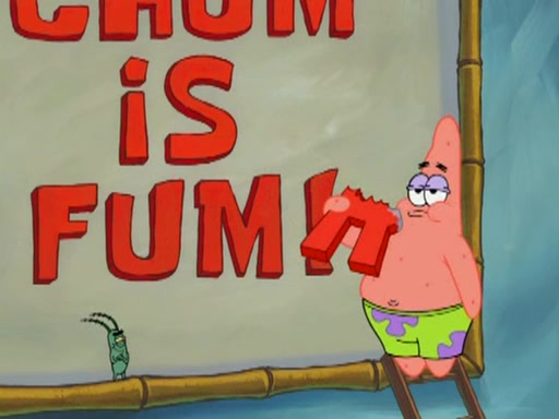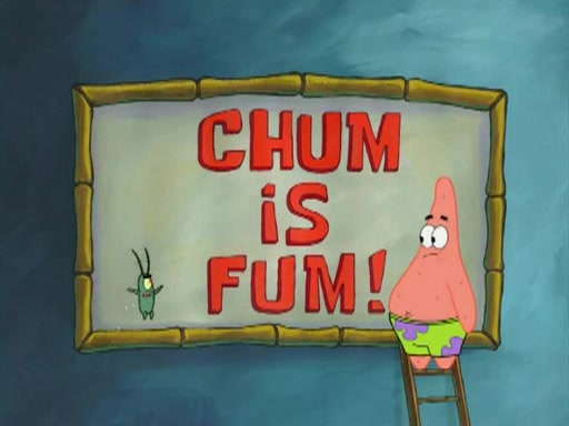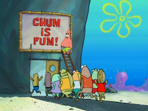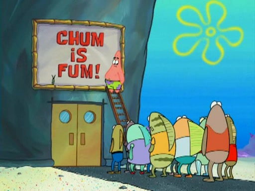 A few days later, people are getting bored of the slogan, so Plankton and Patrick hold a board meeting. Patrick comes up with a new slogan three days later, changing it to "FUM IS CHUM!" This brings back Plankton's customers, much to the chagrin of Mr. Krabs. Business is so large that Plankton gets into the restaurant magazines and even a Canadian hockey team shows up to eat. Patrick then decides the resign from his position as advertising director because he is "burnt out" - there is literally a hole burned into the back of his head. Plankton protests, but then bluffs to make Patrick believe that he is disposable, and not necessarily to keep customers eating at the Chum Bucket. During his rant, Plankton accidentally insults his customers over the intercom that he had installed by the cash register earlier to taunt Mr. Krabs. His customers hear him calling them "buffoons, morons, the dumbest of the dumb" among other things, which causes all his customers to abandon their chum in anger. Plankton then gets beaten up by the hockey team. At the end, everyone sees Patrick finishing a sign with the Krusty Krab's new slogan, "KRABBY PATTIES ARE FUM!" and everyone returns to the Krusty Krab.