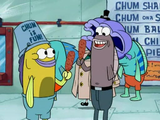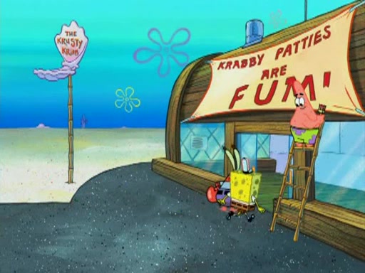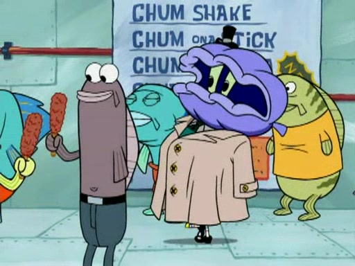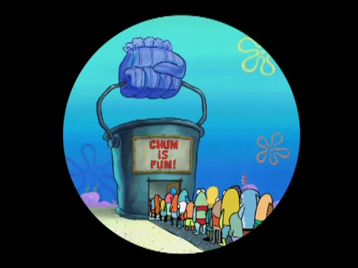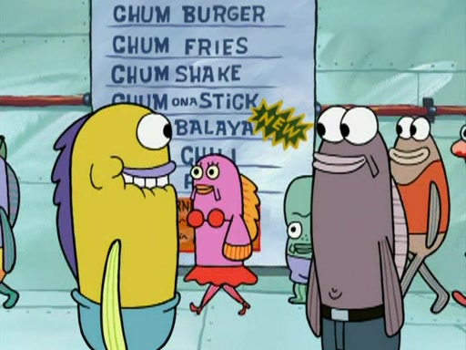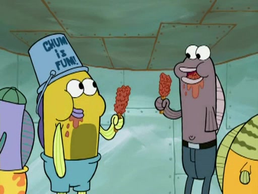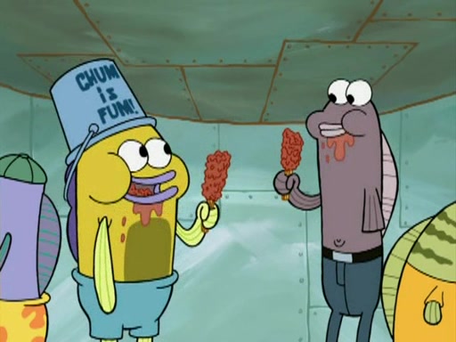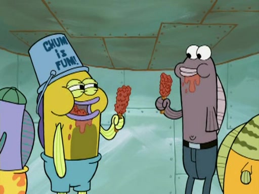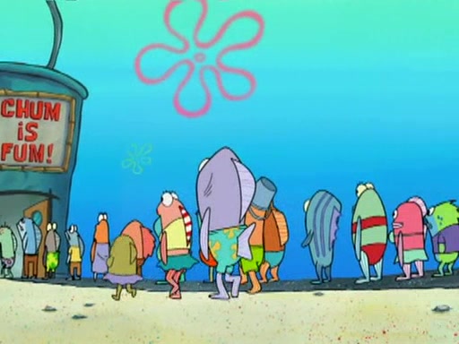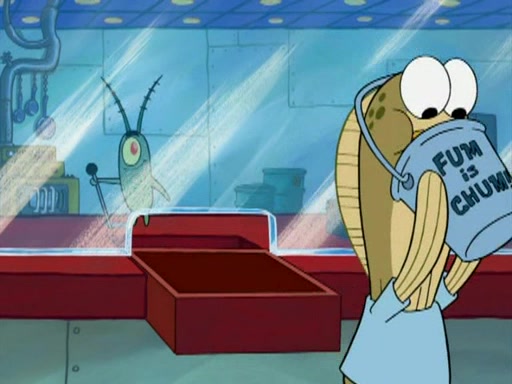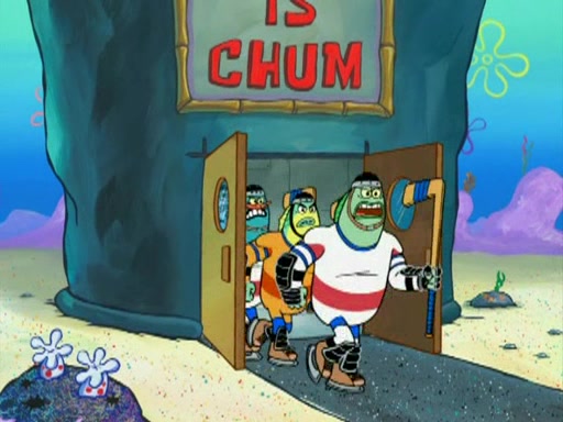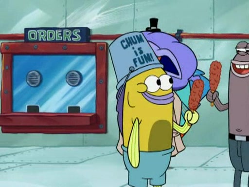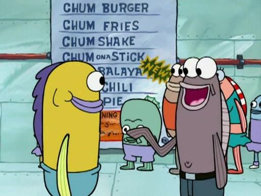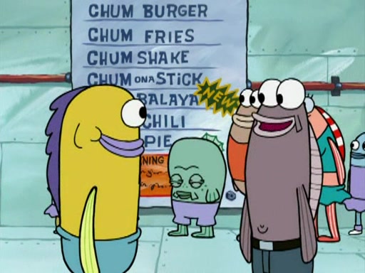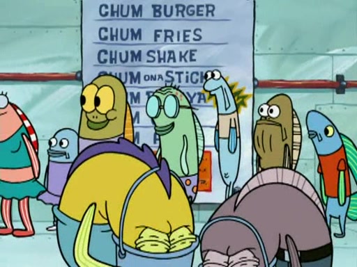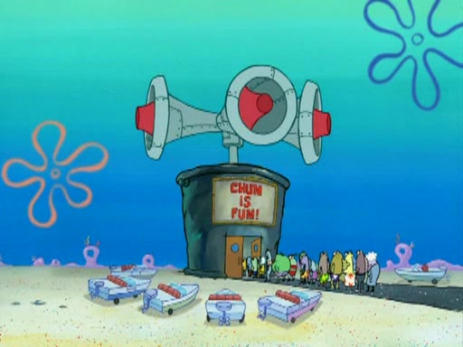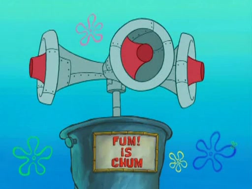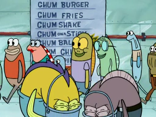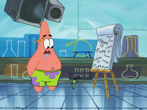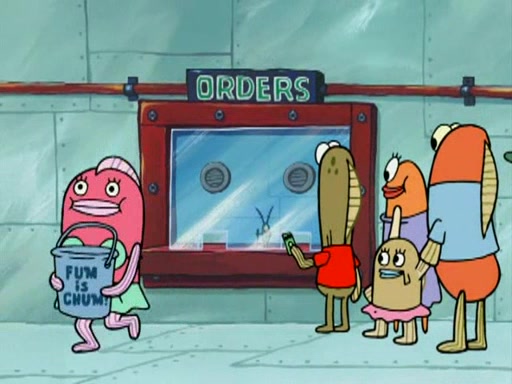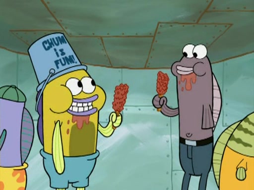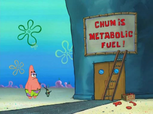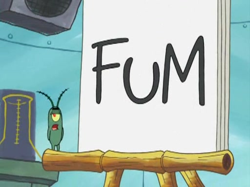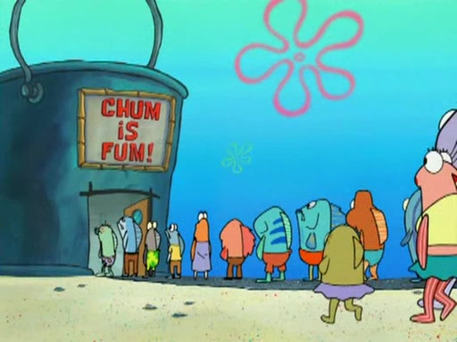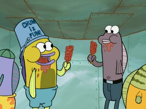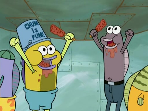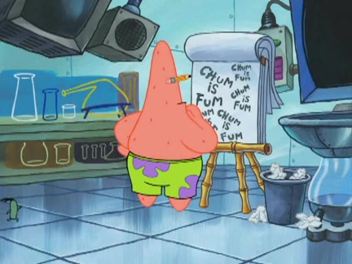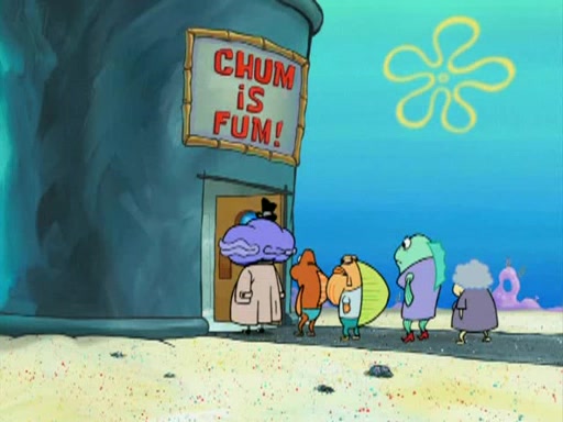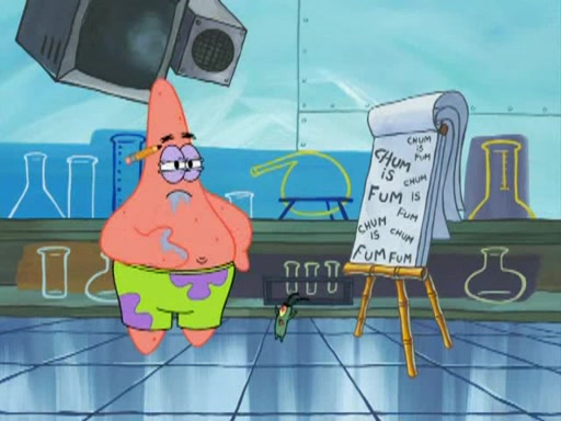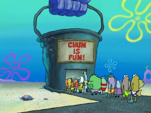 A few days later, people are getting bored of the slogan, so Plankton and Patrick hold a board meeting. Patrick comes up with a new slogan three days later, changing it to "FUM IS CHUM!" This brings back Plankton's customers, much to the chagrin of Mr. Krabs. Business is so large that Plankton gets into the restaurant magazines and even a Canadian hockey team shows up to eat. Patrick then decides the resign from his position as advertising director because he is "burnt out" - there is literally a hole burned into the back of his head. Plankton protests, but then bluffs to make Patrick believe that he is disposable, and not necessarily to keep customers eating at the Chum Bucket. During his rant, Plankton accidentally insults his customers over the intercom that he had installed by the cash register earlier to taunt Mr. Krabs. His customers hear him calling them "buffoons, morons, the dumbest of the dumb" among other things, which causes all his customers to abandon their chum in anger. Plankton then gets beaten up by the hockey team. At the end, everyone sees Patrick finishing a sign with the Krusty Krab's new slogan, "KRABBY PATTIES ARE FUM!" and everyone returns to the Krusty Krab.