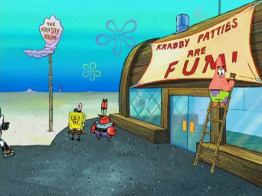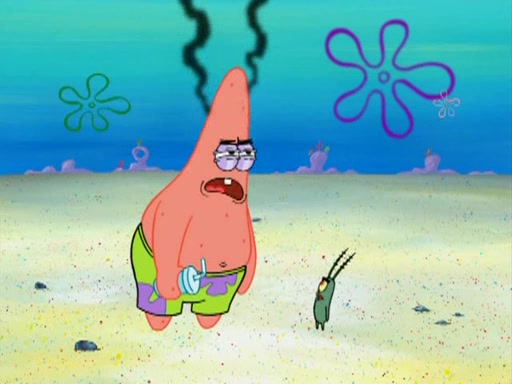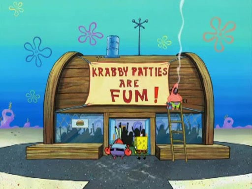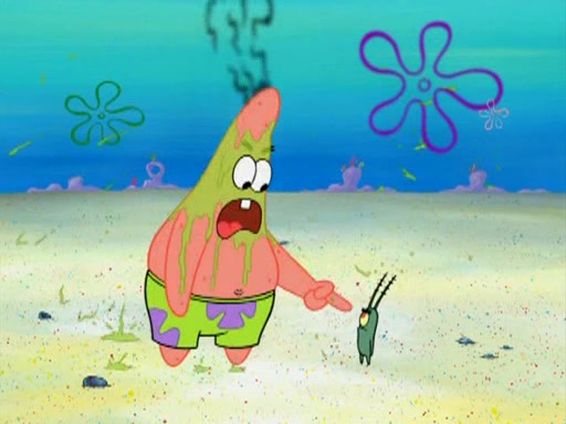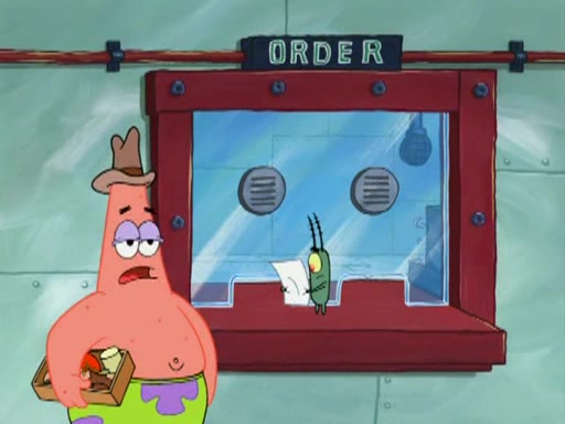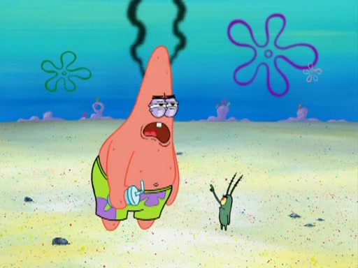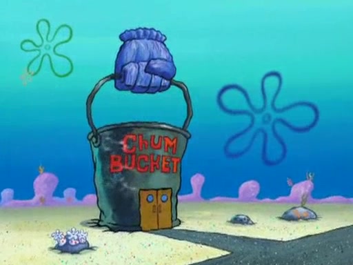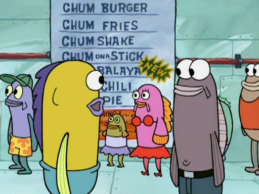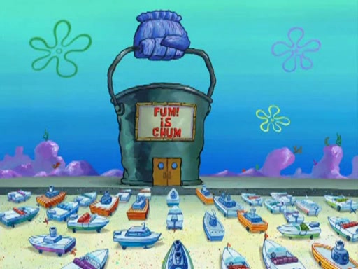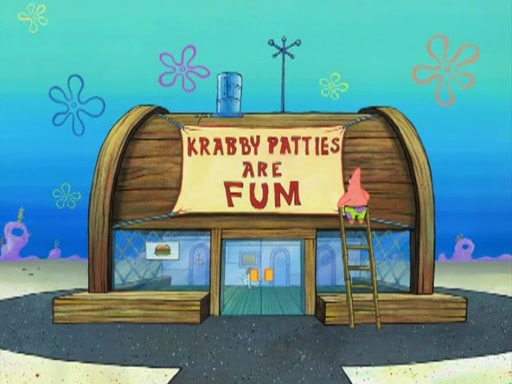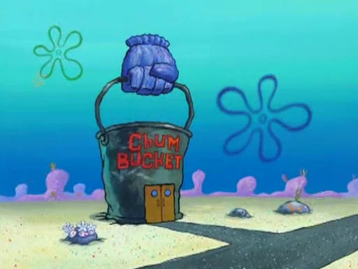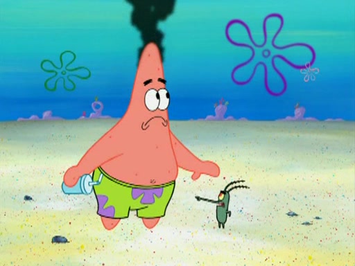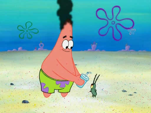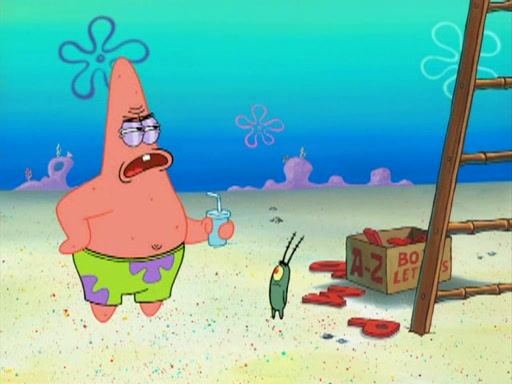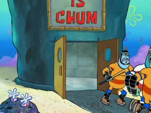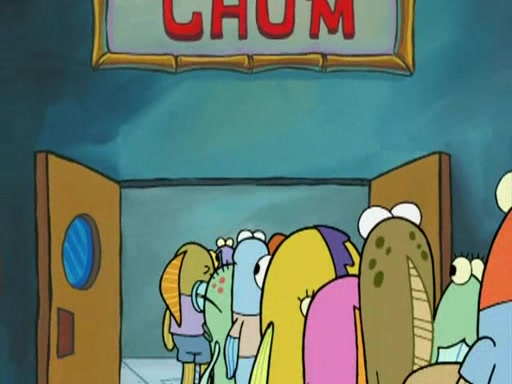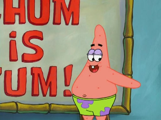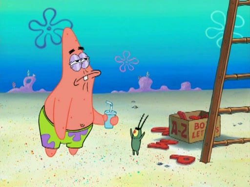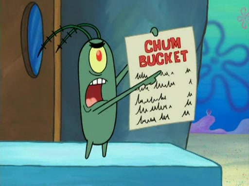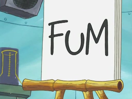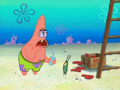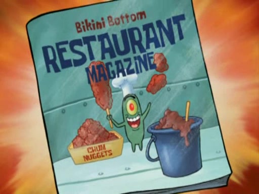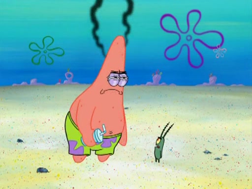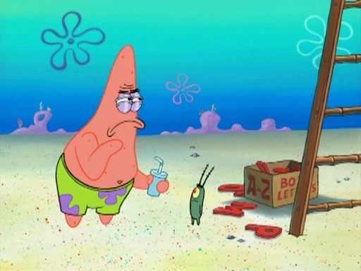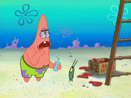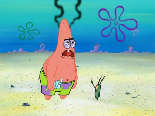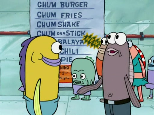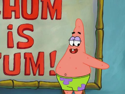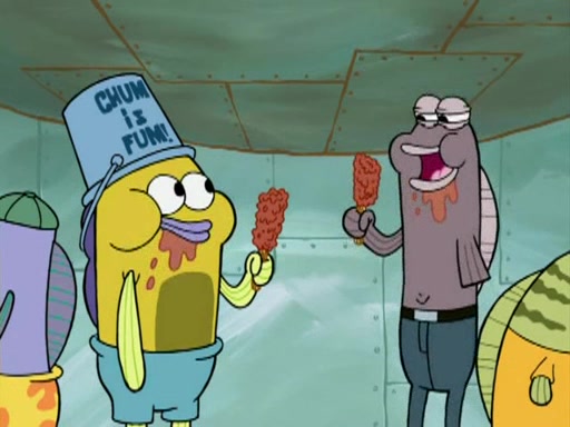 A few days later, people are getting bored of the slogan, so Plankton and Patrick hold a board meeting. Patrick comes up with a new slogan three days later, changing it to "FUM IS CHUM!" This brings back Plankton's customers, much to the chagrin of Mr. Krabs. Business is so large that Plankton gets into the restaurant magazines and even a Canadian hockey team shows up to eat. Patrick then decides the resign from his position as advertising director because he is "burnt out" - there is literally a hole burned into the back of his head. Plankton protests, but then bluffs to make Patrick believe that he is disposable, and not necessarily to keep customers eating at the Chum Bucket. During his rant, Plankton accidentally insults his customers over the intercom that he had installed by the cash register earlier to taunt Mr. Krabs. His customers hear him calling them "buffoons, morons, the dumbest of the dumb" among other things, which causes all his customers to abandon their chum in anger. Plankton then gets beaten up by the hockey team. At the end, everyone sees Patrick finishing a sign with the Krusty Krab's new slogan, "KRABBY PATTIES ARE FUM!" and everyone returns to the Krusty Krab.