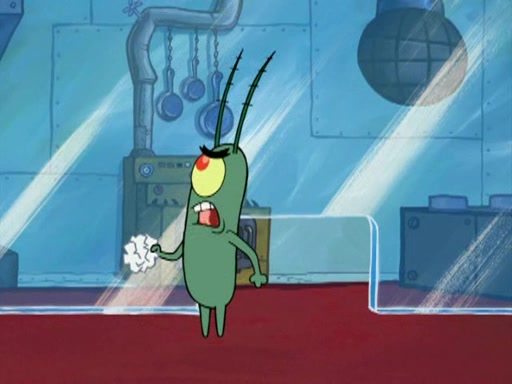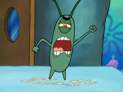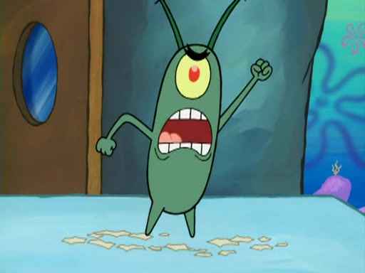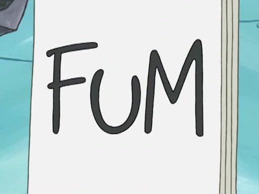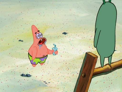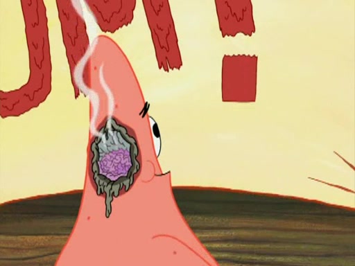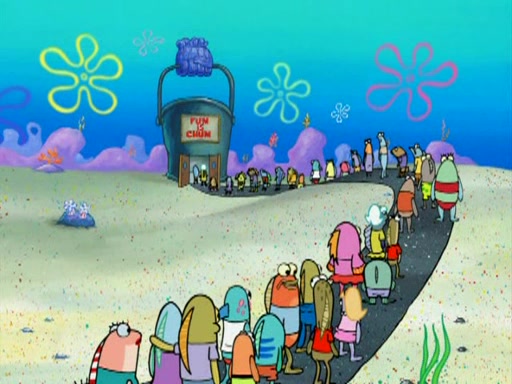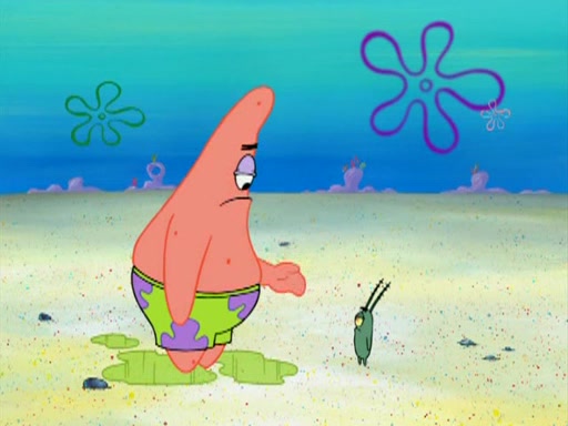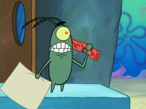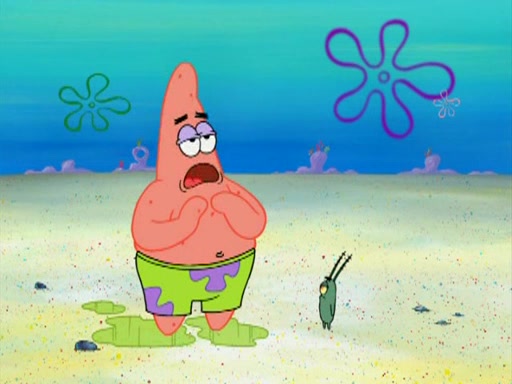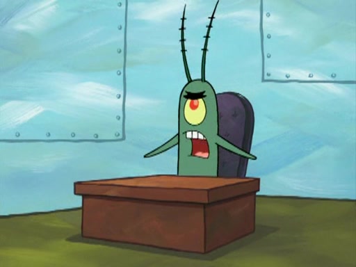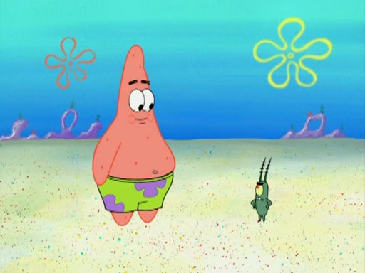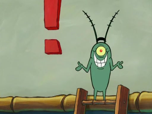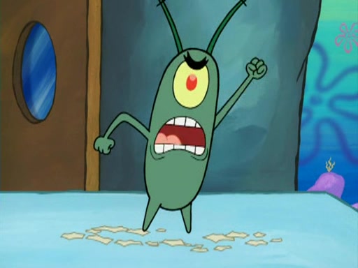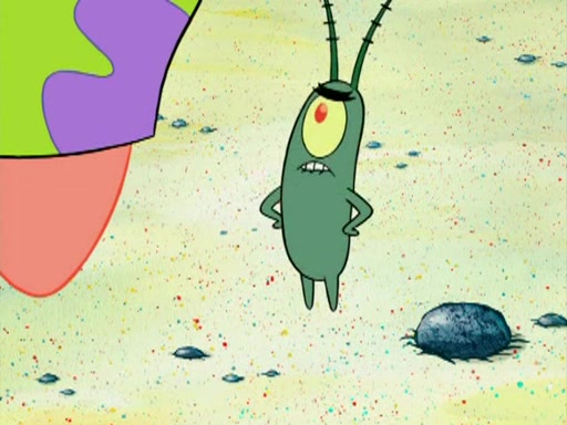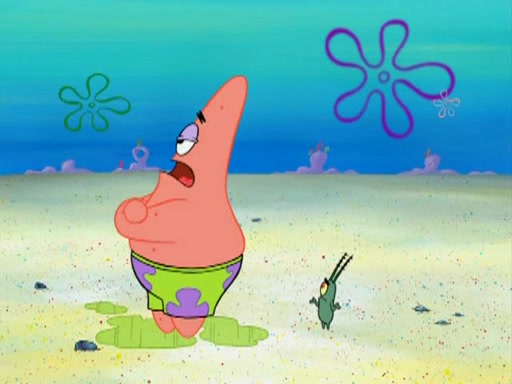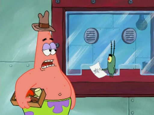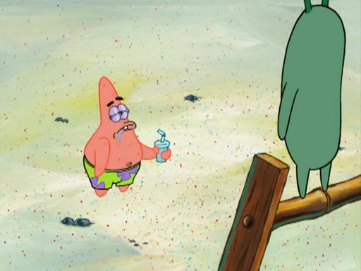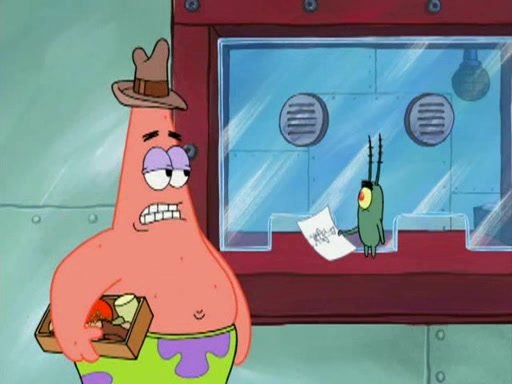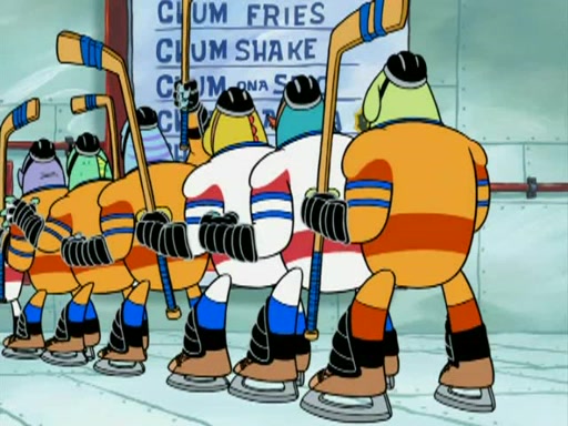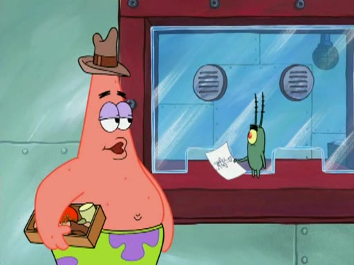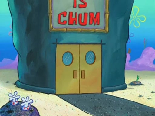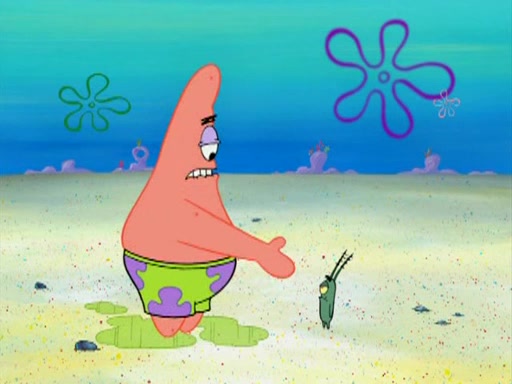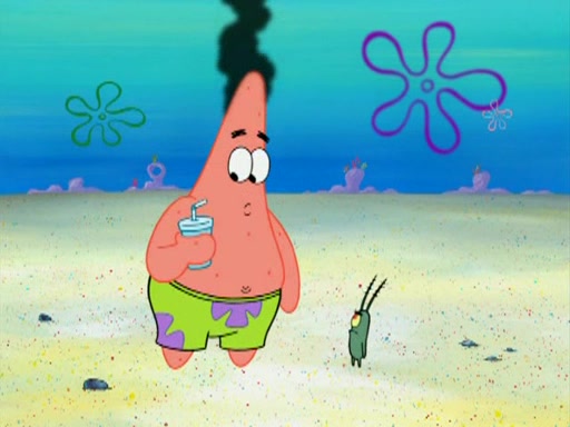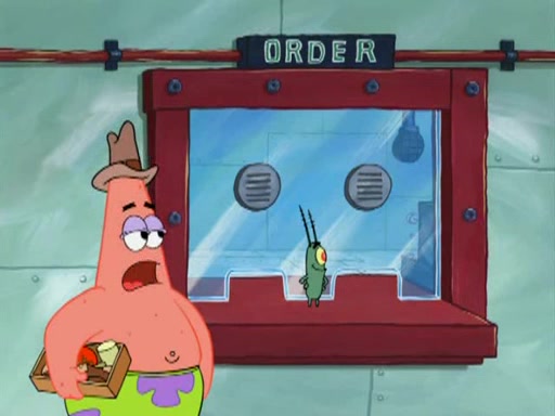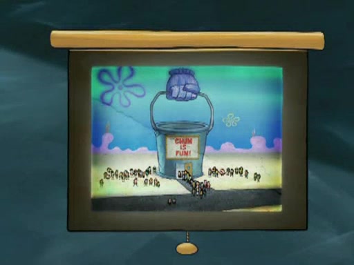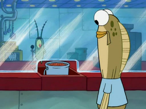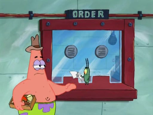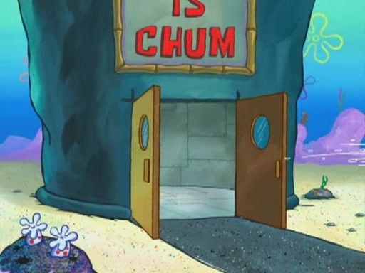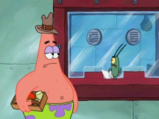 A few days later, people are getting bored of the slogan, so Plankton and Patrick hold a board meeting. Patrick comes up with a new slogan three days later, changing it to "FUM IS CHUM!" This brings back Plankton's customers, much to the chagrin of Mr. Krabs. Business is so large that Plankton gets into the restaurant magazines and even a Canadian hockey team shows up to eat. Patrick then decides the resign from his position as advertising director because he is "burnt out" - there is literally a hole burned into the back of his head. Plankton protests, but then bluffs to make Patrick believe that he is disposable, and not necessarily to keep customers eating at the Chum Bucket. During his rant, Plankton accidentally insults his customers over the intercom that he had installed by the cash register earlier to taunt Mr. Krabs. His customers hear him calling them "buffoons, morons, the dumbest of the dumb" among other things, which causes all his customers to abandon their chum in anger. Plankton then gets beaten up by the hockey team. At the end, everyone sees Patrick finishing a sign with the Krusty Krab's new slogan, "KRABBY PATTIES ARE FUM!" and everyone returns to the Krusty Krab.