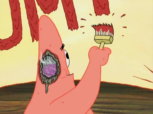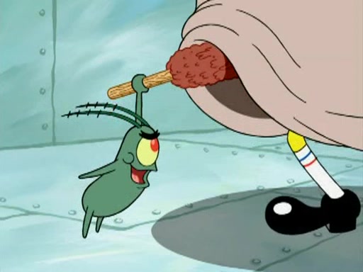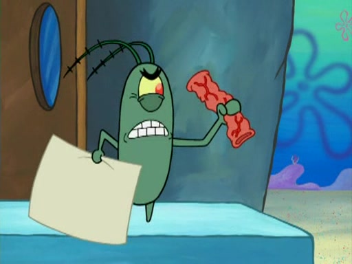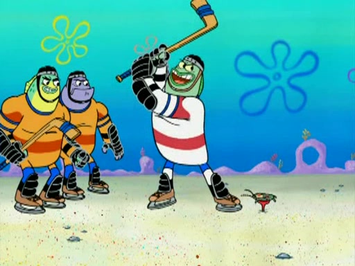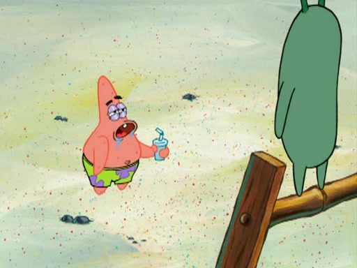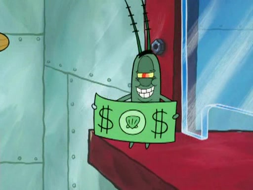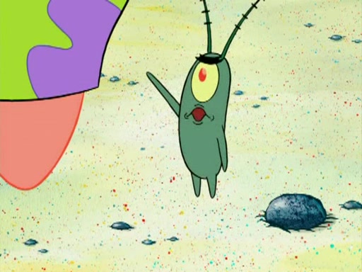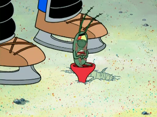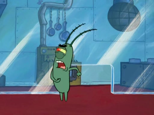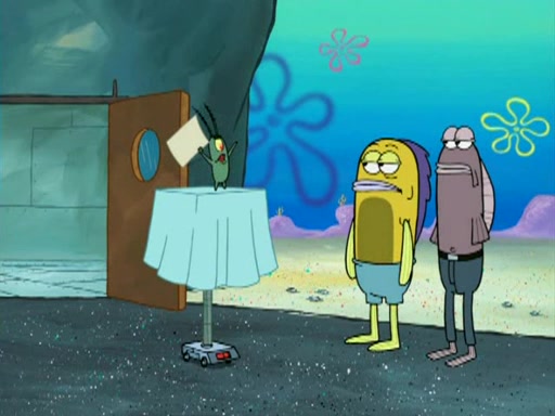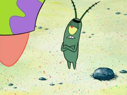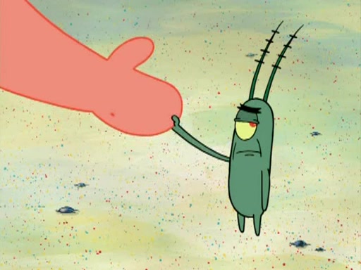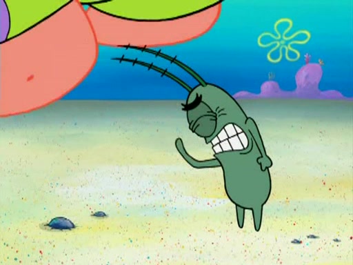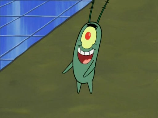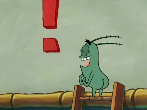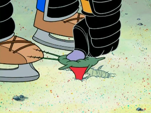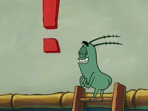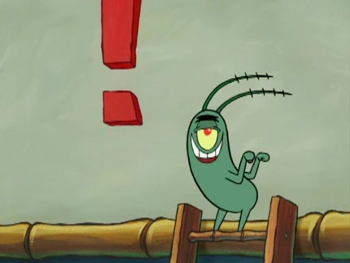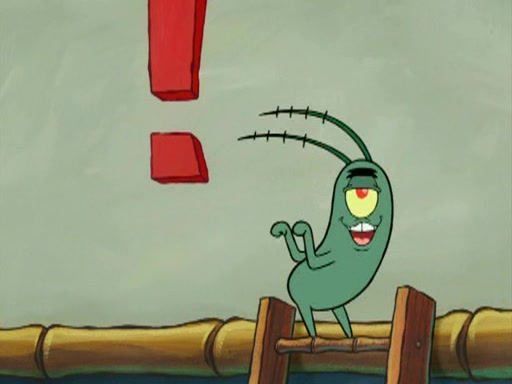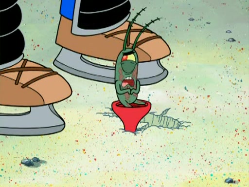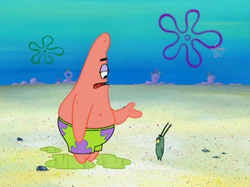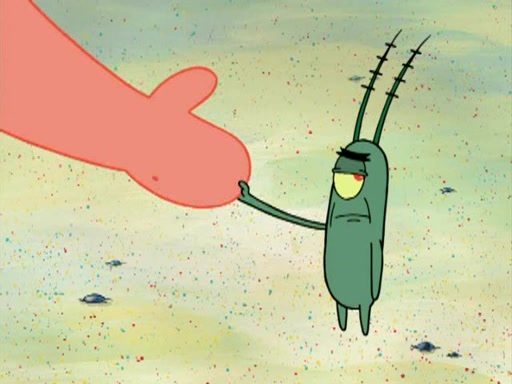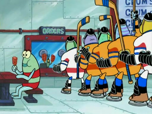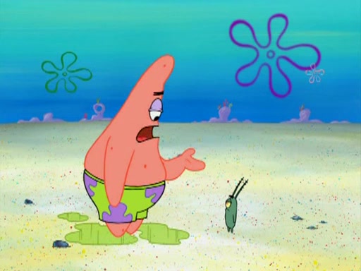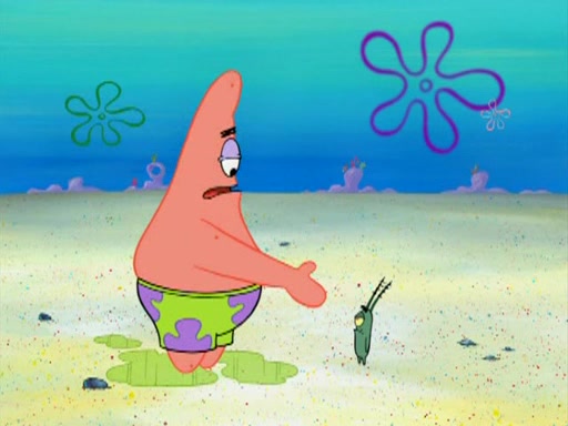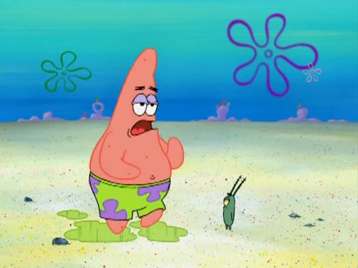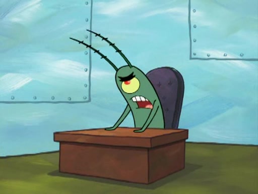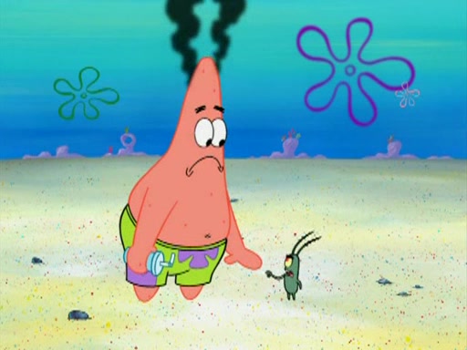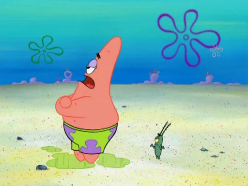 A few days later, people are getting bored of the slogan, so Plankton and Patrick hold a board meeting. Patrick comes up with a new slogan three days later, changing it to "FUM IS CHUM!" This brings back Plankton's customers, much to the chagrin of Mr. Krabs. Business is so large that Plankton gets into the restaurant magazines and even a Canadian hockey team shows up to eat. Patrick then decides the resign from his position as advertising director because he is "burnt out" - there is literally a hole burned into the back of his head. Plankton protests, but then bluffs to make Patrick believe that he is disposable, and not necessarily to keep customers eating at the Chum Bucket. During his rant, Plankton accidentally insults his customers over the intercom that he had installed by the cash register earlier to taunt Mr. Krabs. His customers hear him calling them "buffoons, morons, the dumbest of the dumb" among other things, which causes all his customers to abandon their chum in anger. Plankton then gets beaten up by the hockey team. At the end, everyone sees Patrick finishing a sign with the Krusty Krab's new slogan, "KRABBY PATTIES ARE FUM!" and everyone returns to the Krusty Krab.