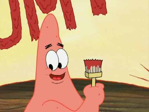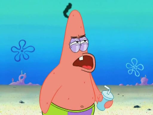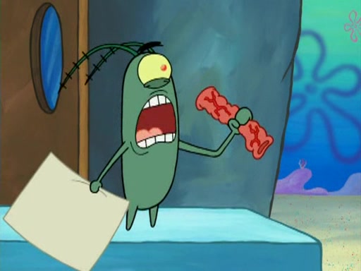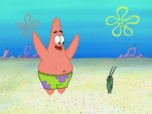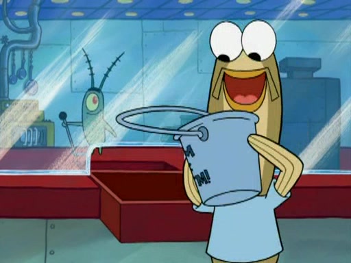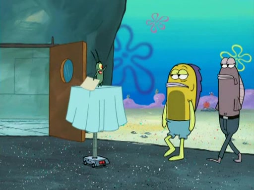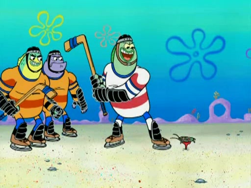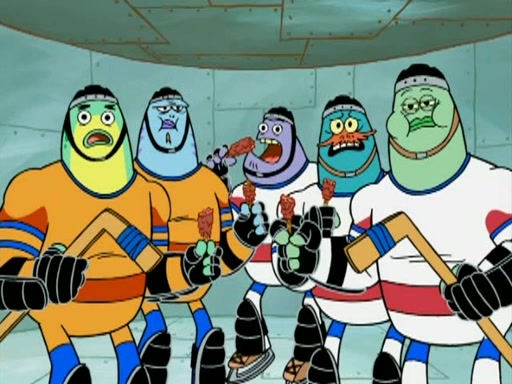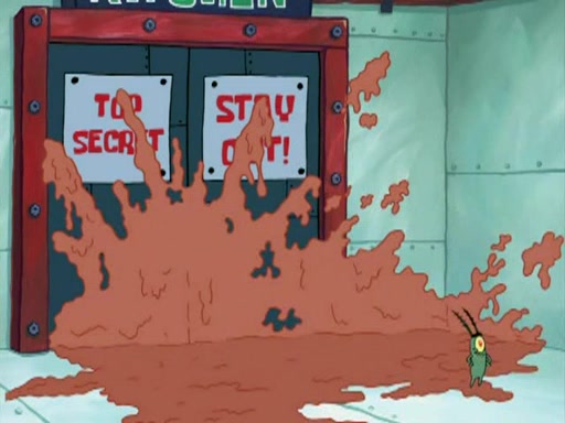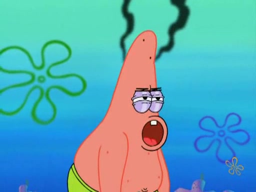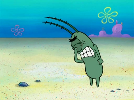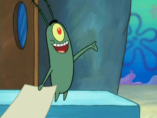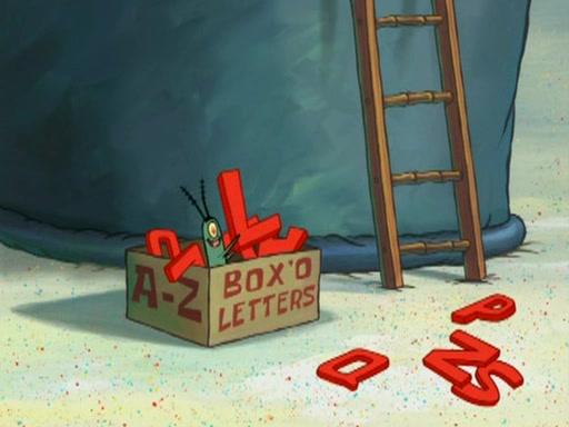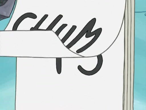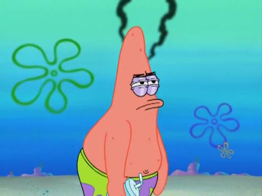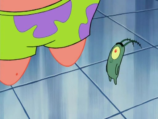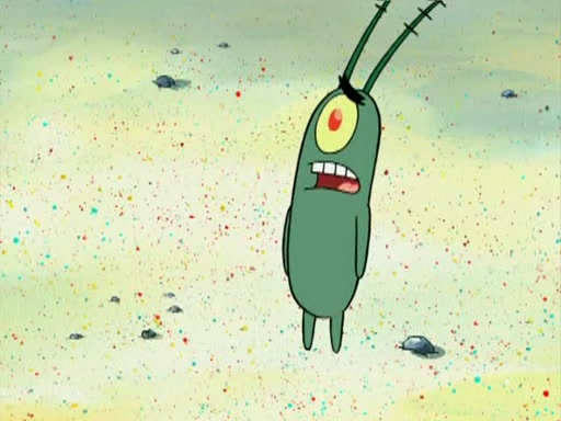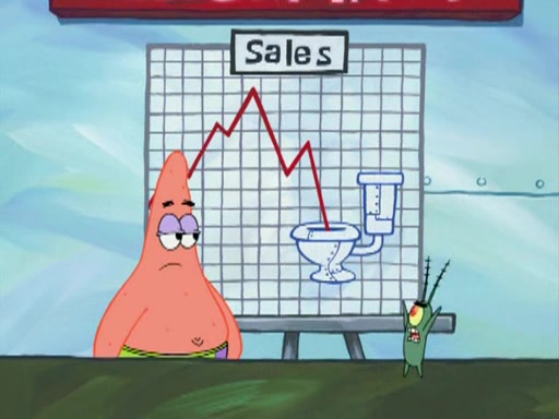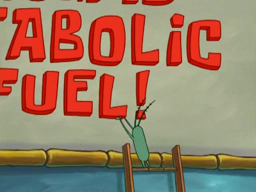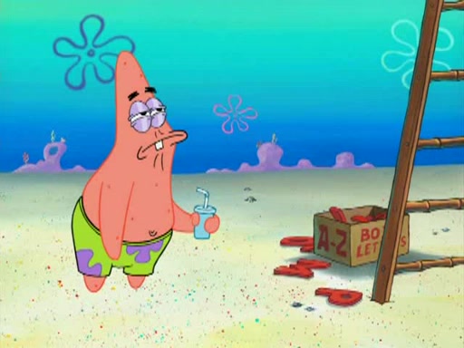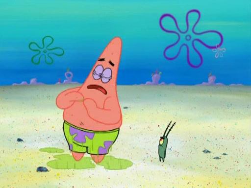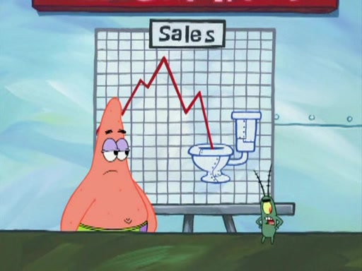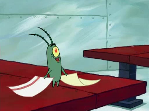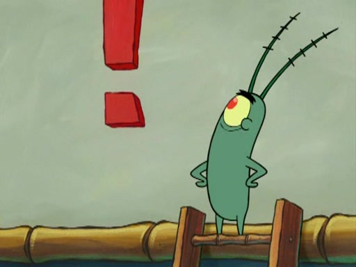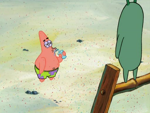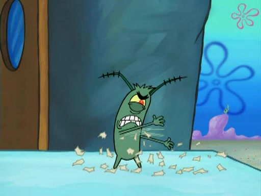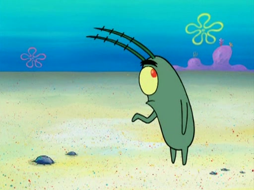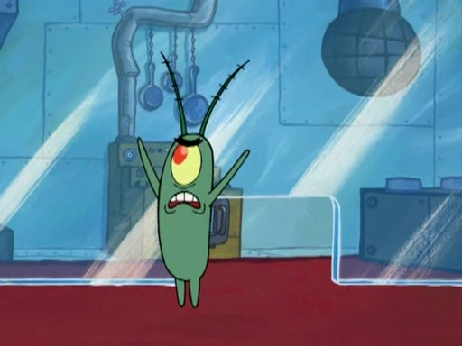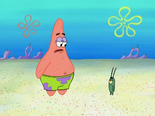 A few days later, people are getting bored of the slogan, so Plankton and Patrick hold a board meeting. Patrick comes up with a new slogan three days later, changing it to "FUM IS CHUM!" This brings back Plankton's customers, much to the chagrin of Mr. Krabs. Business is so large that Plankton gets into the restaurant magazines and even a Canadian hockey team shows up to eat. Patrick then decides the resign from his position as advertising director because he is "burnt out" - there is literally a hole burned into the back of his head. Plankton protests, but then bluffs to make Patrick believe that he is disposable, and not necessarily to keep customers eating at the Chum Bucket. During his rant, Plankton accidentally insults his customers over the intercom that he had installed by the cash register earlier to taunt Mr. Krabs. His customers hear him calling them "buffoons, morons, the dumbest of the dumb" among other things, which causes all his customers to abandon their chum in anger. Plankton then gets beaten up by the hockey team. At the end, everyone sees Patrick finishing a sign with the Krusty Krab's new slogan, "KRABBY PATTIES ARE FUM!" and everyone returns to the Krusty Krab.