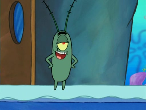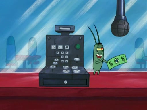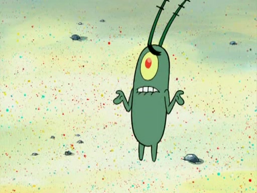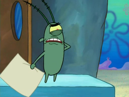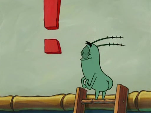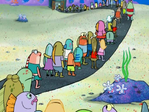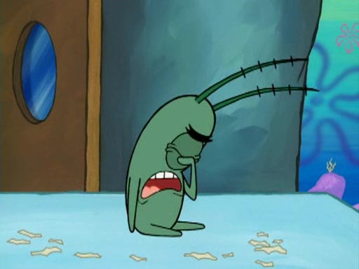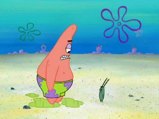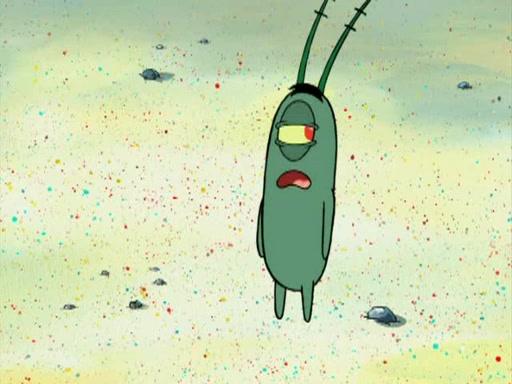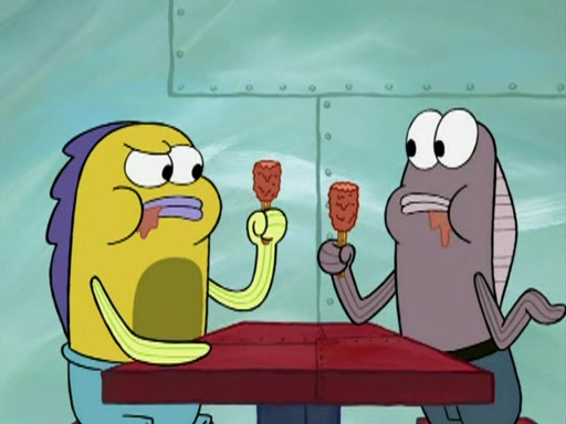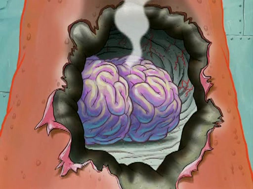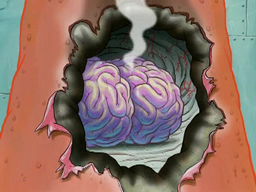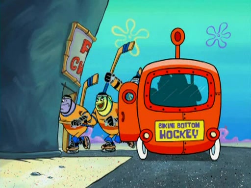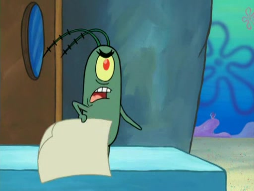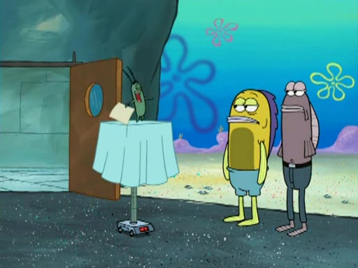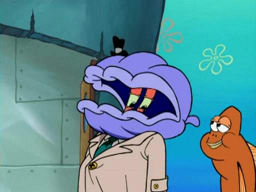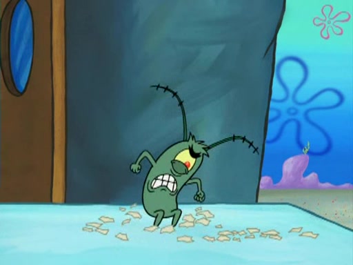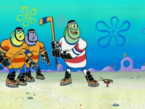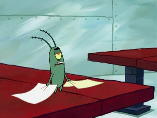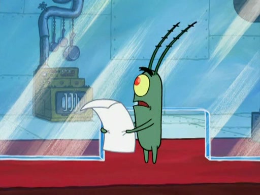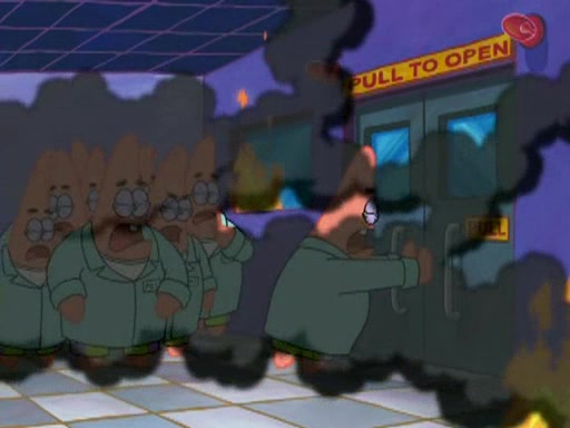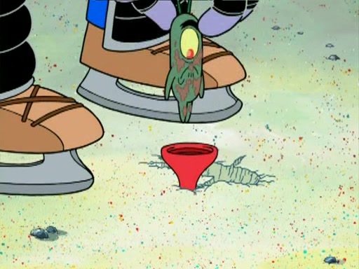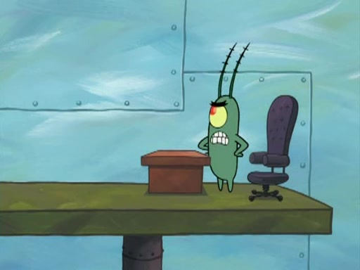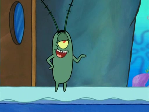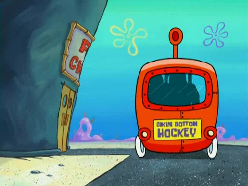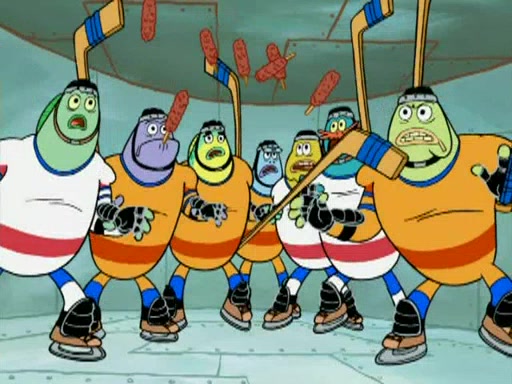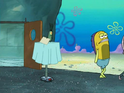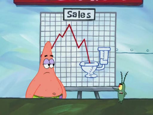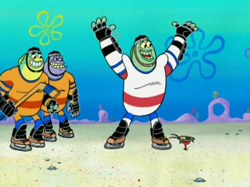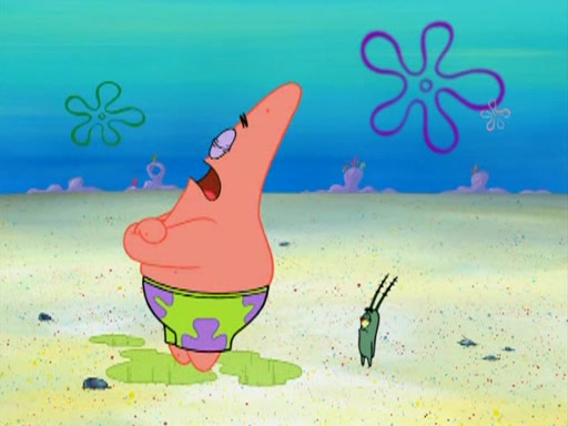 A few days later, people are getting bored of the slogan, so Plankton and Patrick hold a board meeting. Patrick comes up with a new slogan three days later, changing it to "FUM IS CHUM!" This brings back Plankton's customers, much to the chagrin of Mr. Krabs. Business is so large that Plankton gets into the restaurant magazines and even a Canadian hockey team shows up to eat. Patrick then decides the resign from his position as advertising director because he is "burnt out" - there is literally a hole burned into the back of his head. Plankton protests, but then bluffs to make Patrick believe that he is disposable, and not necessarily to keep customers eating at the Chum Bucket. During his rant, Plankton accidentally insults his customers over the intercom that he had installed by the cash register earlier to taunt Mr. Krabs. His customers hear him calling them "buffoons, morons, the dumbest of the dumb" among other things, which causes all his customers to abandon their chum in anger. Plankton then gets beaten up by the hockey team. At the end, everyone sees Patrick finishing a sign with the Krusty Krab's new slogan, "KRABBY PATTIES ARE FUM!" and everyone returns to the Krusty Krab.