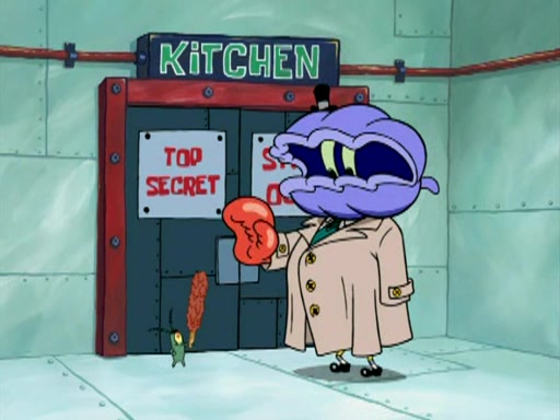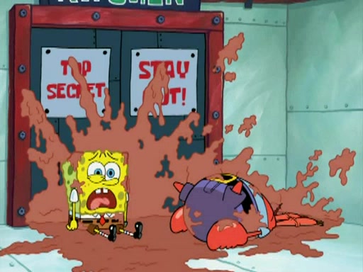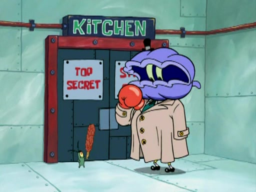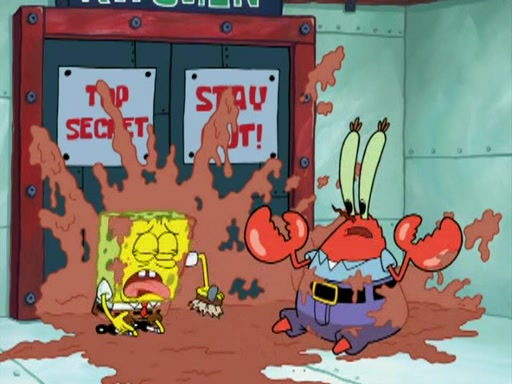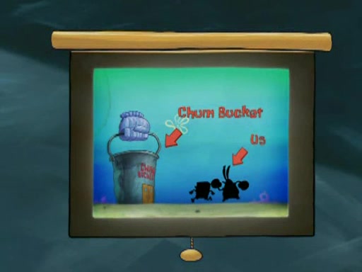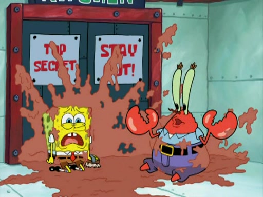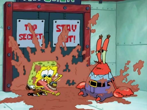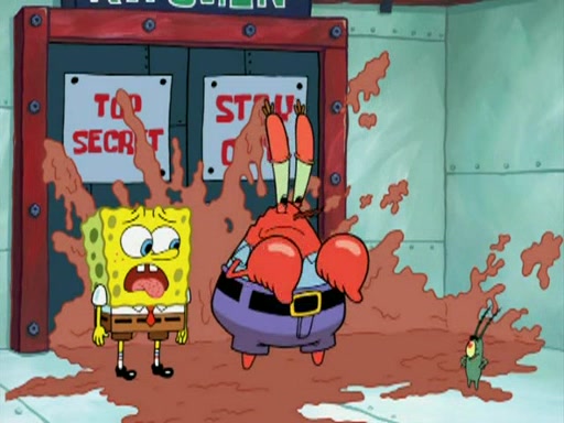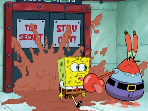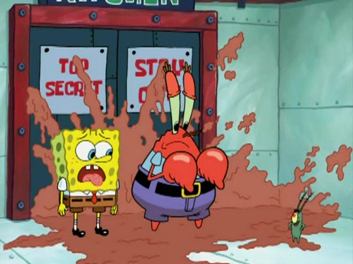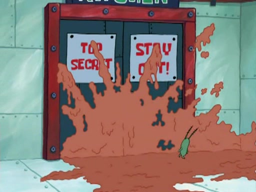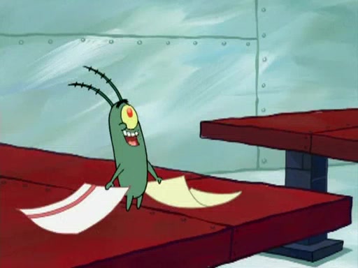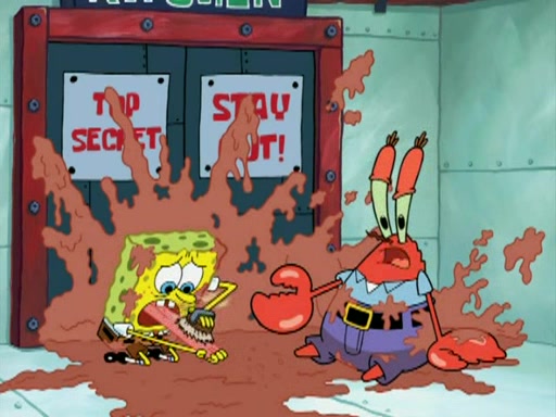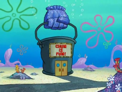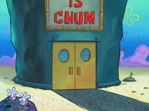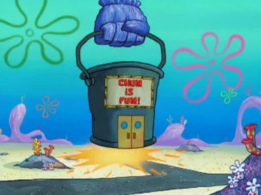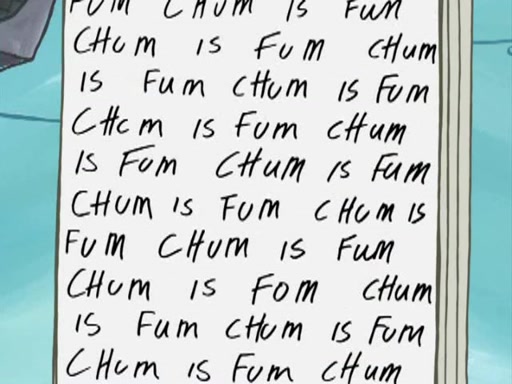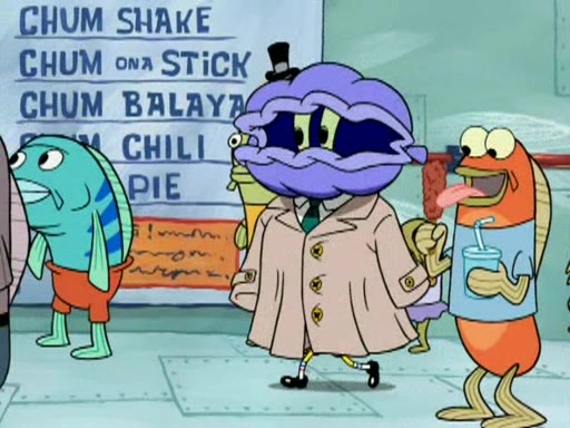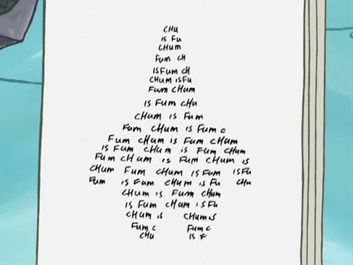 Meanwhile, back at the Krusty Krab, Mr. Krabs believes Plankton has stolen the secret formula, so he comes up with a plan to steal the formula back. Plankton sees through SpongeBob and Mr. Krabs' disguise and they realize that it was the slogan that brought in the customers, despite the fact the chum tastes awful. To combat the disgusting taste of the chum, the customers simply say "Chum is Fum" over and over. Then Plankton goes to Patrick to check on how his assignment to come up with new slogan ideas is going. However, all Patrick does is write Chum is Fum in a thousand different ways. Plankton then gets mad at Patrick, but cools down because Patrick's slogan is still attracting customers.