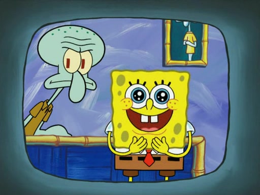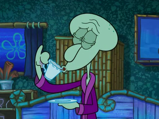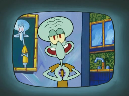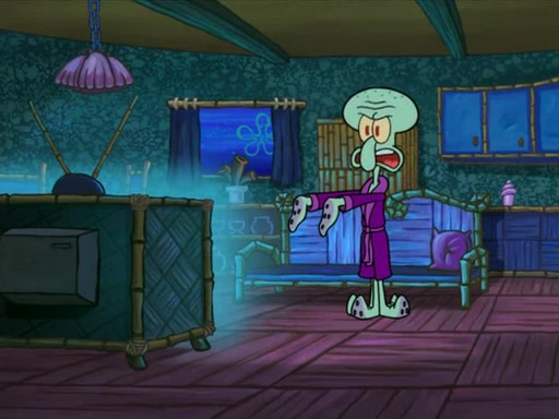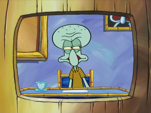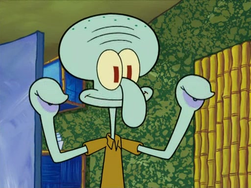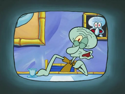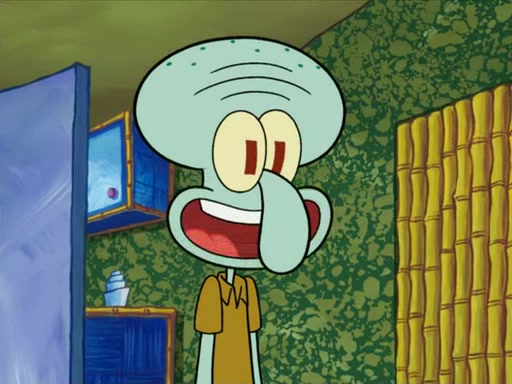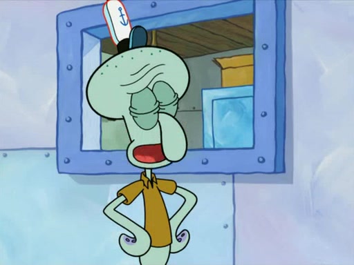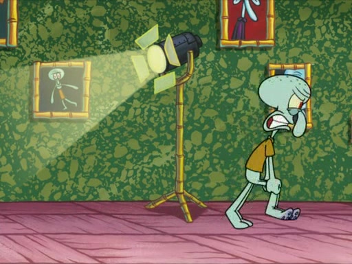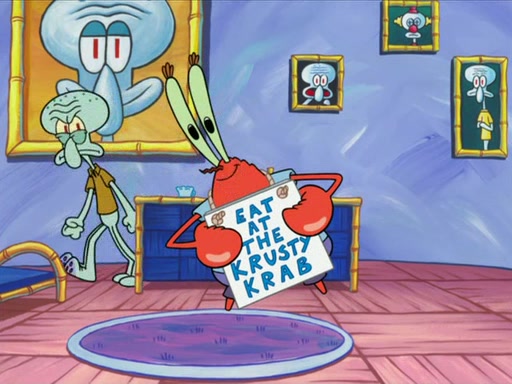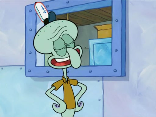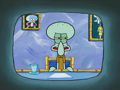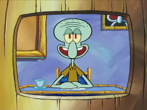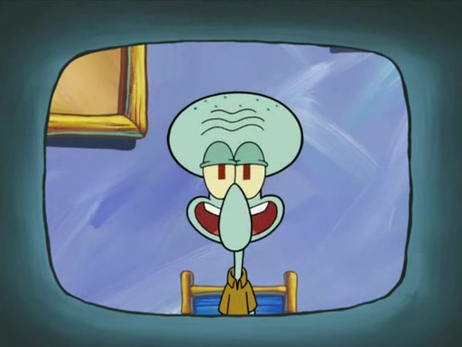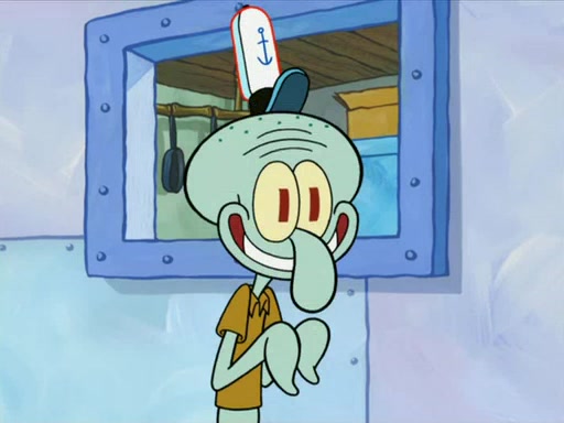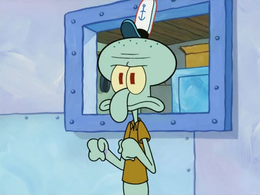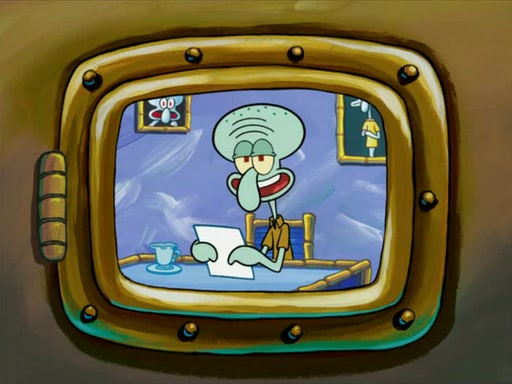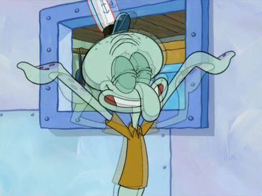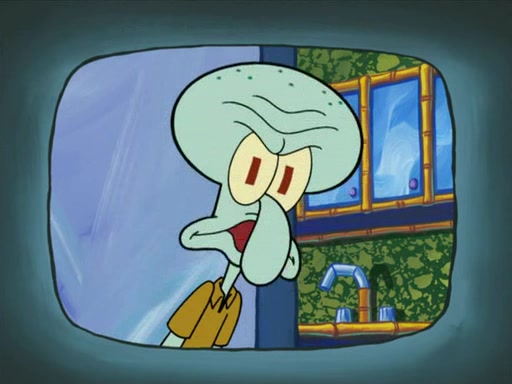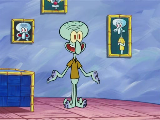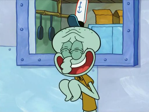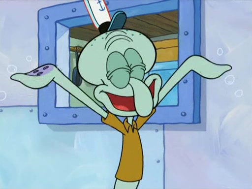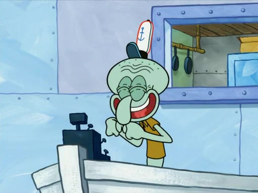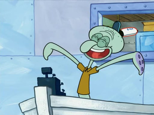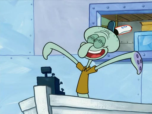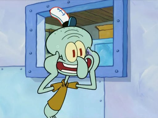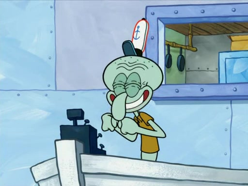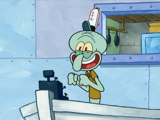 He is next seen at the Krusty Krab waiting happily to leave and get started on his show. SpongeBob overhears him talking and asks why he is so jittery. But Squidward plugs up his ears with Krabby Patties and leaves before SpongeBob can ask.