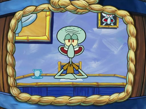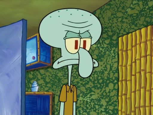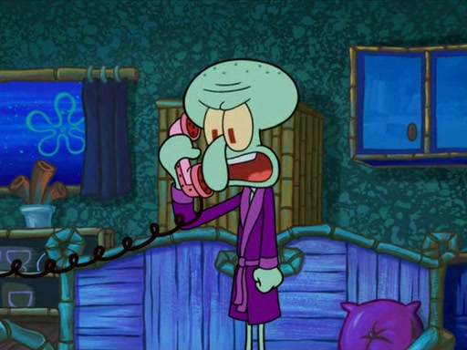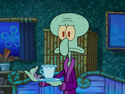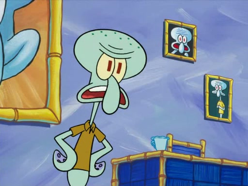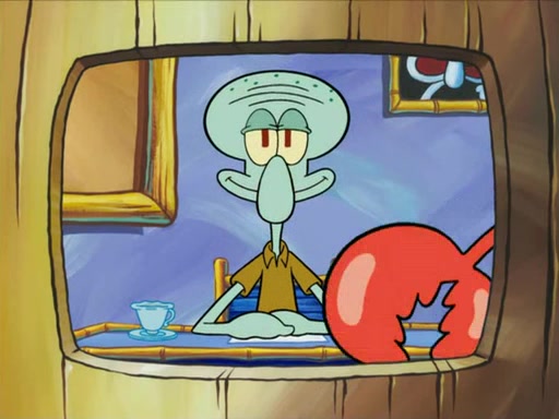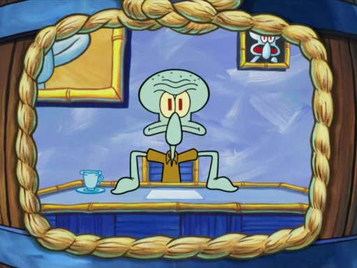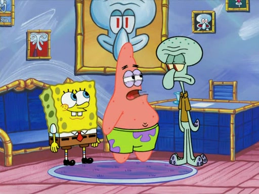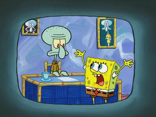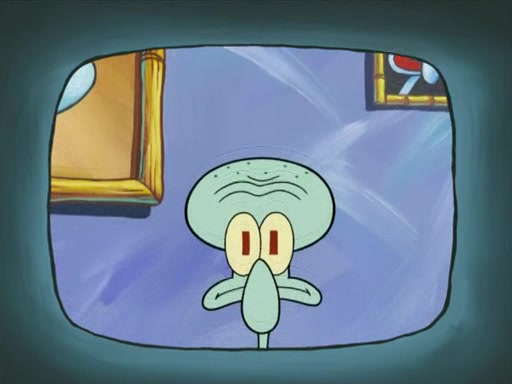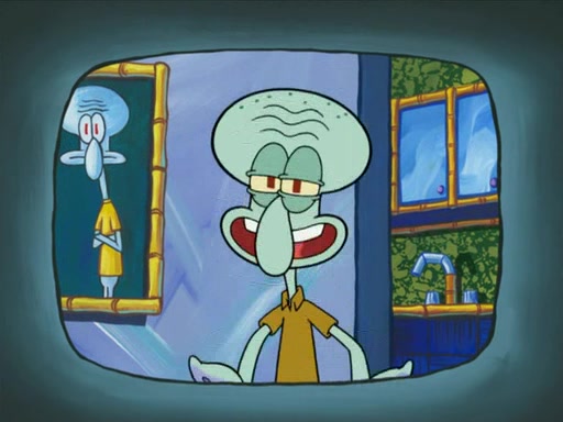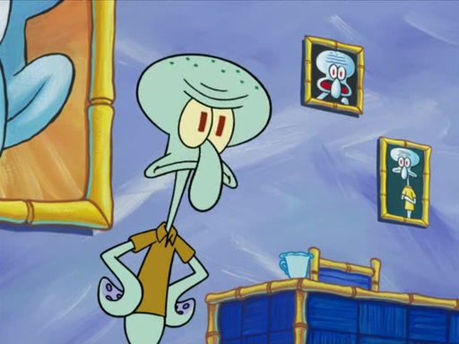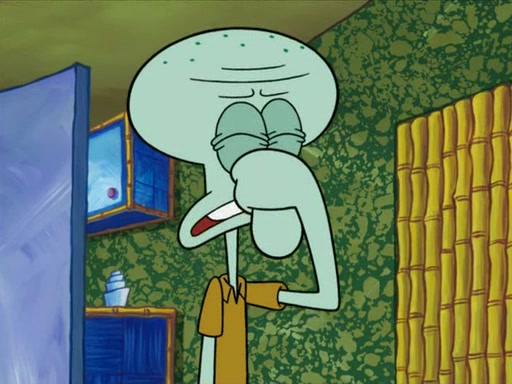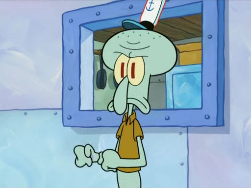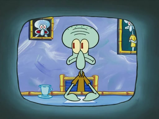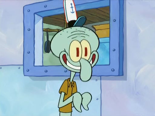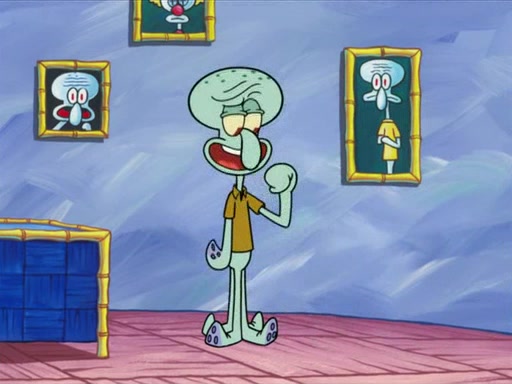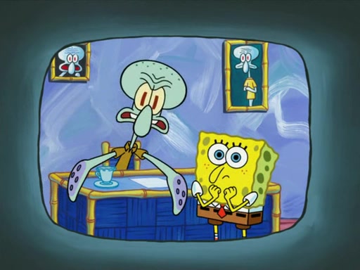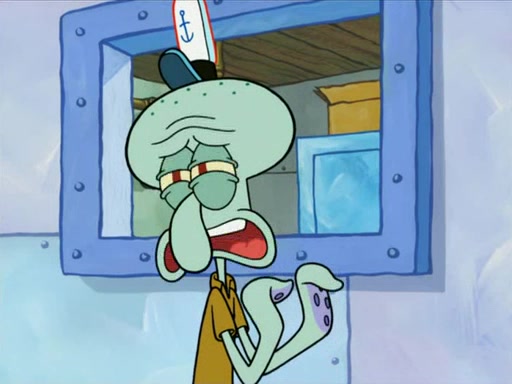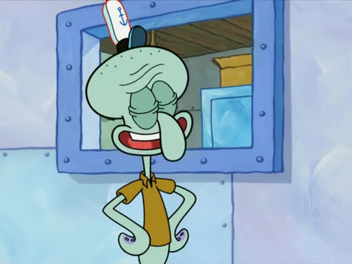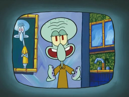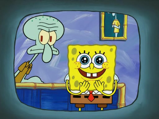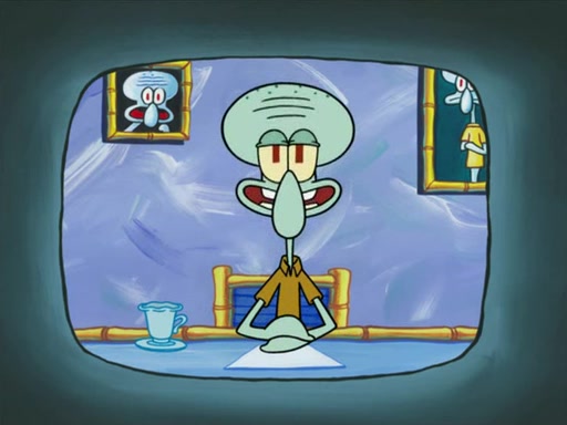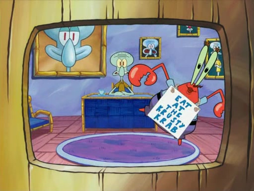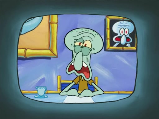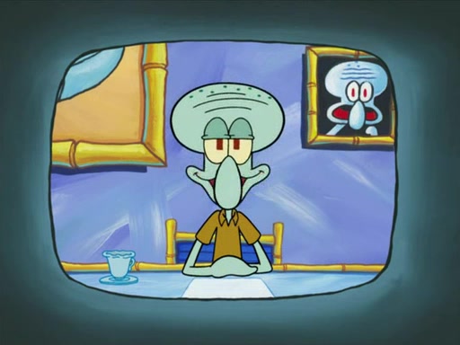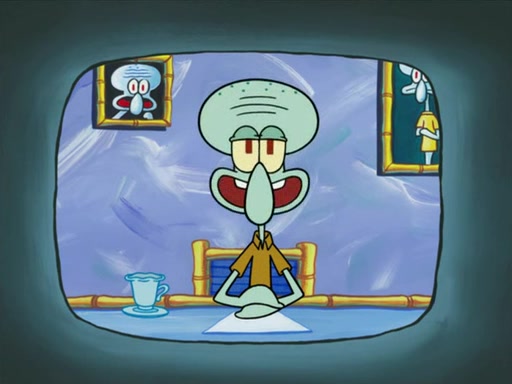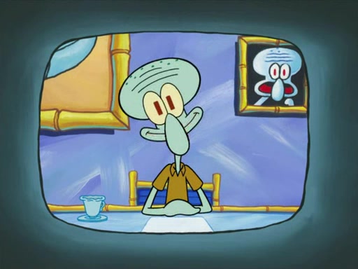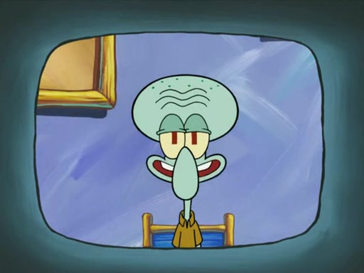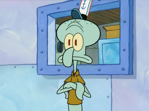 He is next seen at the Krusty Krab waiting happily to leave and get started on his show. SpongeBob overhears him talking and asks why he is so jittery. But Squidward plugs up his ears with Krabby Patties and leaves before SpongeBob can ask.