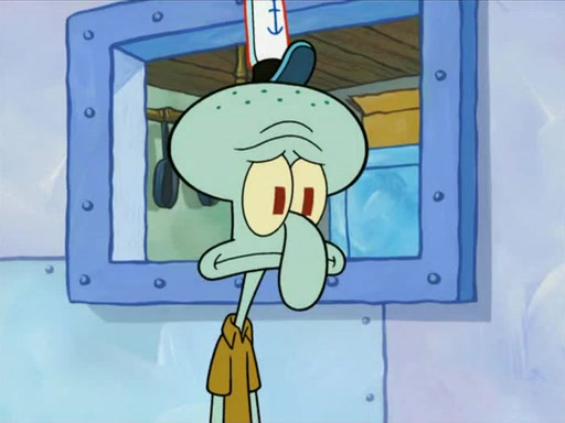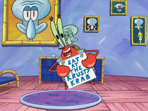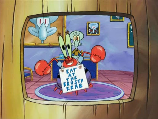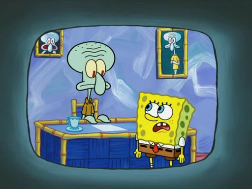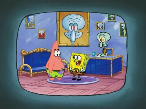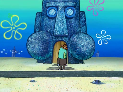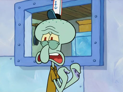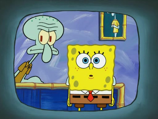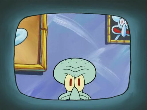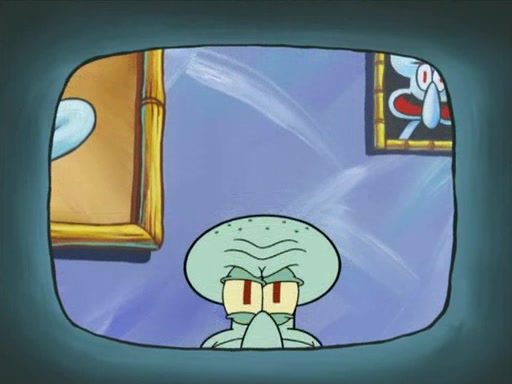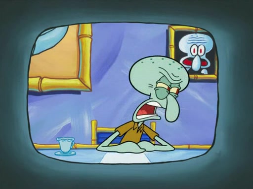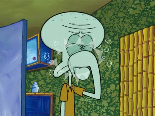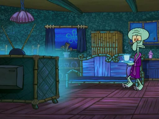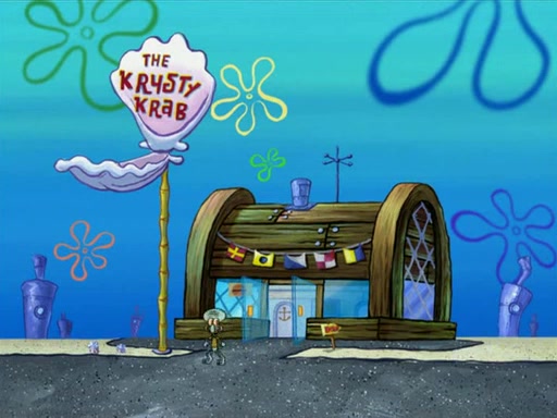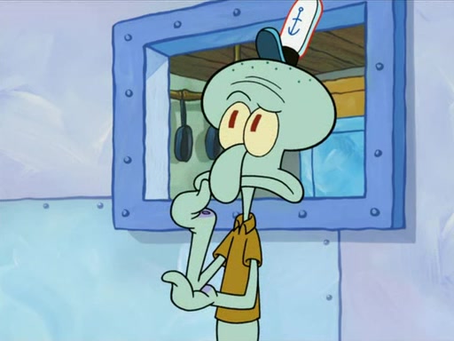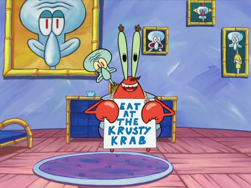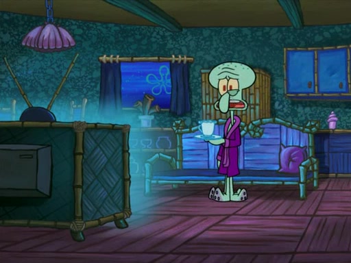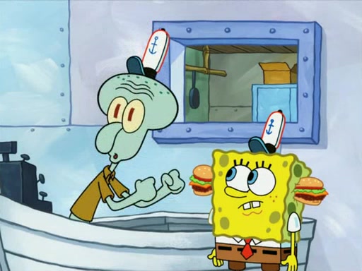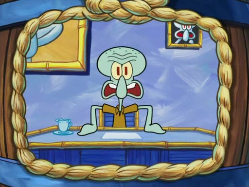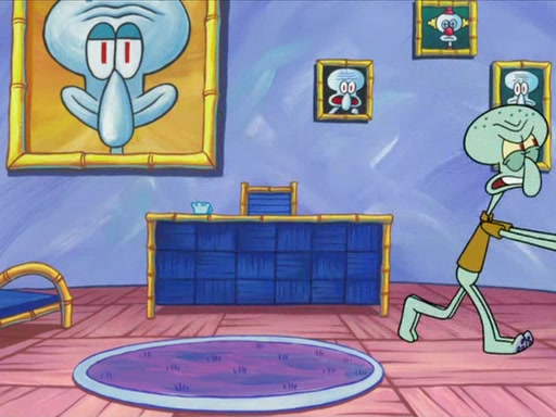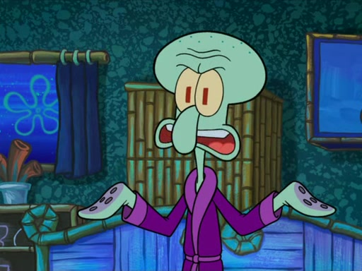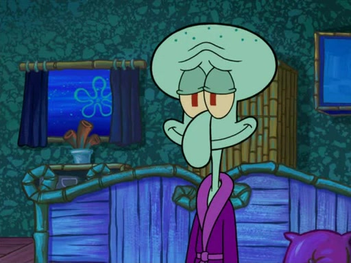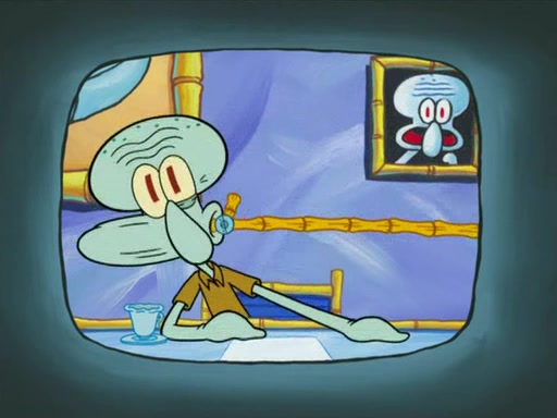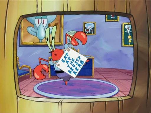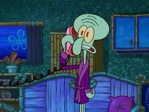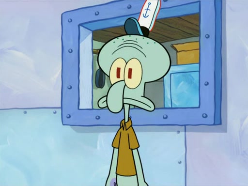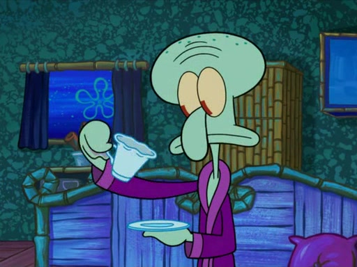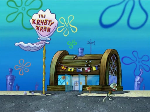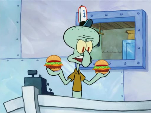 He is next seen at the Krusty Krab waiting happily to leave and get started on his show. SpongeBob overhears him talking and asks why he is so jittery. But Squidward plugs up his ears with Krabby Patties and leaves before SpongeBob can ask.