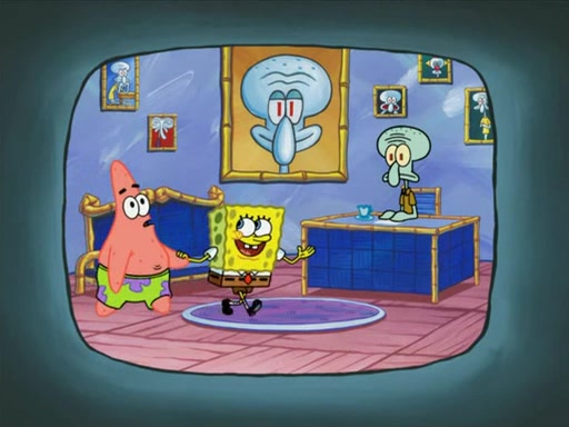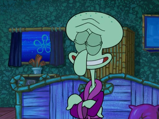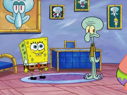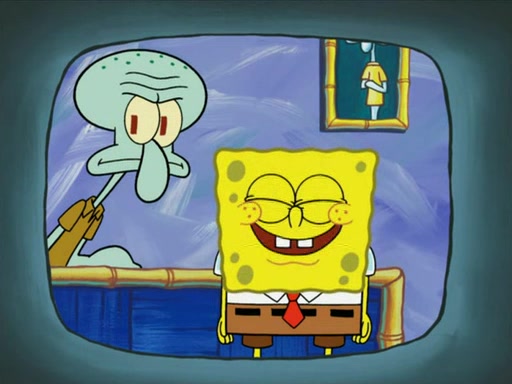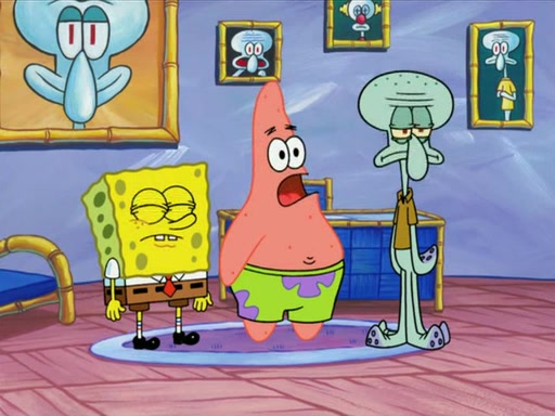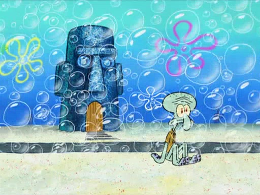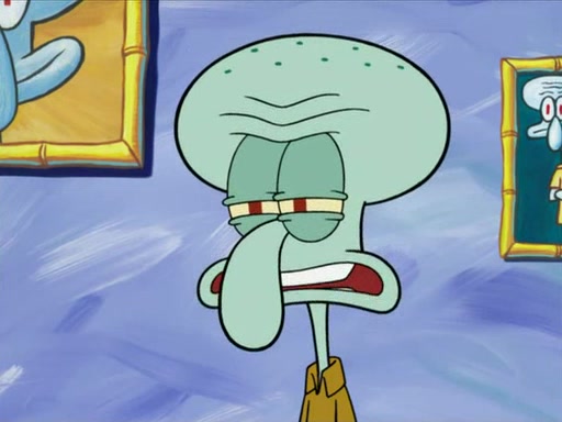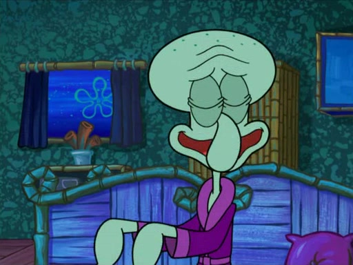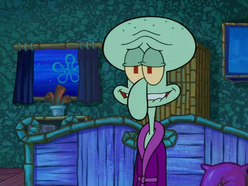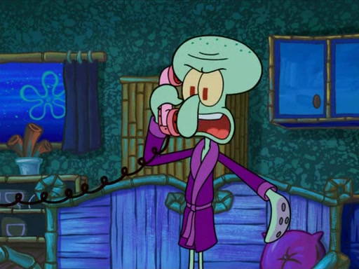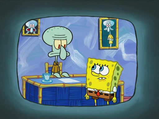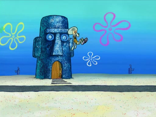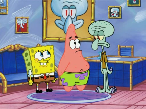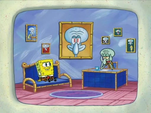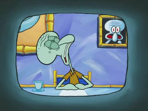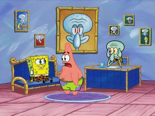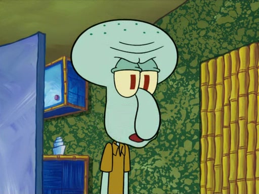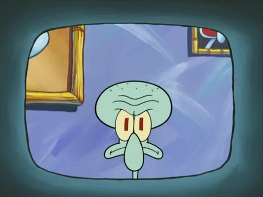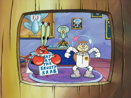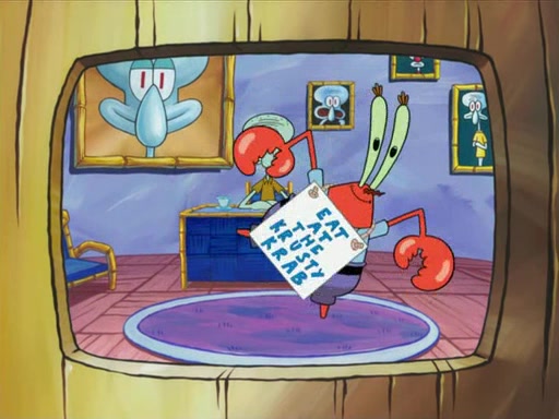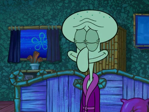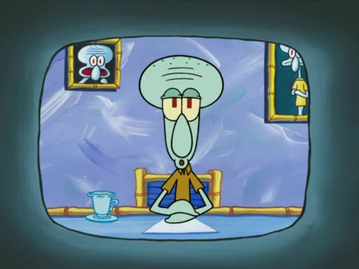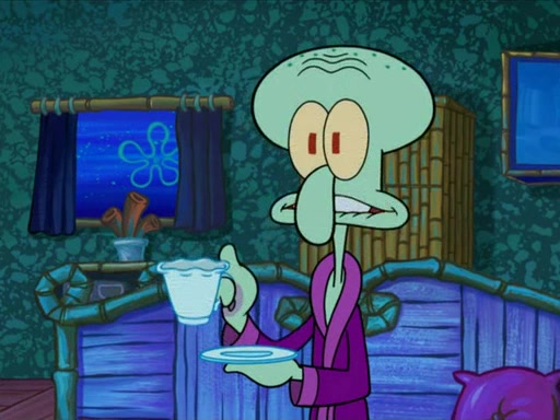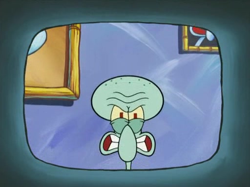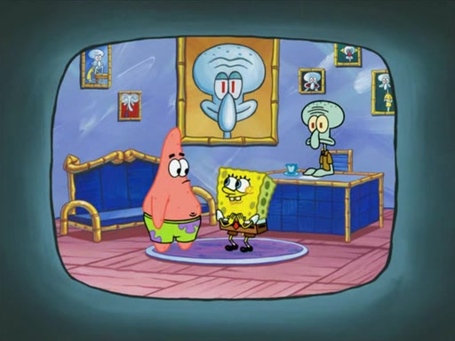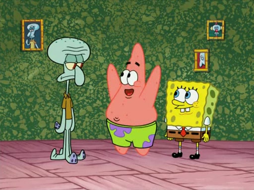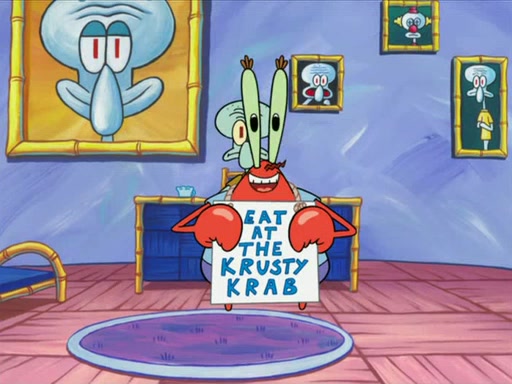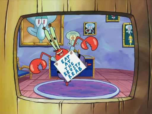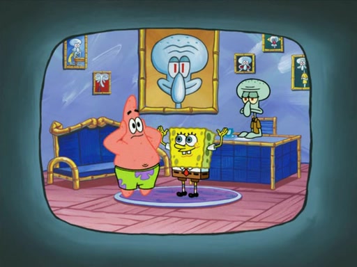 He is next seen at the Krusty Krab waiting happily to leave and get started on his show. SpongeBob overhears him talking and asks why he is so jittery. But Squidward plugs up his ears with Krabby Patties and leaves before SpongeBob can ask.