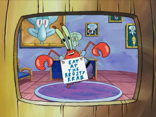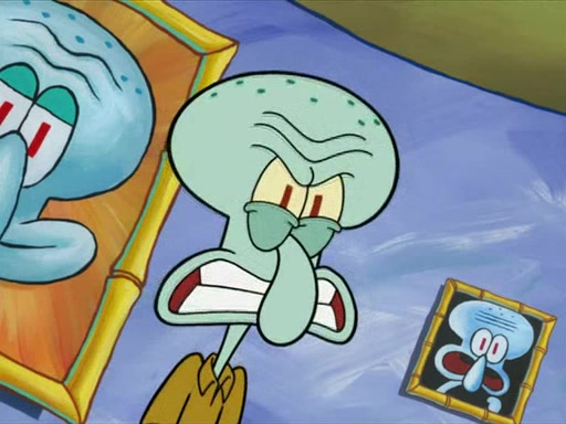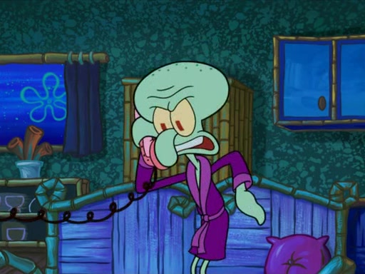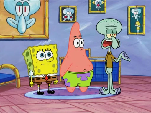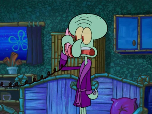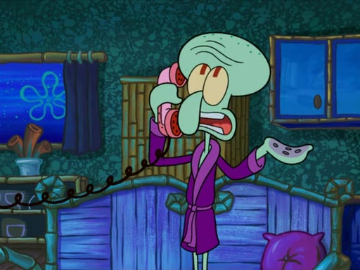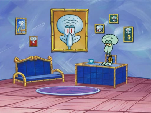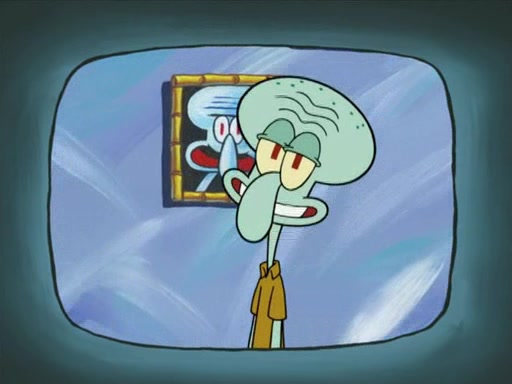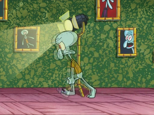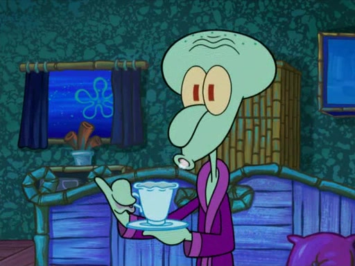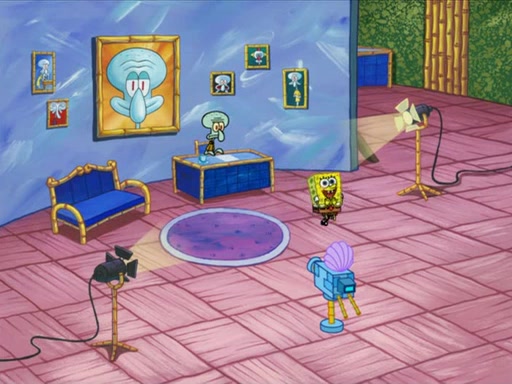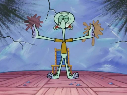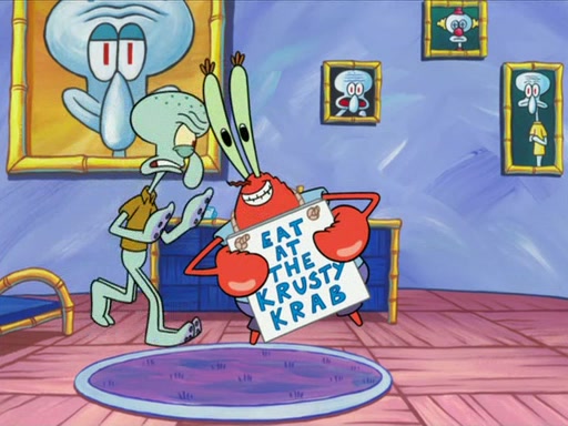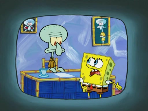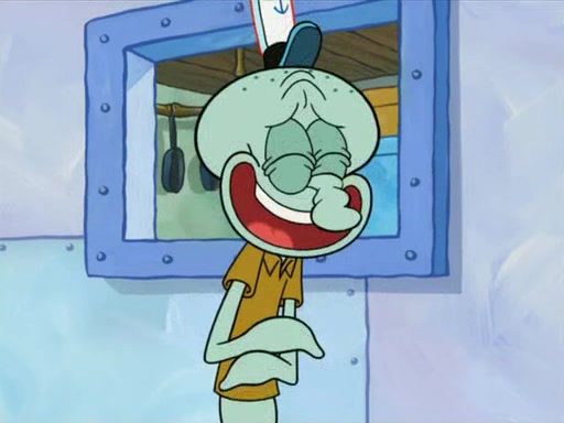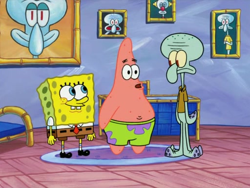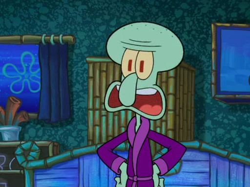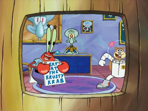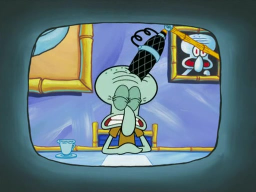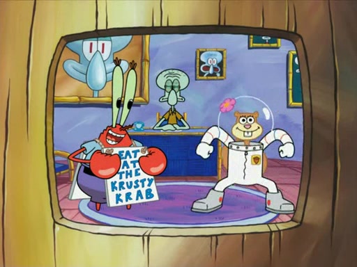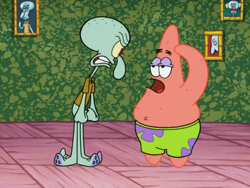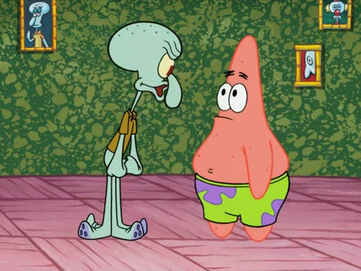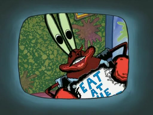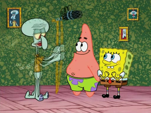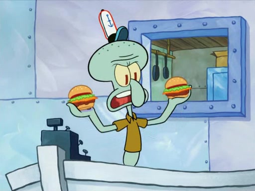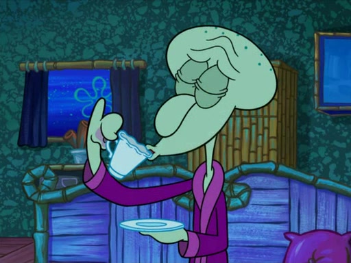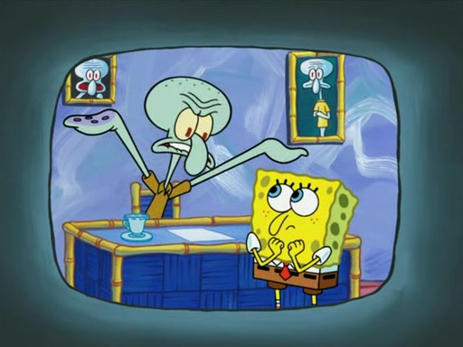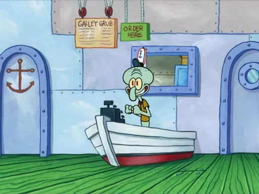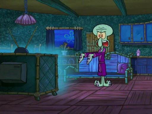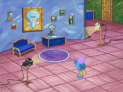 He is next seen at the Krusty Krab waiting happily to leave and get started on his show. SpongeBob overhears him talking and asks why he is so jittery. But Squidward plugs up his ears with Krabby Patties and leaves before SpongeBob can ask.
