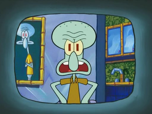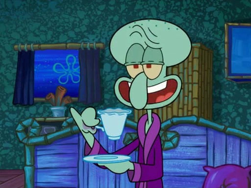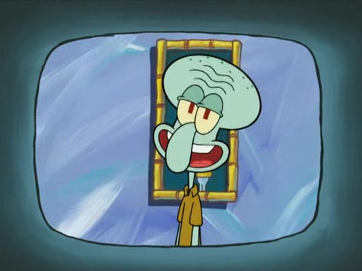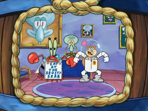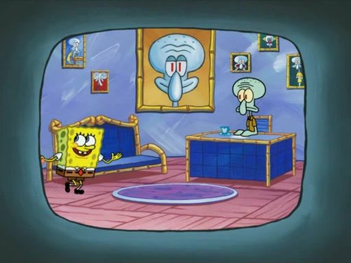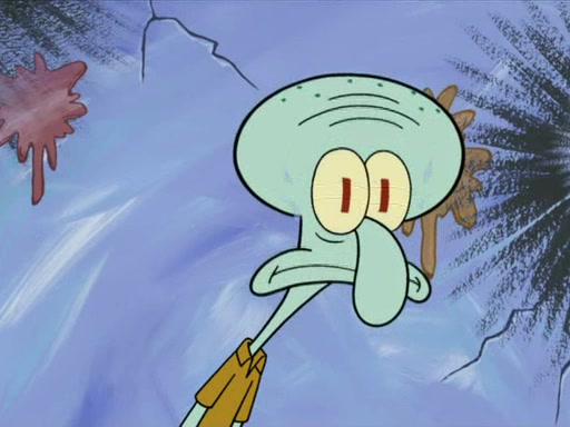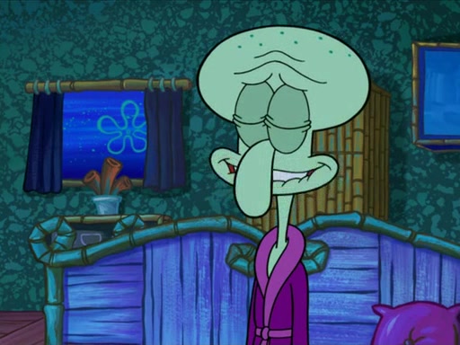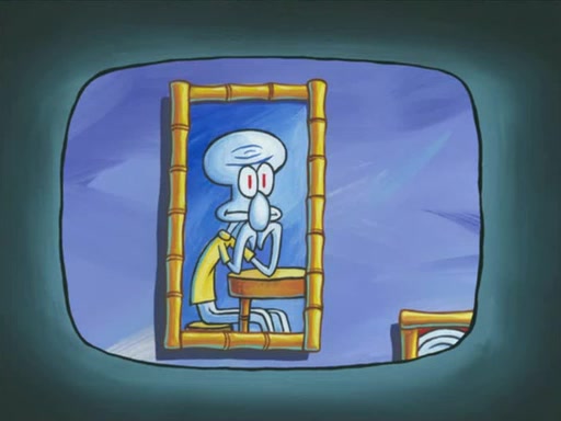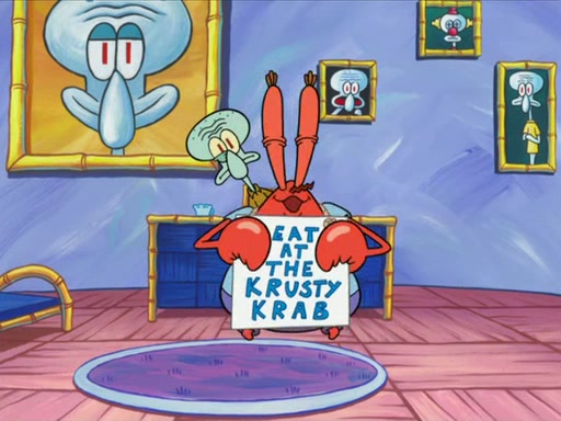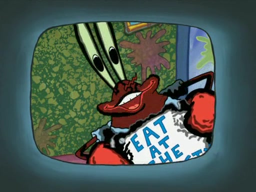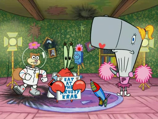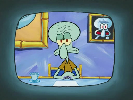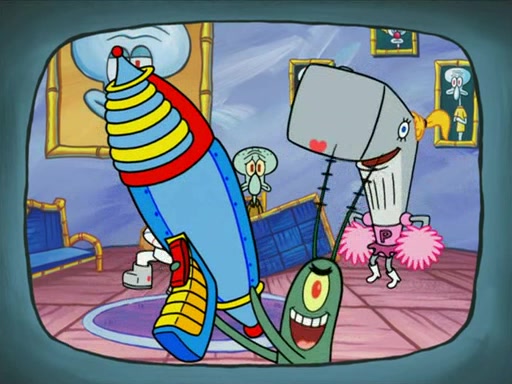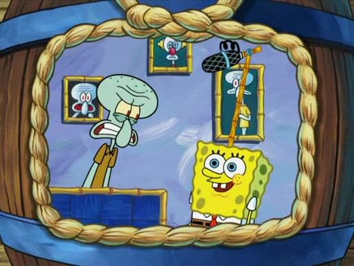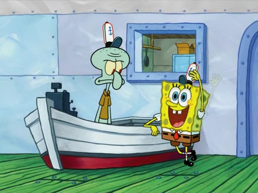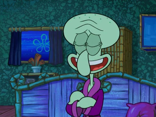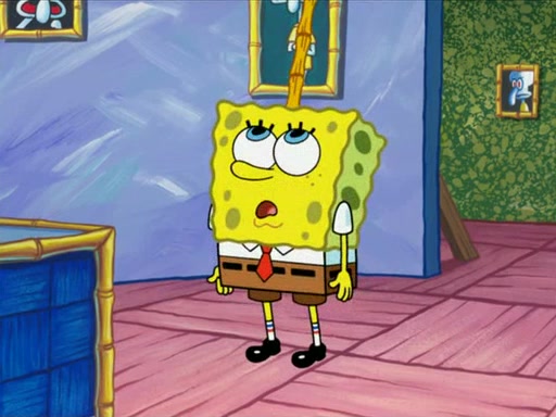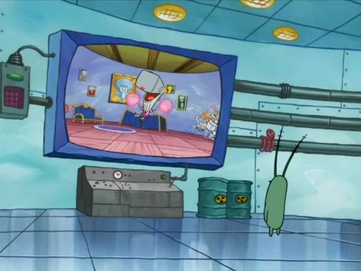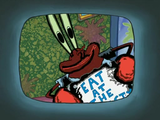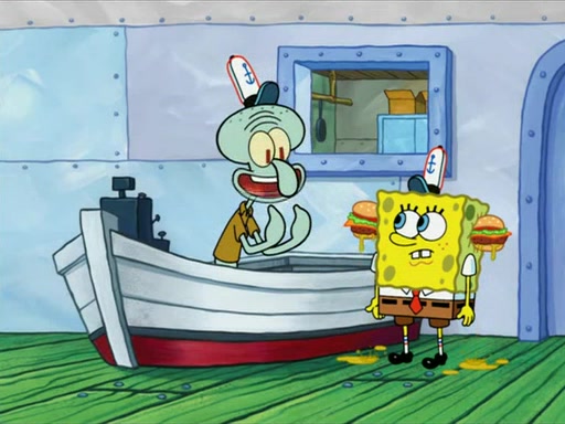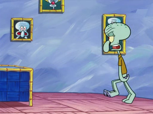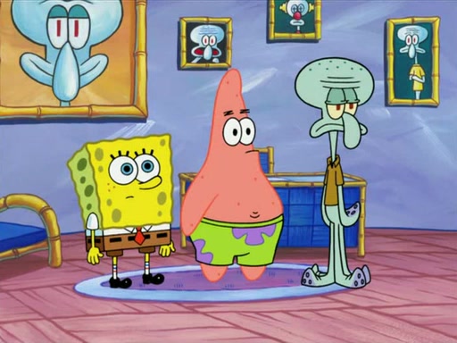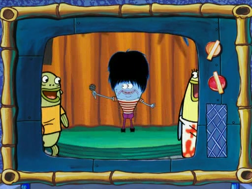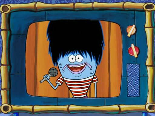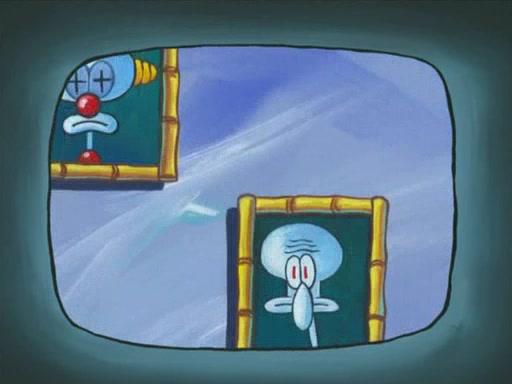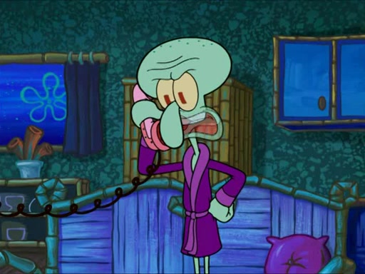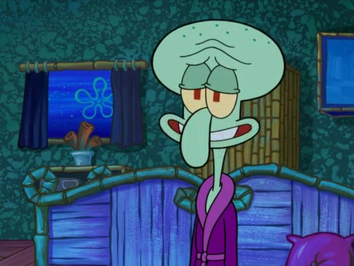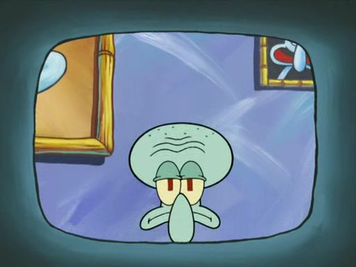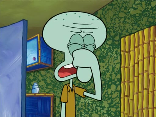 He is next seen at the Krusty Krab waiting happily to leave and get started on his show. SpongeBob overhears him talking and asks why he is so jittery. But Squidward plugs up his ears with Krabby Patties and leaves before SpongeBob can ask.