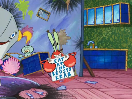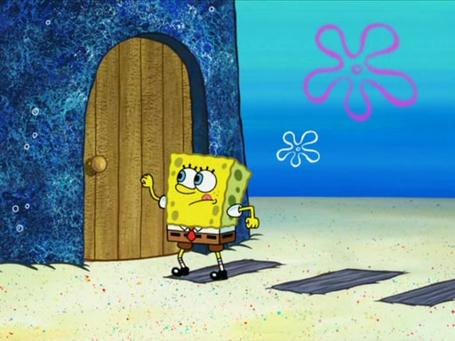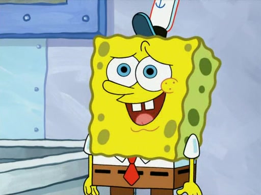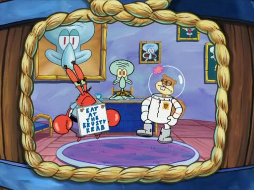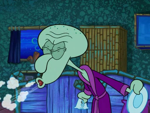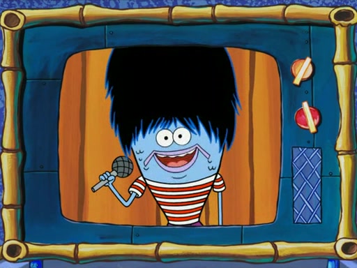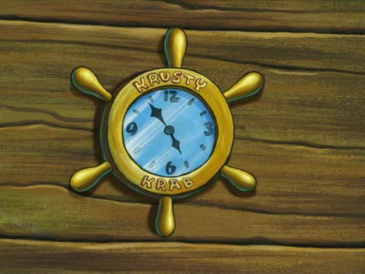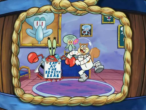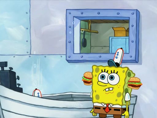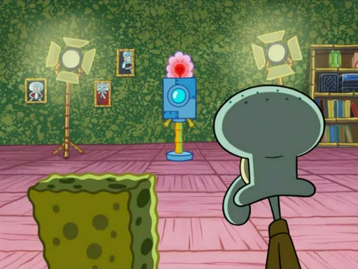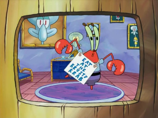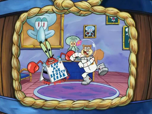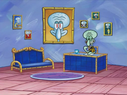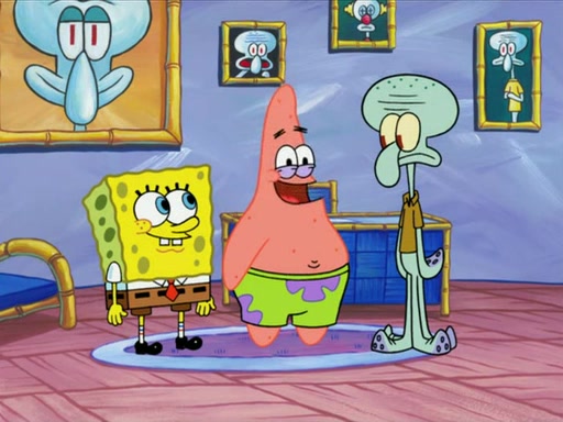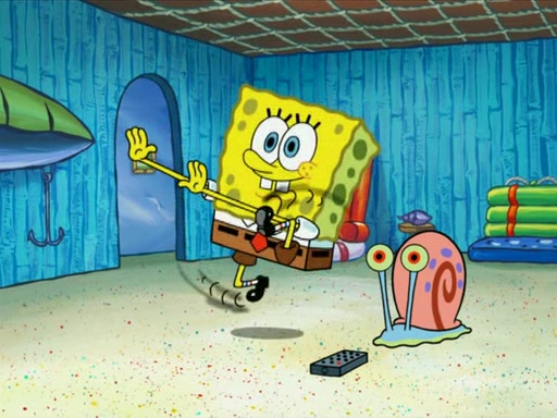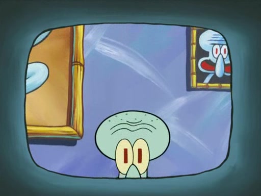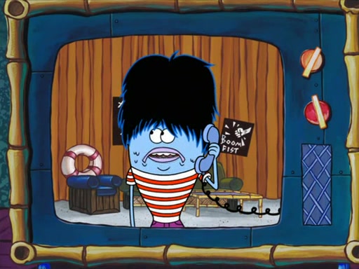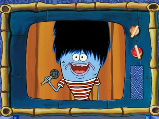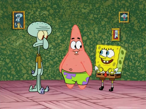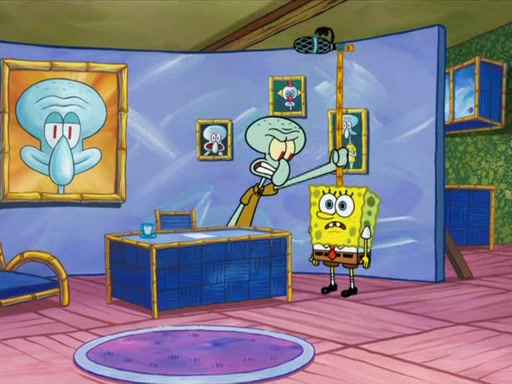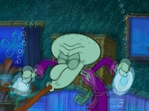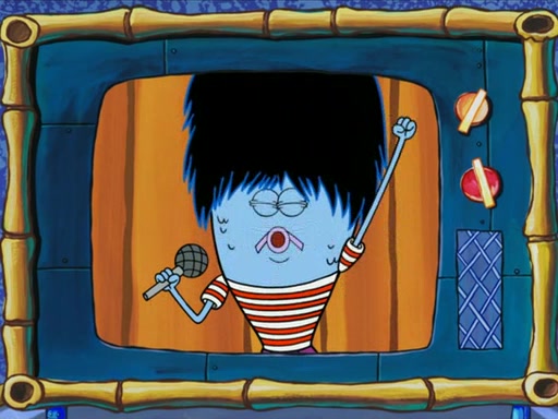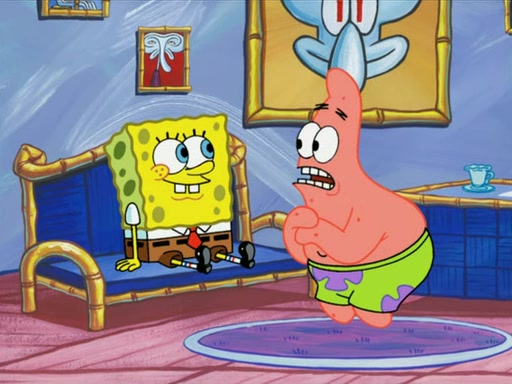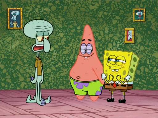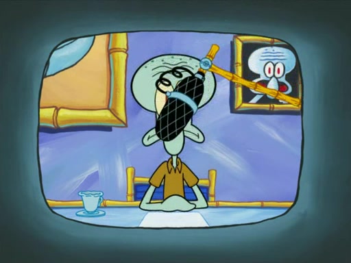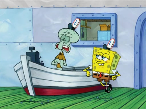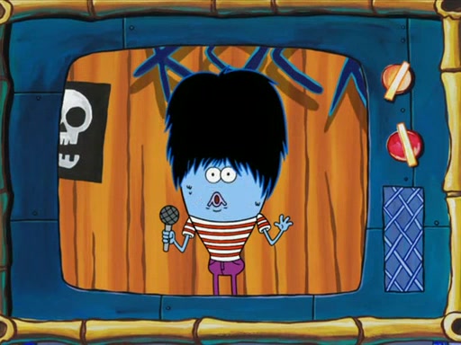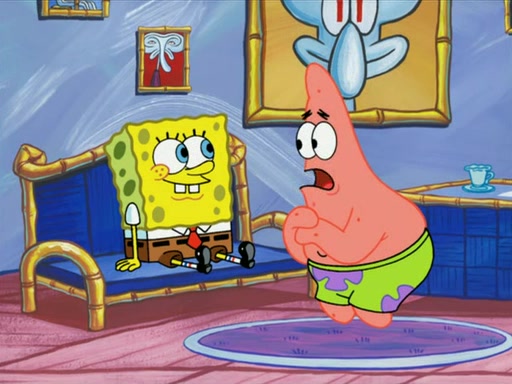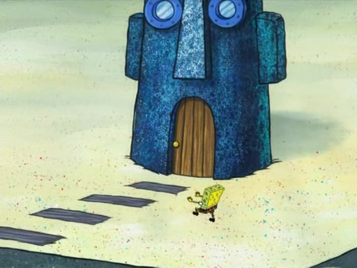 He is next seen at the Krusty Krab waiting happily to leave and get started on his show. SpongeBob overhears him talking and asks why he is so jittery. But Squidward plugs up his ears with Krabby Patties and leaves before SpongeBob can ask.