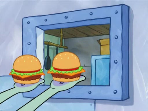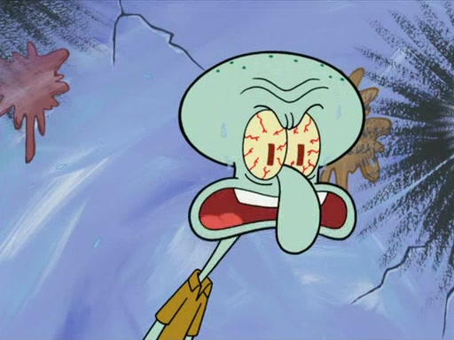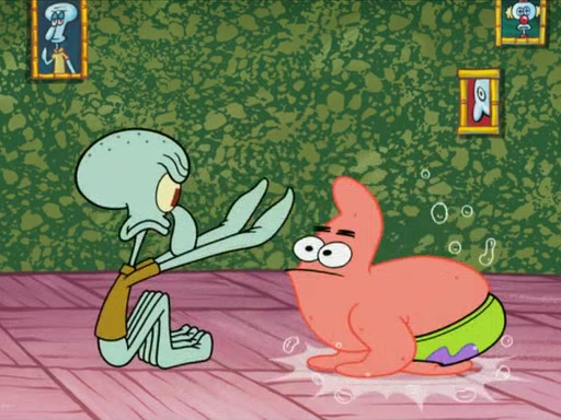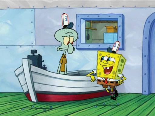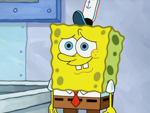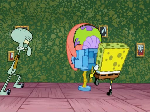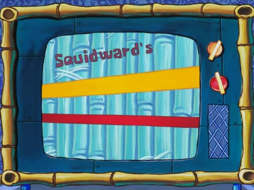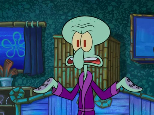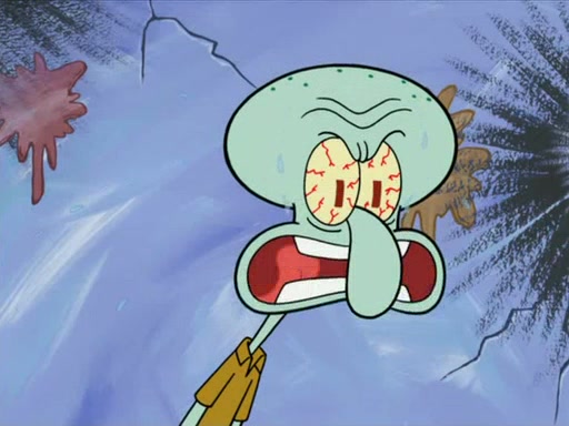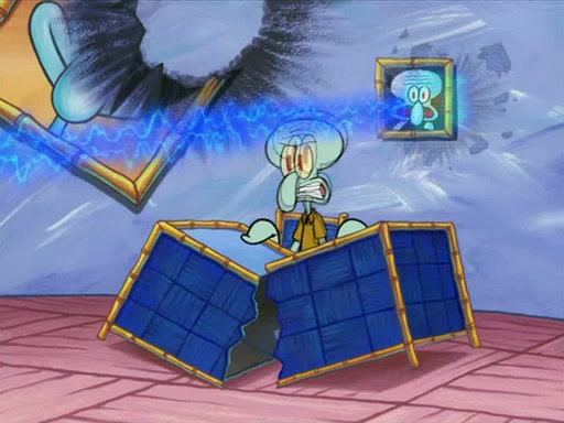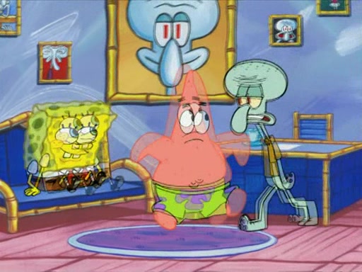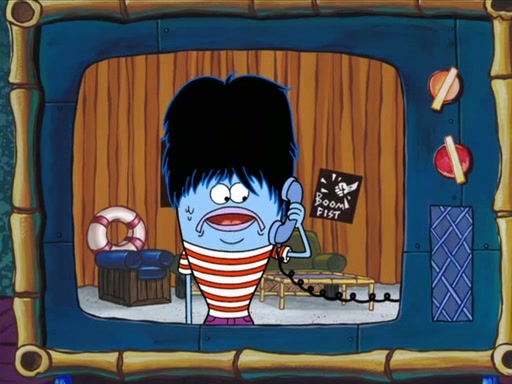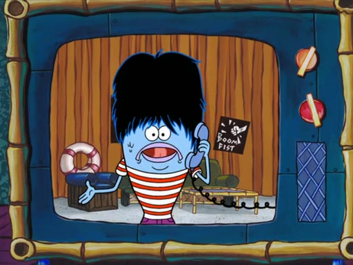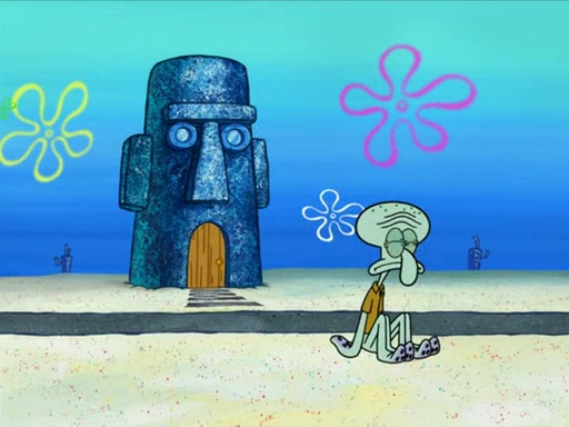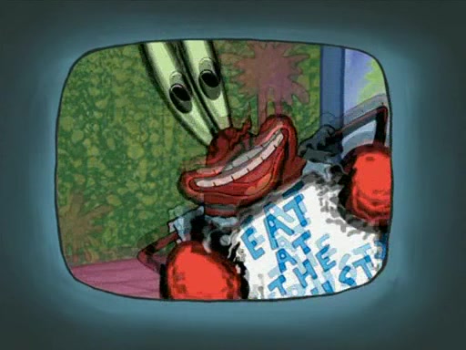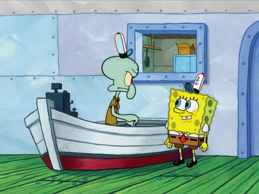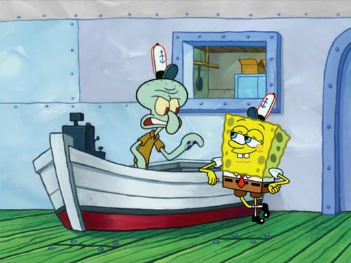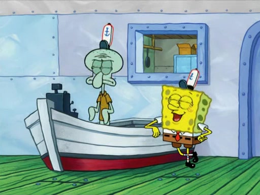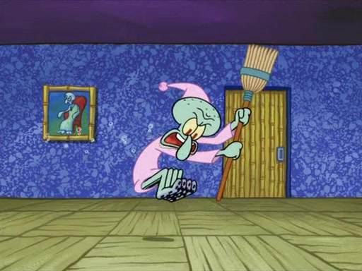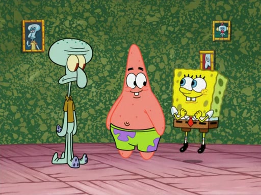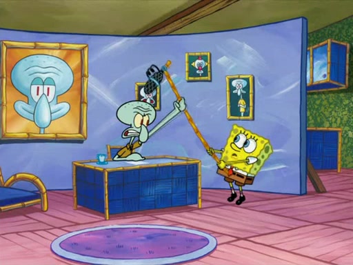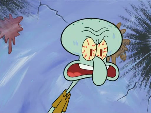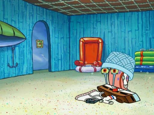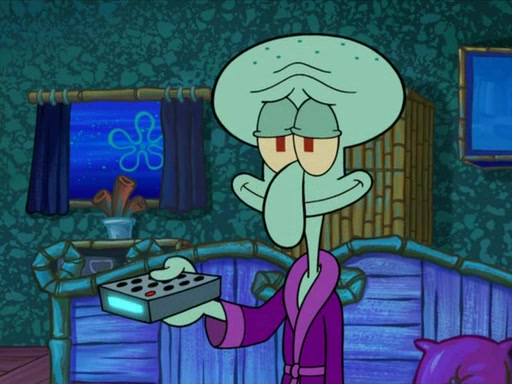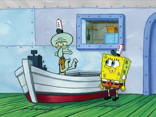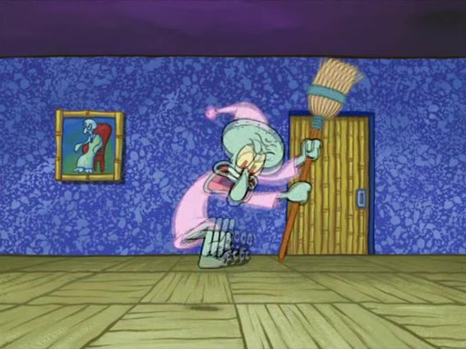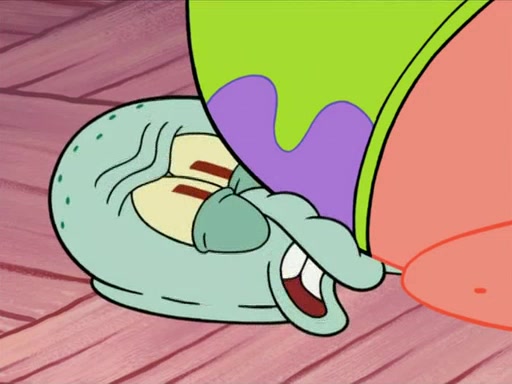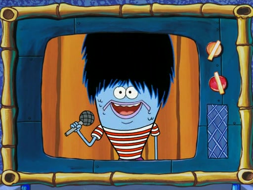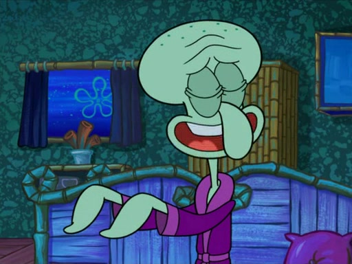 He is next seen at the Krusty Krab waiting happily to leave and get started on his show. SpongeBob overhears him talking and asks why he is so jittery. But Squidward plugs up his ears with Krabby Patties and leaves before SpongeBob can ask.