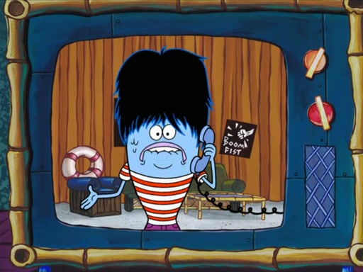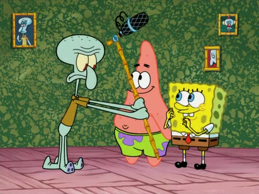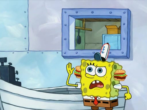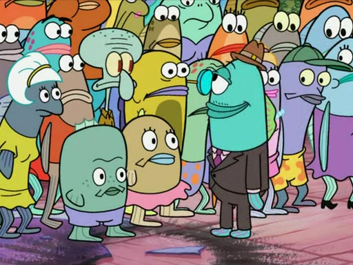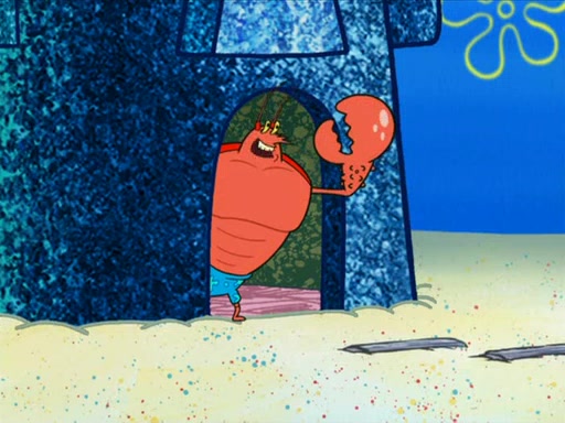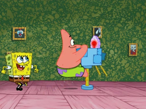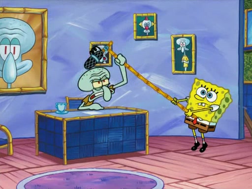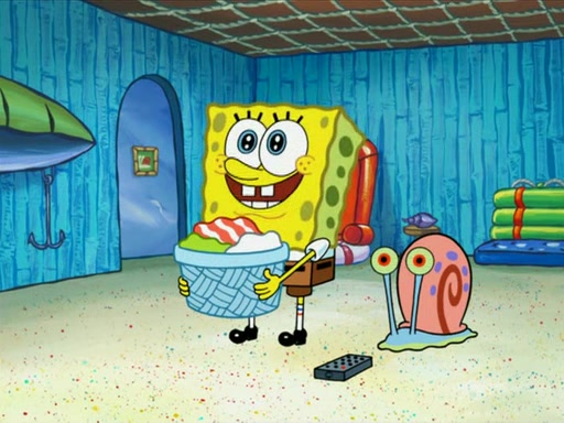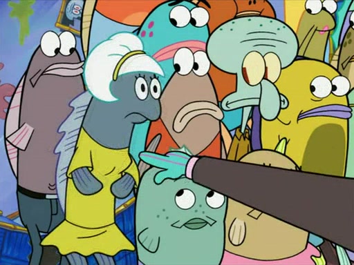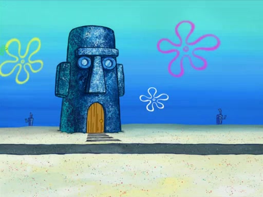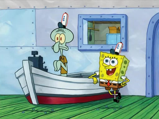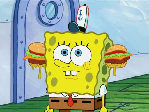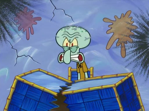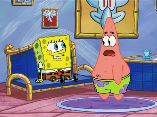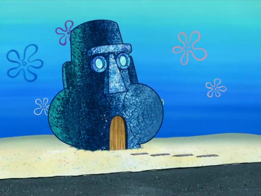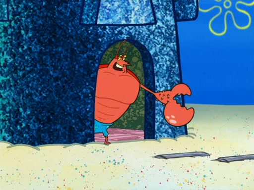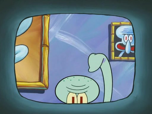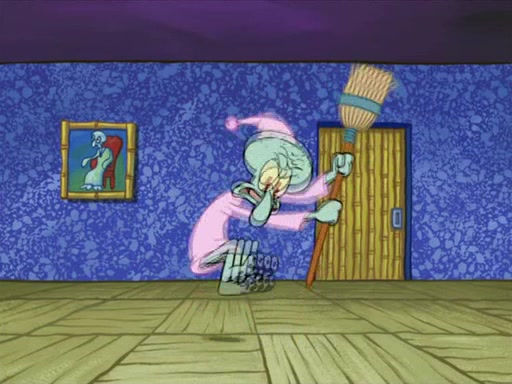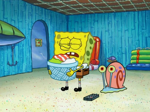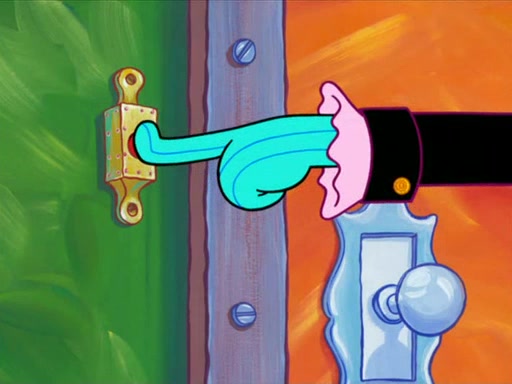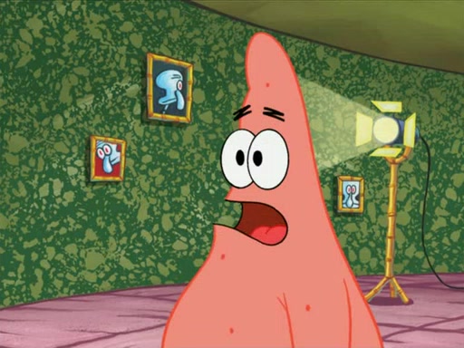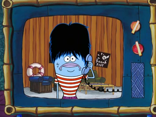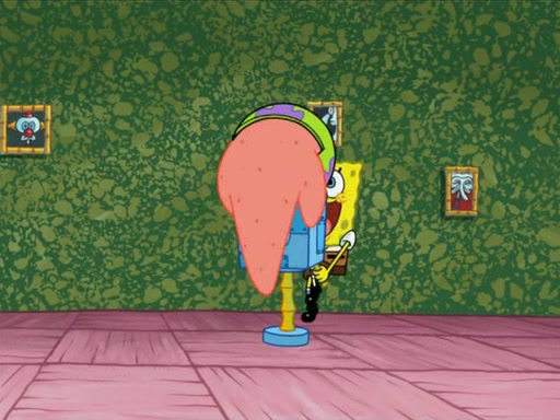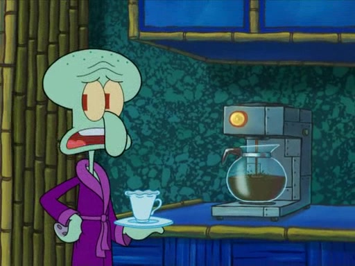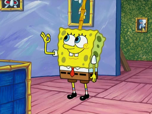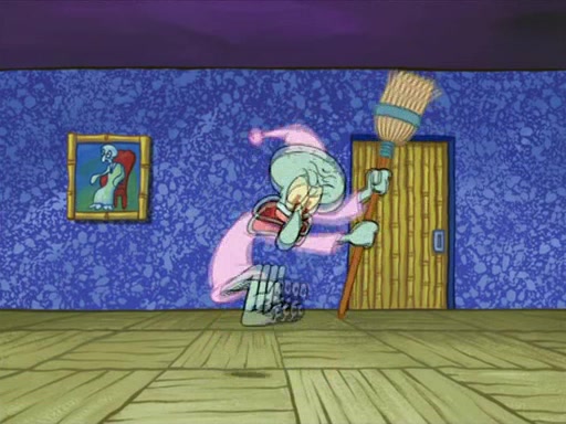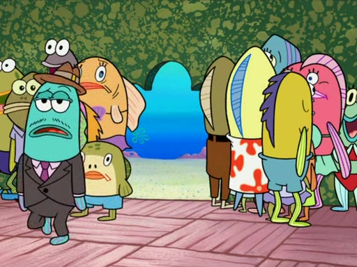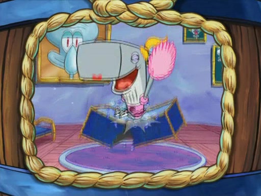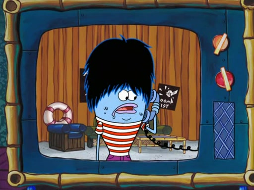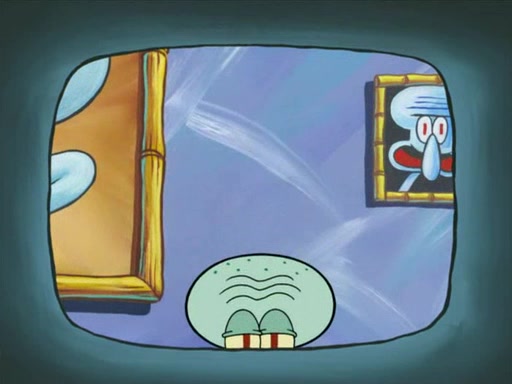 He is next seen at the Krusty Krab waiting happily to leave and get started on his show. SpongeBob overhears him talking and asks why he is so jittery. But Squidward plugs up his ears with Krabby Patties and leaves before SpongeBob can ask.
