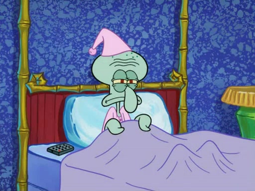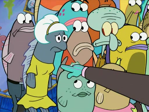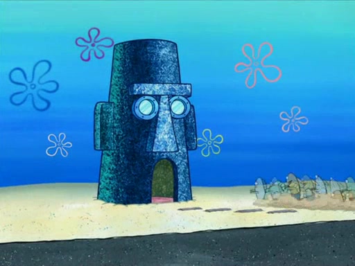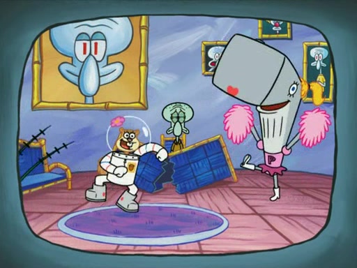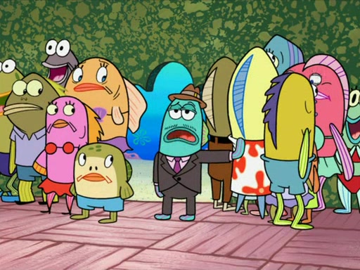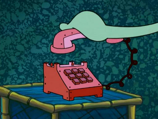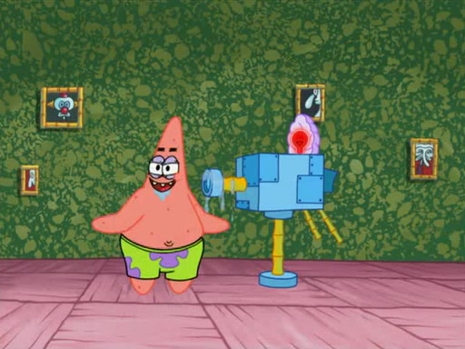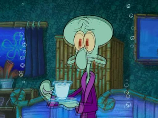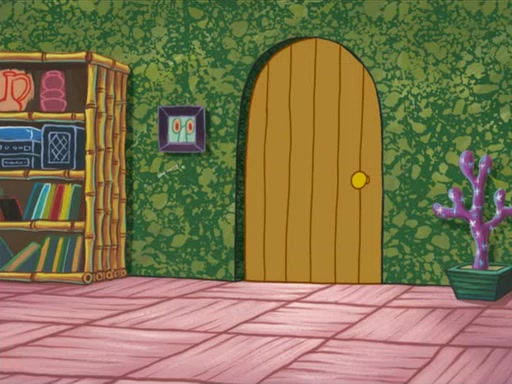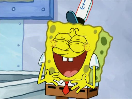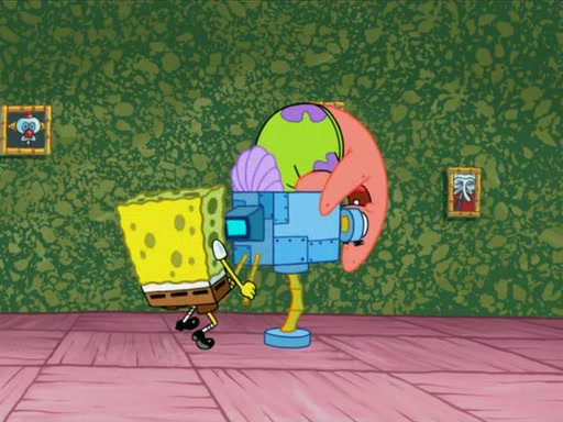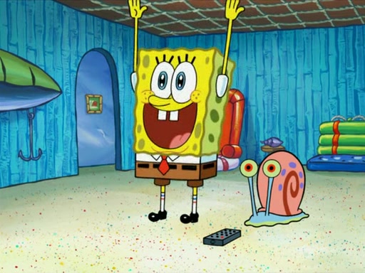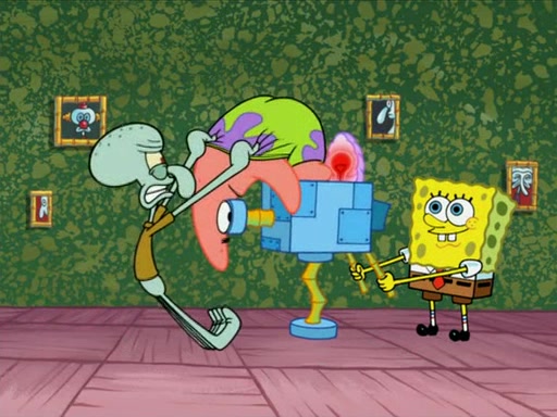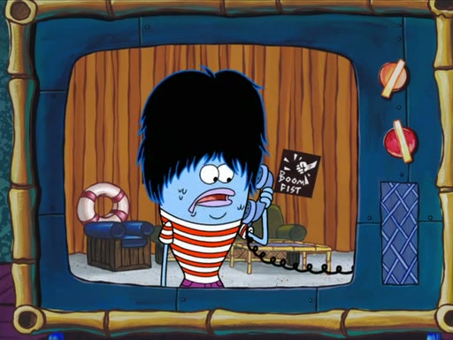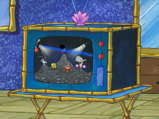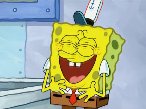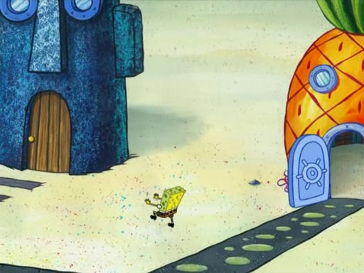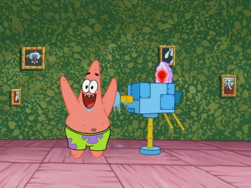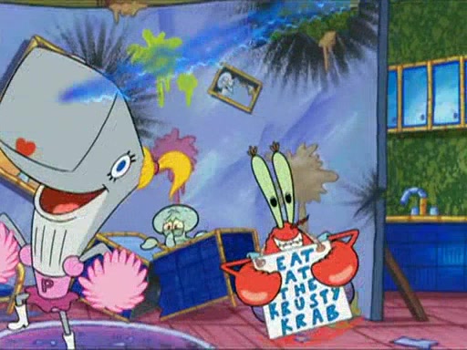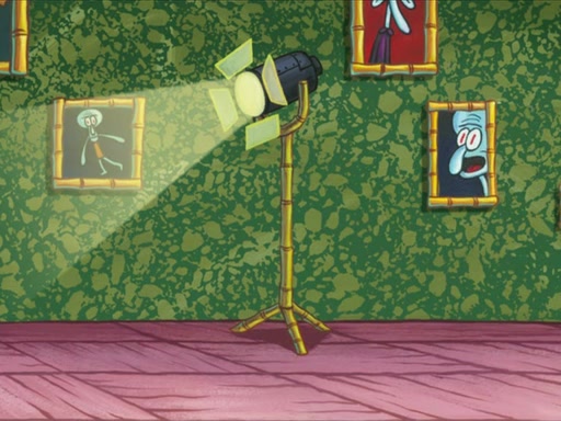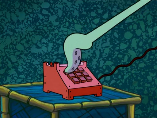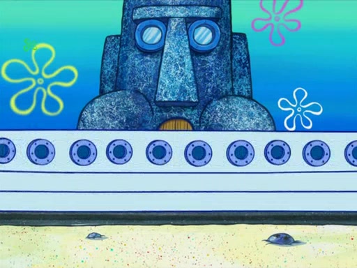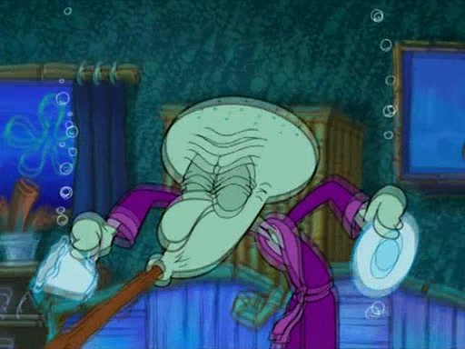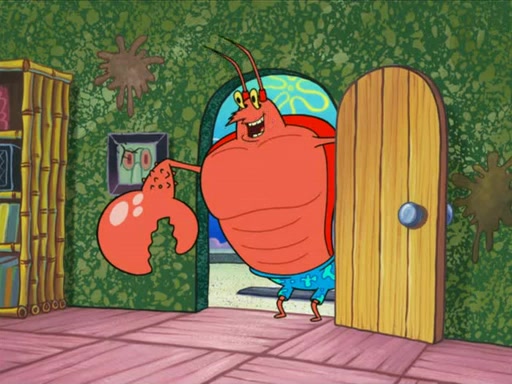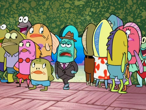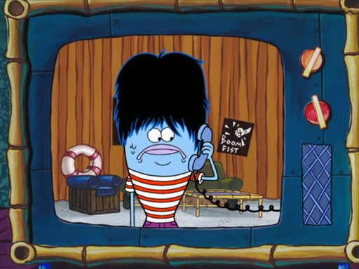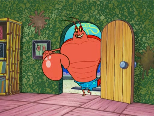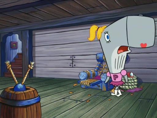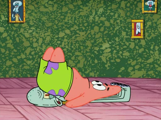 He is next seen at the Krusty Krab waiting happily to leave and get started on his show. SpongeBob overhears him talking and asks why he is so jittery. But Squidward plugs up his ears with Krabby Patties and leaves before SpongeBob can ask.