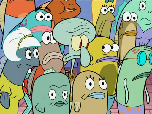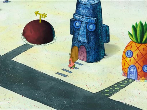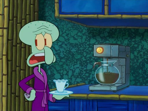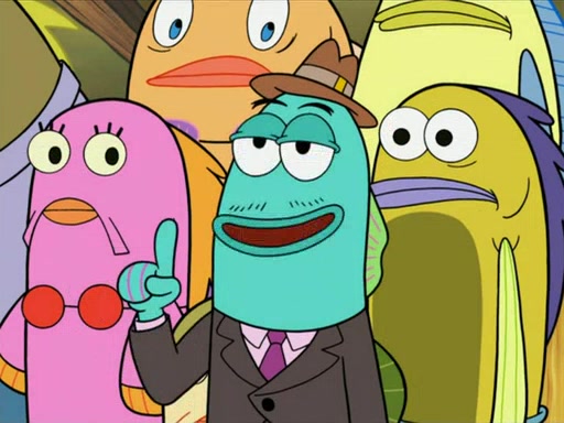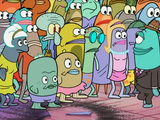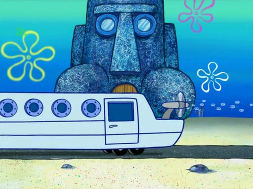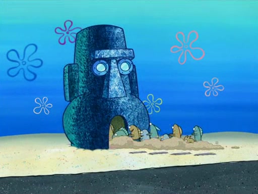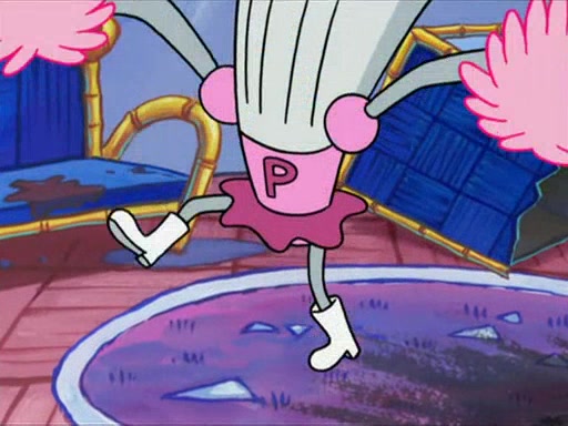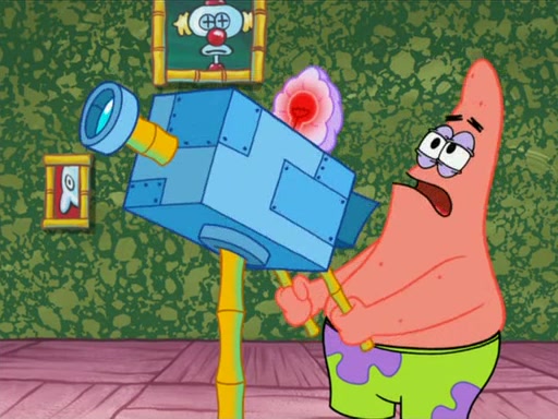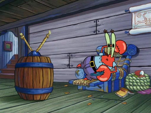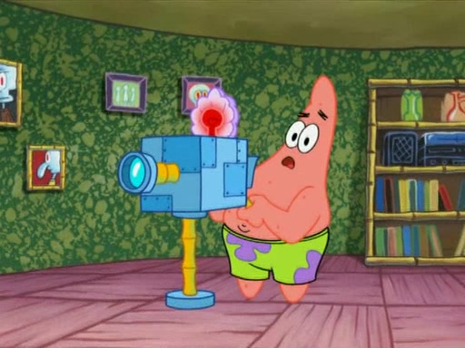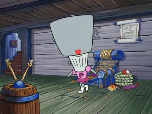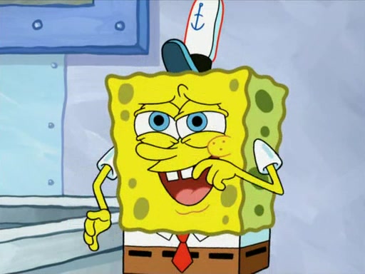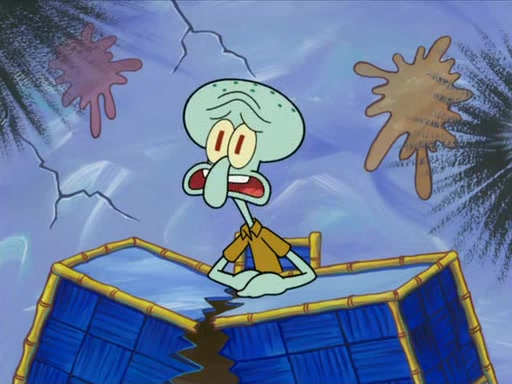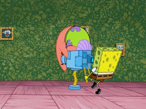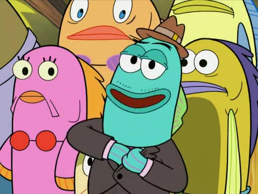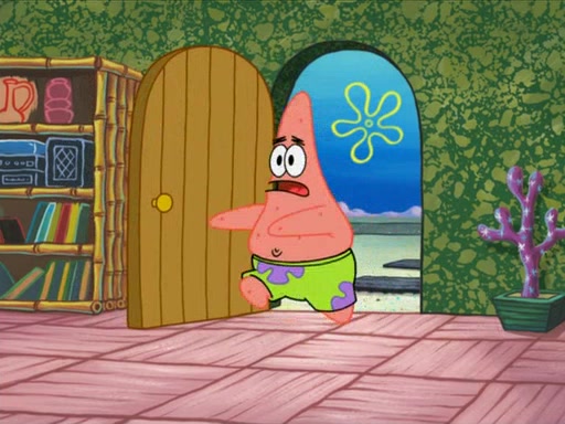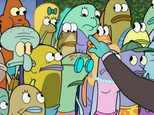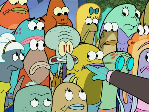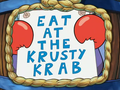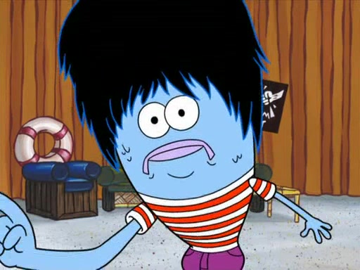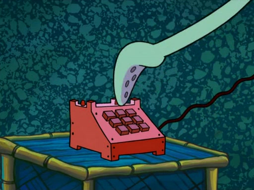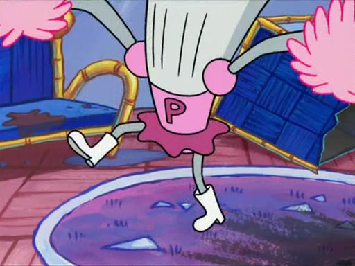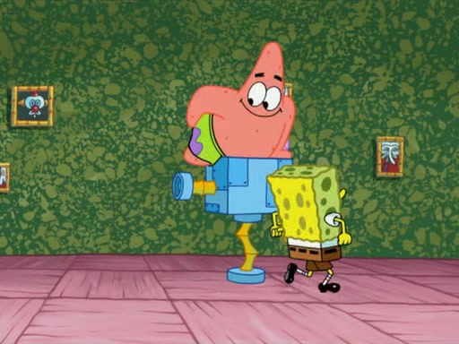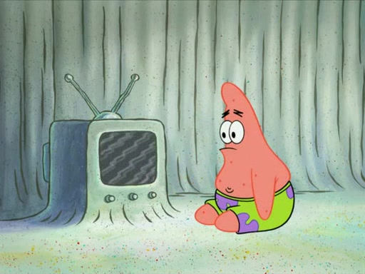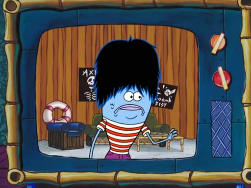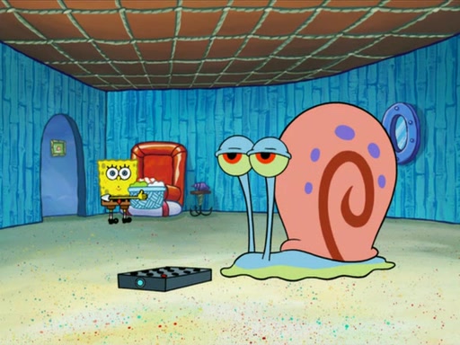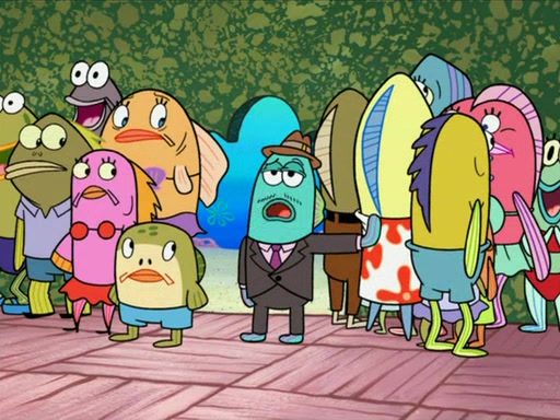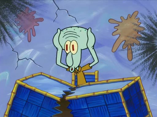 He is next seen at the Krusty Krab waiting happily to leave and get started on his show. SpongeBob overhears him talking and asks why he is so jittery. But Squidward plugs up his ears with Krabby Patties and leaves before SpongeBob can ask.
