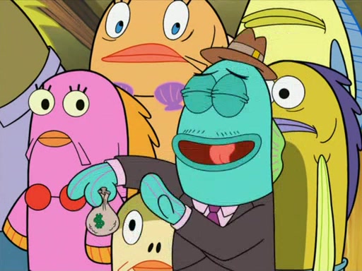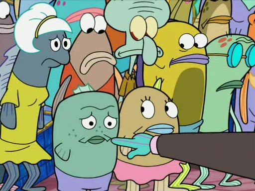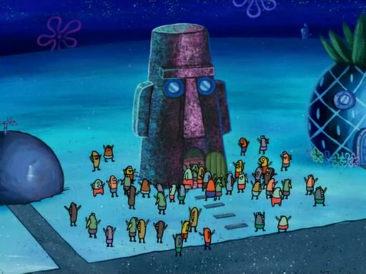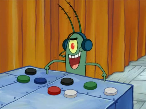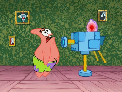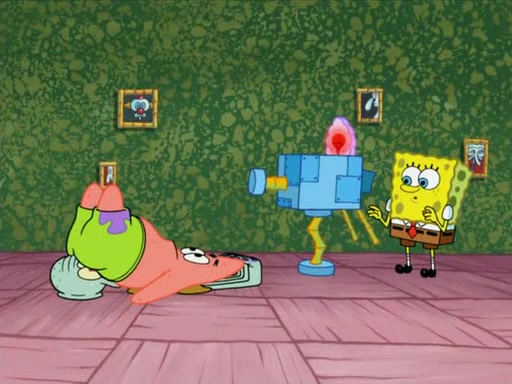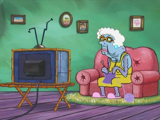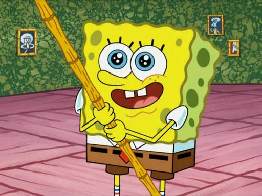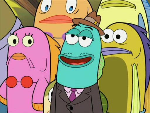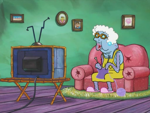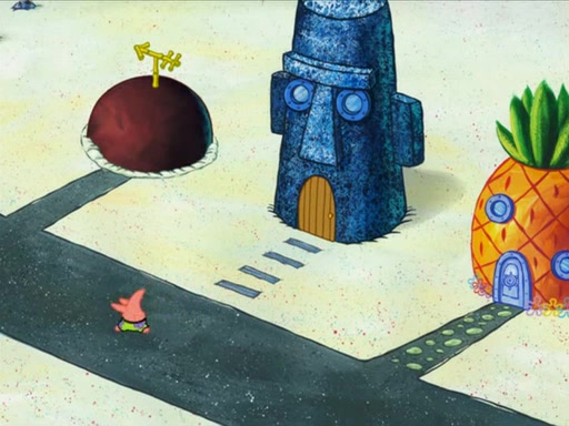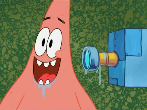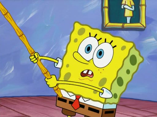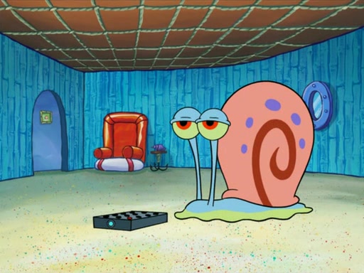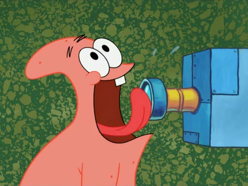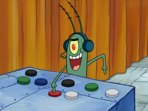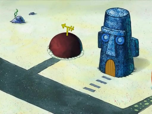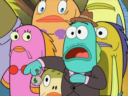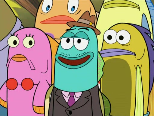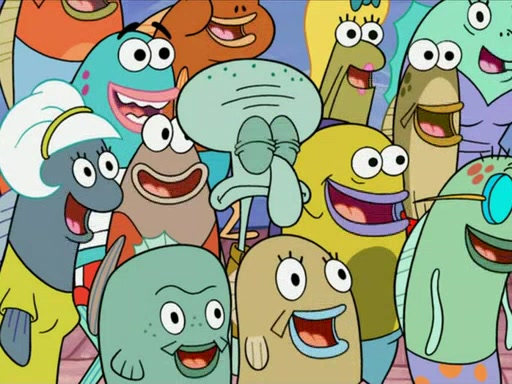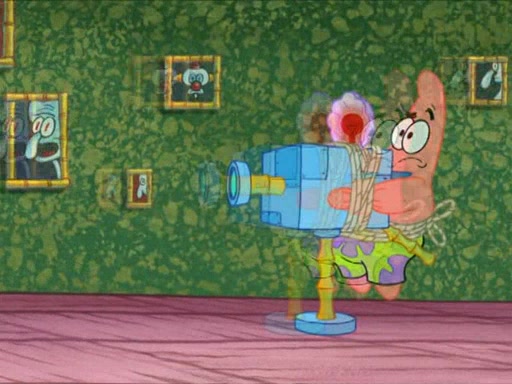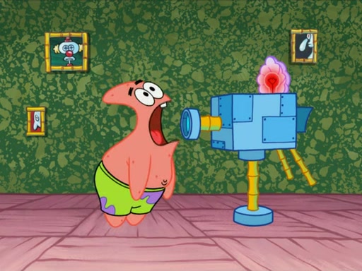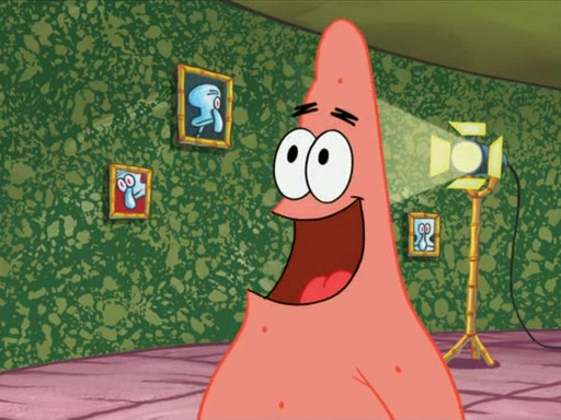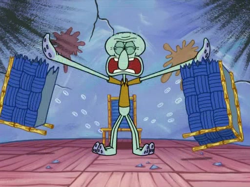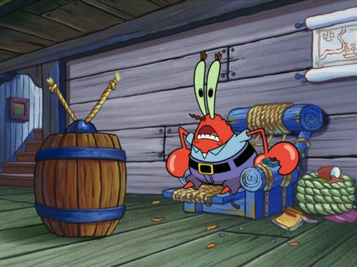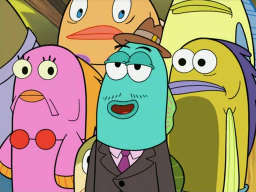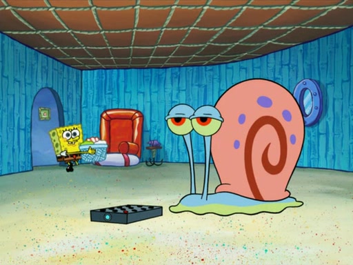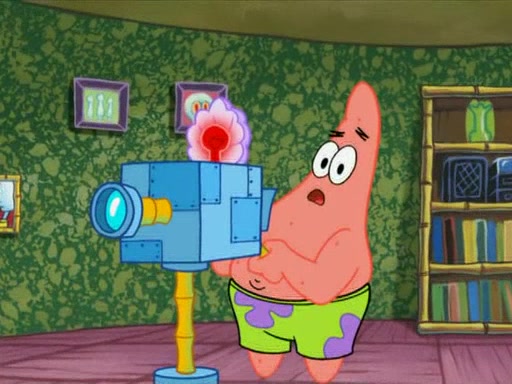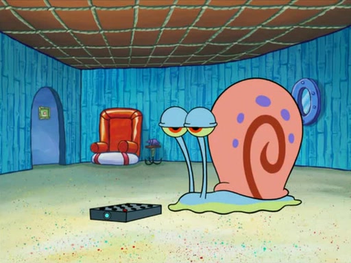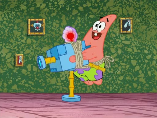 He is next seen at the Krusty Krab waiting happily to leave and get started on his show. SpongeBob overhears him talking and asks why he is so jittery. But Squidward plugs up his ears with Krabby Patties and leaves before SpongeBob can ask.