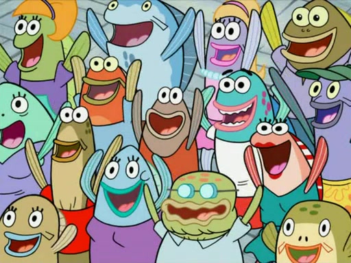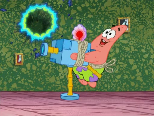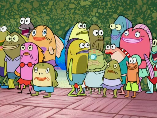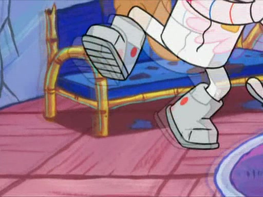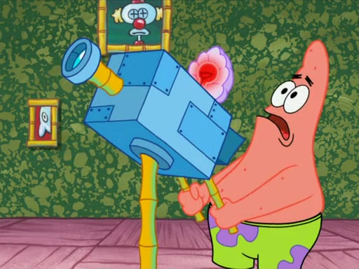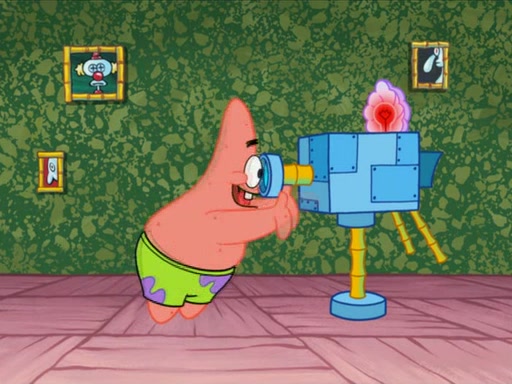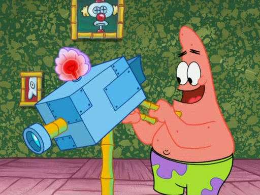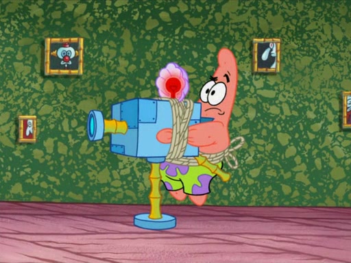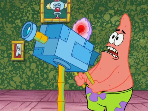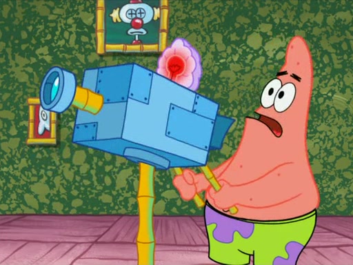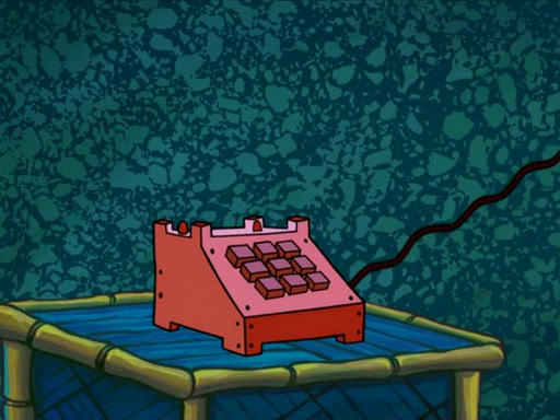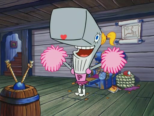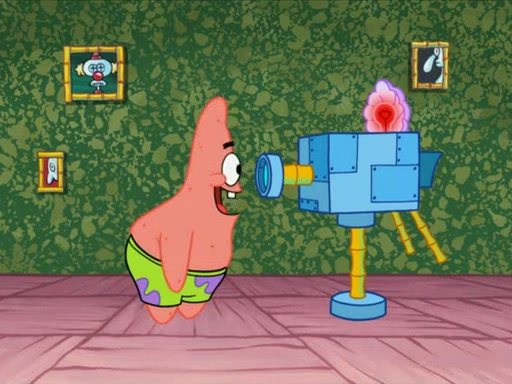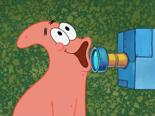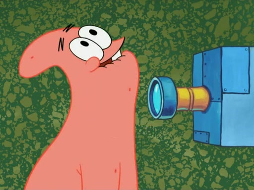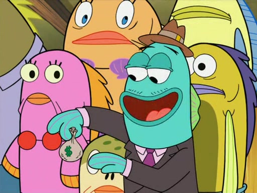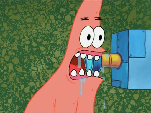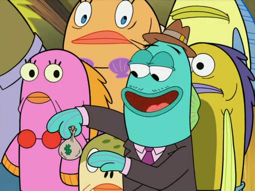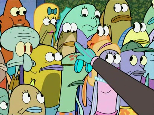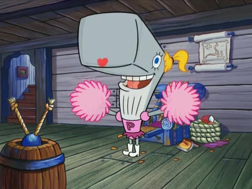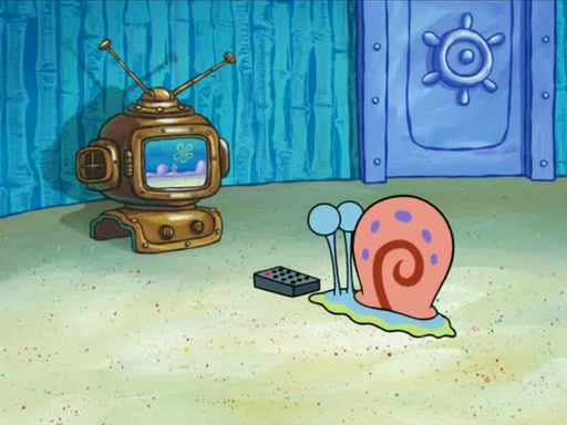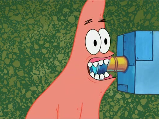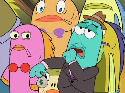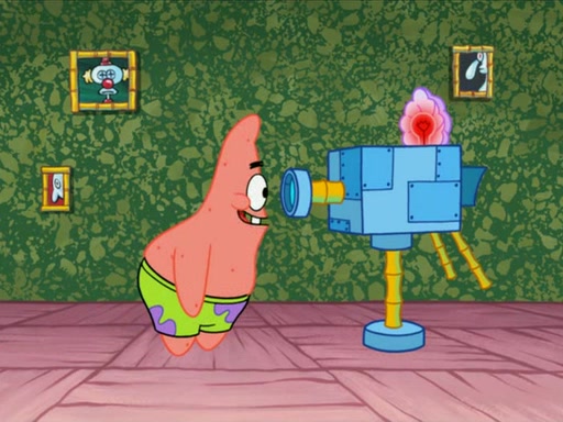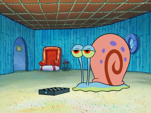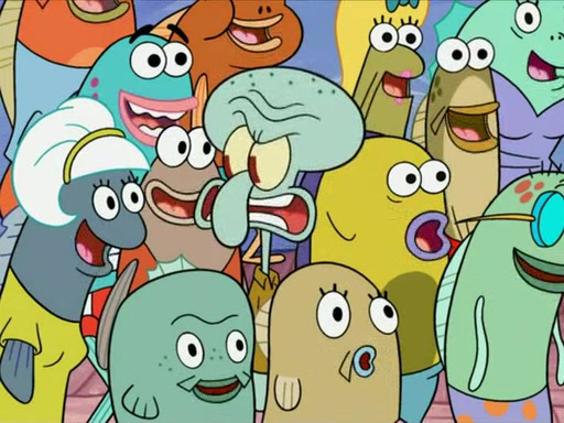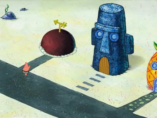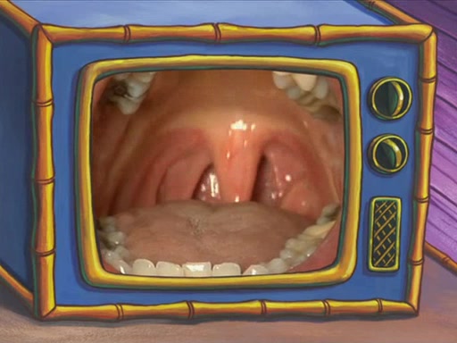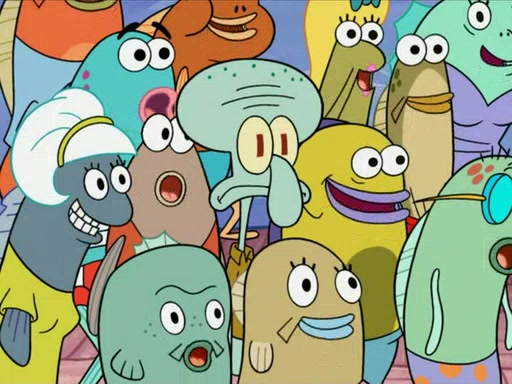 He is next seen at the Krusty Krab waiting happily to leave and get started on his show. SpongeBob overhears him talking and asks why he is so jittery. But Squidward plugs up his ears with Krabby Patties and leaves before SpongeBob can ask.