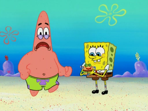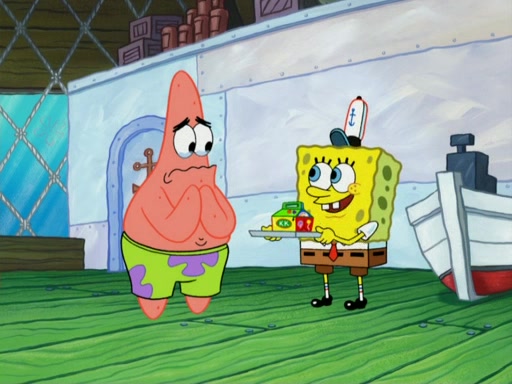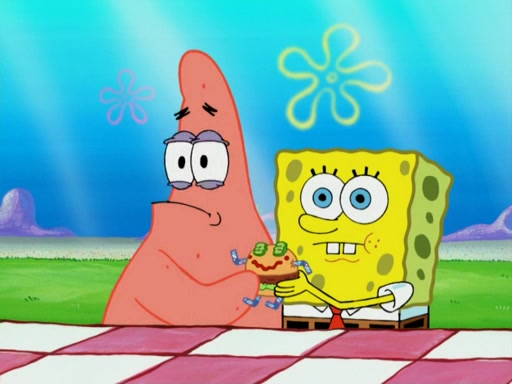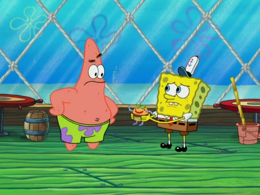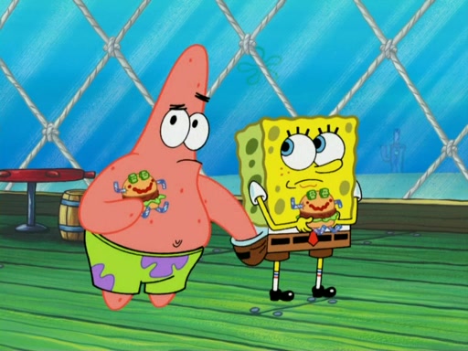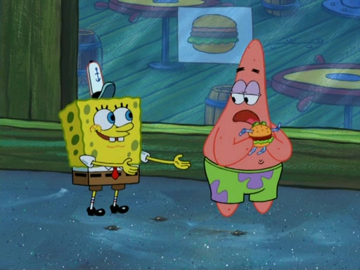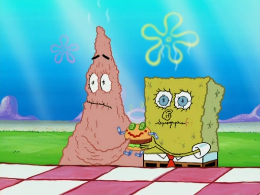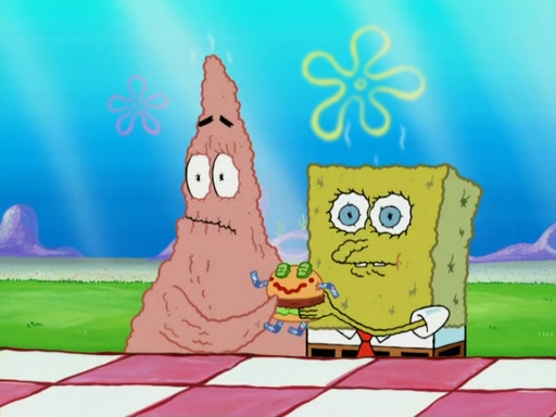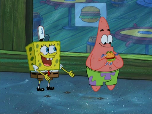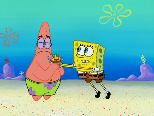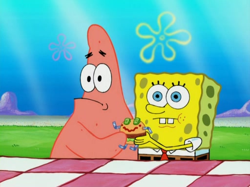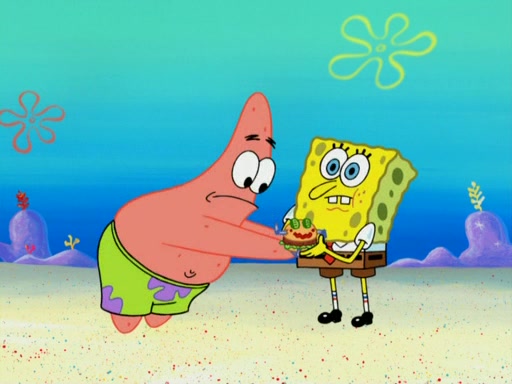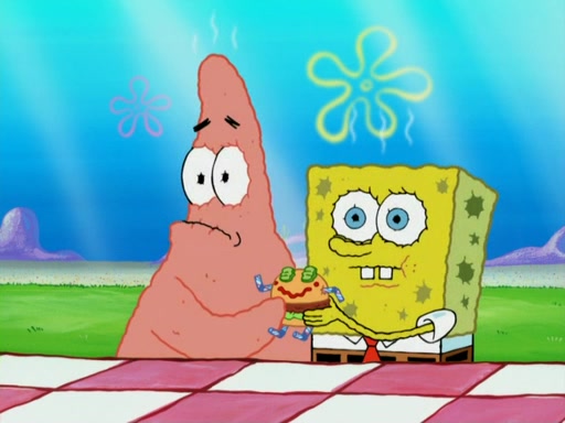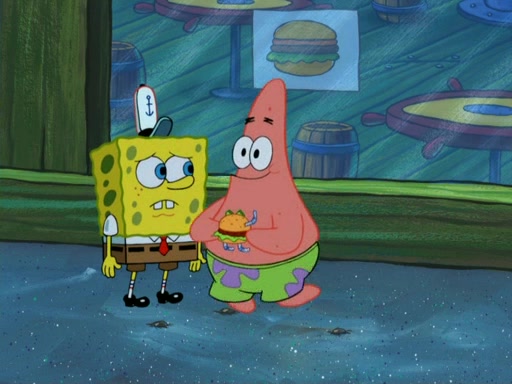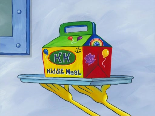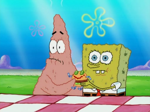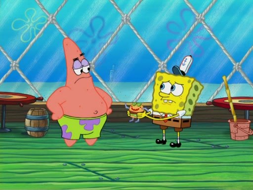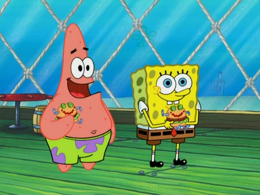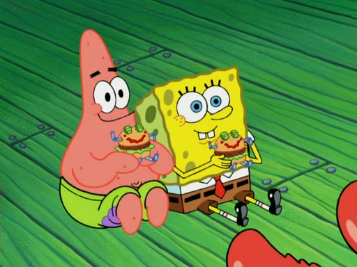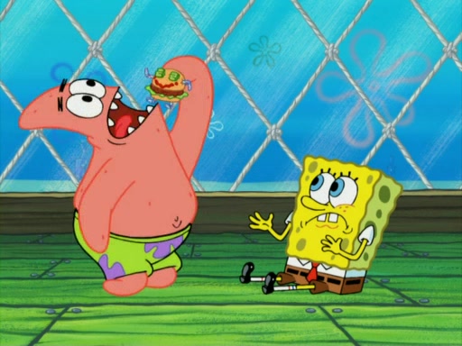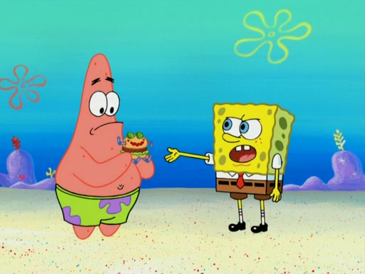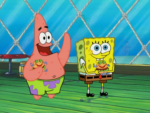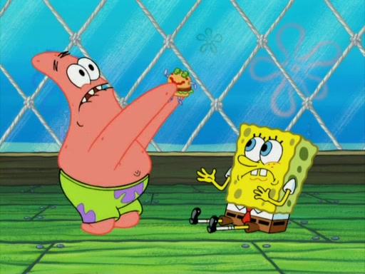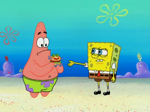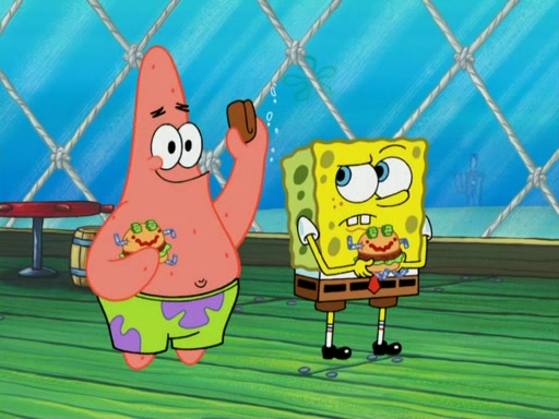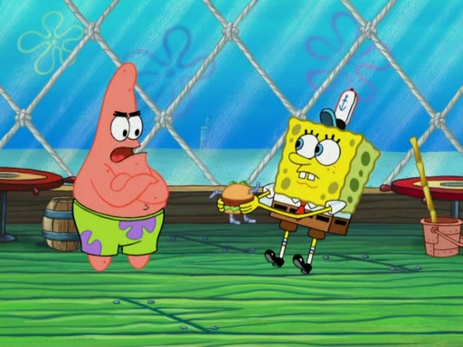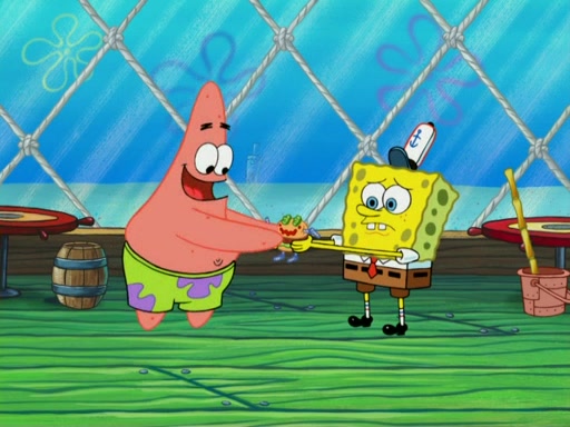 One day, Patrick orders a Krabby Kiddie meal at the Krusty Krab, but since he does not have any money, SpongeBob pays for it. He agrees to share it with SpongeBob, but does not save any of the meal for him. Patrick then wants his money back because his meal did not come with a toy, again despite the fact that SpongeBob paid for it, not him. Mr. Krabs sticks some straws and googly eyes on a Krabby Patty and calls it a Krabby Patty shaped toy, and SpongeBob falls in love with it and names it "Patty Pal." Patrick then reminds SpongeBob that they are sharing this meal, ignoring that he ate it all himself, and takes Patty Pal.