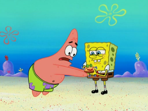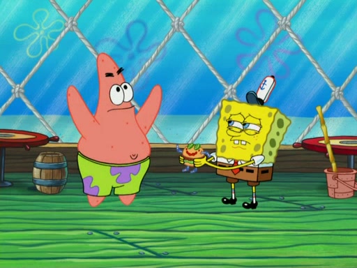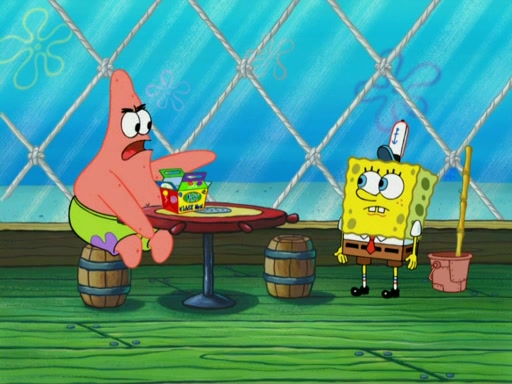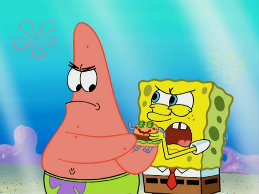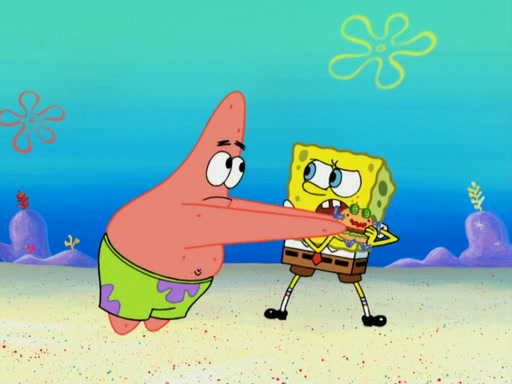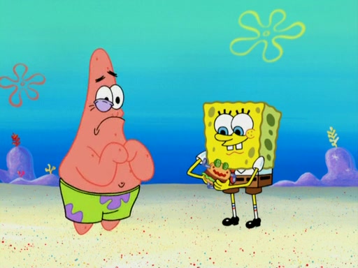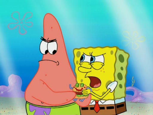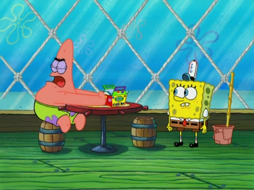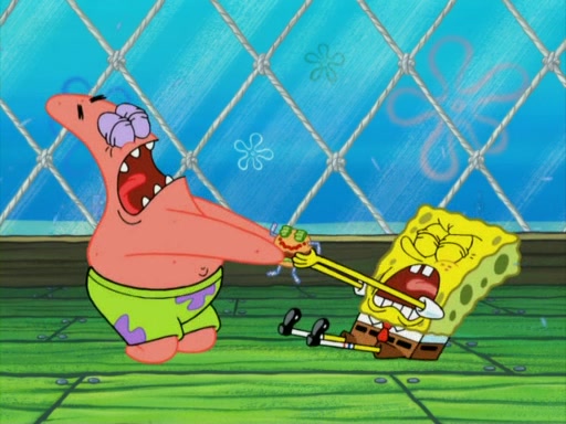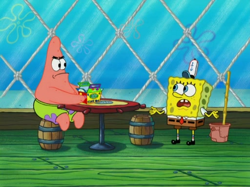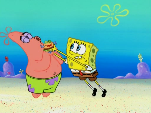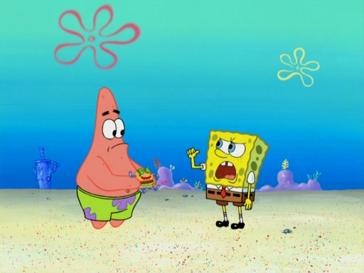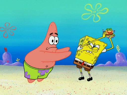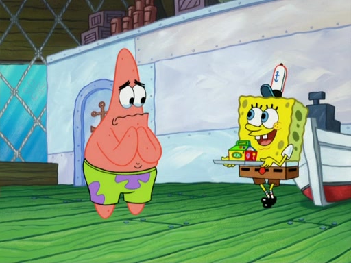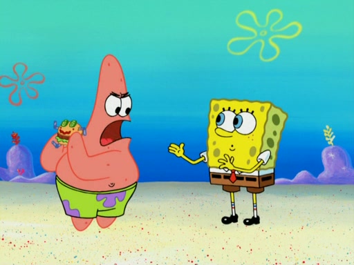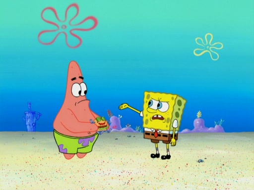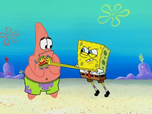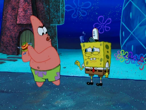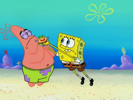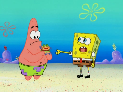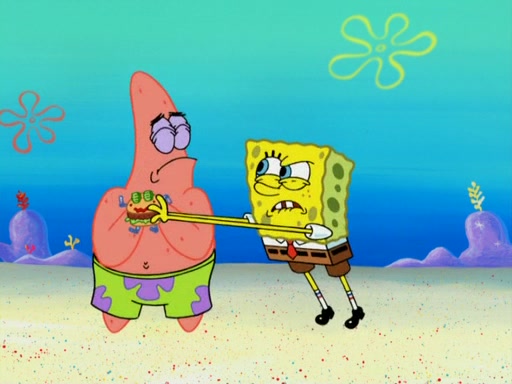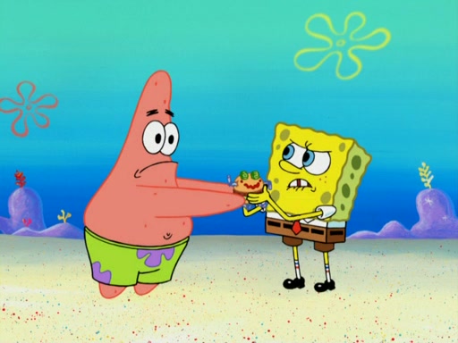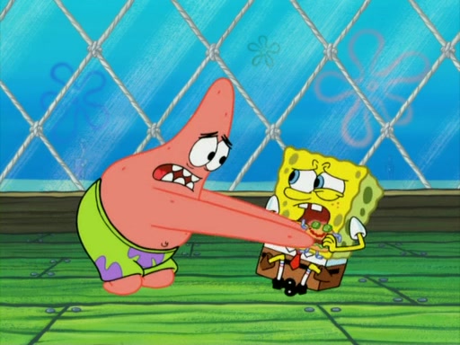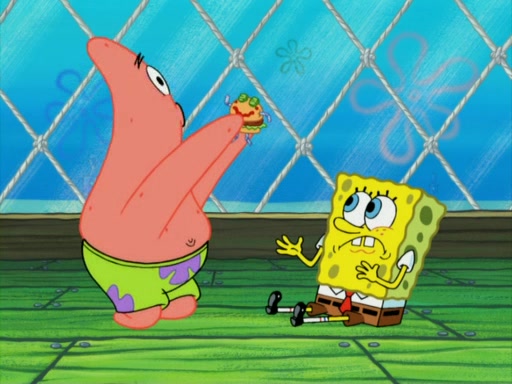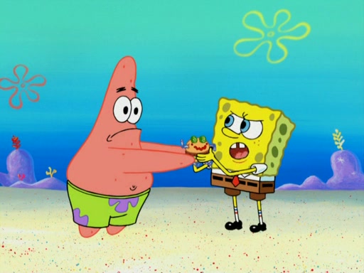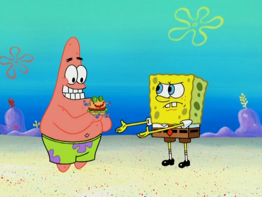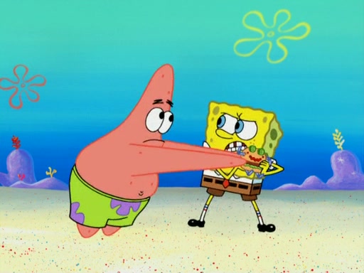 SpongeBob wakes up and goes over to get the toy, but Patrick makes excuses not to come out. SpongeBob pretends to walk away, but fails to get Patrick to give him Patty Pal. Patrick whines and thinks it's not fair that SpongeBob wants the toy. SpongeBob tries to be diplomatic and suggests that they each get a day with it, but Patrick refuses. He asks him if he can keep it for a shorter time, but Patrick refuses again, and continues to refuse to SpongeBob's continually decreasing offers until SpongeBob finally takes the toy deciding that they trade off every second. Unfortunately, even when they do that, Patrick still looks physically pained to part with the toy for even a second, so he takes the toy and runs away, which makes them begin to fight.