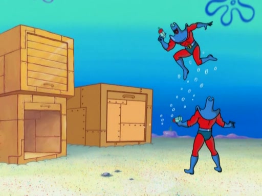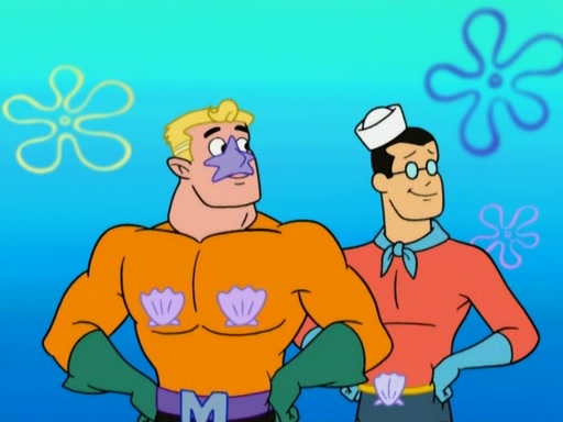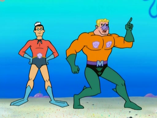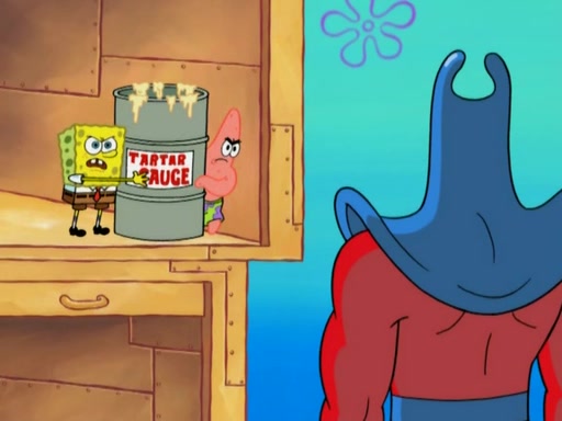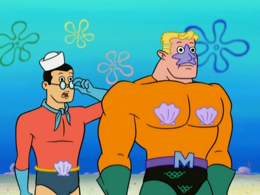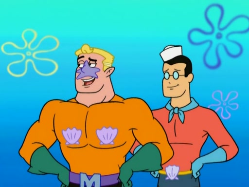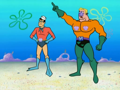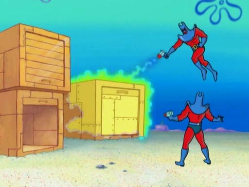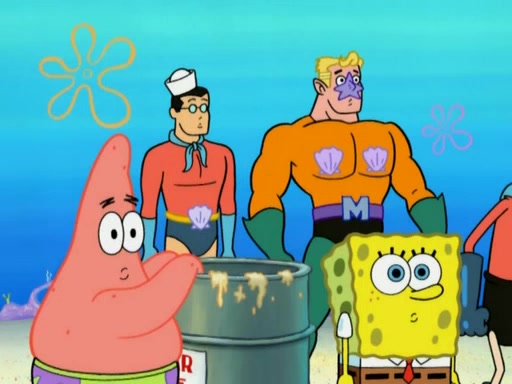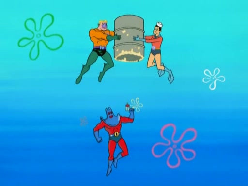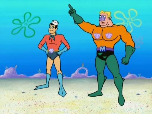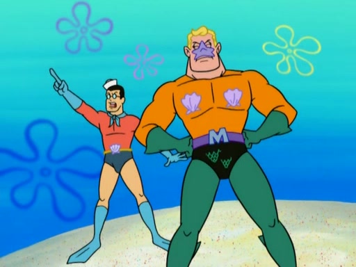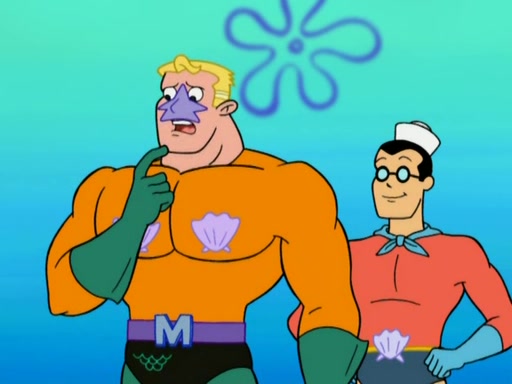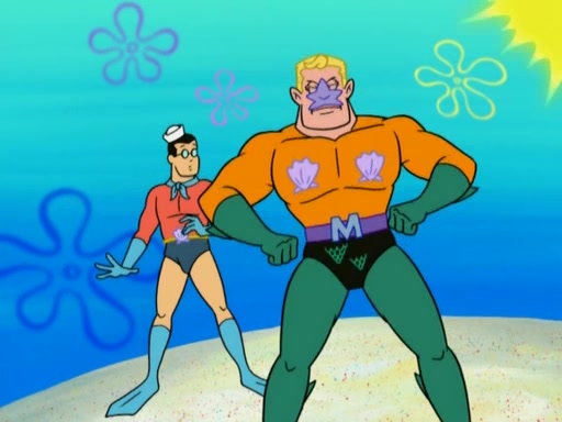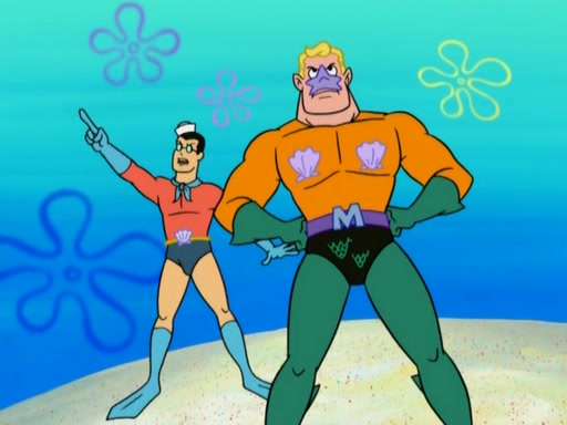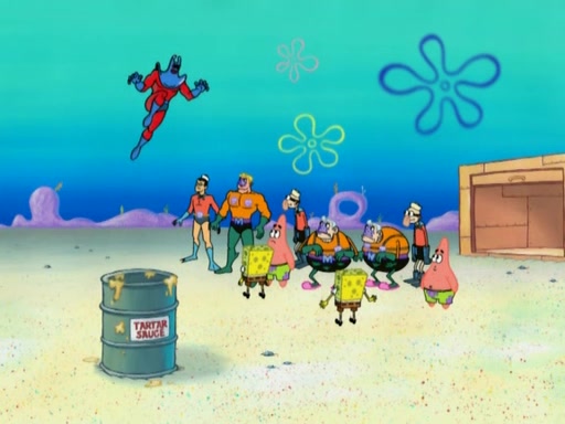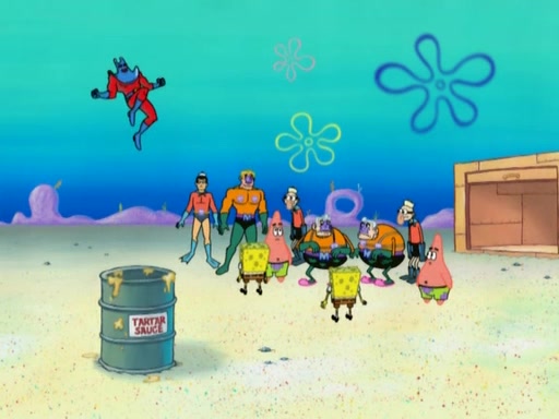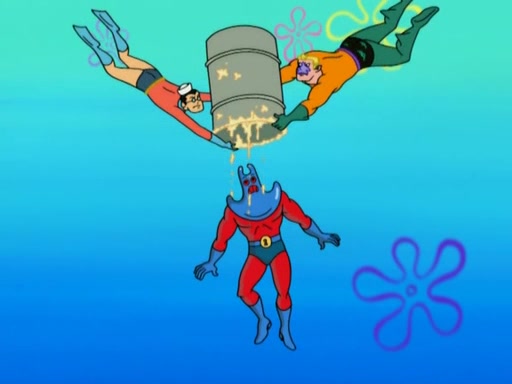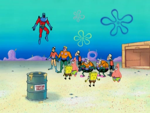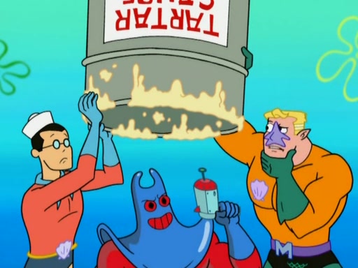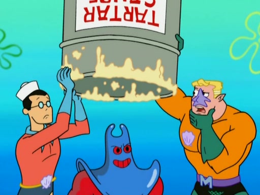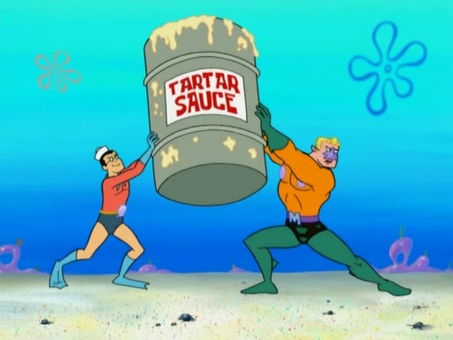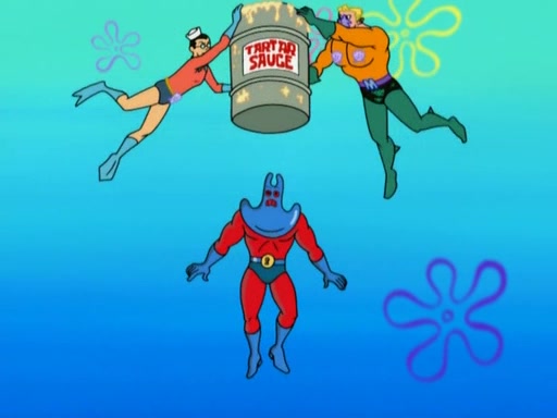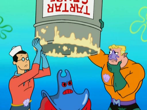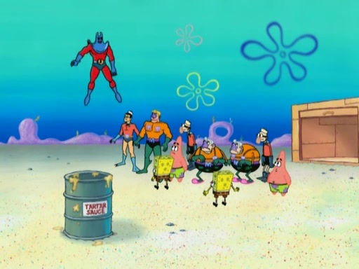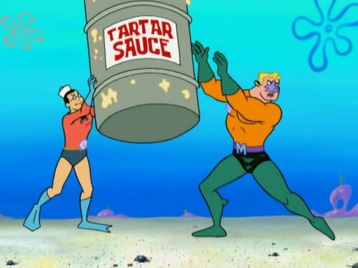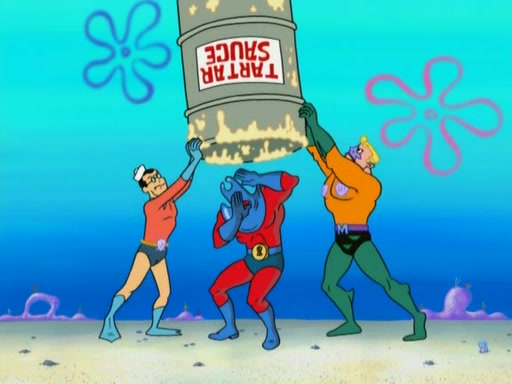 Another one pops to Man Ray's left with Mermaid Man and Barnacle Boy leaping out of it exclaiming, "Up, up and away!" They both fall headfirst into the ground. Another one appears above of the previous warehouse with the superheroes. SpongeBob and Patrick appear and throw a batch of tartar sauce over the fallen superheroes from the previous warehouse.