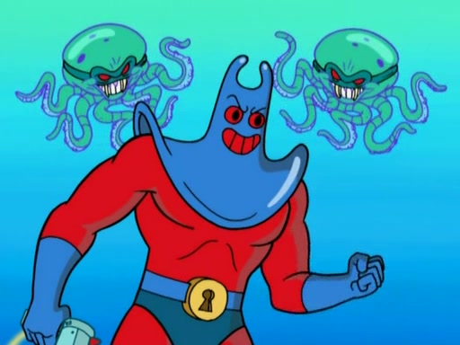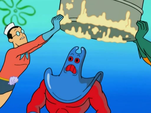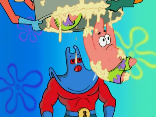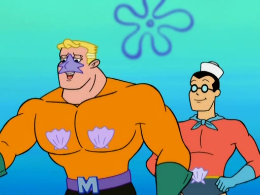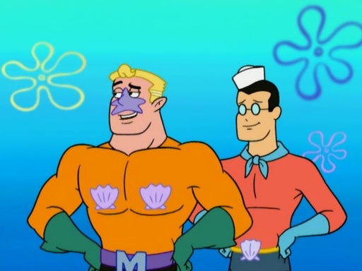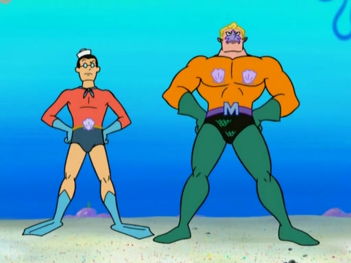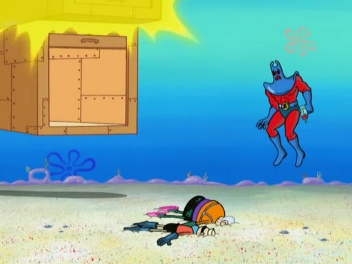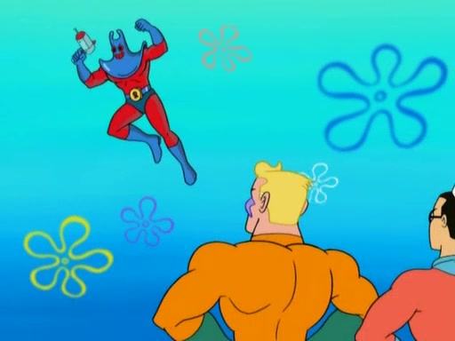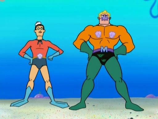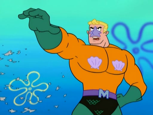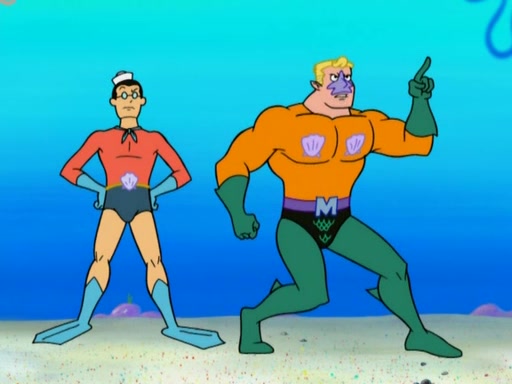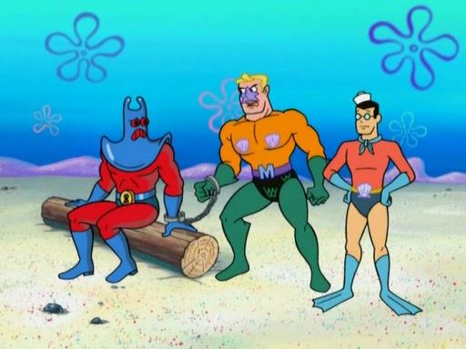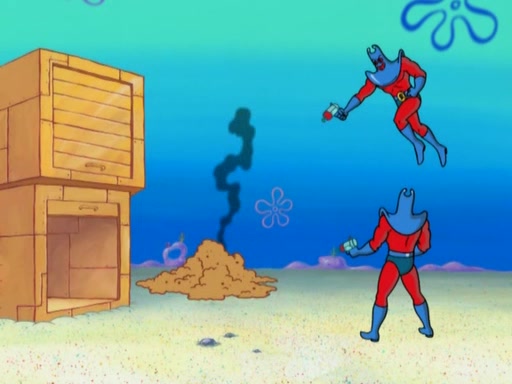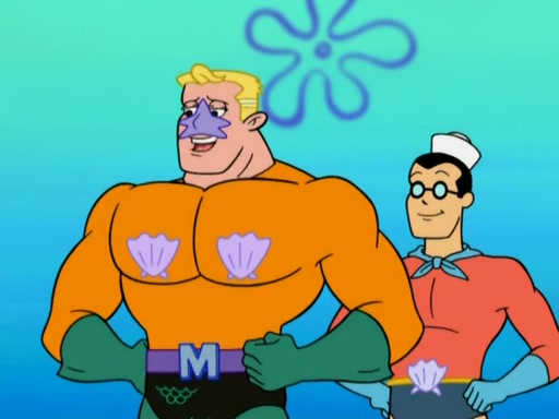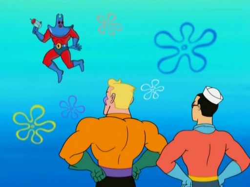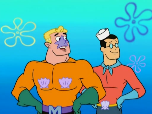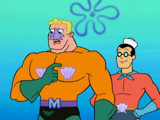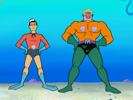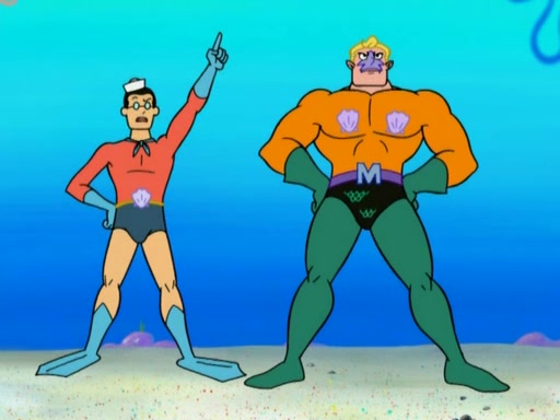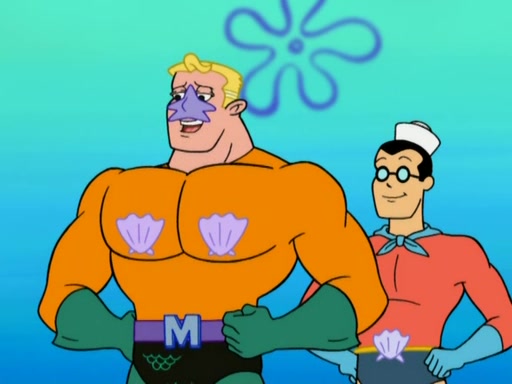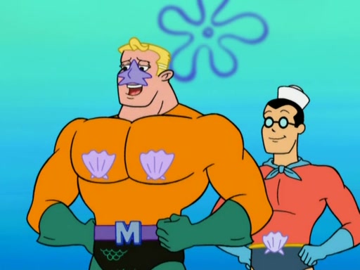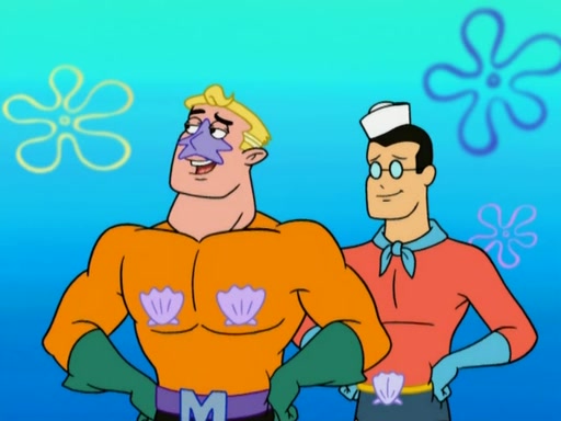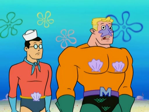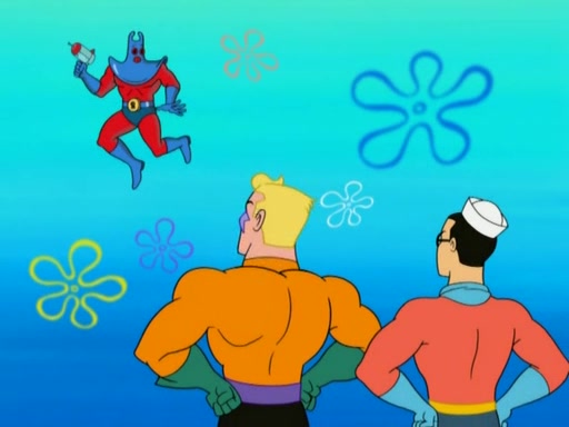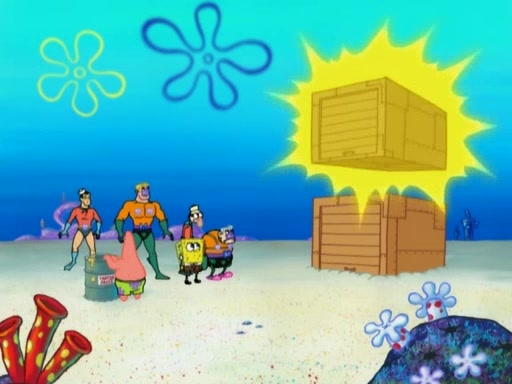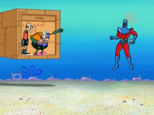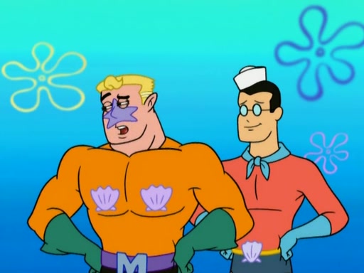 Another one pops to Man Ray's left with Mermaid Man and Barnacle Boy leaping out of it exclaiming, "Up, up and away!" They both fall headfirst into the ground. Another one appears above of the previous warehouse with the superheroes. SpongeBob and Patrick appear and throw a batch of tartar sauce over the fallen superheroes from the previous warehouse.